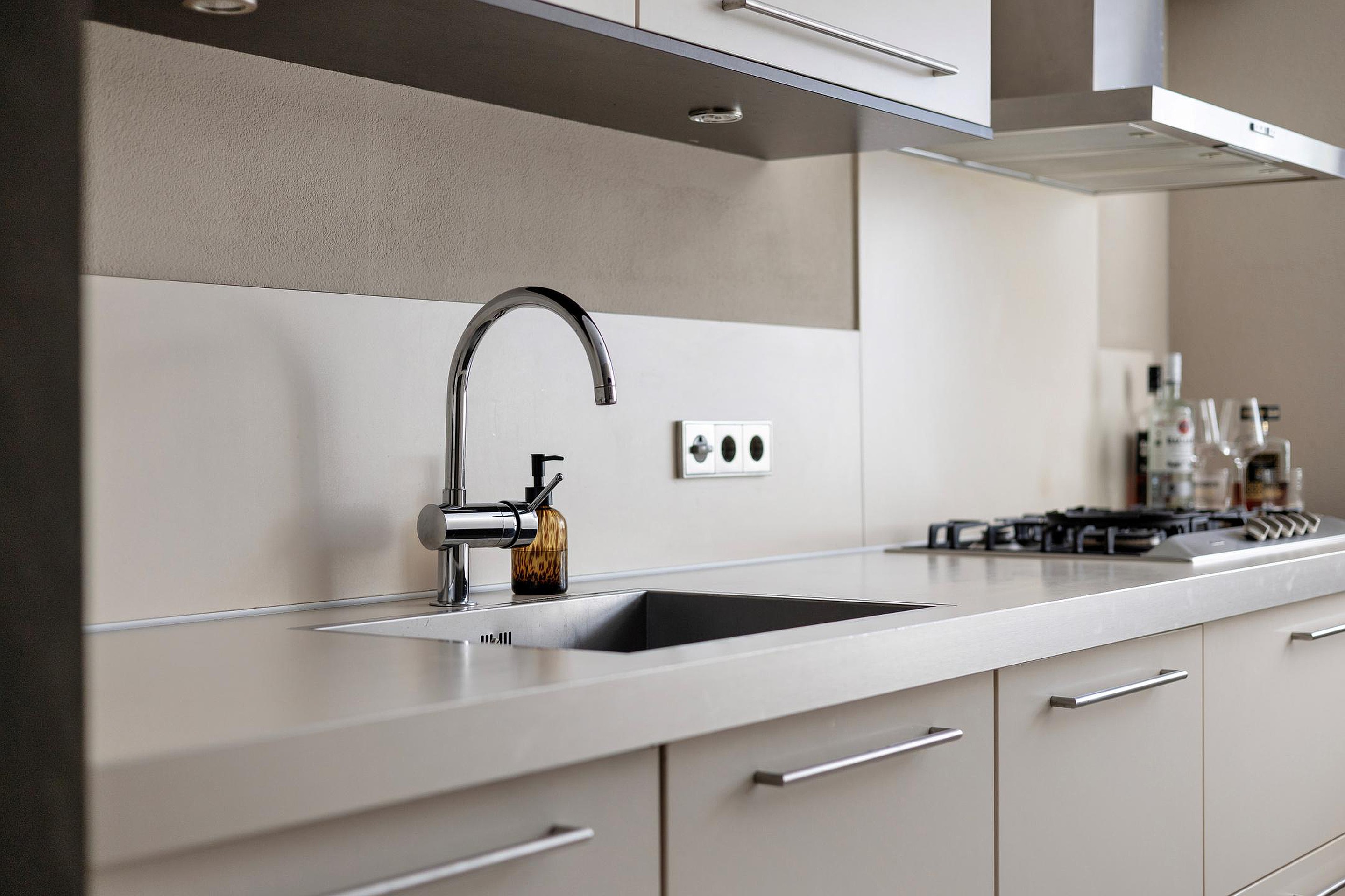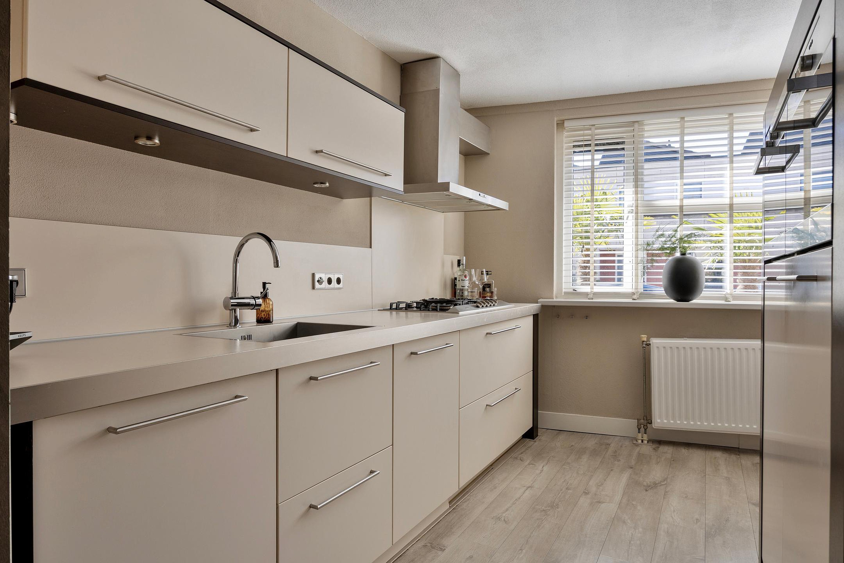Aan de voorzijde van de woning bevindt zich de open keuken, uitgevoerd met een langwerpig aanrecht en voorzien van diverse inbouwapparatuur. Hier beschikt u over een gasfornuis, afzuigkap, ovencombinatie, vaatwasser en koelkast, evenals een spoelbak met kraan en voldoende opbergruimte. De keuken is goed onderhouden en biedt u een fijne plek om uitgebreid te koken en samen te komen.