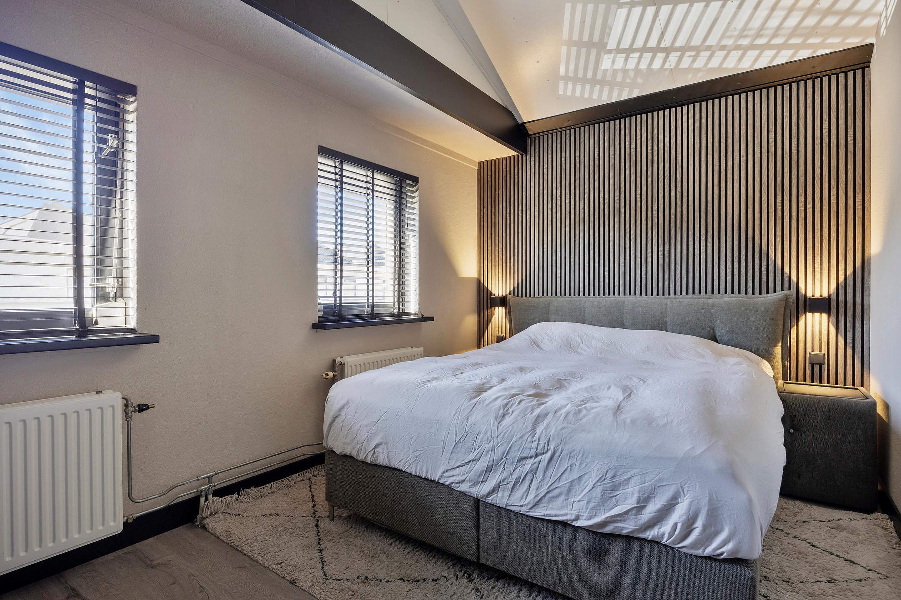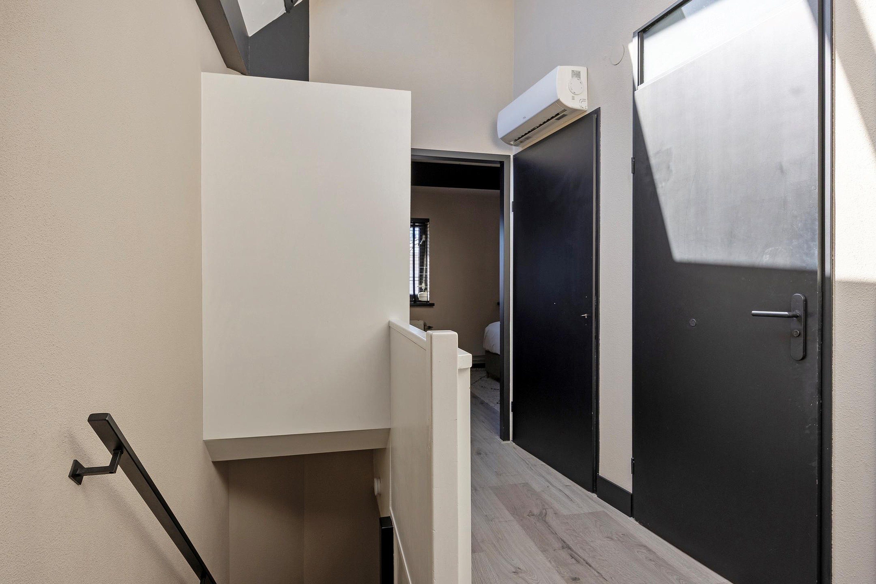 Via de vaste trap in de hal bereikt u de overloop van de eerste verdieping. De grote raampartijen in de nok zorgen voor een overvloed aan daglicht en versterken het ruimtelijke gevoel op deze verdieping. Op de overloop is bovendien een airco aanwezig, wat bijdraagt aan een aangenaam binnenklimaat. Op deze verdieping treft u drie slaapkamers en de moderne badkamer aan.