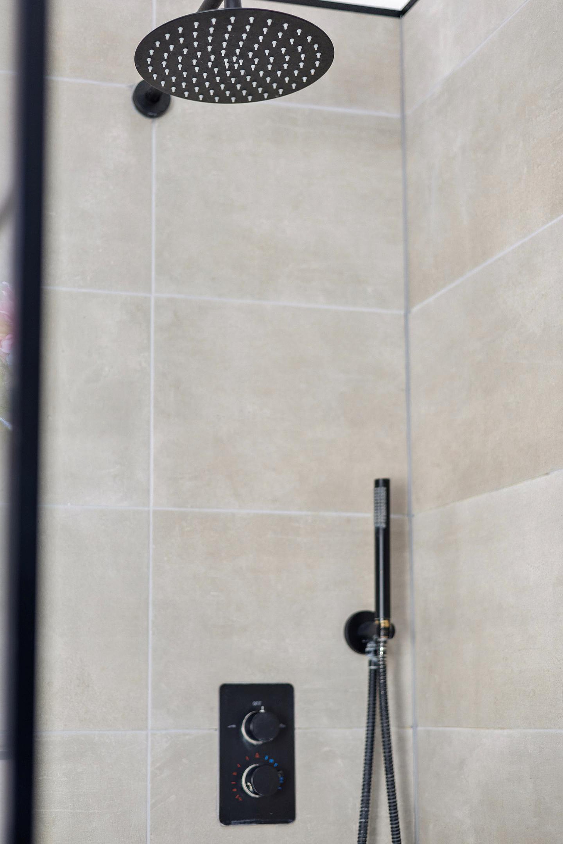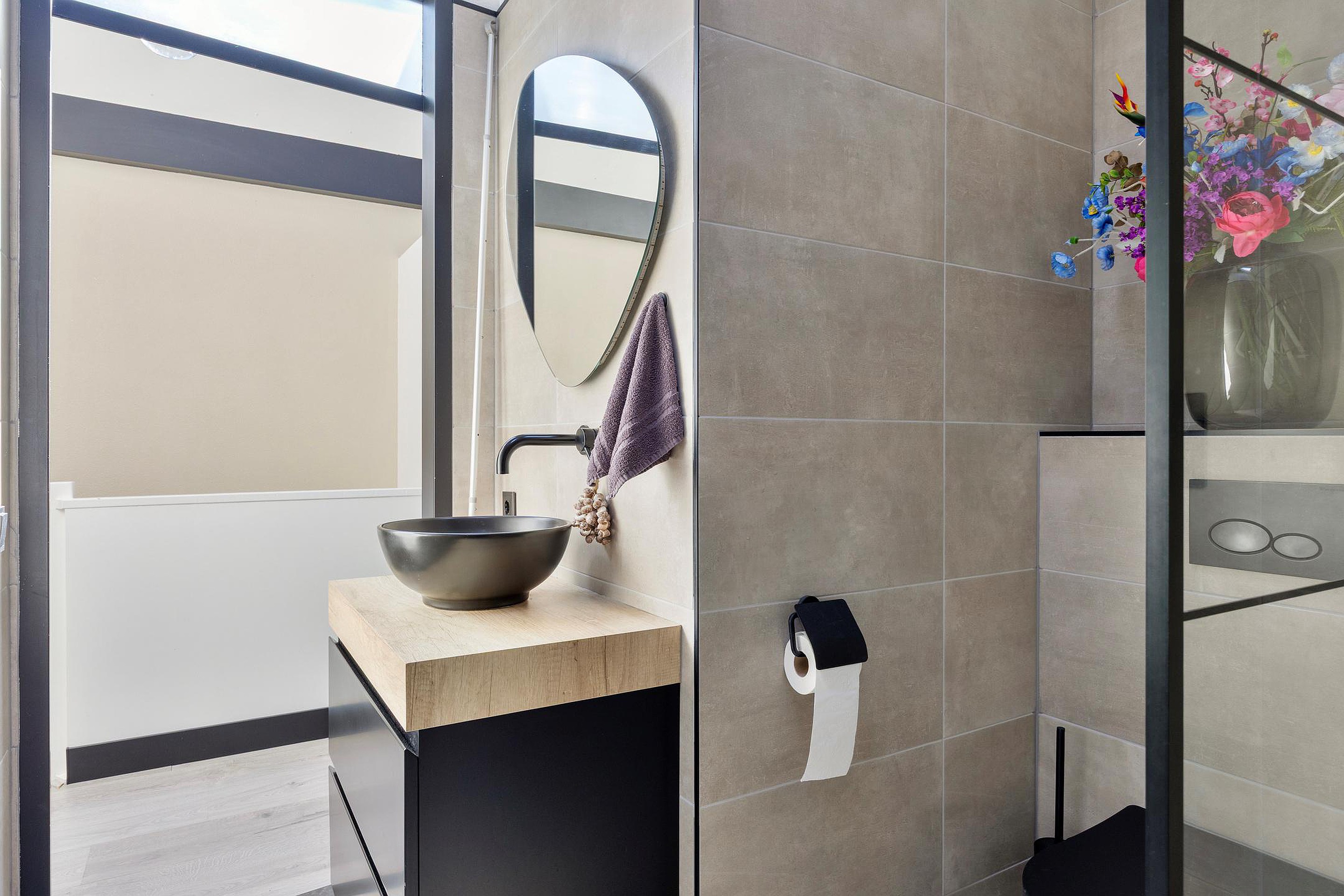 De volledig betegelde badkamer grenst aan de overloop en is modern afgewerkt met een verzorgde en luxe uitstraling. De ruimte beschikt over een ruime inloopdouche met glazen wand, een wastafel met stijlvol opbergmeubel, een zwevend toilet en een handdoekradiator. Dankzij het aanwezige dakraam profiteert de badkamer van extra daglicht en natuurlijke ventilatie. Alles is keurig onderhouden en direct klaar voor gebruik.