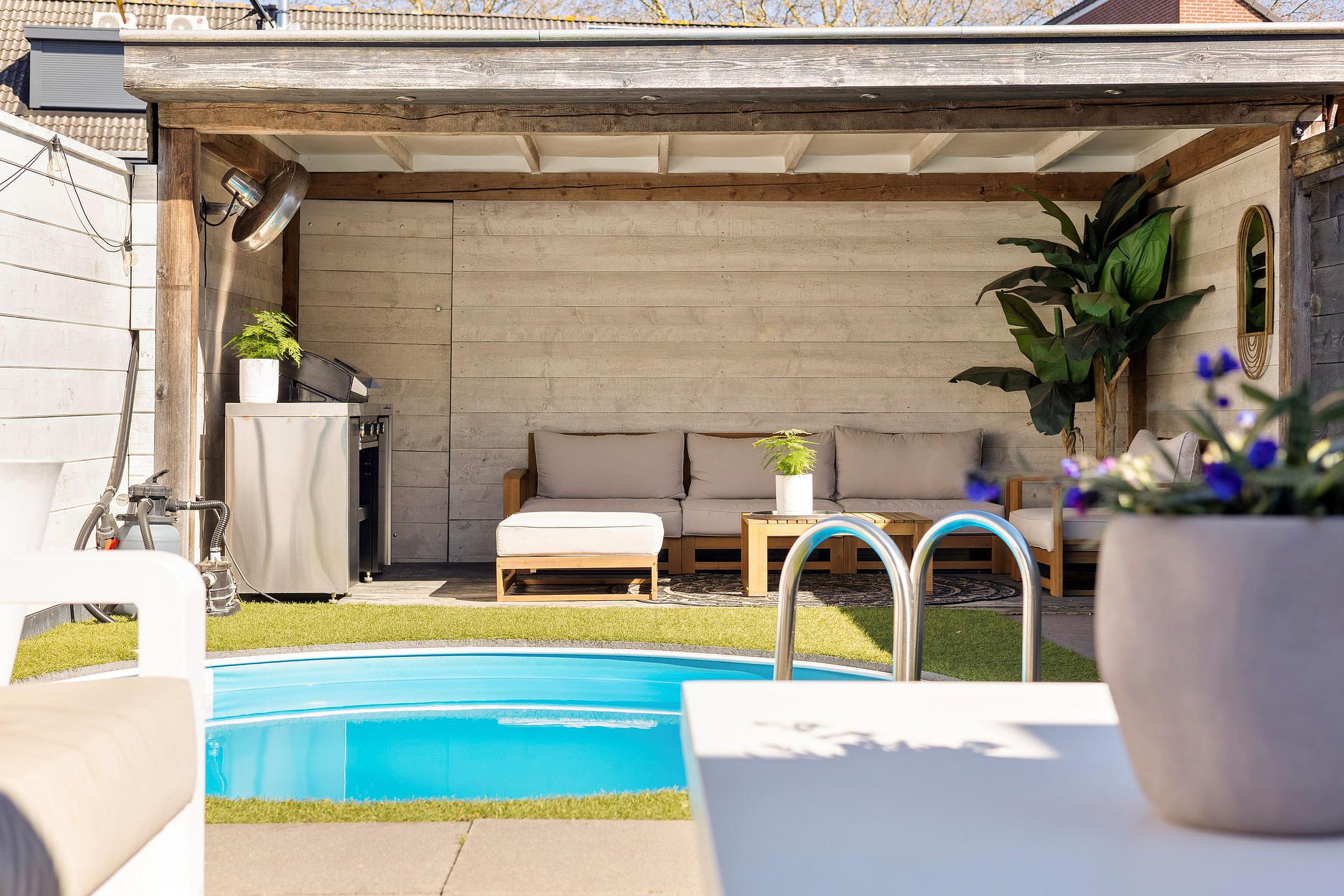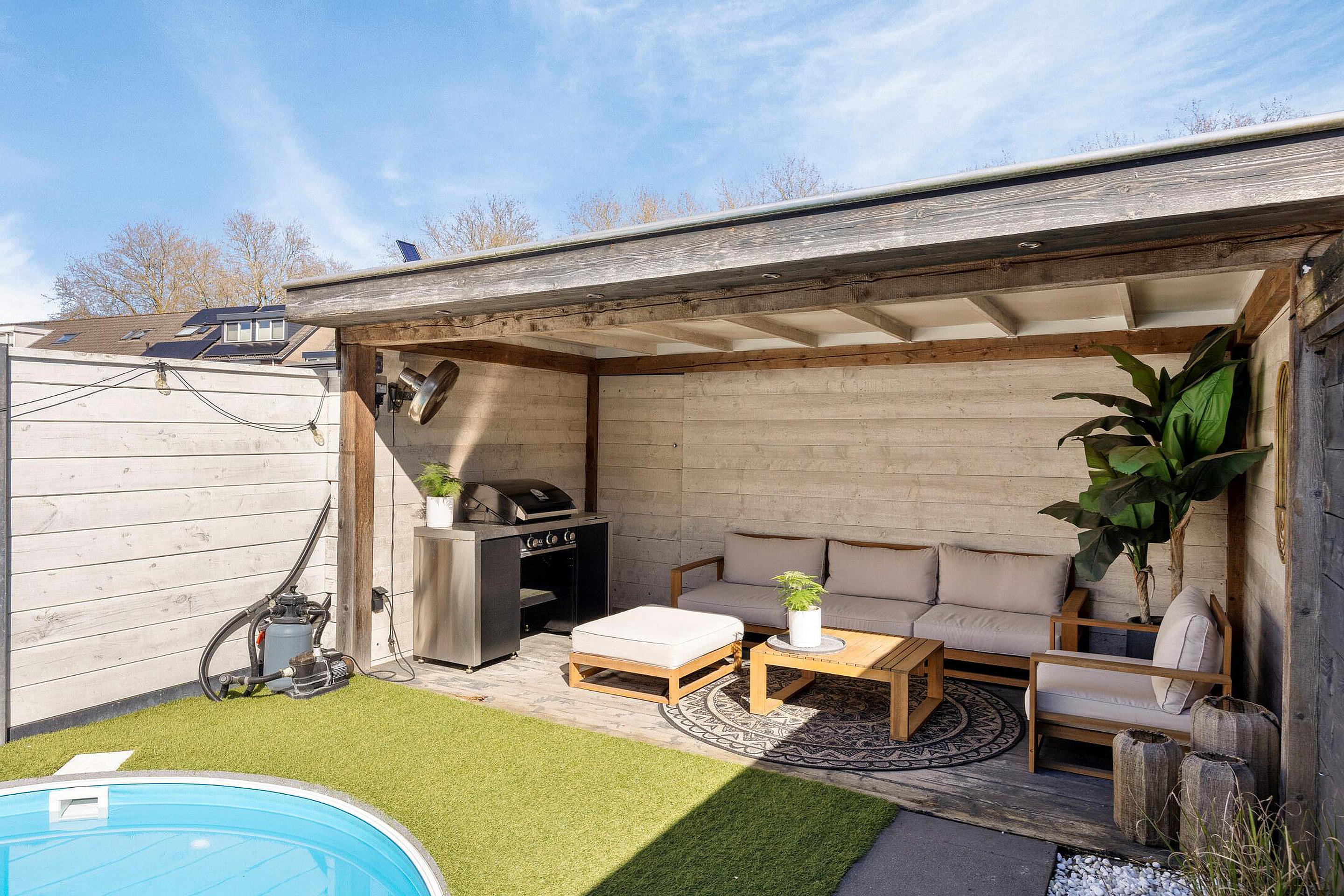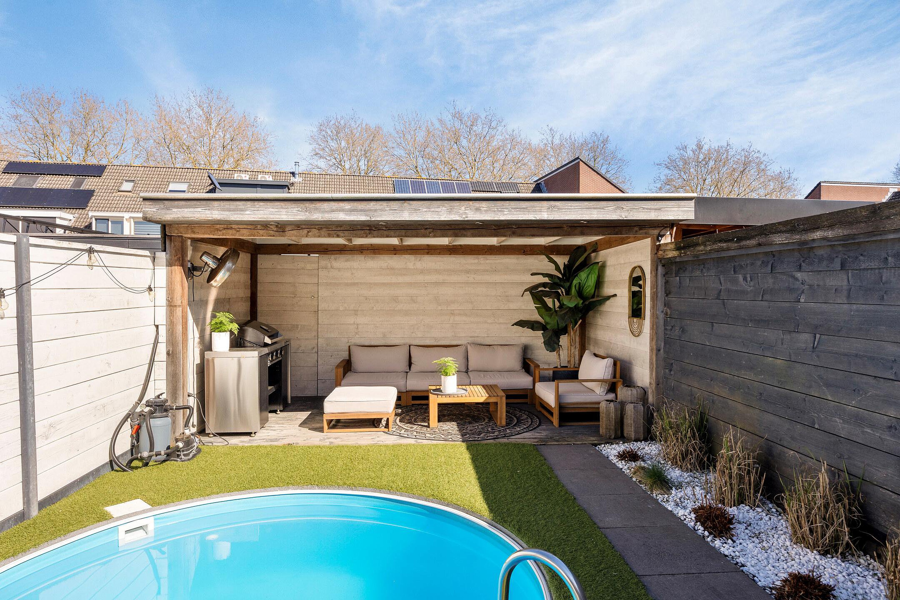 Een absolute eyecatcher is het zwembad, dat niet alleen voor verkoeling zorgt op warme dagen, maar ook een exclusieve uitstraling aan de tuin geeft. De sfeervolle indeling maakt het geheel bijzonder aantrekkelijk. Achterin de tuin bevindt zich een fraaie overkapping met een luxe zithoek, waar u tot in de late uurtjes beschut kunt genieten. Dankzij het zonnescherm creëert u bovendien eenvoudig extra schaduw op zonnige dagen, waardoor het hier op elk moment van de dag heerlijk vertoeven is.