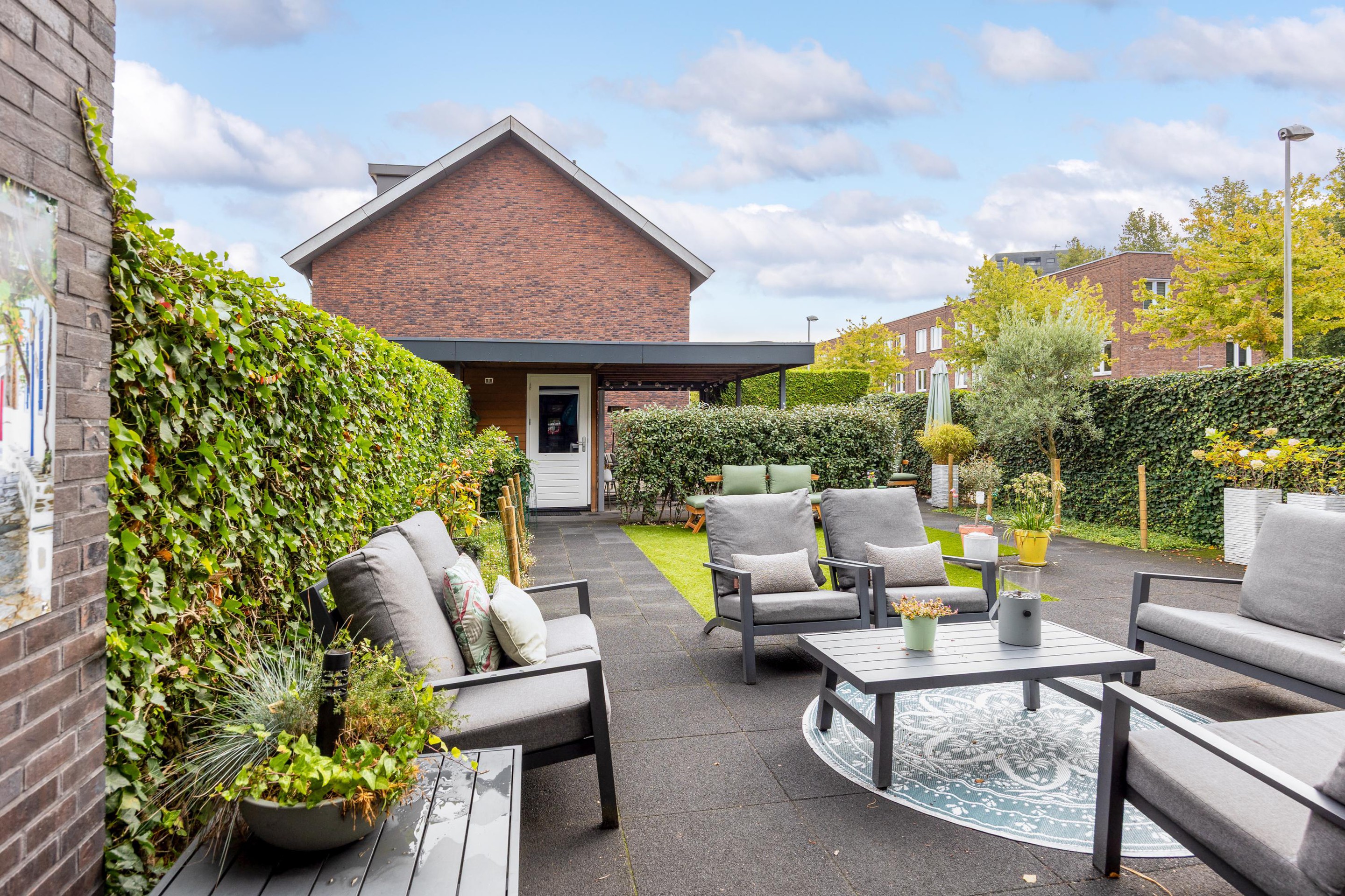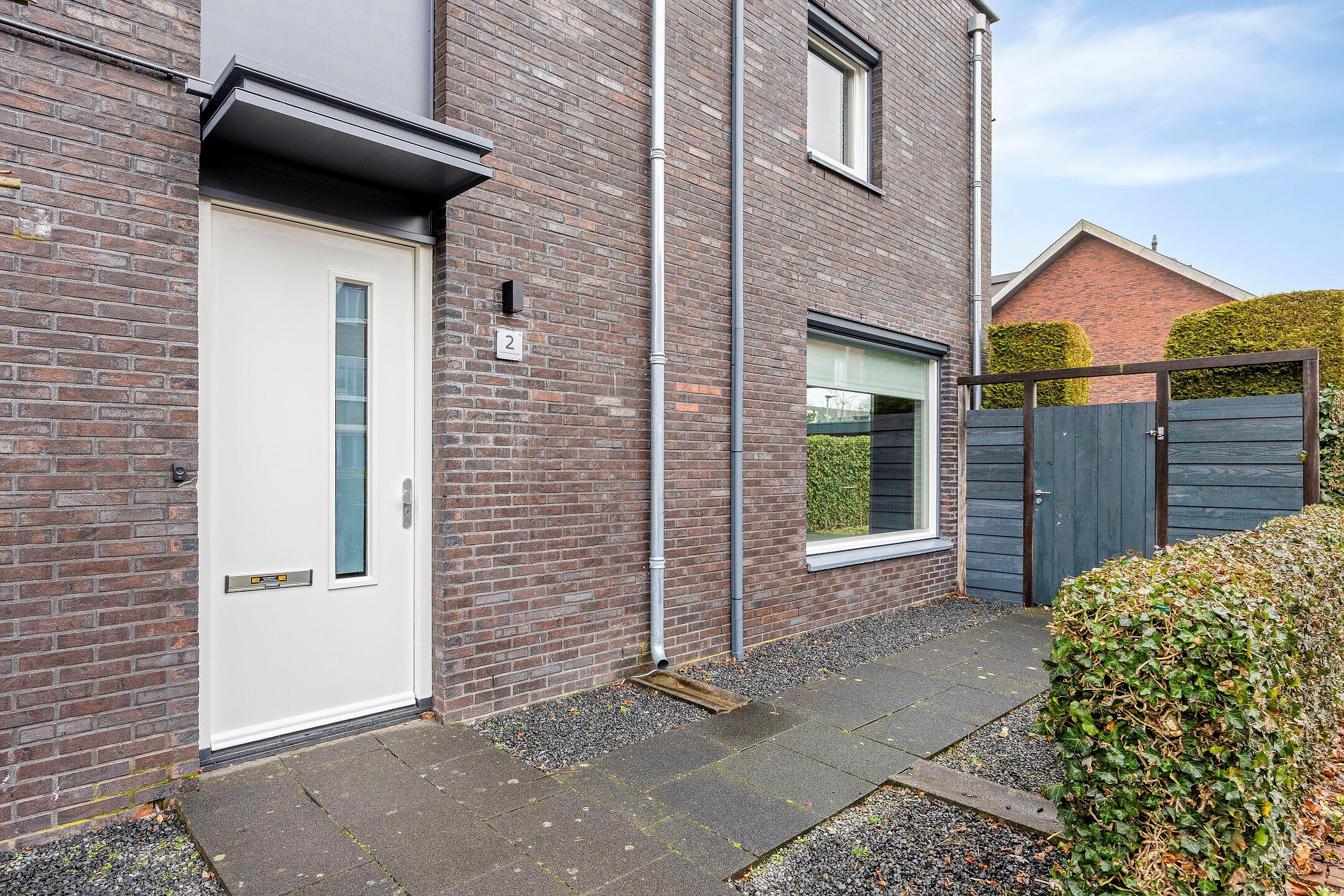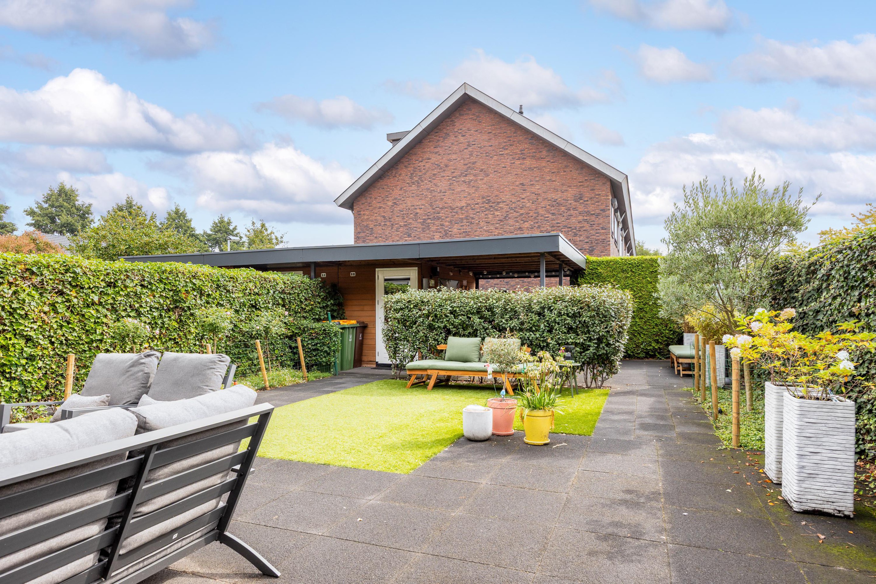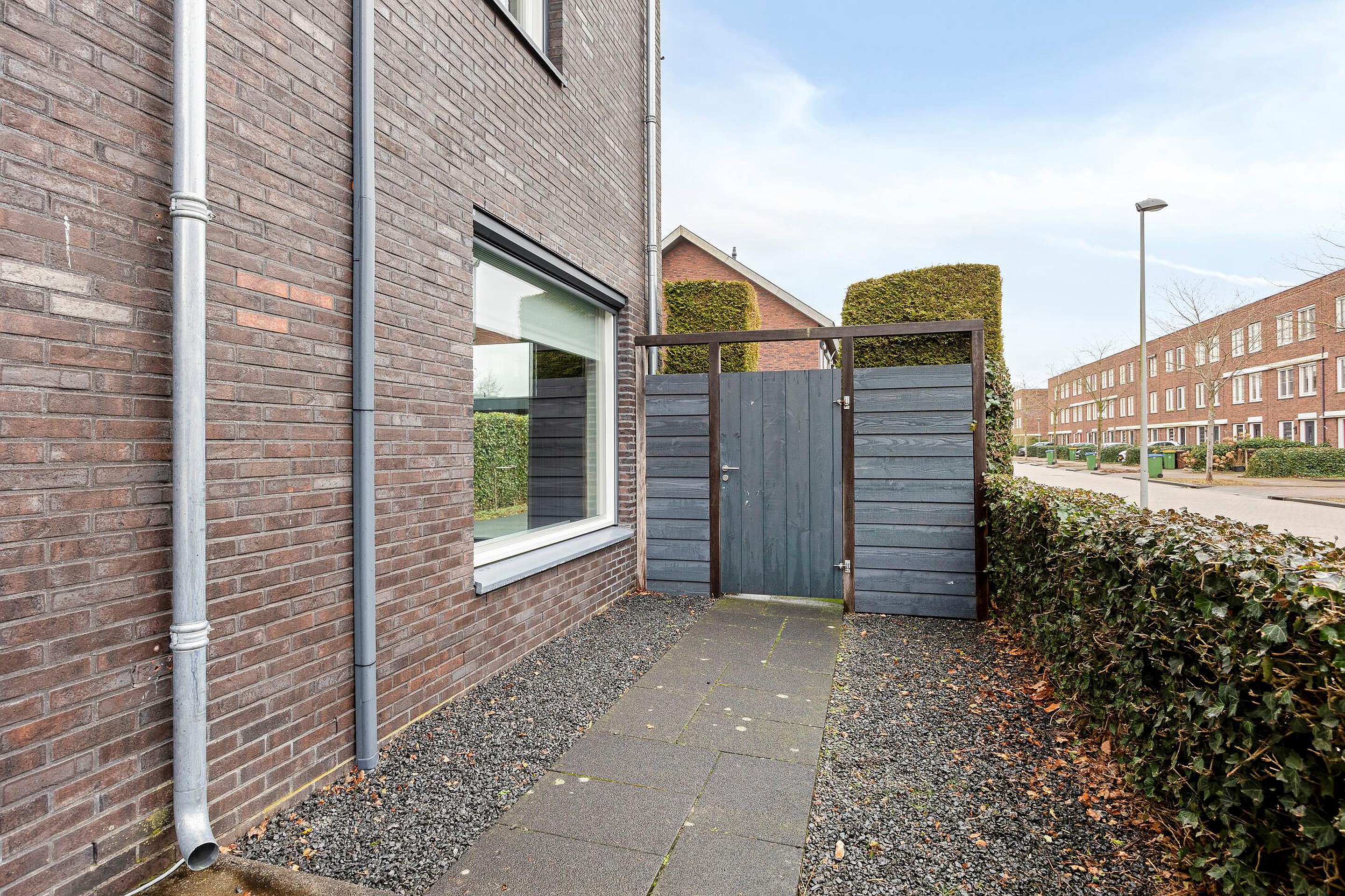 De voortuin is verzorgd aangelegd met grind en leibomen, passend bij de moderne uitstraling van de woning. De zonnige achtertuin is fraai ingericht met borders, kunstgras en een ruim terras, waardoor binnen en buiten naadloos in elkaar overlopen.