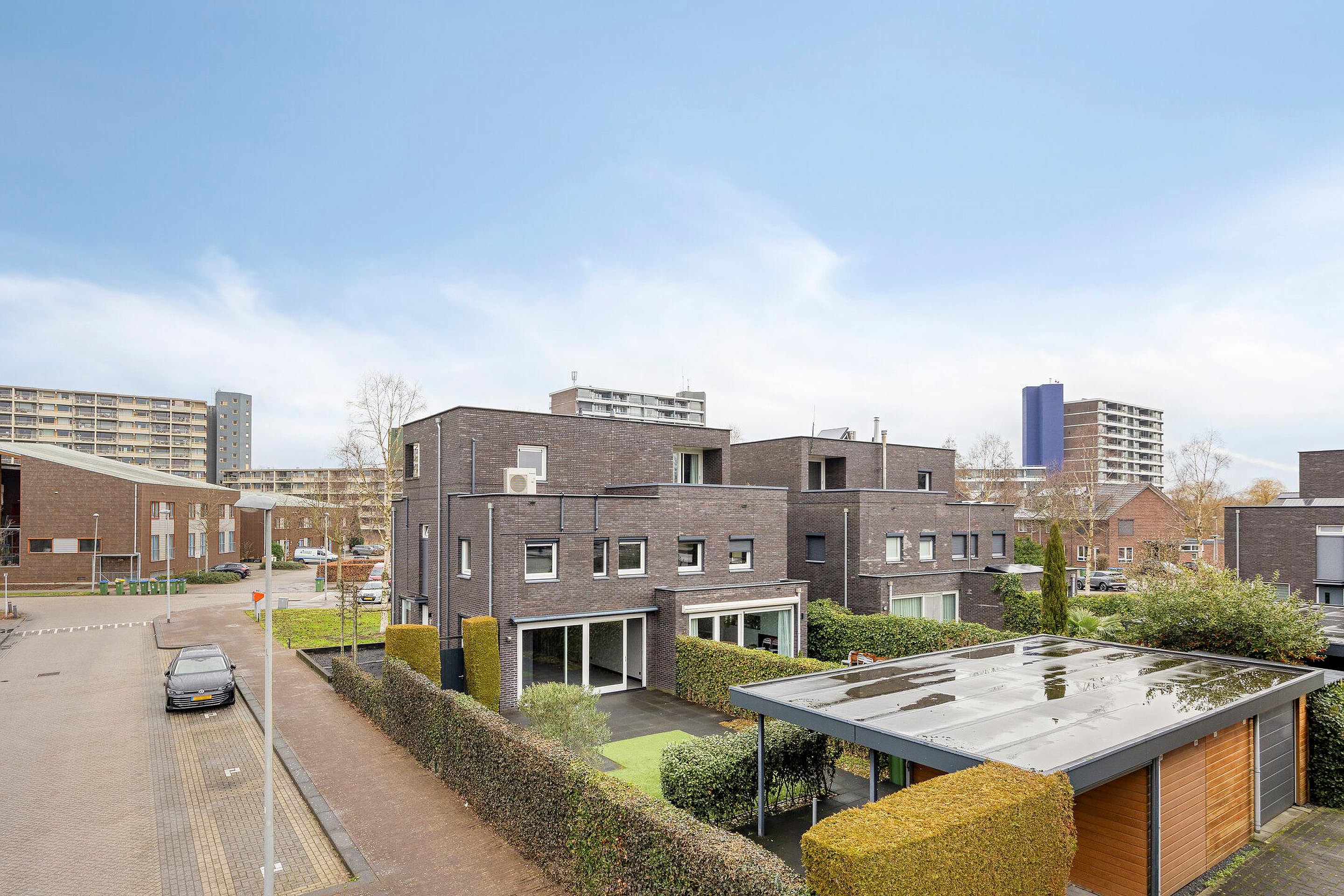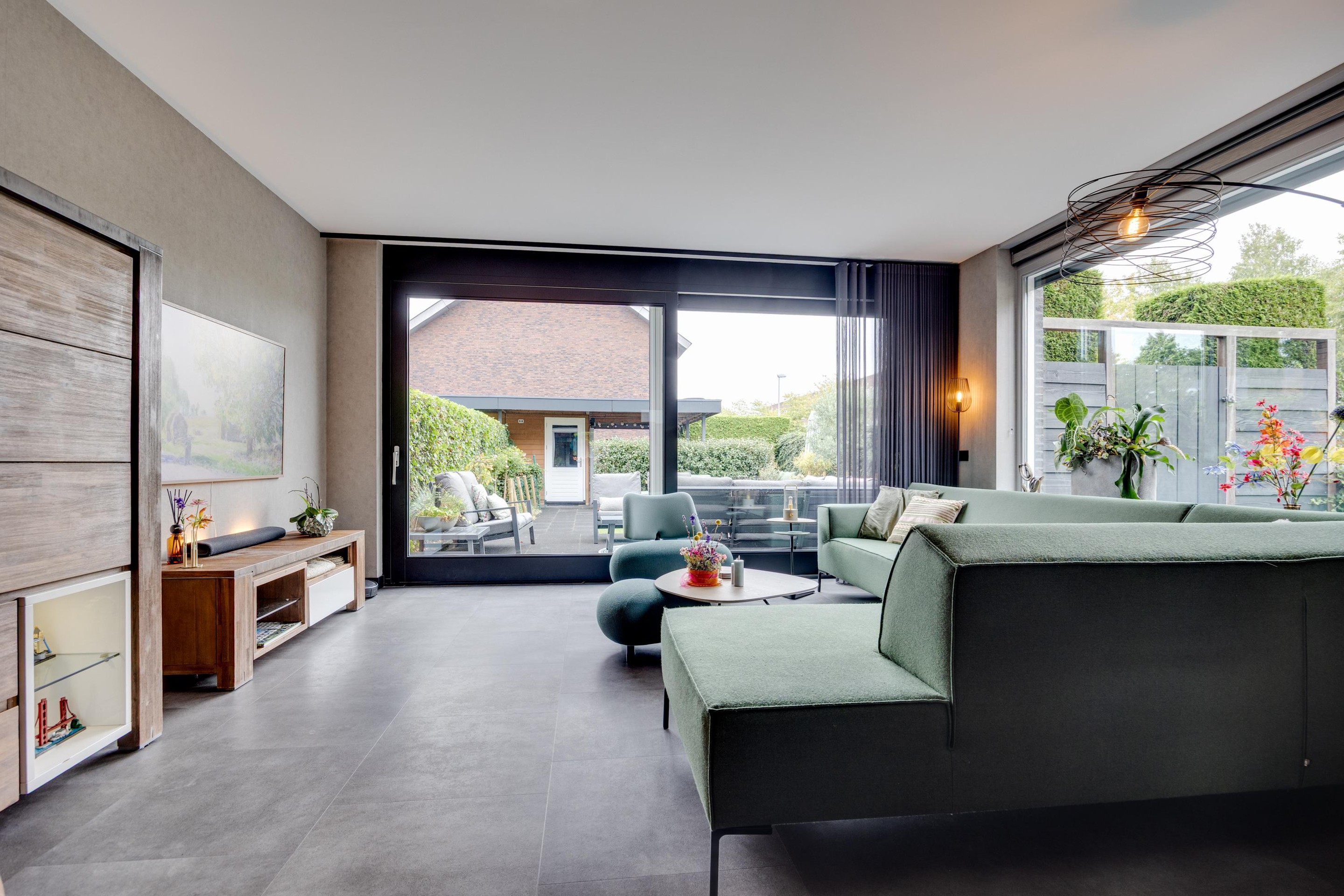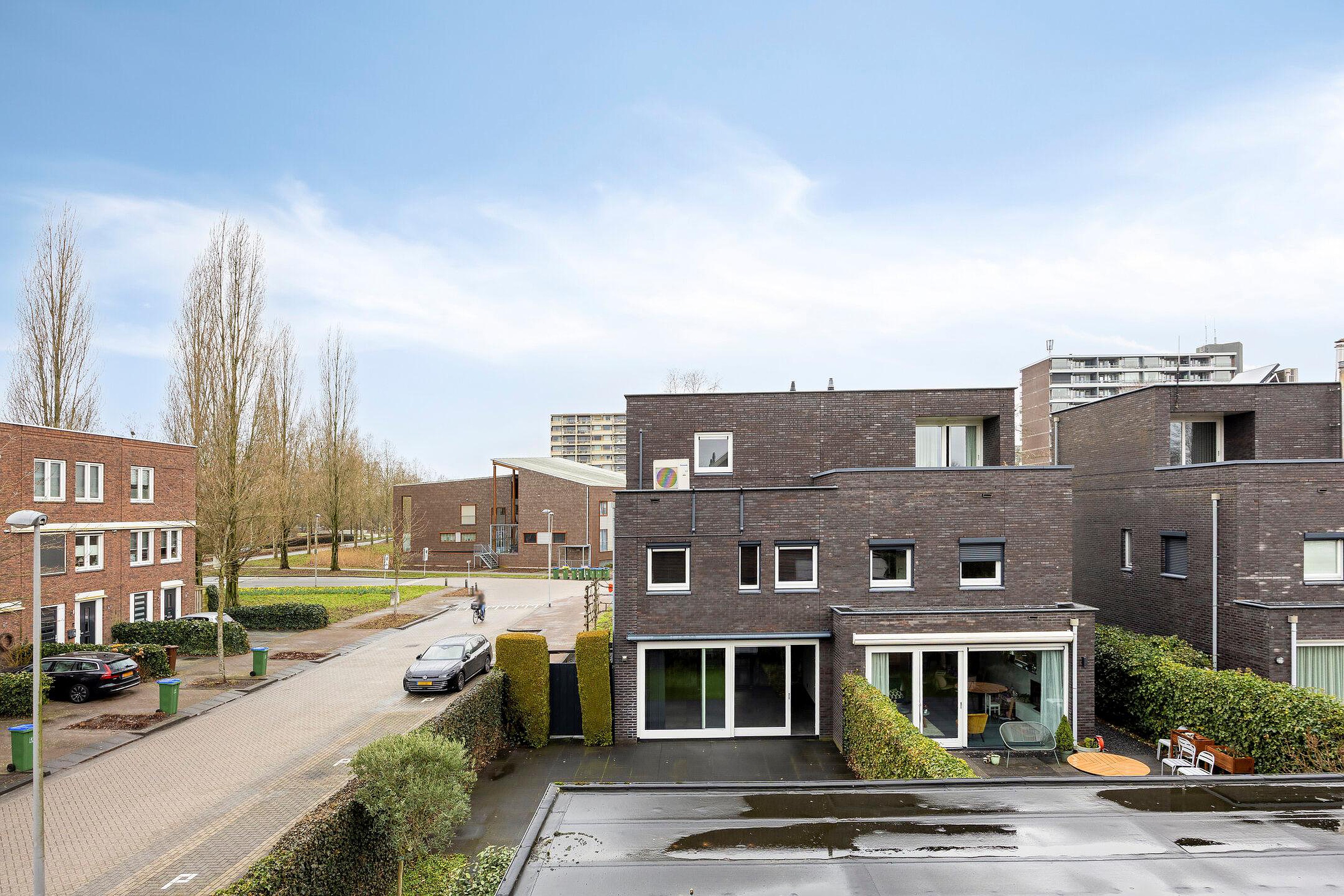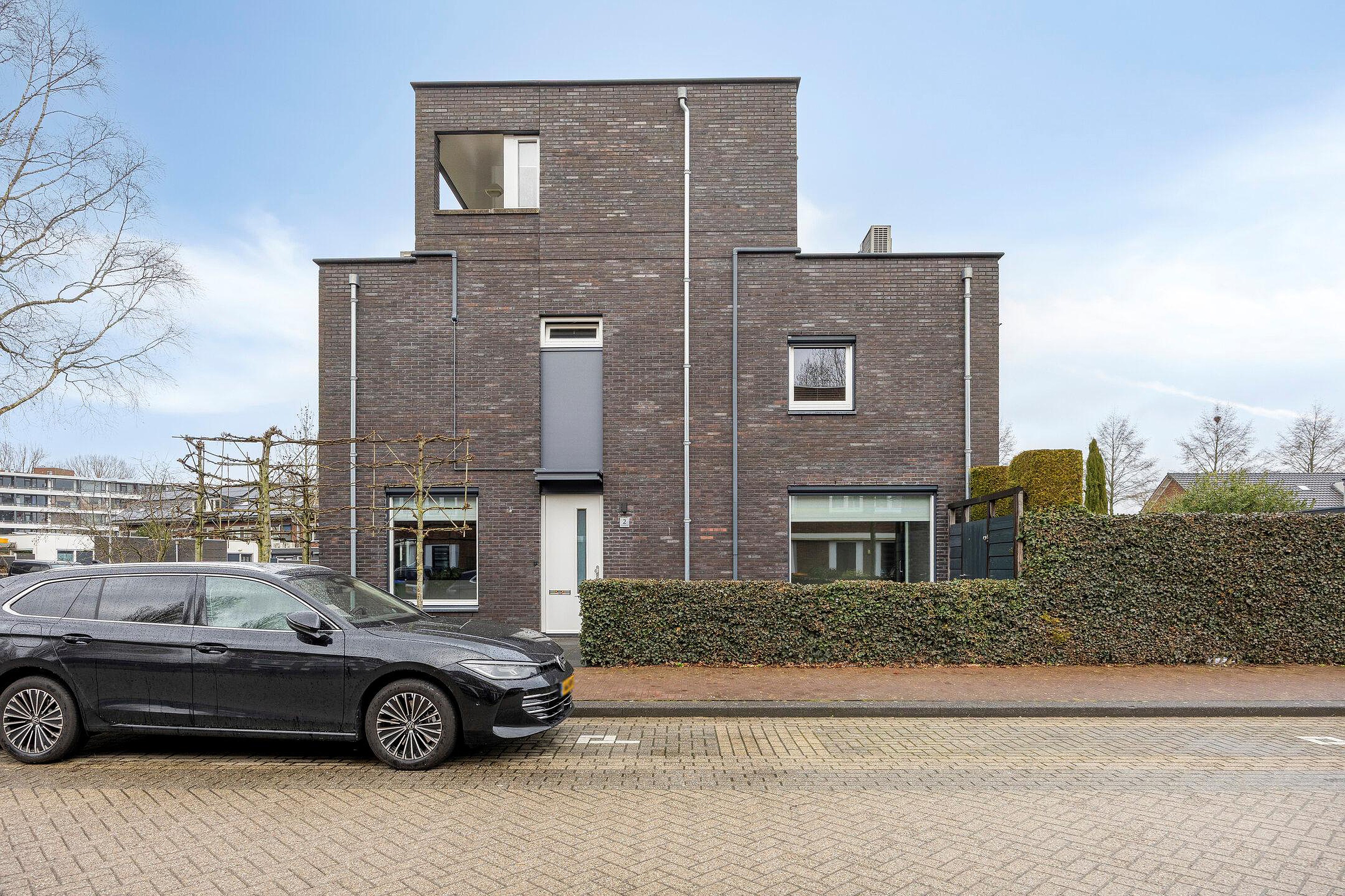 De voortuin is verzorgd aangelegd met grind en leibomen, passend bij de moderne uitstraling van de woning. De zonnige achtertuin is fraai ingericht met borders, kunstgras en een ruim terras, waardoor binnen en buiten naadloos in elkaar overlopen.