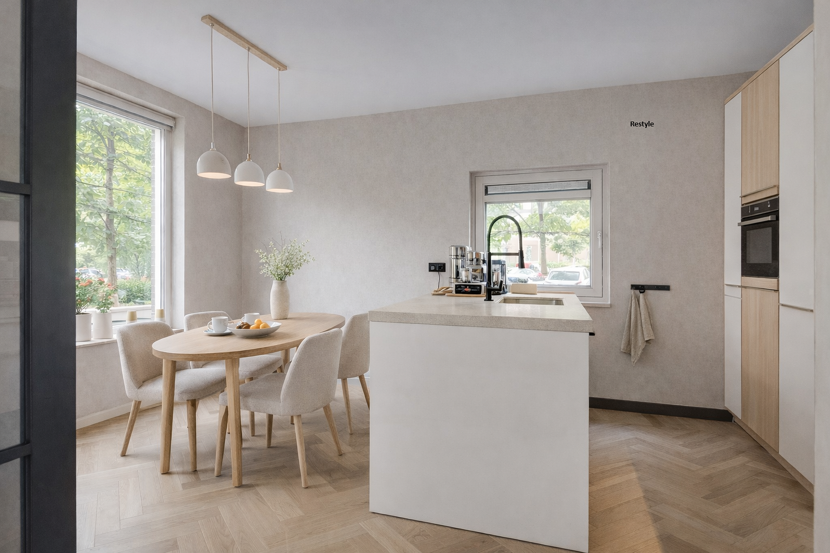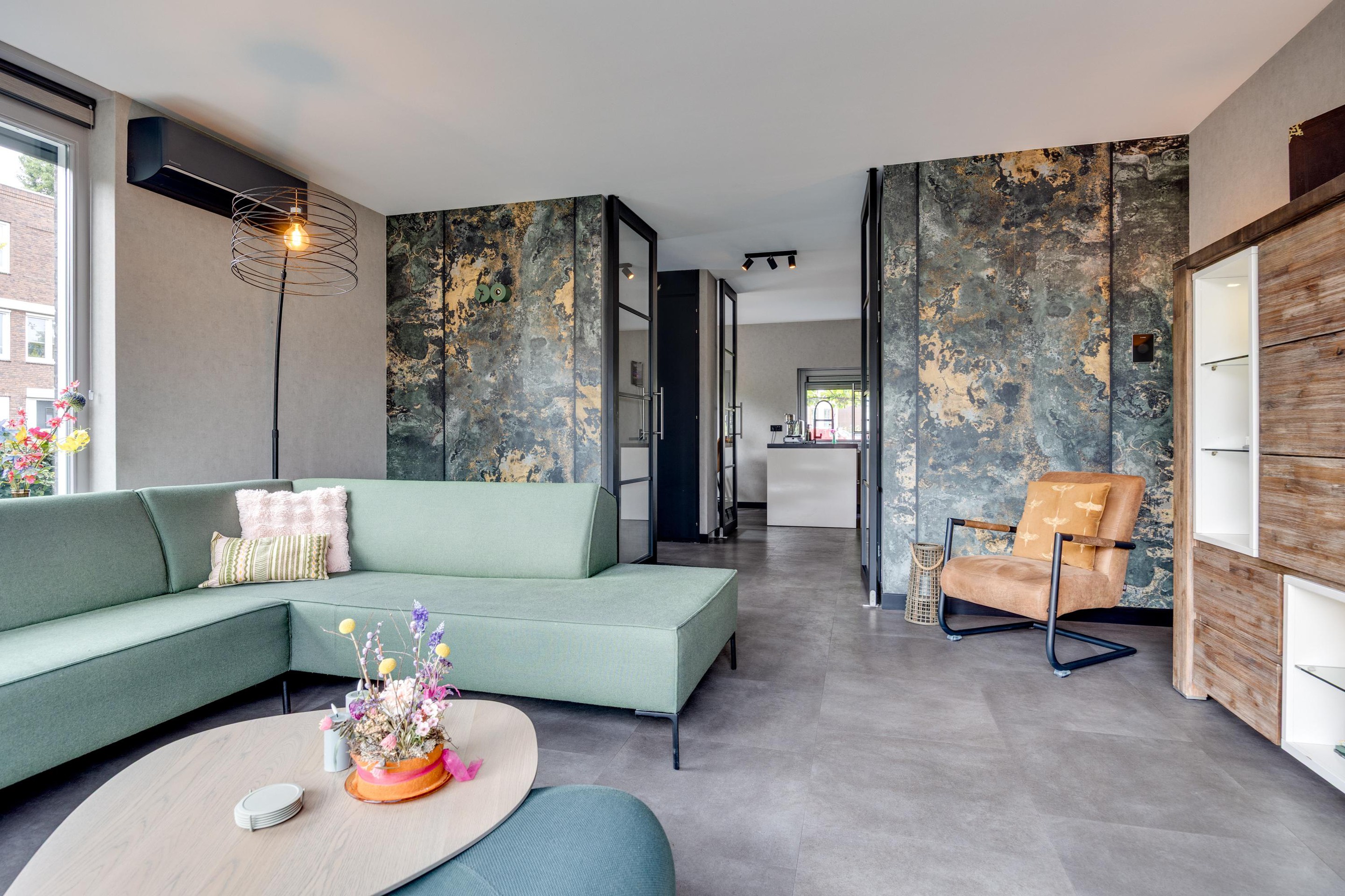 De ruime entree verwelkomt je met een praktische indeling, inclusief garderoberuimte, een moderne toiletruimte en een handige bergkast. Via stijlvolle taatsdeuren bereik je de lichte, tuingerichte woonkamer met schuifpui naar de achtertuin. De pvc-vloer met vloerverwarming en airconditioning zorgen het hele jaar door voor optimaal comfort.
