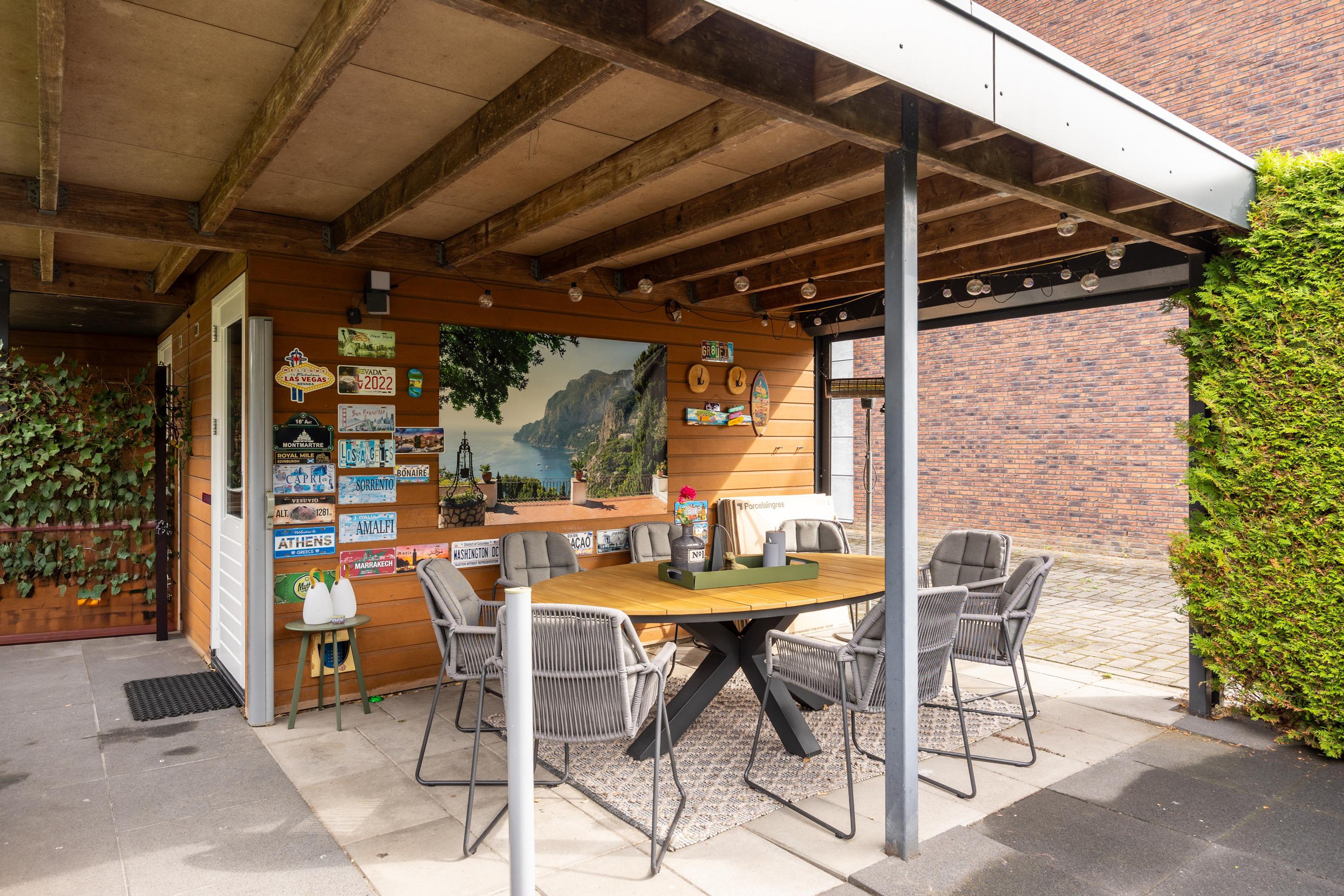Achterin de tuin bevindt zich een houten berging met elektra en een sfeervolle overkapping met elektrisch bedienbare roldeur. Een perfecte plek voor lange zomeravonden en gezellige momenten met familie en vrienden.