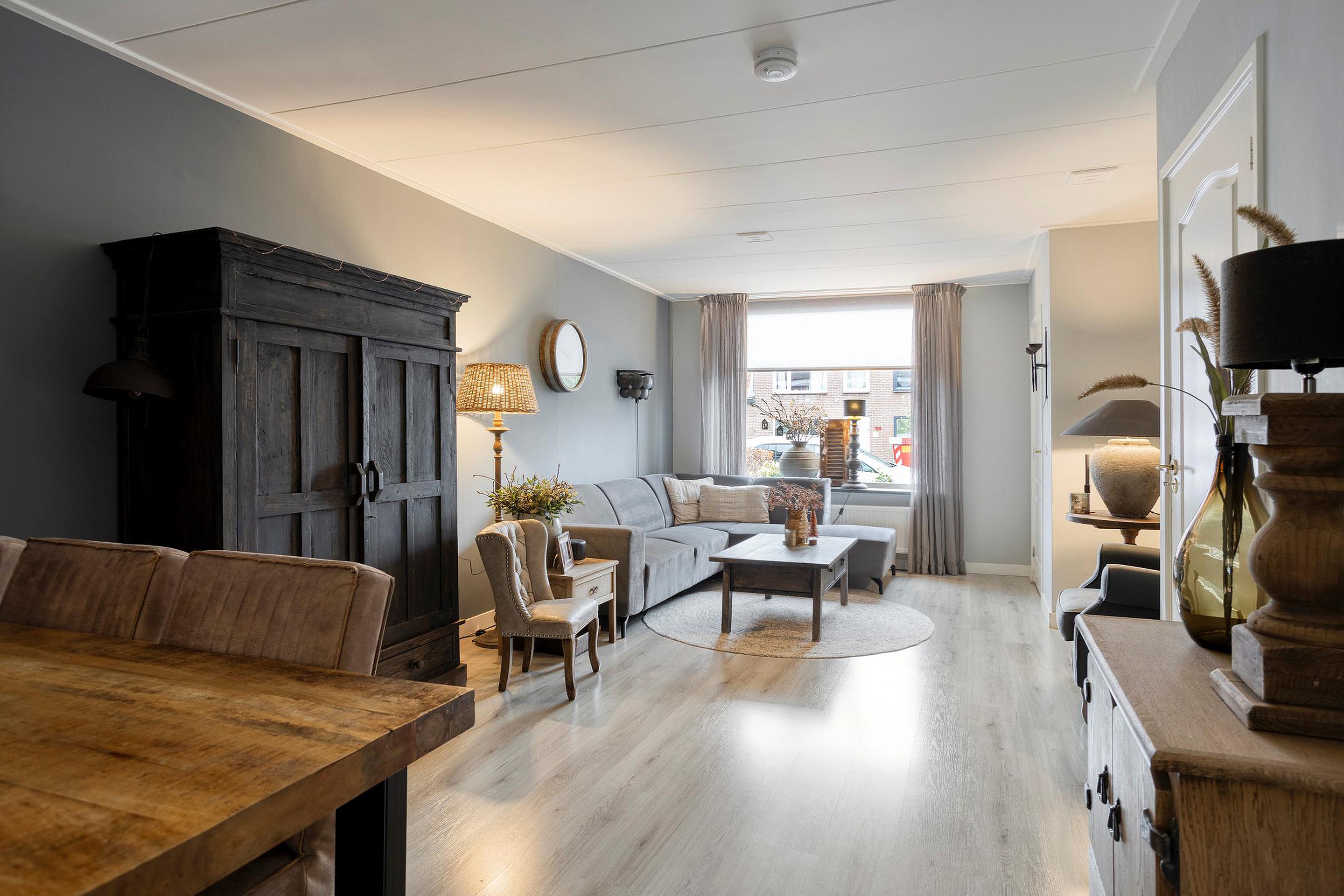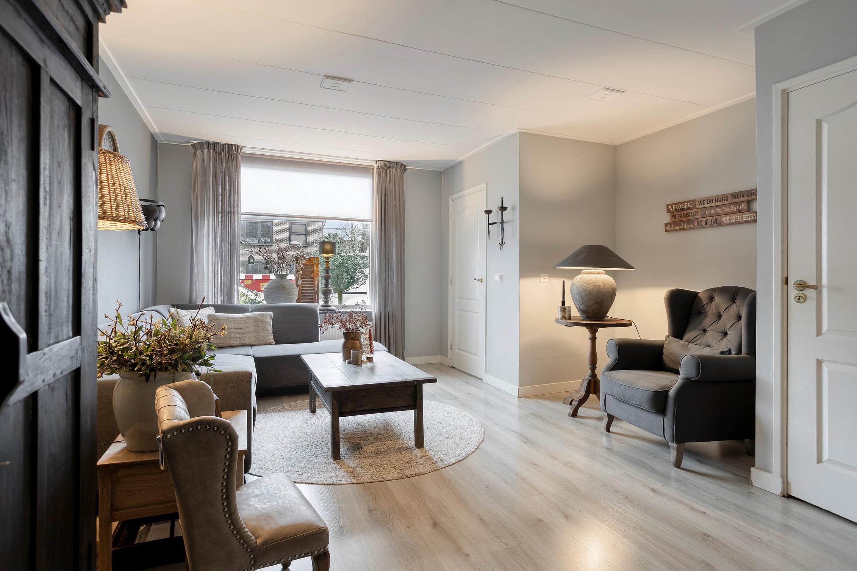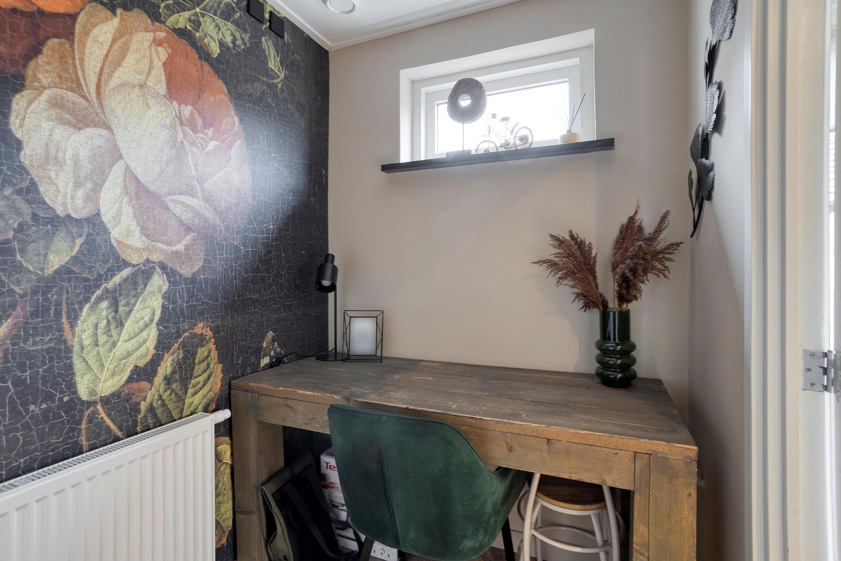 De entree geeft toegang tot een compacte hal met de meterkast, waarna u doorloopt naar de verrassend ruime woonkamer. Het lichtinval via het grote voorraam zorgt voor veel licht in de woonkamer, en er is genoeg ruimte voor een sfeervolle indeling waar wonen en eten moeiteloos in elkaar kunnen overlopen. Aan de achterzijde bereikt u de landelijke keuken, uitgevoerd in een zachte tint en voorzien van een combi-oven, gaskookplaat, schouwafzuigkap, vaatwasser, koelkast en veel bergruimte. De keuken biedt tevens toegang tot een kantoorruimte en de achtertuin. Vanuit de tussenhal bereikt u het moderne toilet en de trap naar boven.