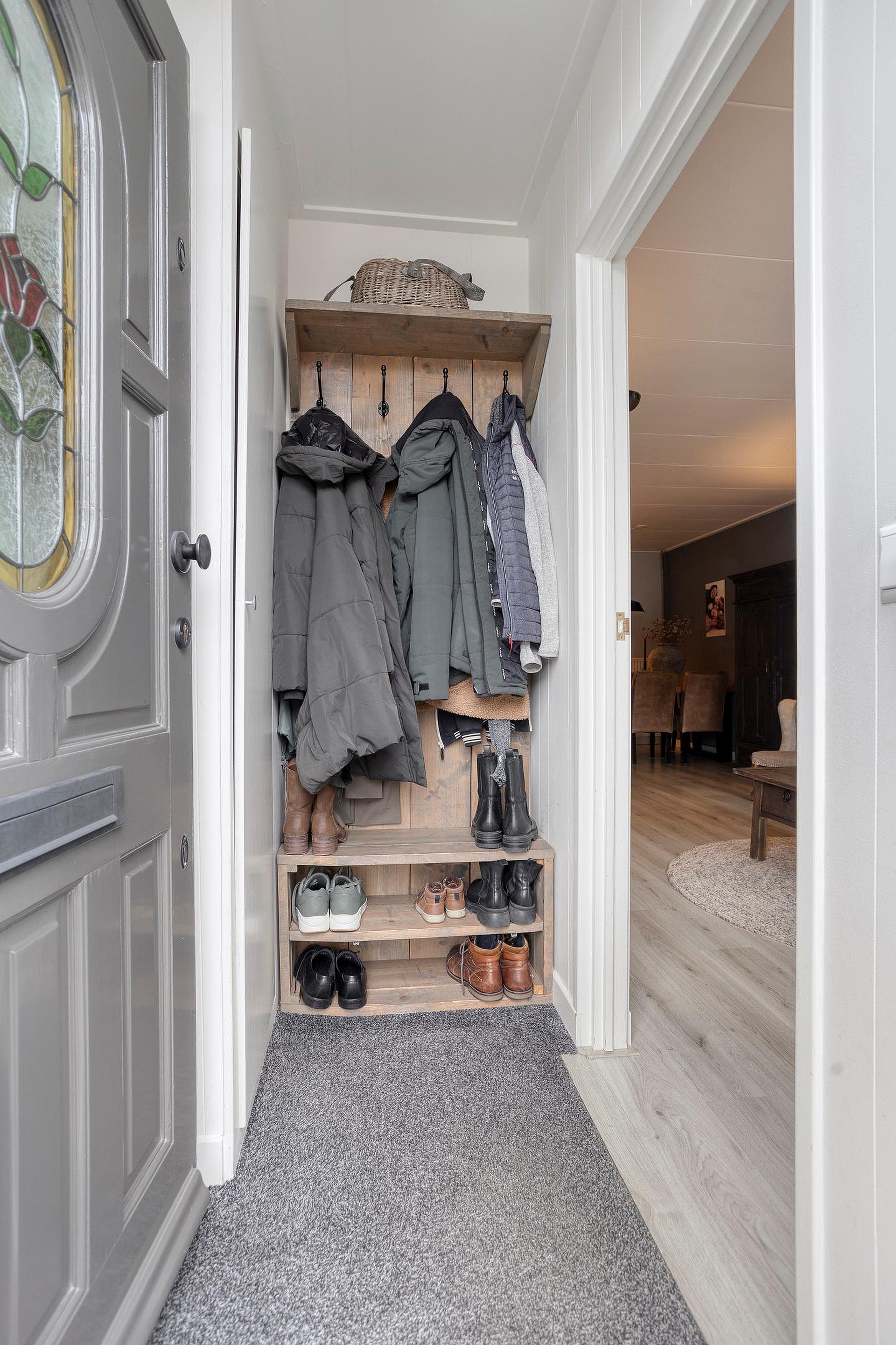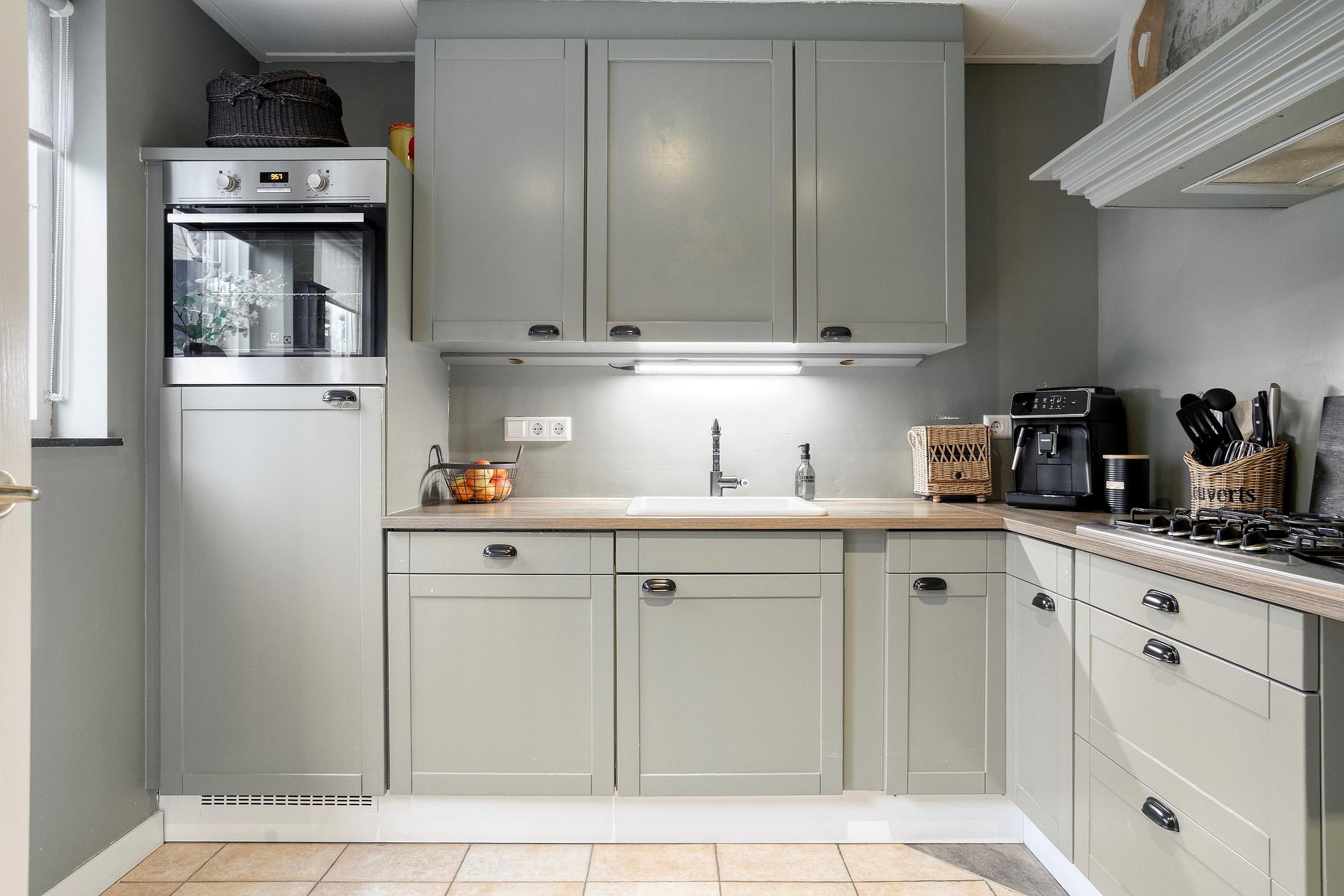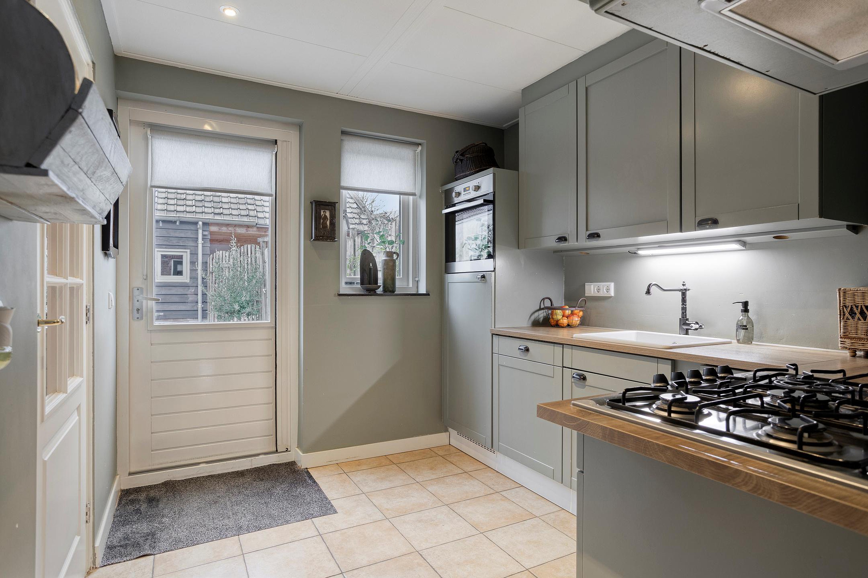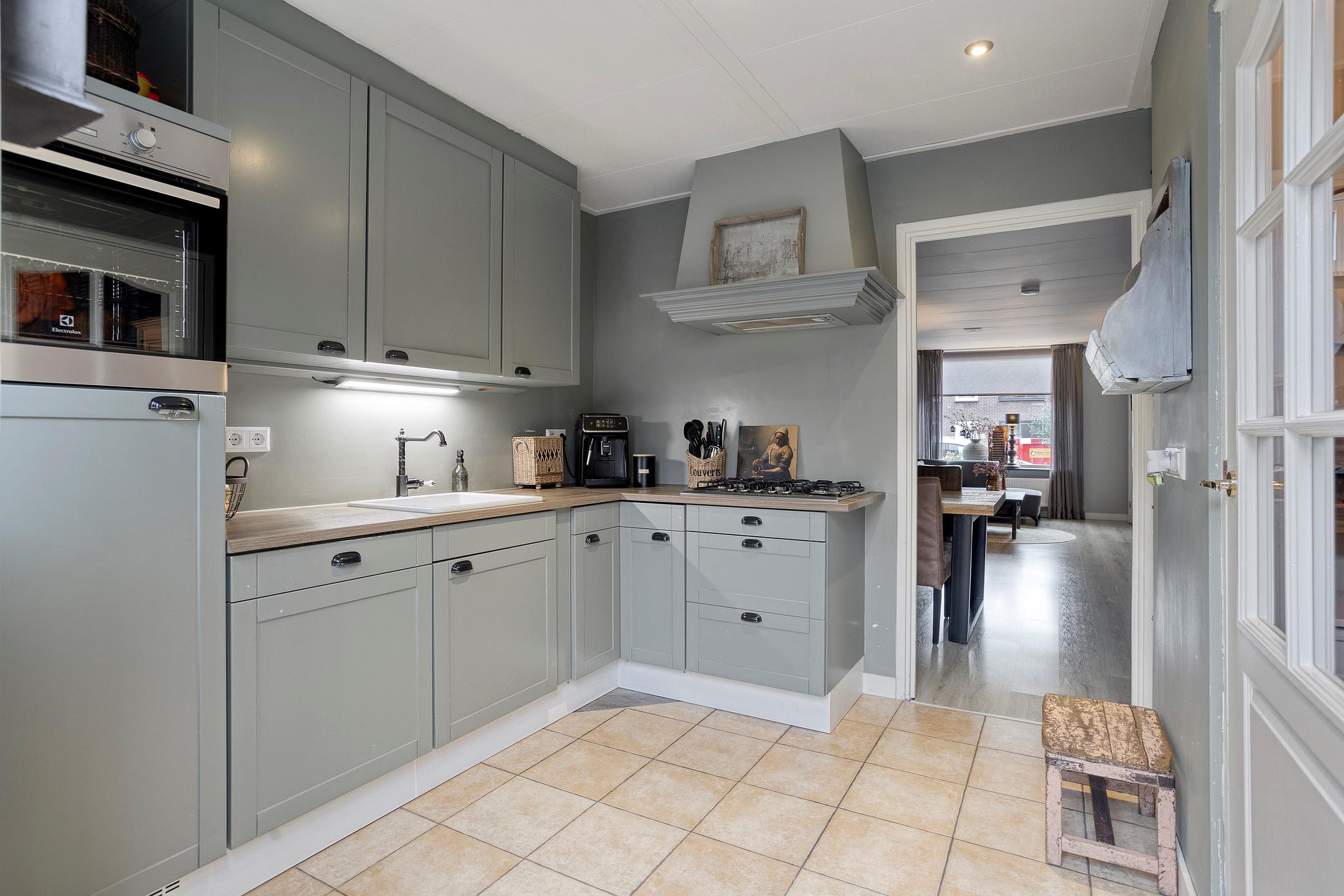 De entree geeft toegang tot een compacte hal met de meterkast, waarna u doorloopt naar de verrassend ruime woonkamer. Het lichtinval via het grote voorraam zorgt voor veel licht in de woonkamer, en er is genoeg ruimte voor een sfeervolle indeling waar wonen en eten moeiteloos in elkaar kunnen overlopen. Aan de achterzijde bereikt u de landelijke keuken, uitgevoerd in een zachte tint en voorzien van een combi-oven, gaskookplaat, schouwafzuigkap, vaatwasser, koelkast en veel bergruimte. De keuken biedt tevens toegang tot een kantoorruimte en de achtertuin. Vanuit de tussenhal bereikt u het moderne toilet en de trap naar boven.