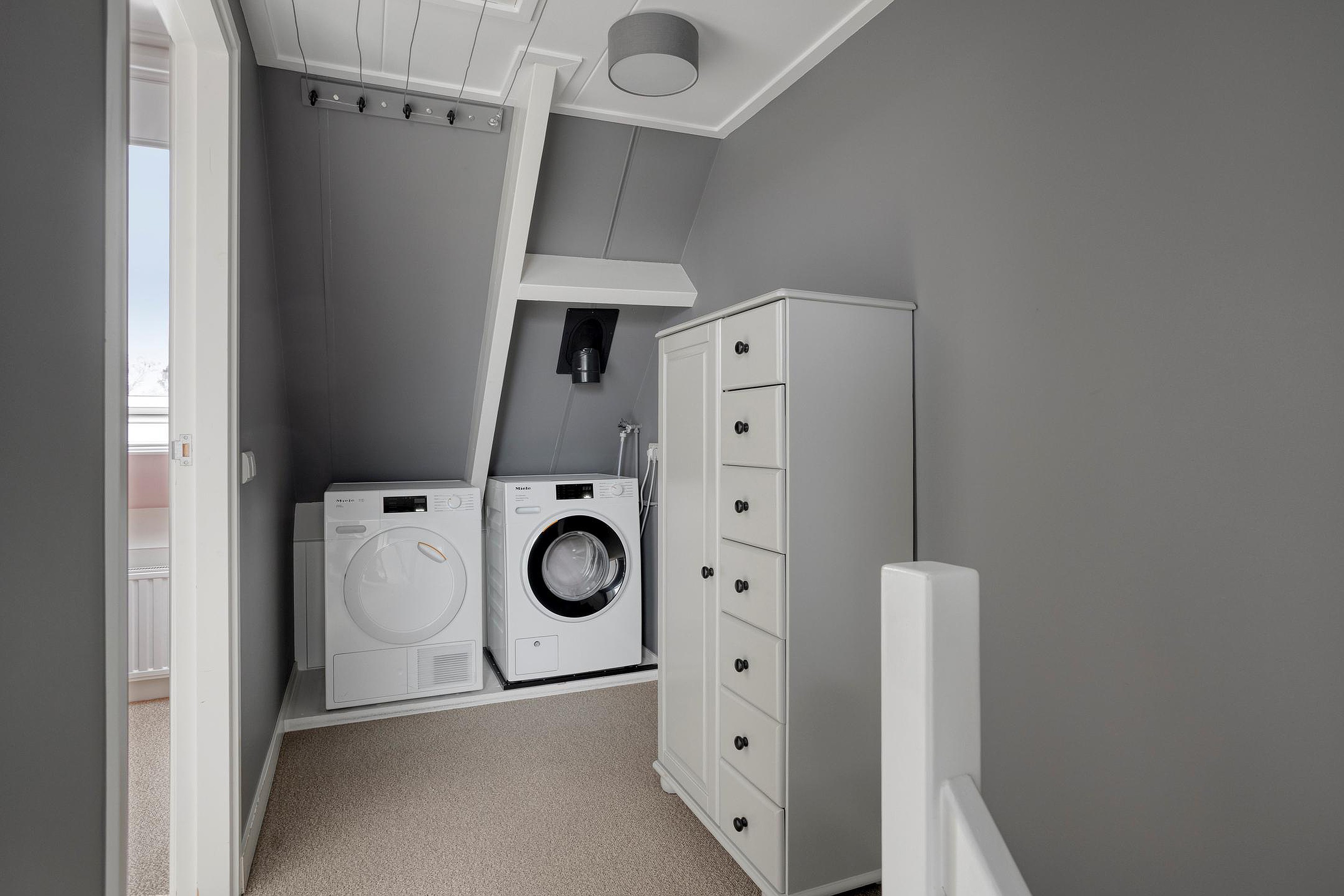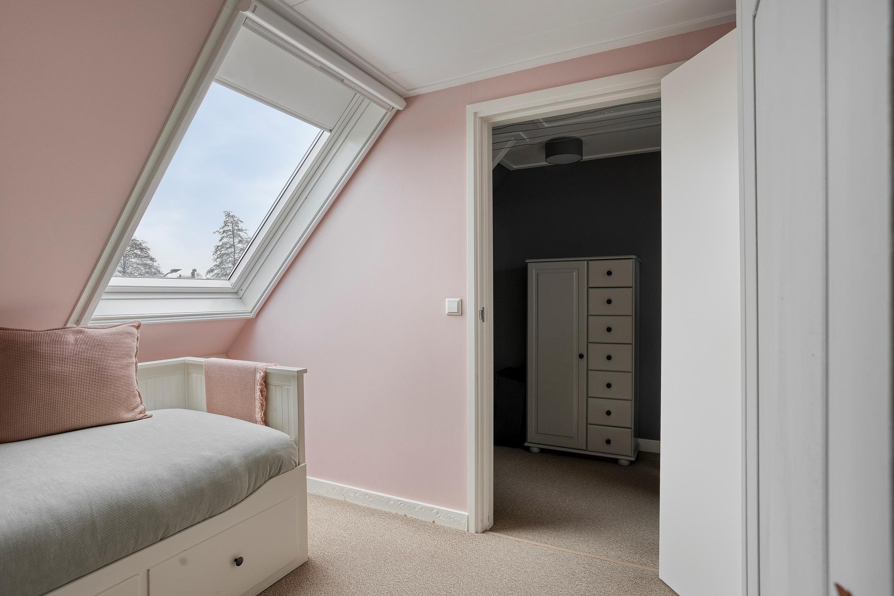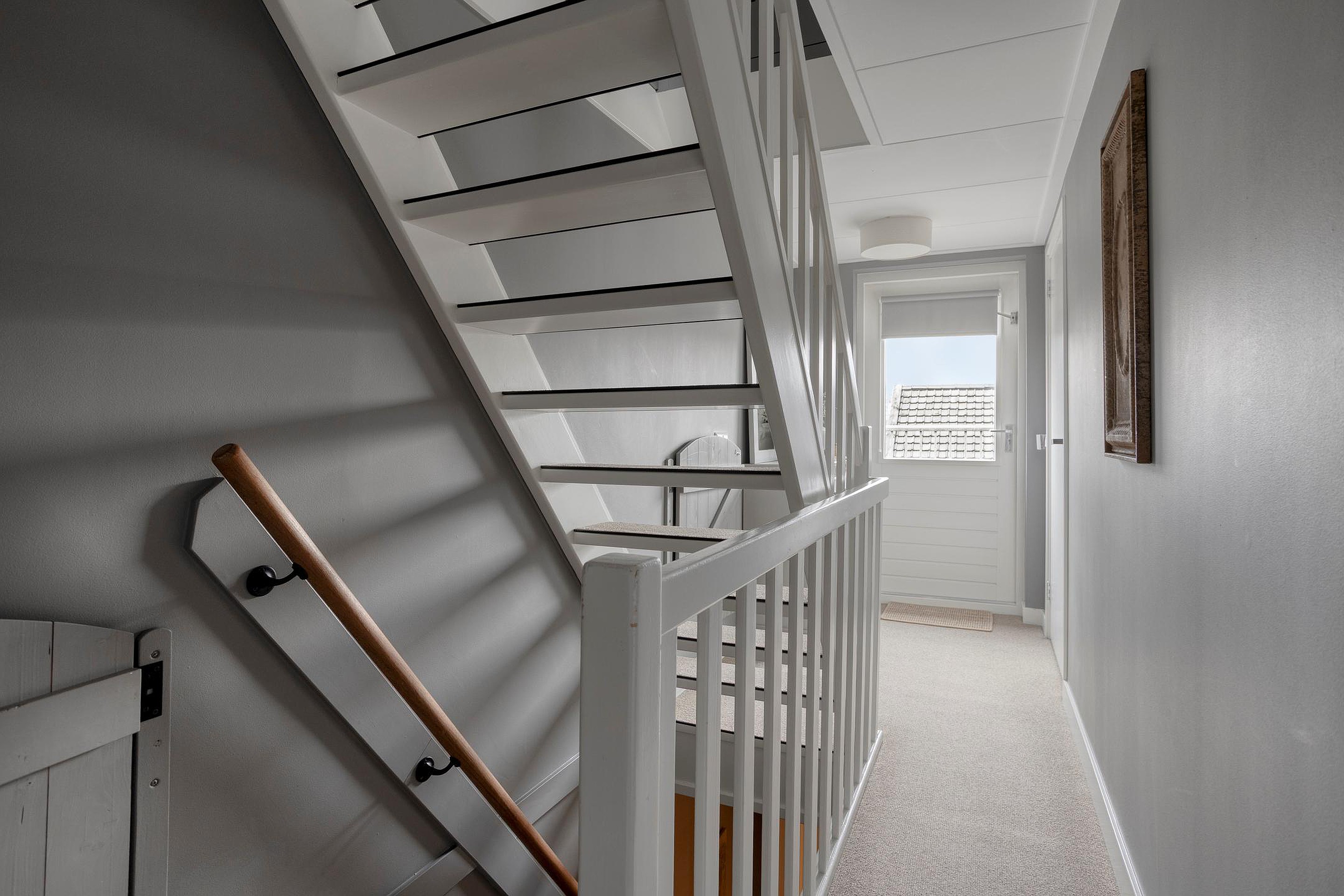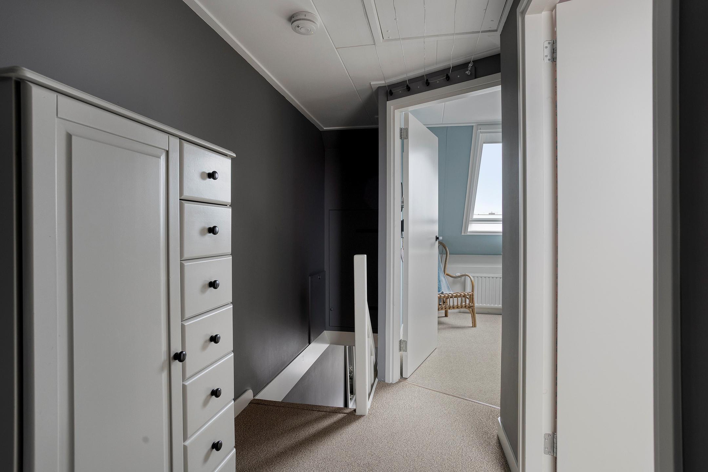 Een vaste trap brengt u op de tweede verdieping; deze biedt twee extra slaapkamers, elk kamer is charmant afgewerkt en voorzien van een dakraam die zorgt voor veel daglicht. De verdieping is strak afgewerkt en voelt verrassend ruim dankzij de slimme indeling onder het schuine dak. Op de overloop vindt u een aparte opstelling voor de wasmachine en droger, waardoor deze verdieping multifunctioneel te gebruiken is: van extra slaapkamers tot logeerkamers, of wellicht als werkruimte. Middels een vlizotrap krijgt u toegang tot de bergzolder, waar u extra opbergruimte vindt.