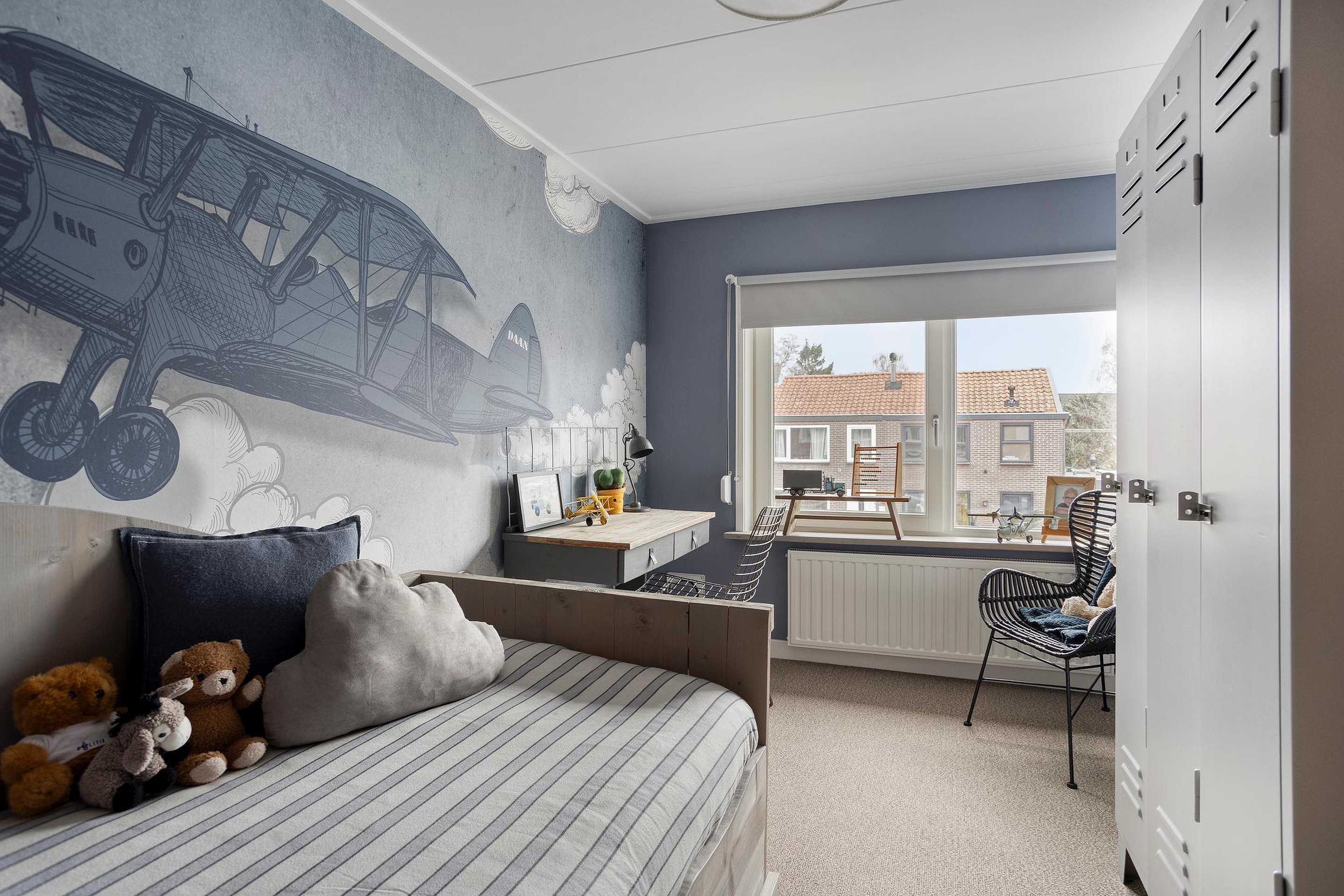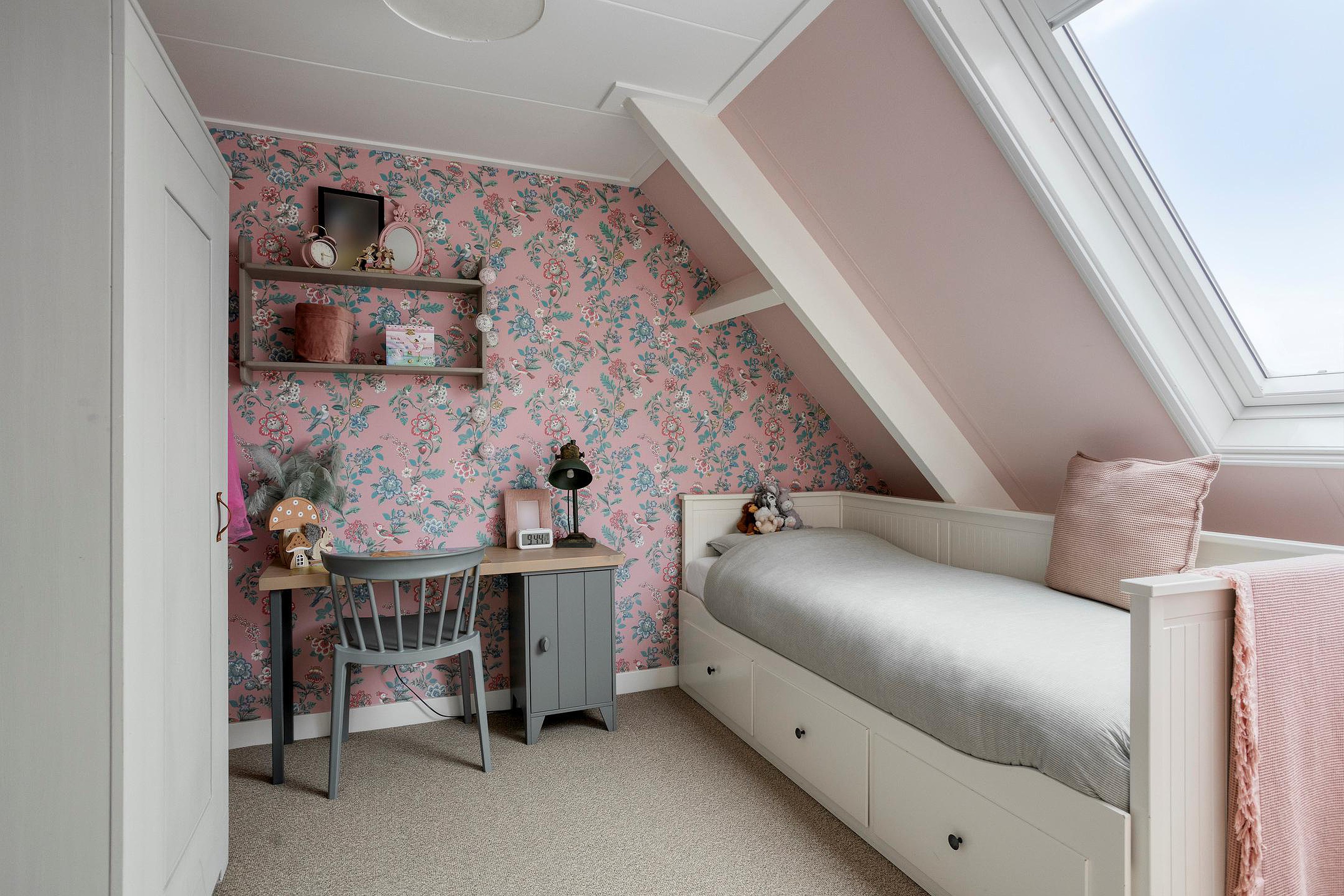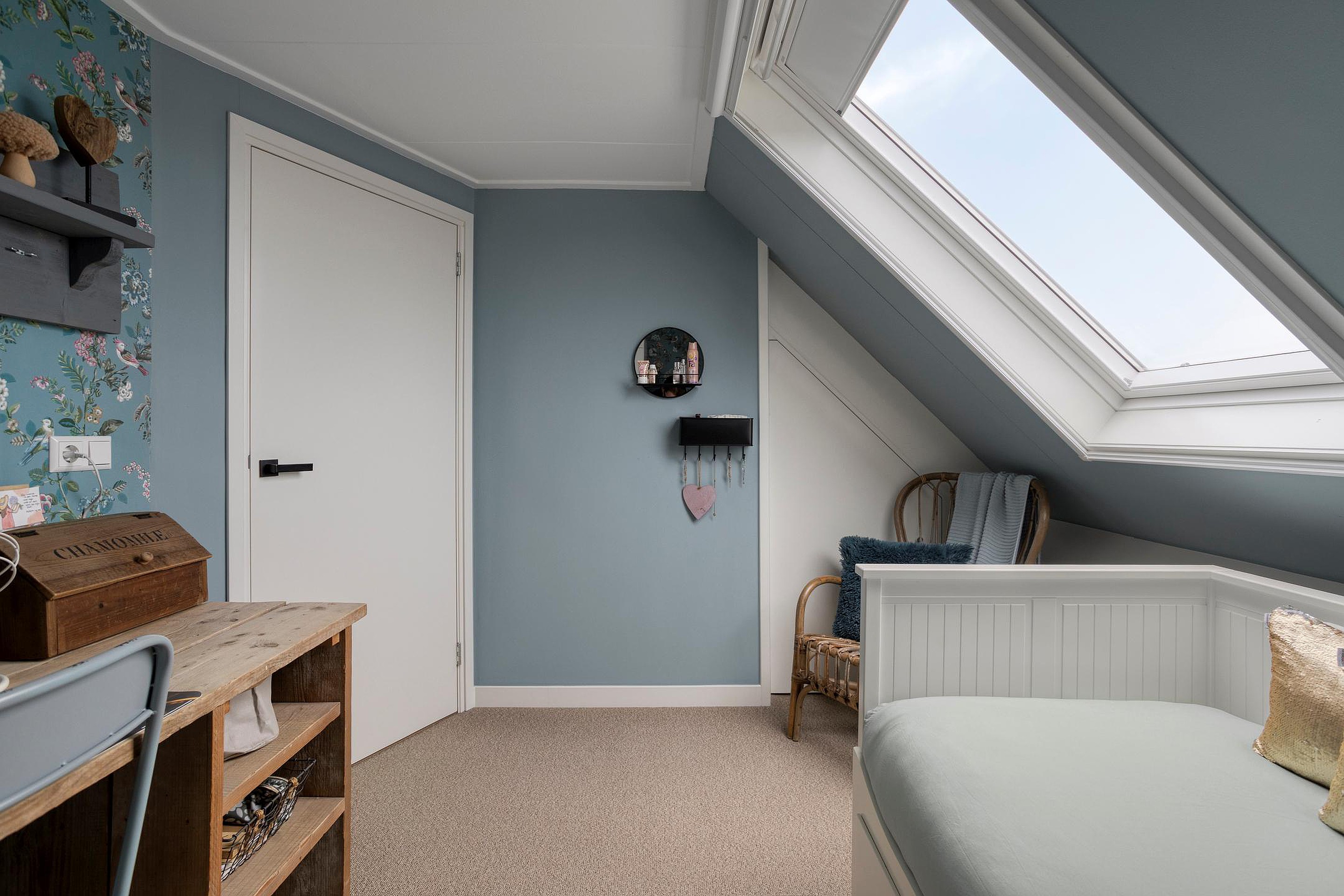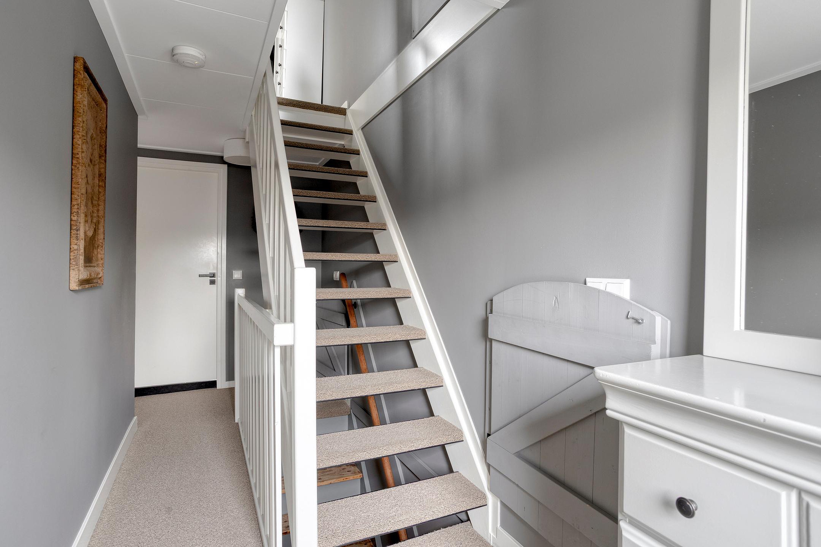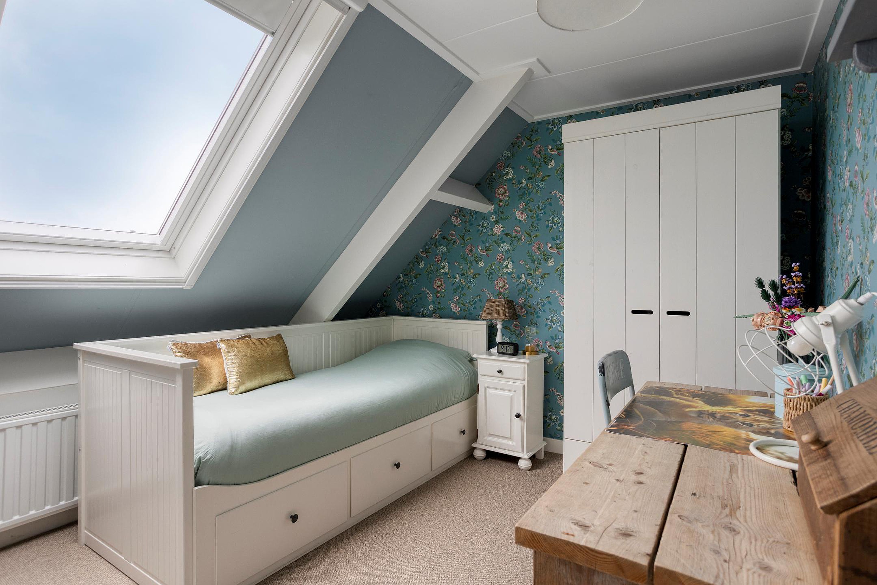 Een vaste trap brengt u op de tweede verdieping; deze biedt twee extra slaapkamers, elk kamer is charmant afgewerkt en voorzien van een dakraam die zorgt voor veel daglicht. De verdieping is strak afgewerkt en voelt verrassend ruim dankzij de slimme indeling onder het schuine dak. Op de overloop vindt u een aparte opstelling voor de wasmachine en droger, waardoor deze verdieping multifunctioneel te gebruiken is: van extra slaapkamers tot logeerkamers, of wellicht als werkruimte. Middels een vlizotrap krijgt u toegang tot de bergzolder, waar u extra opbergruimte vindt.