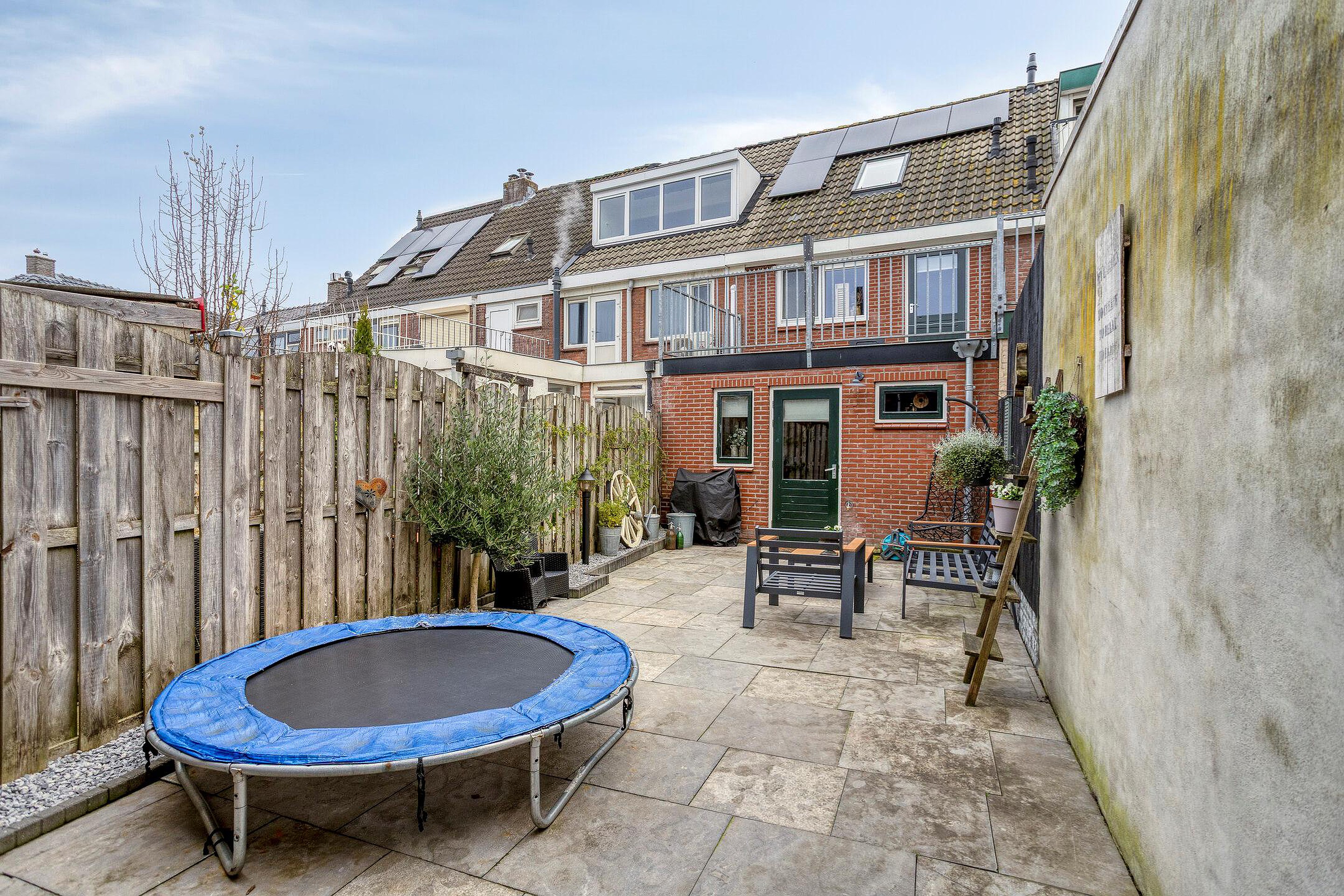 De achtertuin is ruim, onderhoudsvriendelijk aangelegd en biedt volop mogelijkheden om te genieten van het buitenleven. Het grote, betegelde terras nodigt uit tot lange zomeravonden met vrienden, terwijl kinderen veilig kunnen spelen op de ruime oppervlakte. Achter in de tuin staat een royale, volledig houten berging met bergzolder: perfect voor fietsen, tuingereedschap of een hobbywerkplek. Er is tevens een overdekte achterom voor extra bereikbaarheid. Dankzij de beschutte ligging heeft u hier veel privacy en kunt u gedurende het hele jaar een fijne buitenplek creëren. De voortuin geeft de woning bovendien een verzorgd en uitnodigend aanzicht.