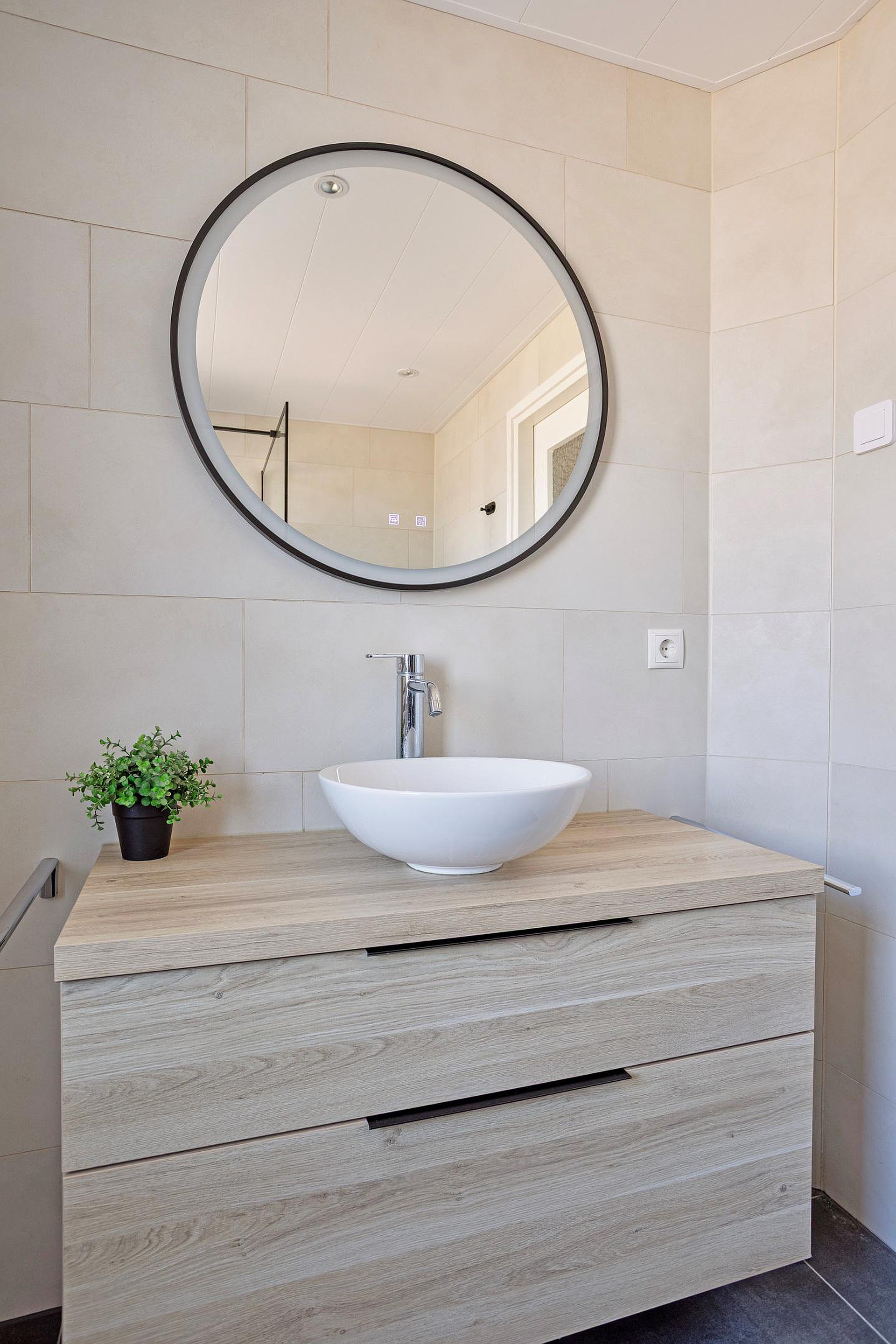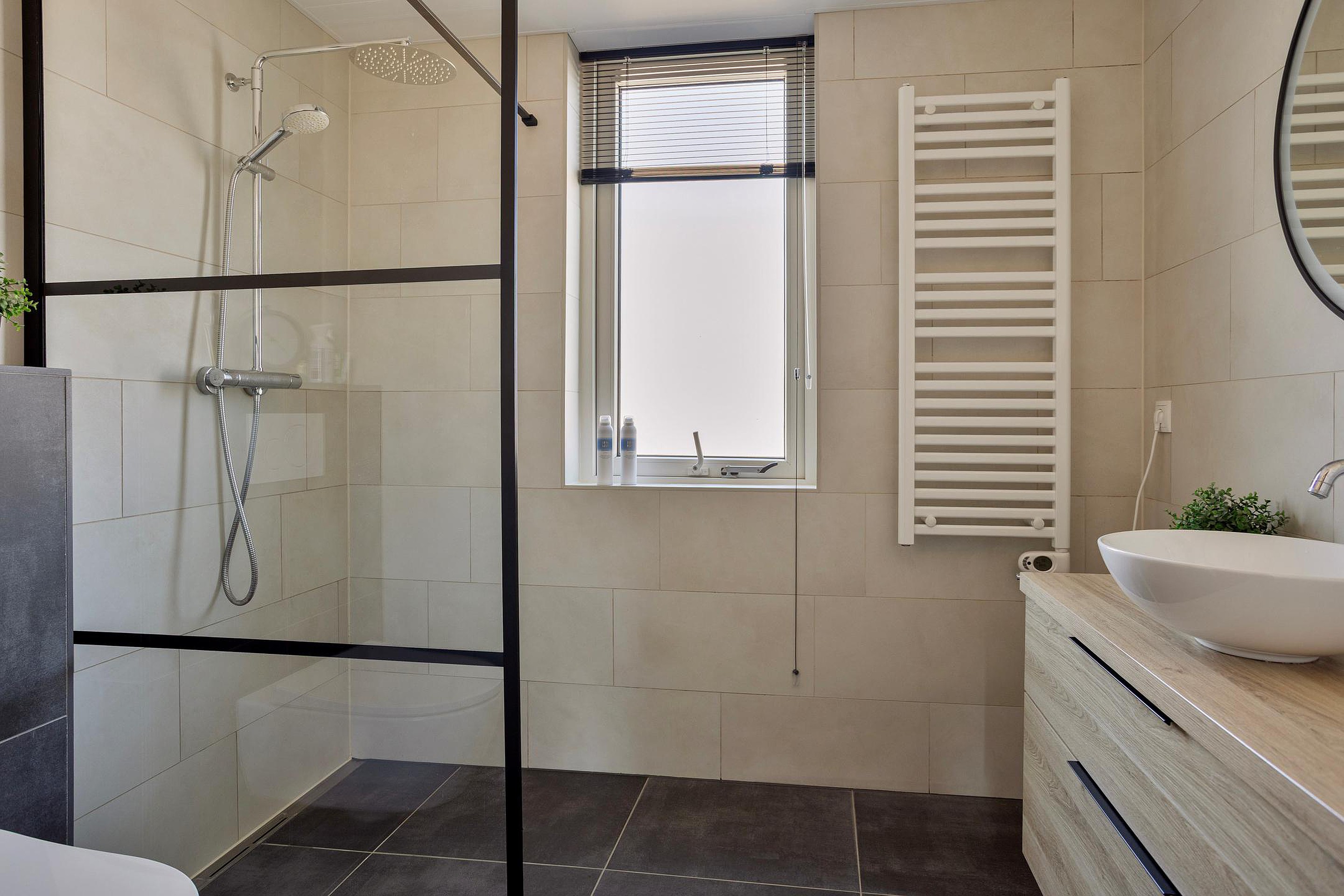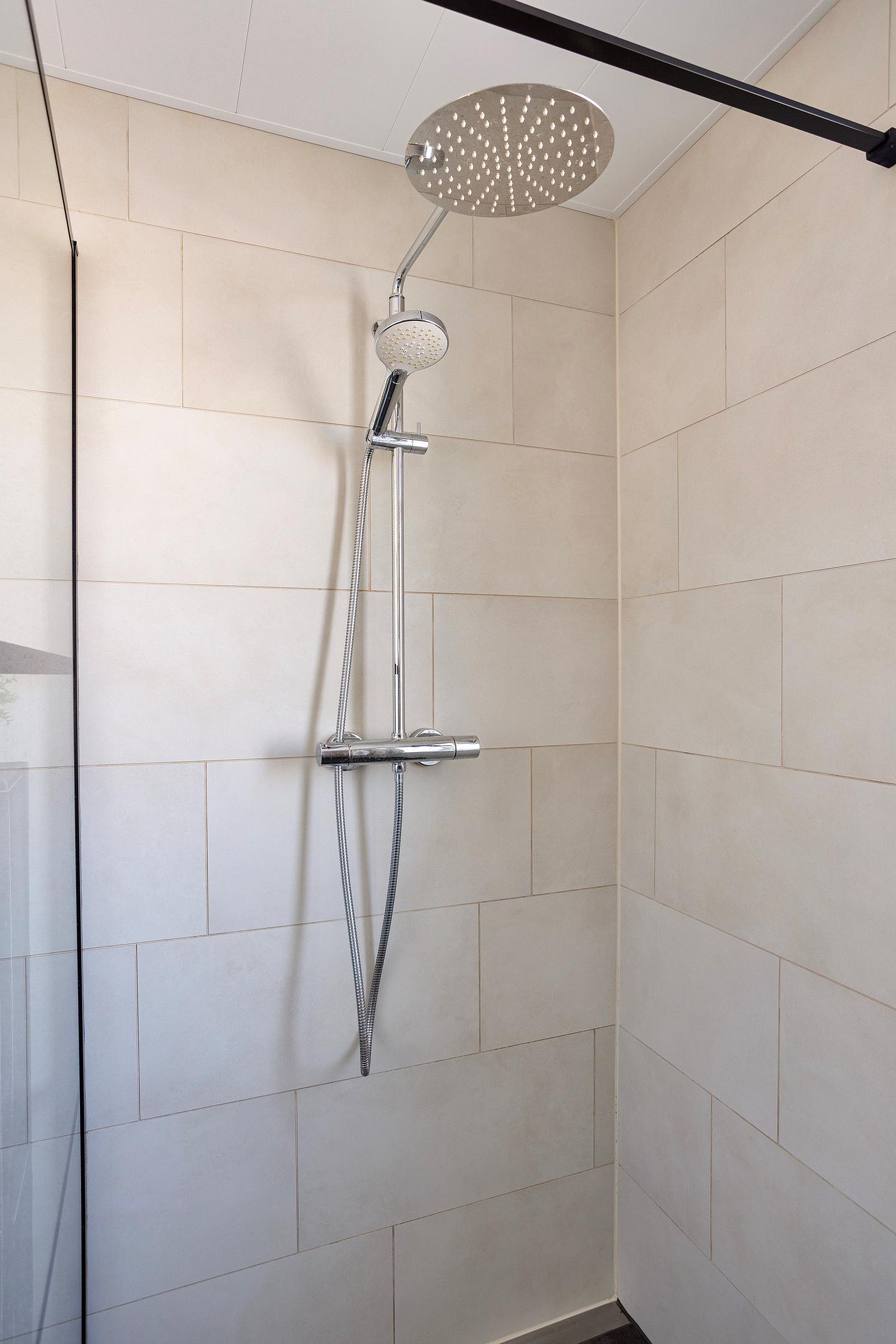 De moderne badkamer is volledig betegeld en grenst aan de overloop. Hier beschikt u over een inloopdouche met glazen wand, een wastafel, een zwevend toilet en een handdoekradiator. Daarnaast is de badkamer voorzien van vloerverwarming. De verzorgde afwerking zorgt voor een comfortabele en eigentijdse uitstraling.