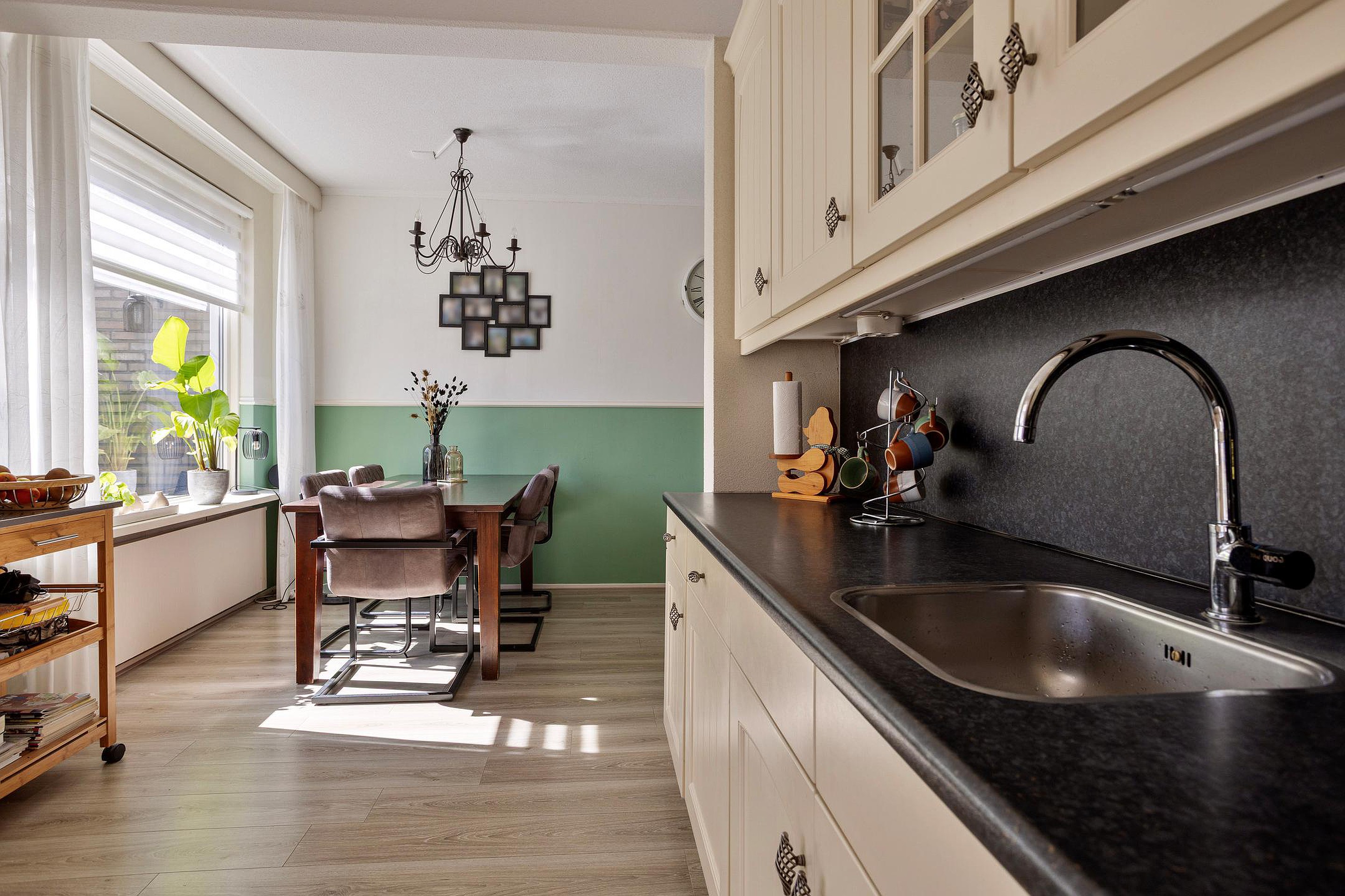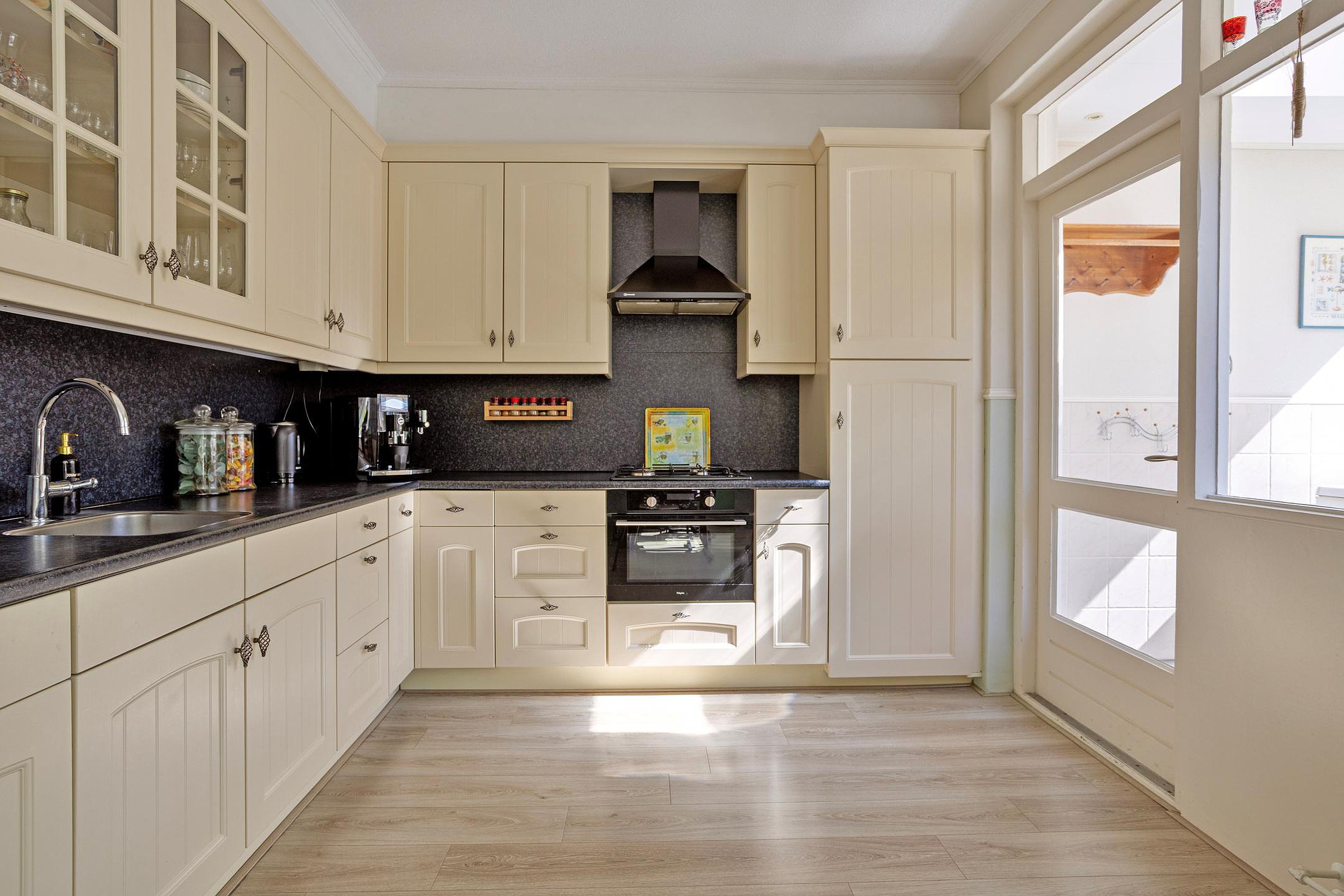 In het verlengde van de woonkamer bevindt zich de open keuken, die is uitgevoerd met een praktisch L-vormig aanrechtblad. De keuken is voorzien van diverse inbouwapparatuur, waaronder een gasfornuis met oven, afzuigkap, vaatwasmachine en koelkast. Daarnaast beschikt u over een spoelbak en voldoende opbergruimte, waardoor koken hier een plezierige bezigheid wordt. De keuken sluit naadloos aan op de woonruimte.