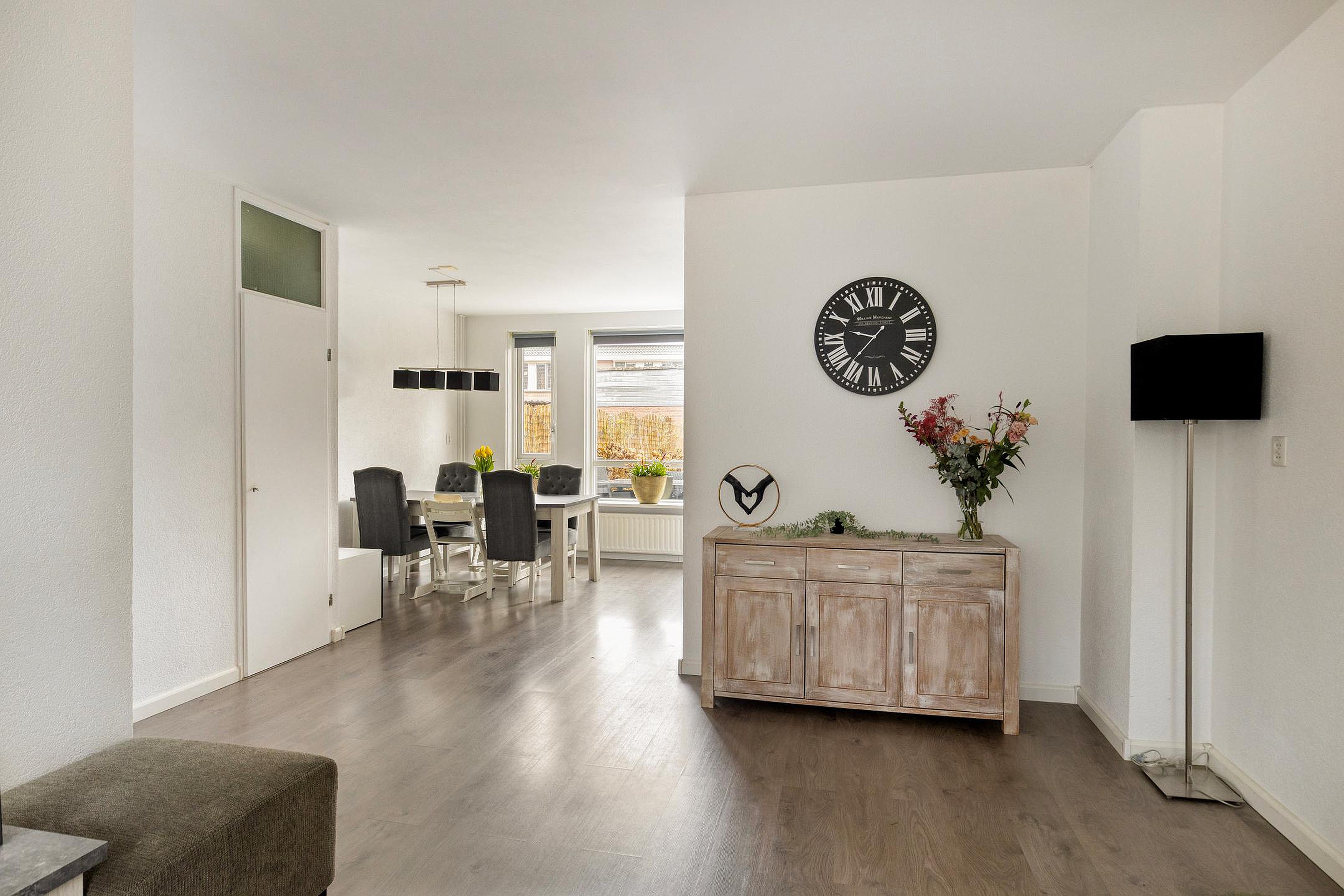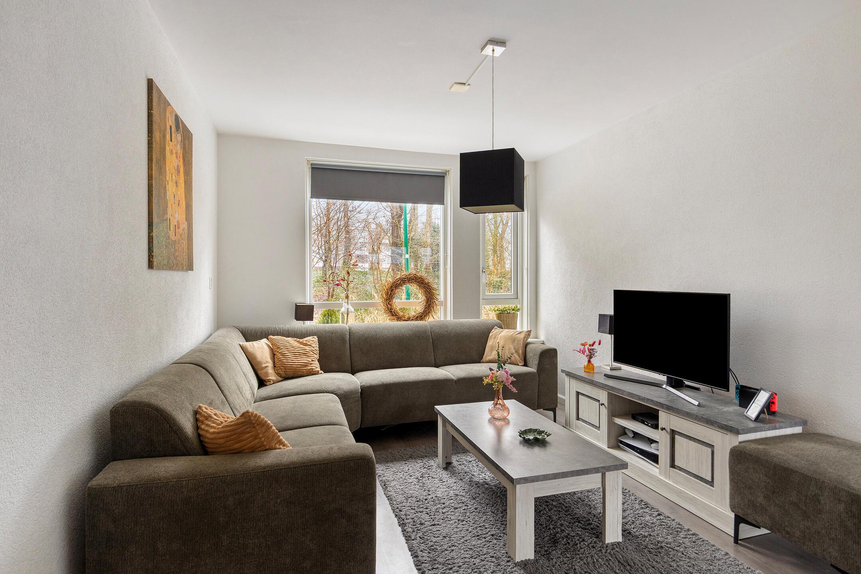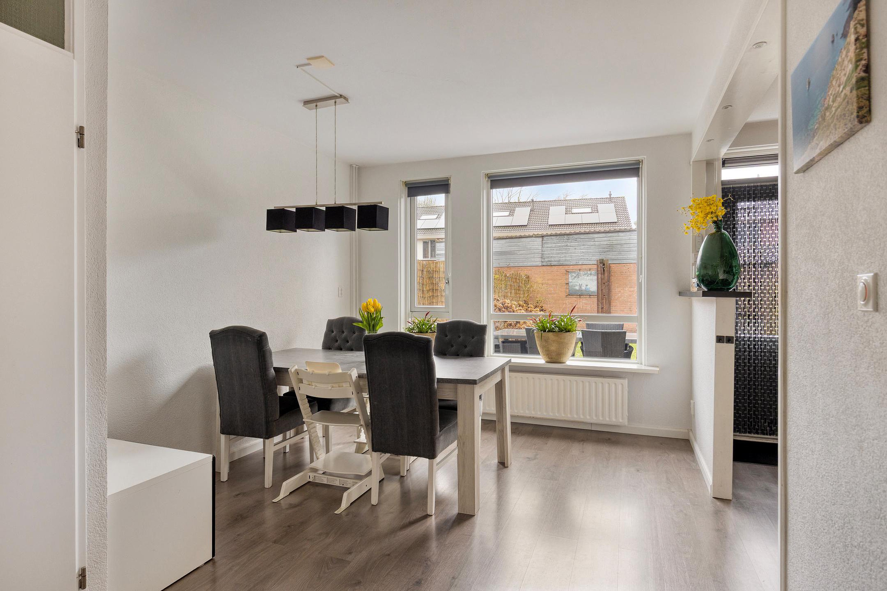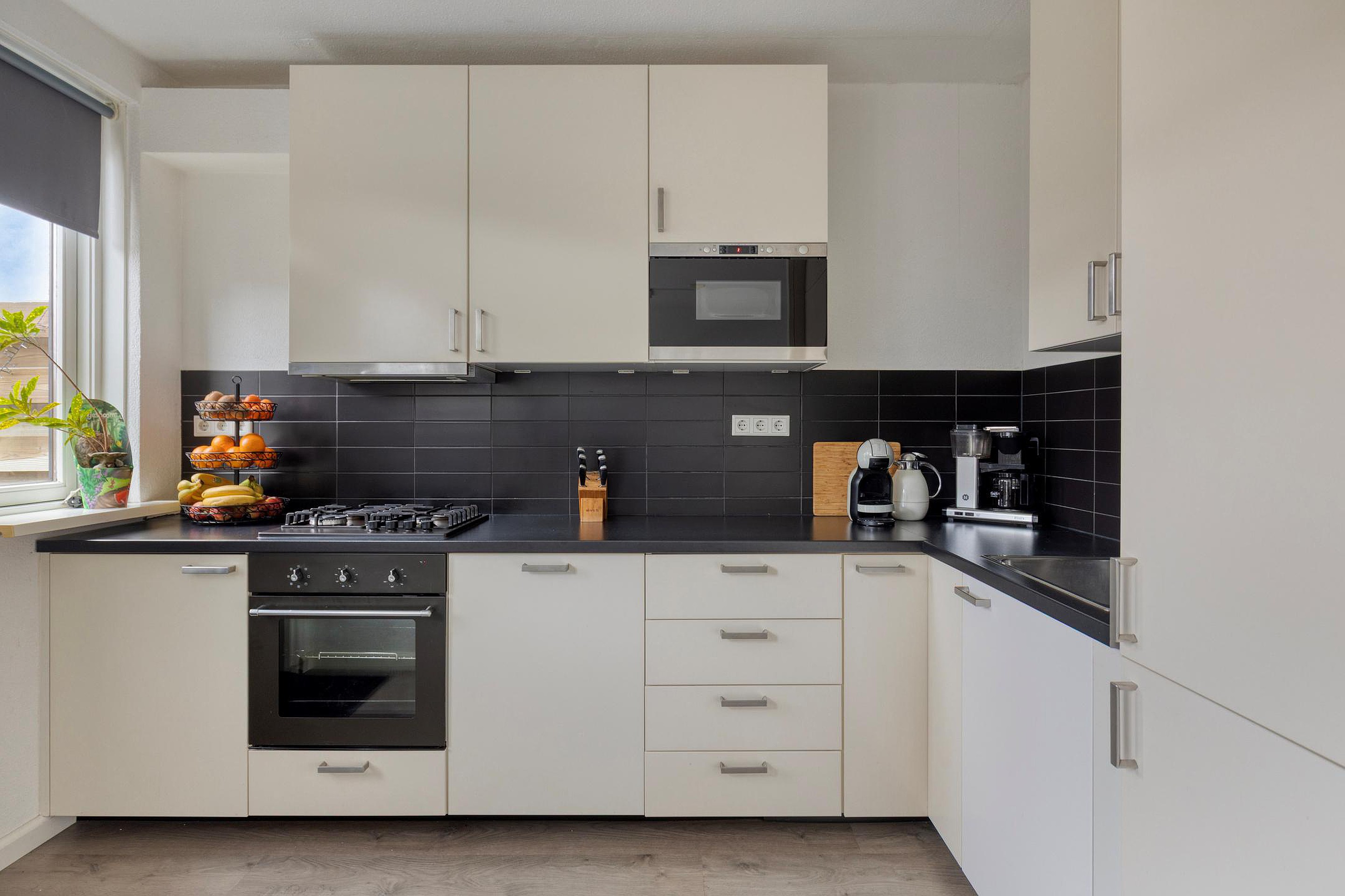 Via de verzorgde voortuin betreedt u de woning en komt u binnen in de hal met meterkast, trapopgang en toilet met fonteintje. Vanuit hier loopt u door naar de woonkamer, waar grote raampartijen aan zowel de voor- als achterzijde zorgen voor een prettige lichtinval gedurende de dag. De ruimte is strak afgewerkt en biedt volop plaats voor een royale zithoek aan de voorzijde en een grote eettafel aan de tuinzijde. Aan de achterzijde sluit de open keuken naadloos aan. Deze is uitgevoerd in lichte fronten met een donker werkblad en voorzien van een gaskookplaat, vlakscherm afzuigkap, oven, magnetron, koel-/vriescombinatie en vaatwasser. Vanuit de keuken heeft u direct toegang tot de achtertuin.