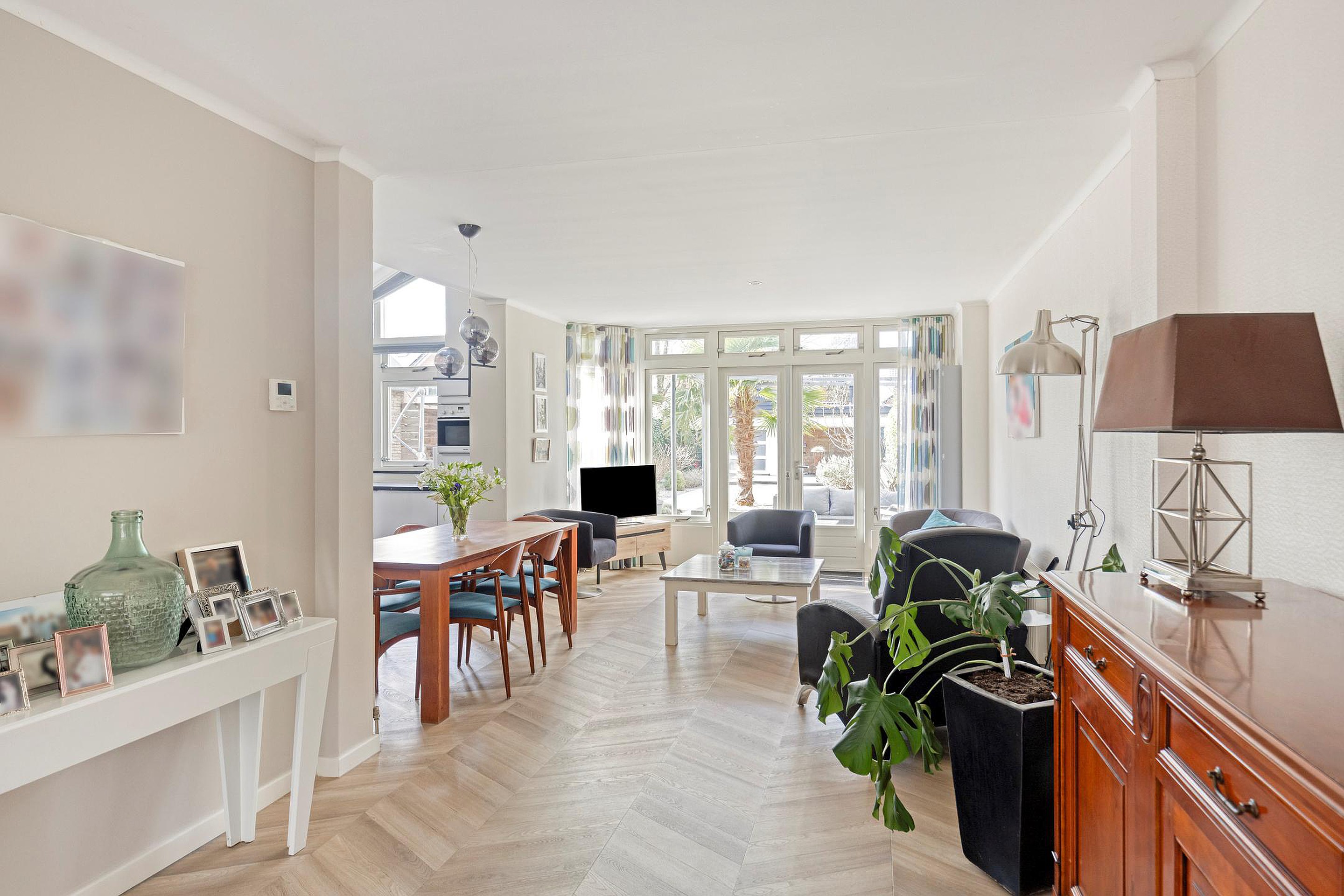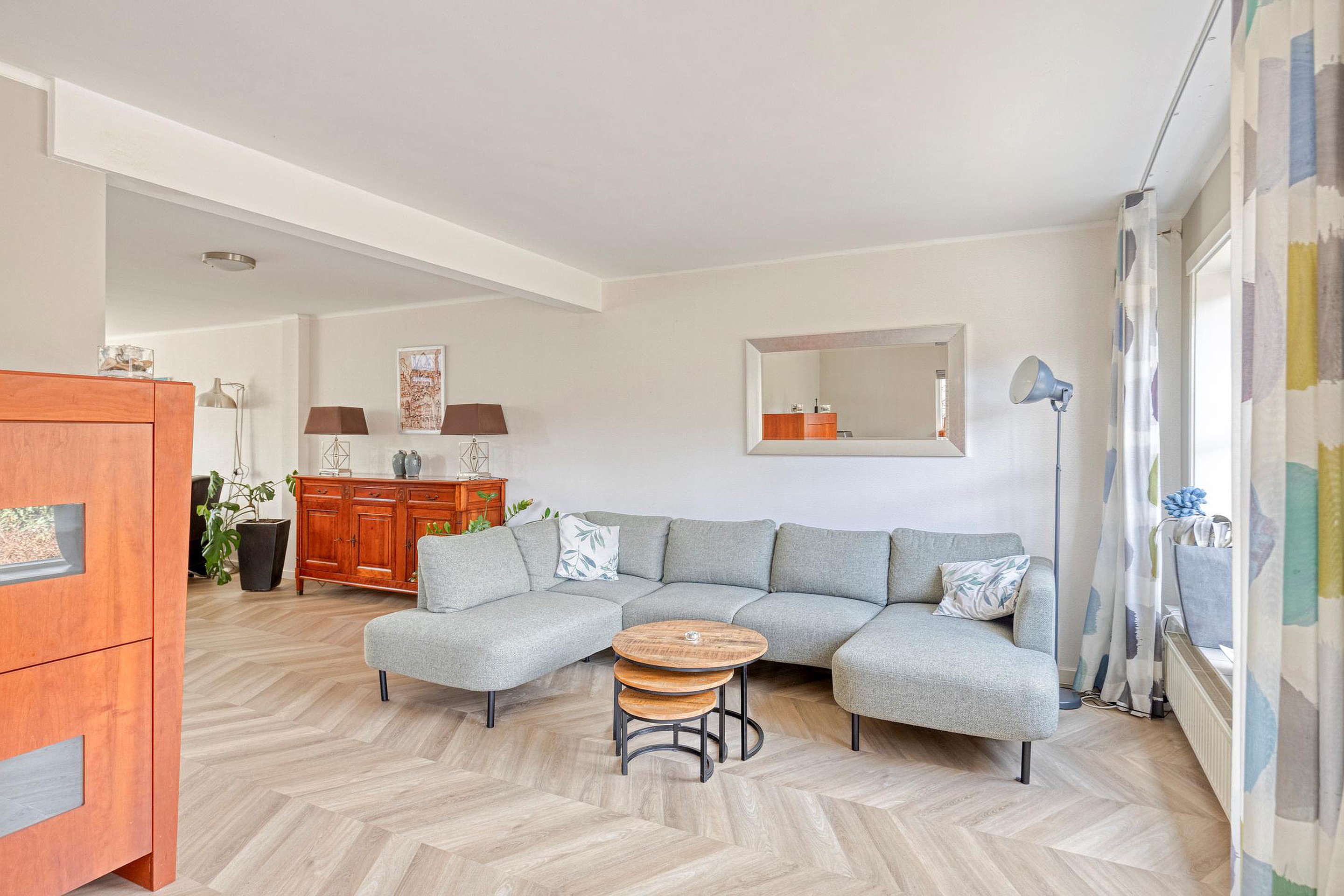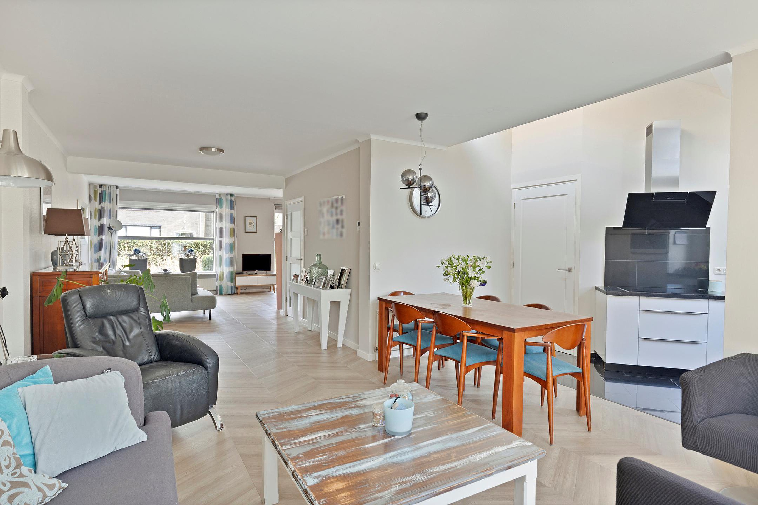 De woonkamer vormt het hart van de begane grond en kenmerkt zich door de open indeling en de aangename lichtinval. Grote raampartijen zorgen voor een ruimtelijk gevoel en de L-vormige indeling maakt het eenvoudig om een zithoek en een aparte eethoek te creëren. De ruimte loopt naadloos over in de keuken en via de openslaande deuren bereikt u de tuin.