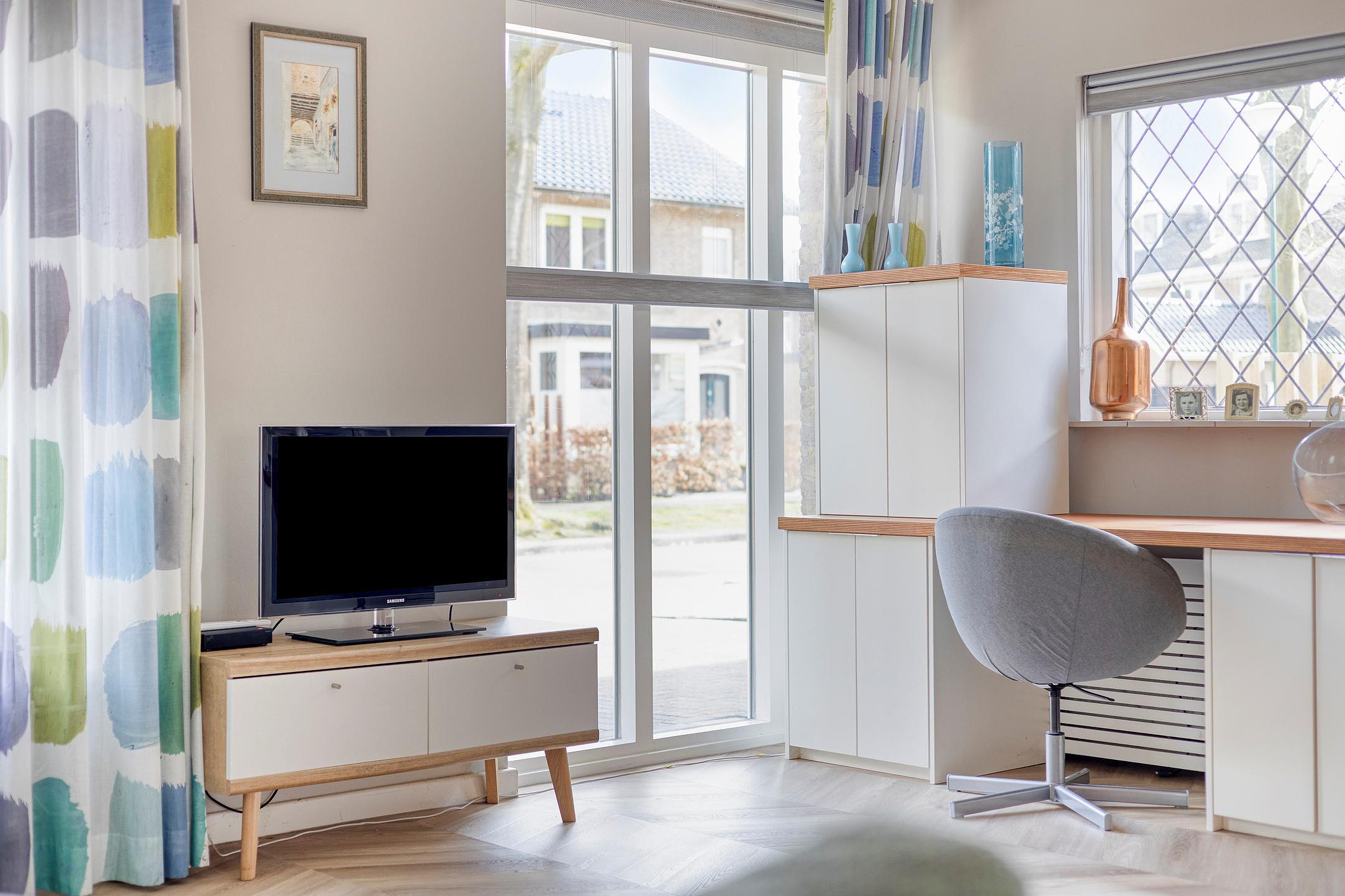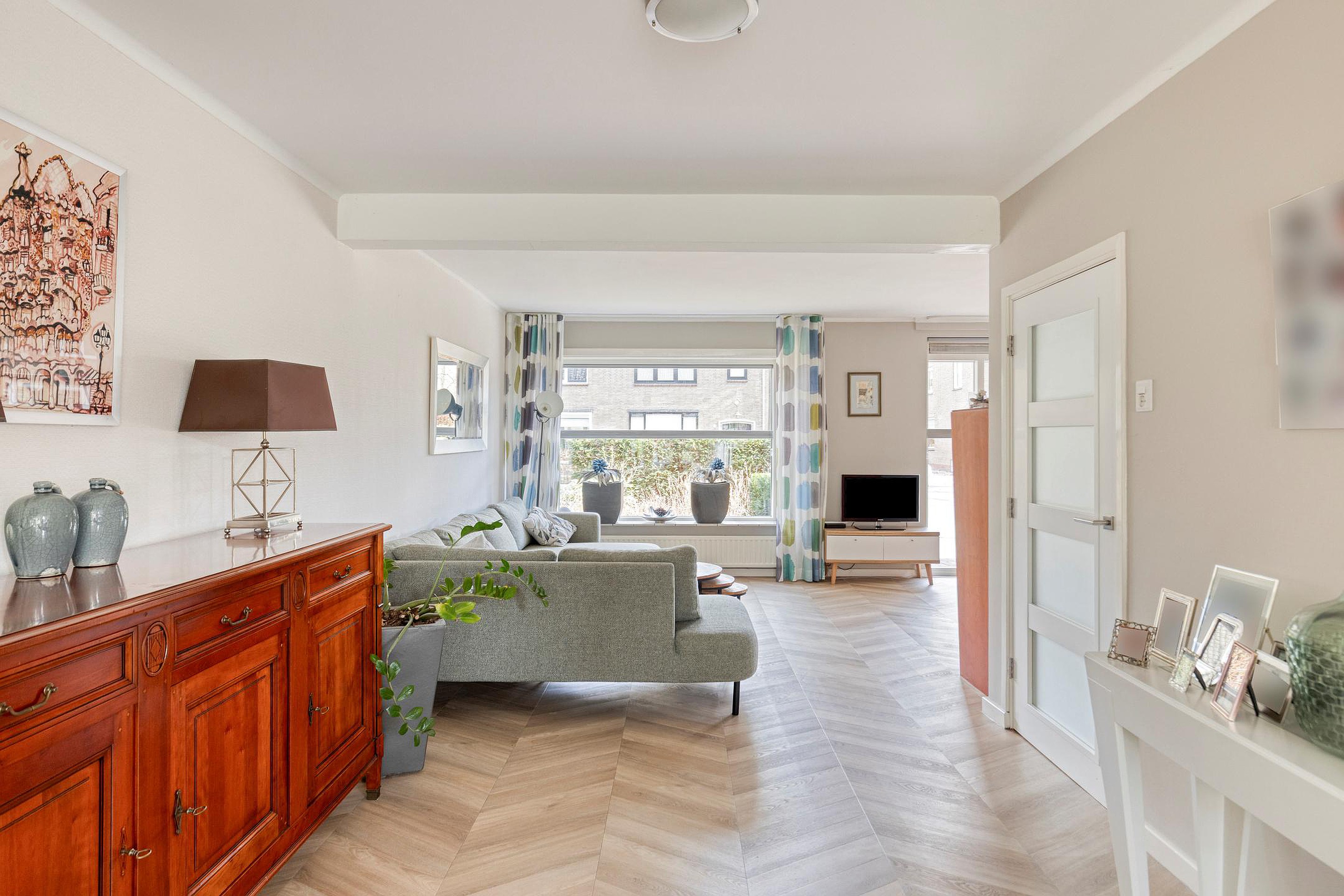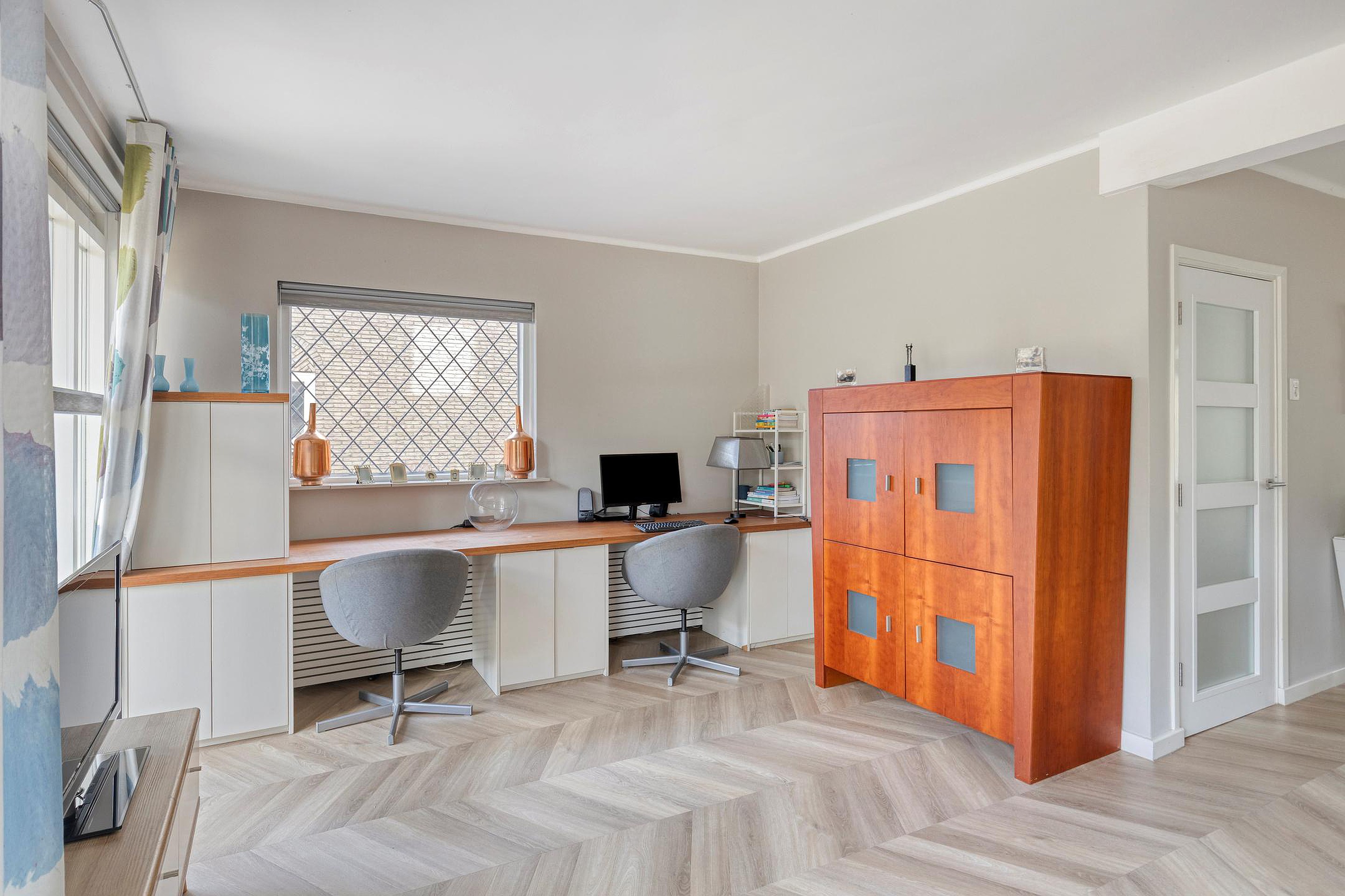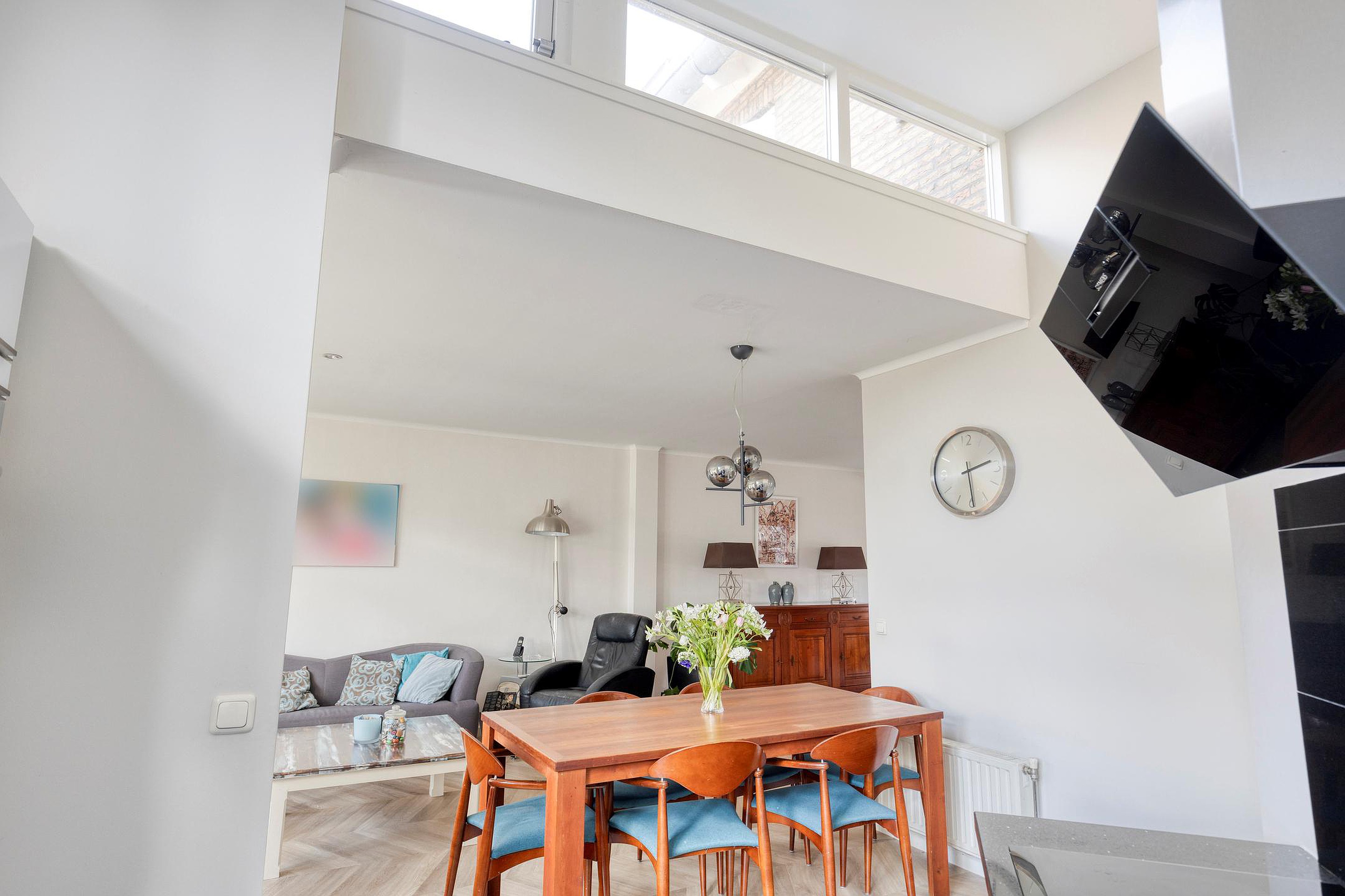 De woonkamer vormt het hart van de begane grond en kenmerkt zich door de open indeling en de aangename lichtinval. Grote raampartijen zorgen voor een ruimtelijk gevoel en de L-vormige indeling maakt het eenvoudig om een zithoek en een aparte eethoek te creëren. De ruimte loopt naadloos over in de keuken en via de openslaande deuren bereikt u de tuin.