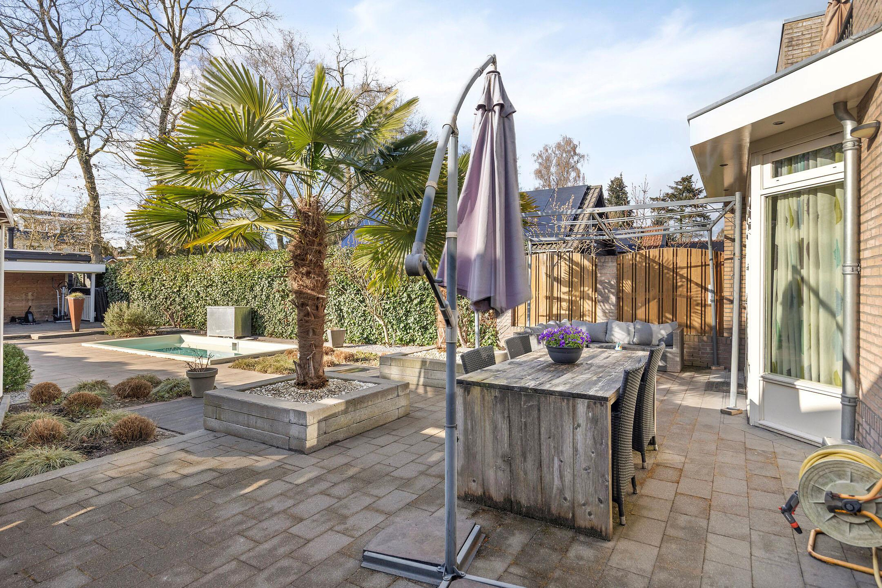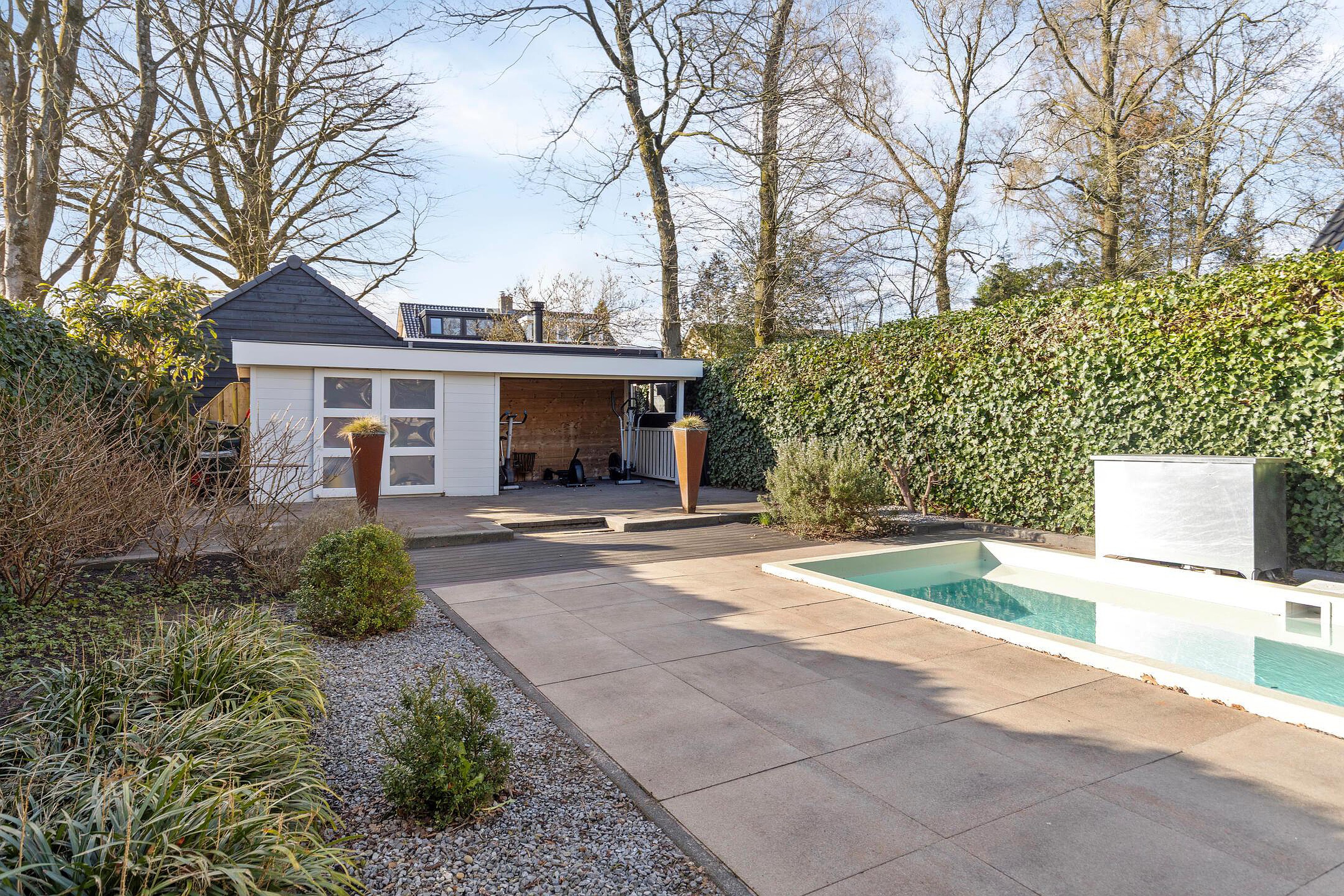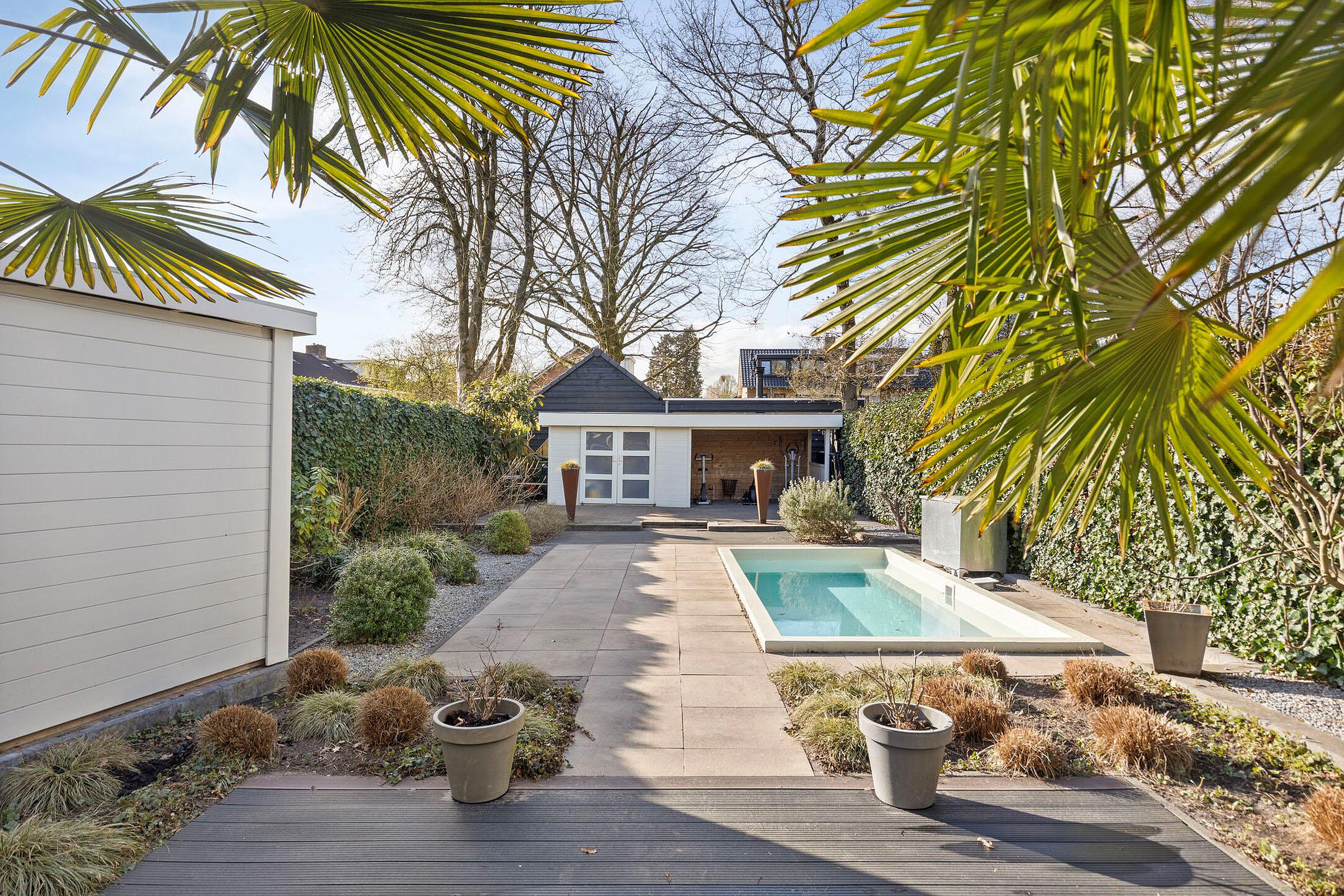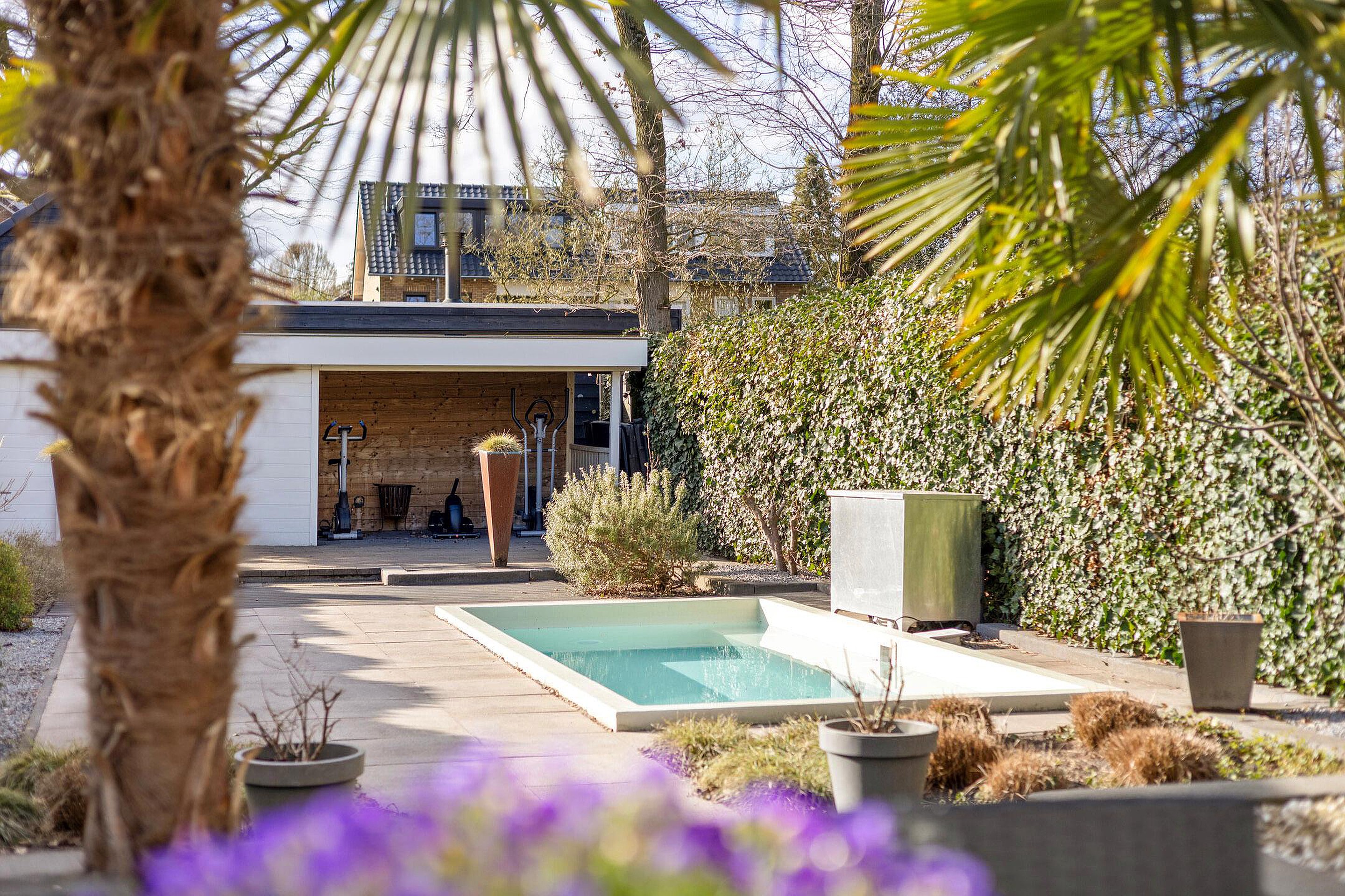De achtertuin op het zonnige westen is zonder twijfel een van de hoogtepunten van deze woning. U geniet hier van een open buitenruimte met een fijne combinatie van bestrating en groen. Er is volop ruimte voor het creëren van meerdere terrassen, zodat u op elk moment van de dag een plekje in de zon of schaduw kunt vinden. Het zwembad zorgt voor een luxe en ontspannen sfeer, perfect voor warme zomerdagen. Achterin de tuin bevinden zich een berging en een overkapping, en via de achterom is de tuin ook gemakkelijk bereikbaar.
