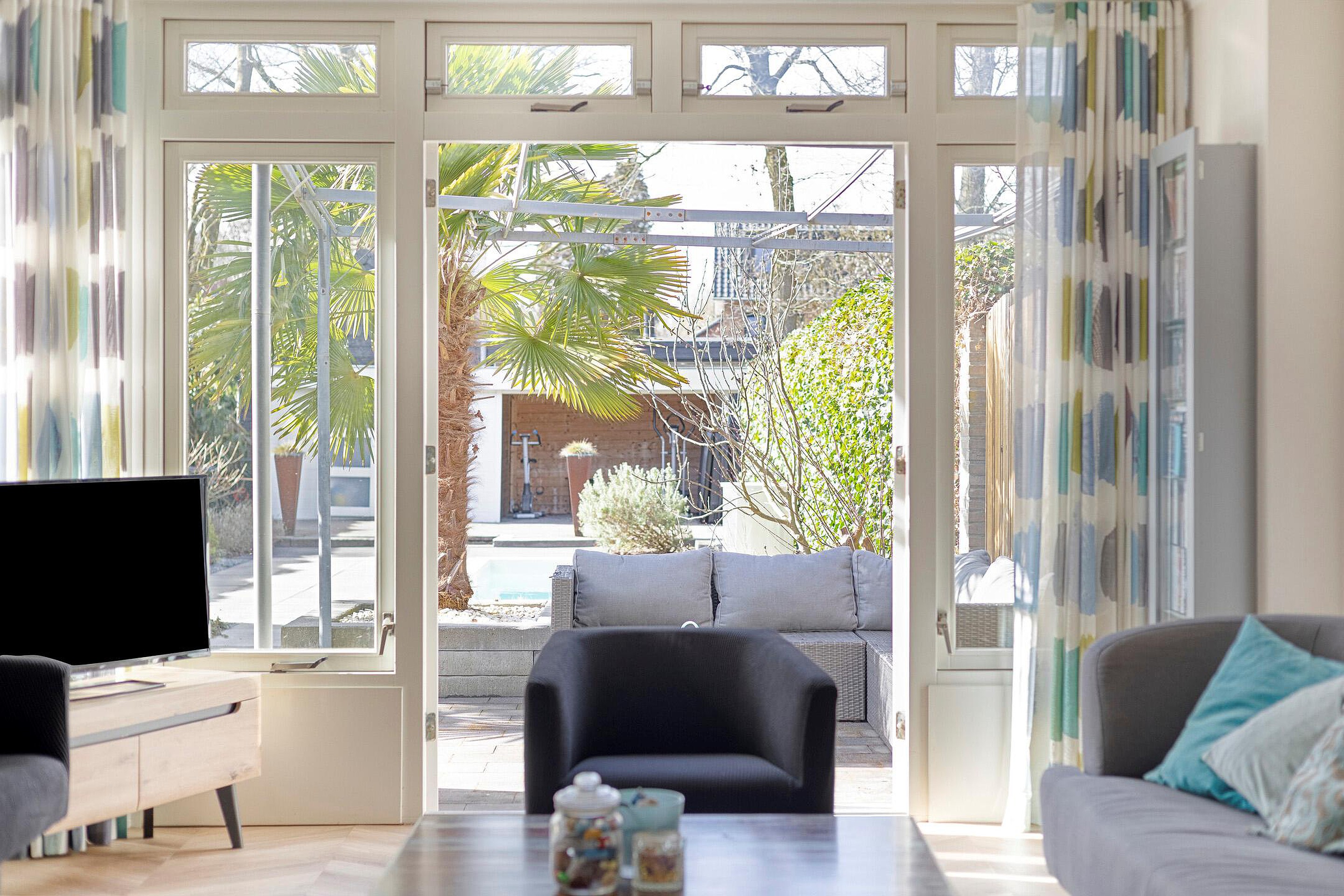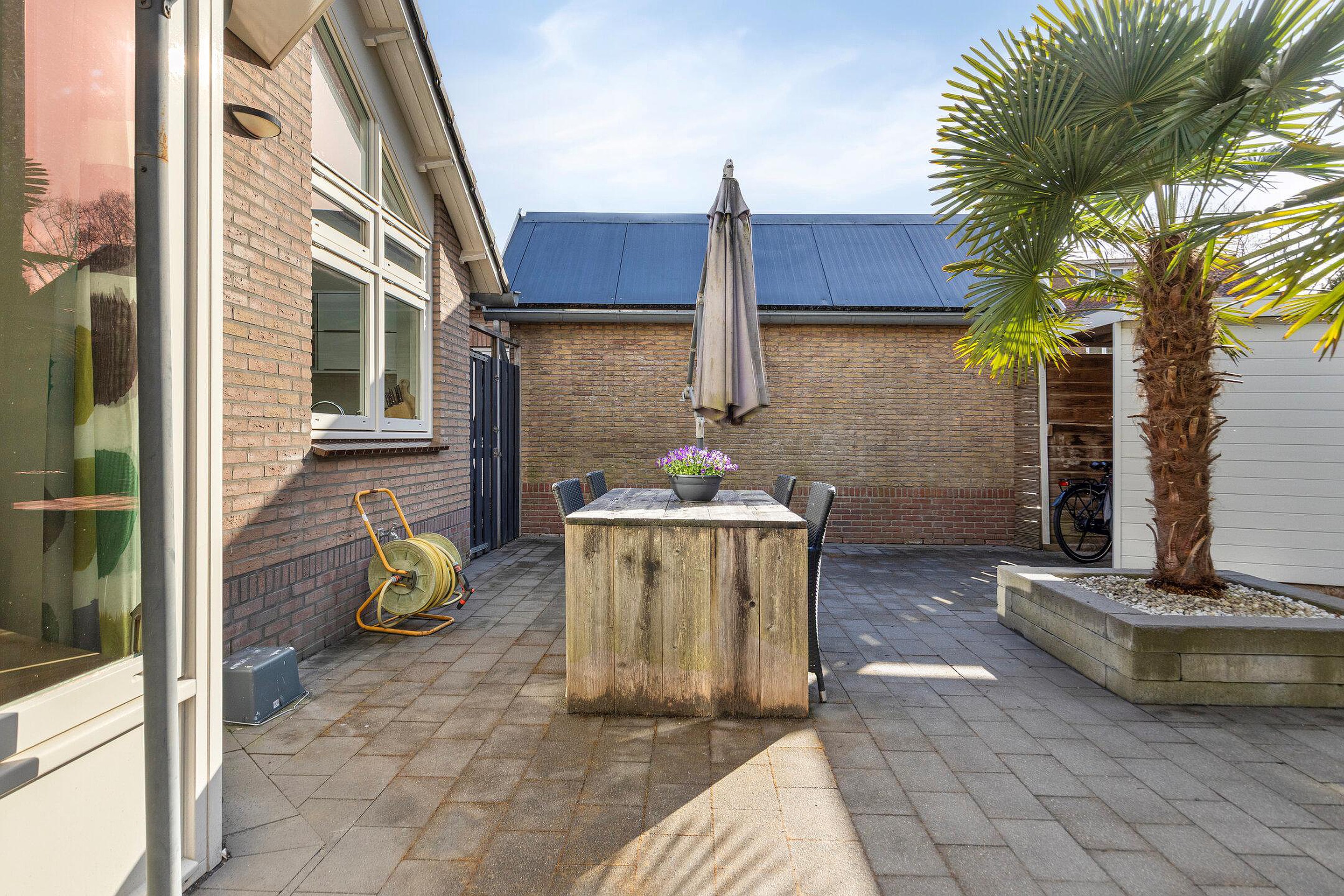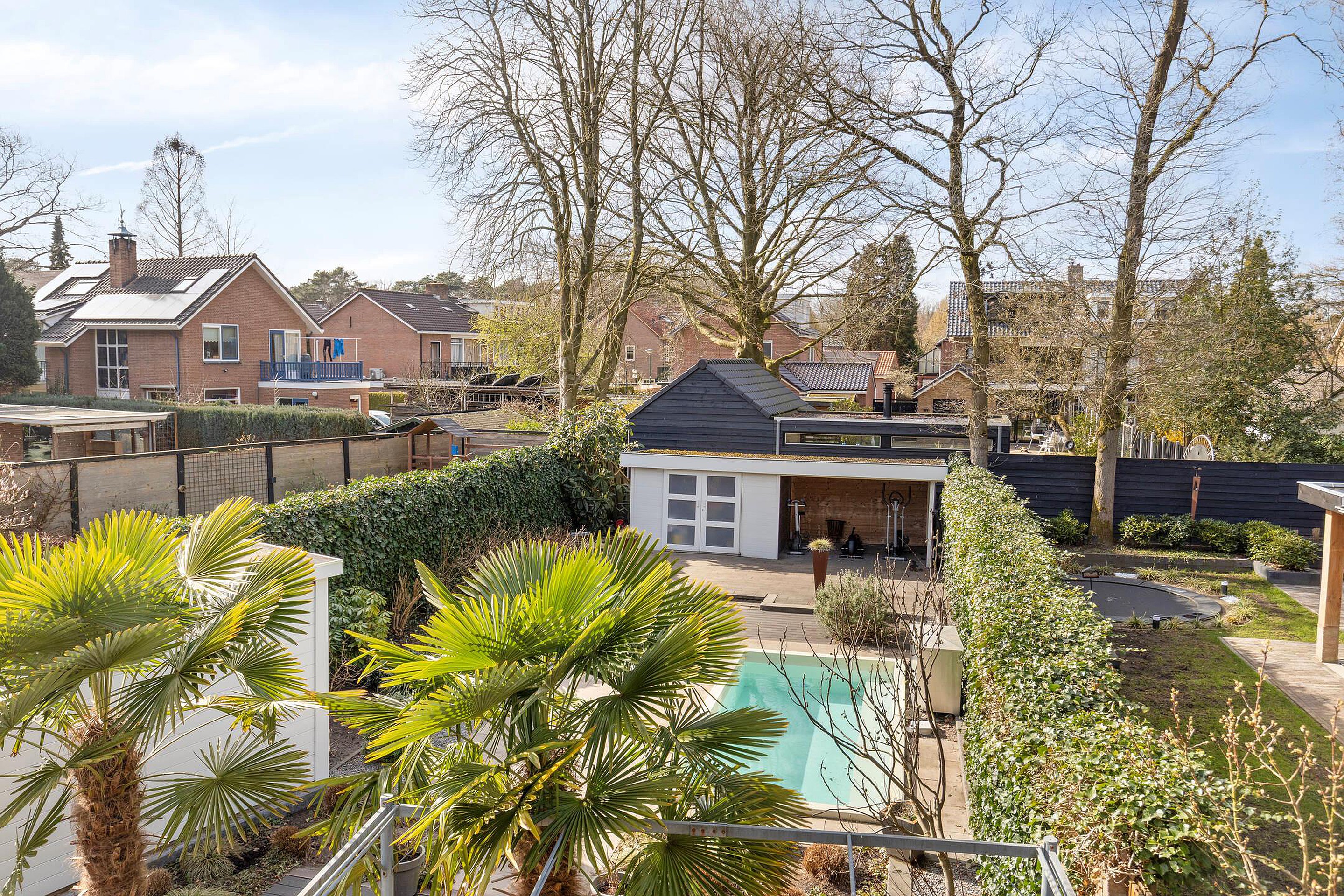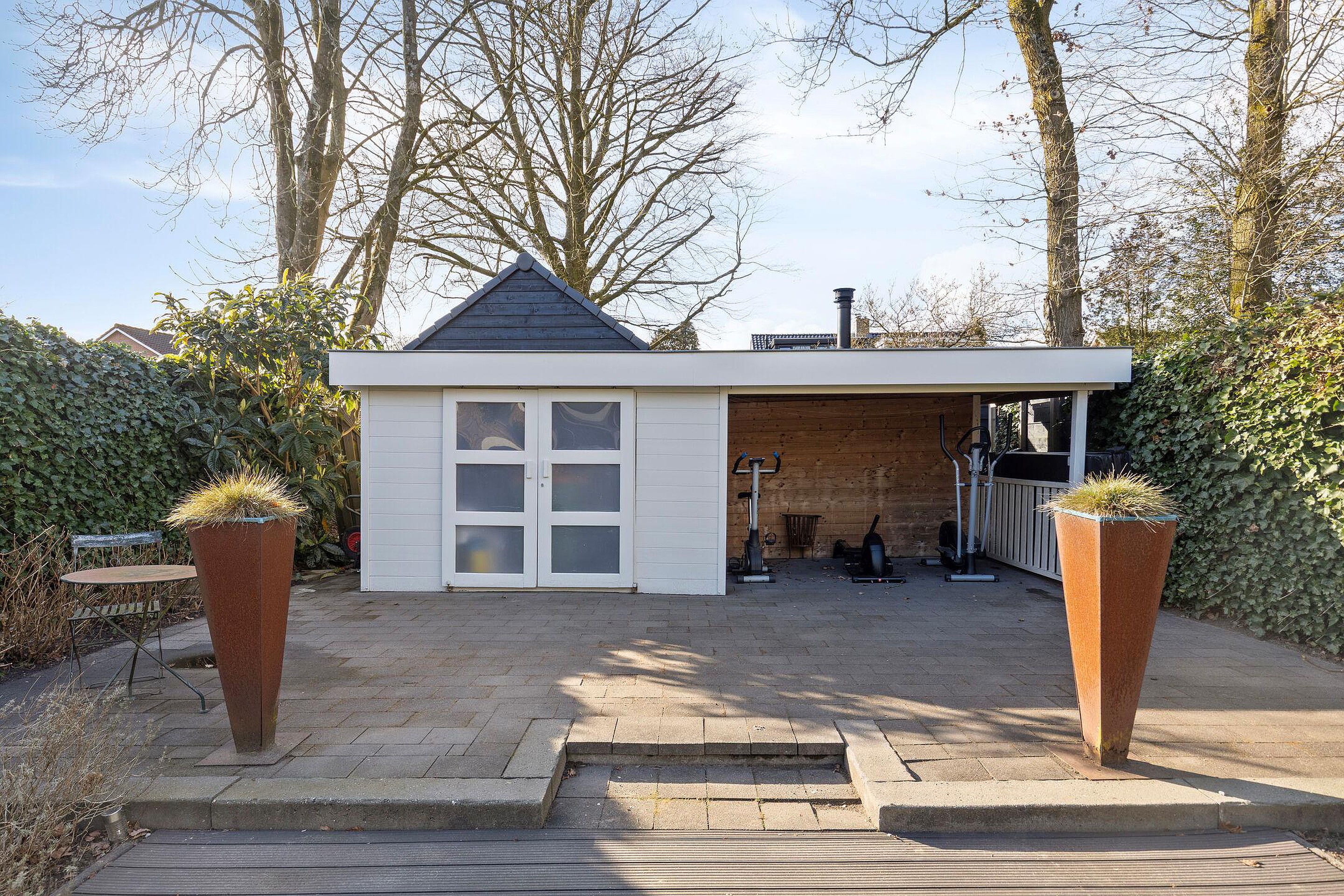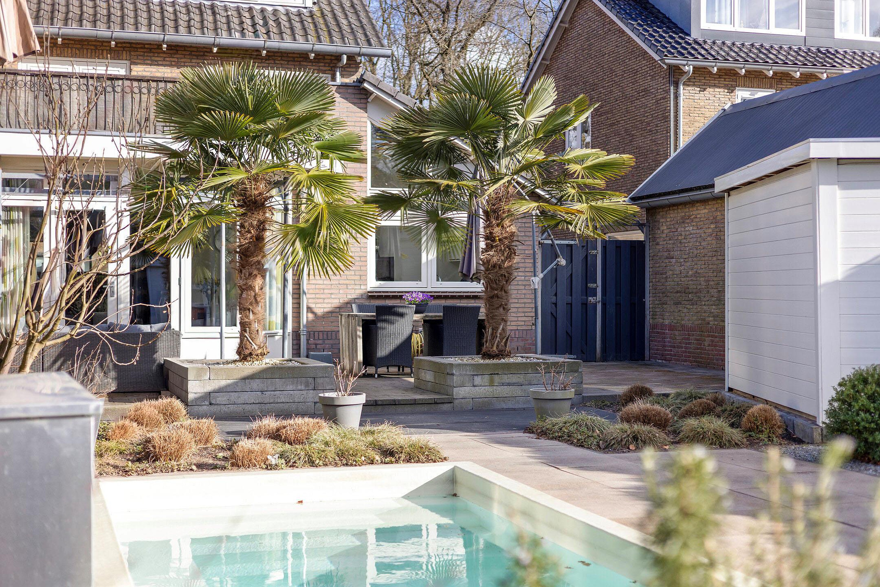 De achtertuin op het zonnige westen is zonder twijfel een van de hoogtepunten van deze woning. U geniet hier van een open buitenruimte met een fijne combinatie van bestrating en groen. Er is volop ruimte voor het creëren van meerdere terrassen, zodat u op elk moment van de dag een plekje in de zon of schaduw kunt vinden. Het zwembad zorgt voor een luxe en ontspannen sfeer, perfect voor warme zomerdagen. Achterin de tuin bevinden zich een berging en een overkapping, en via de achterom is de tuin ook gemakkelijk bereikbaar.