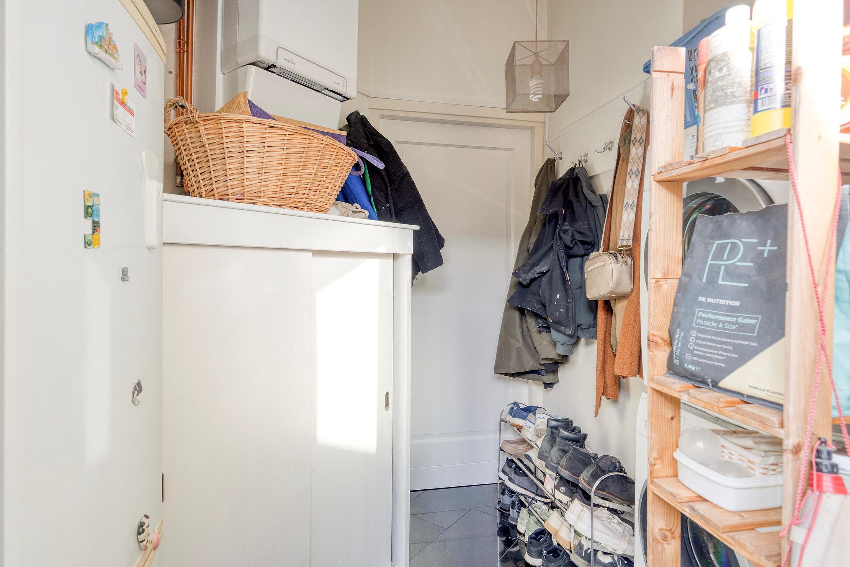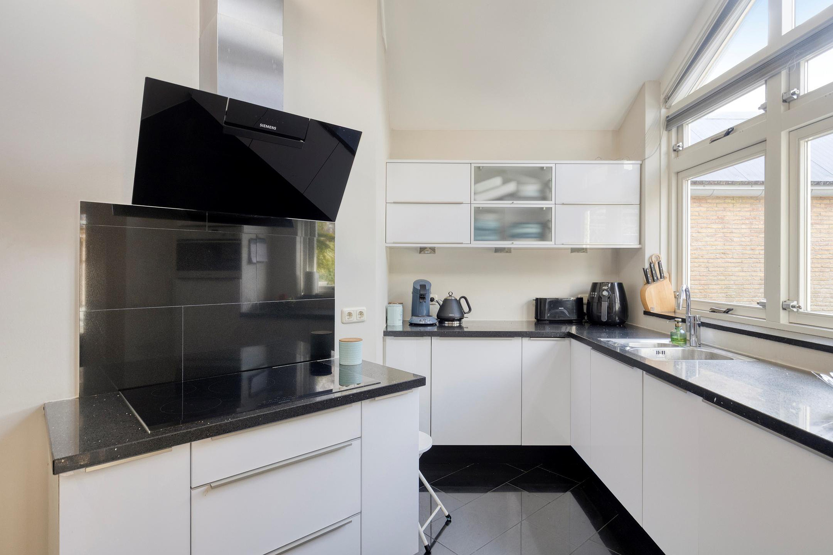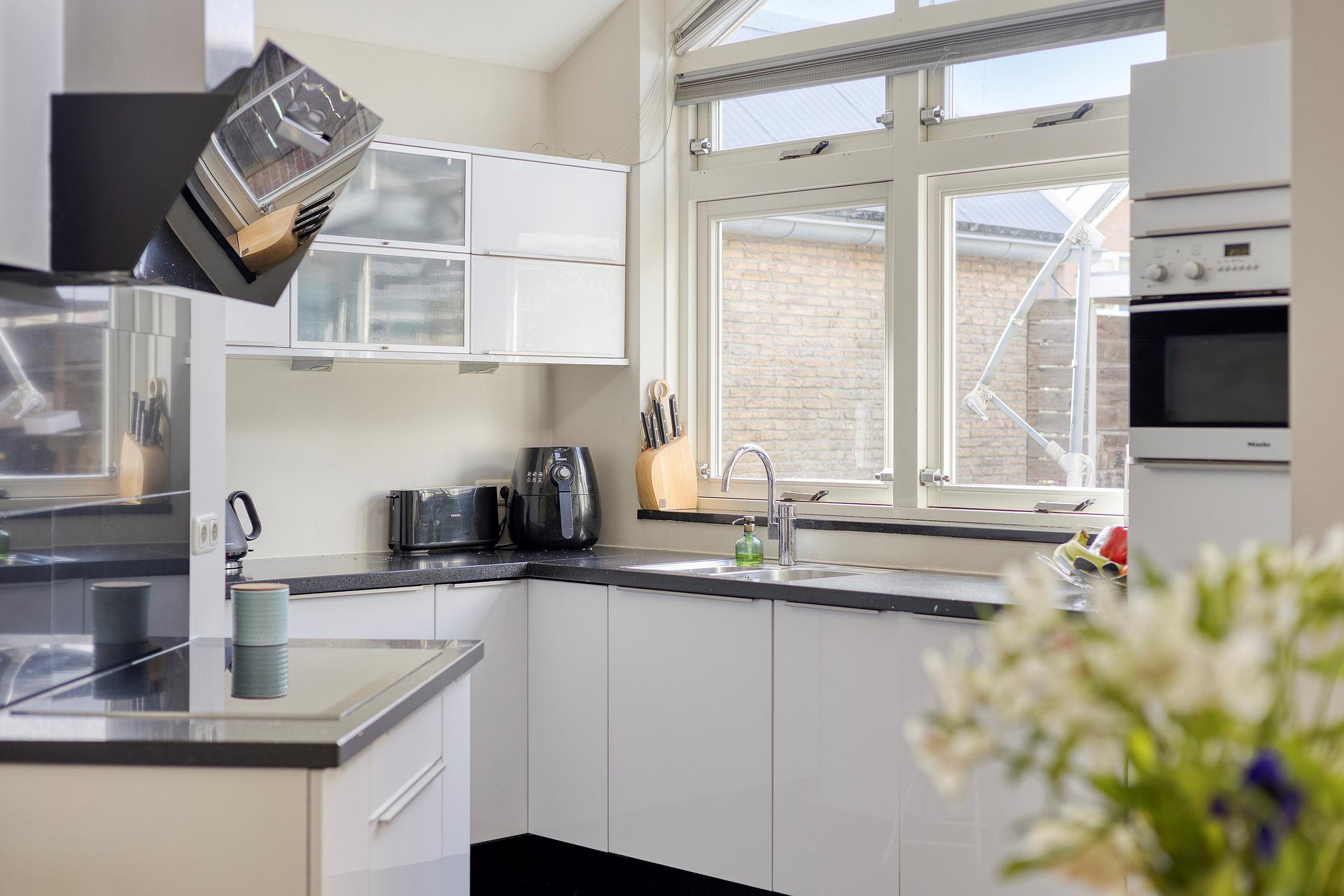 De moderne open keuken is van alle gemakken voorzien en is instapklaar. U beschikt hier over een inductiekookplaat (2024) met afzuigkap (2025), een spoelbak met kraan, een vaatwasser, een ingebouwde ovencombinatie en een koelkast. Daarnaast is er volop opbergruimte aanwezig, wat de keuken niet alleen stijlvol maar ook praktisch maakt. Vanuit de keuken heeft u toegang tot de bijkeuken, waar zich de aansluiting voor witgoed bevindt en extra bergruimte beschikbaar is.
