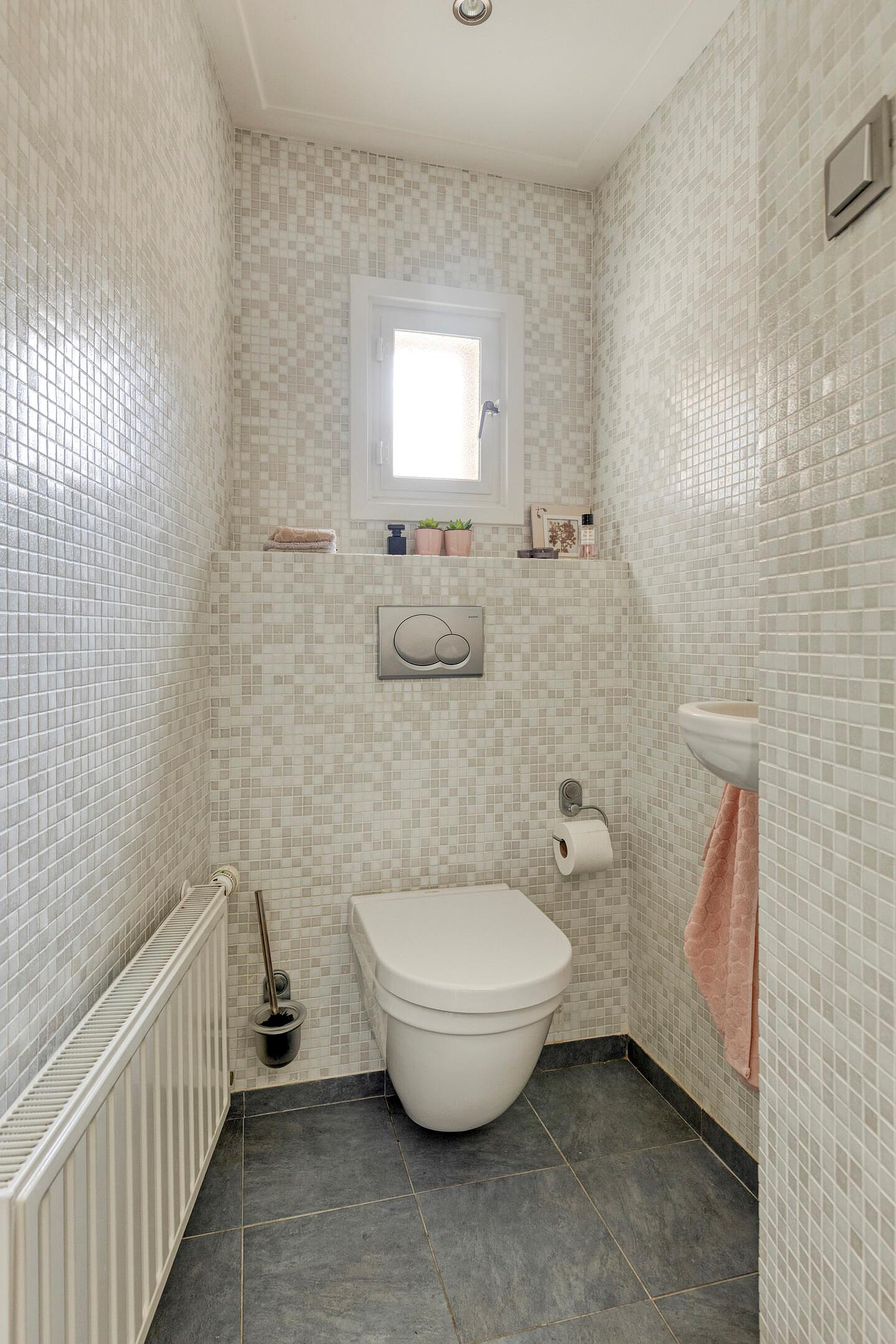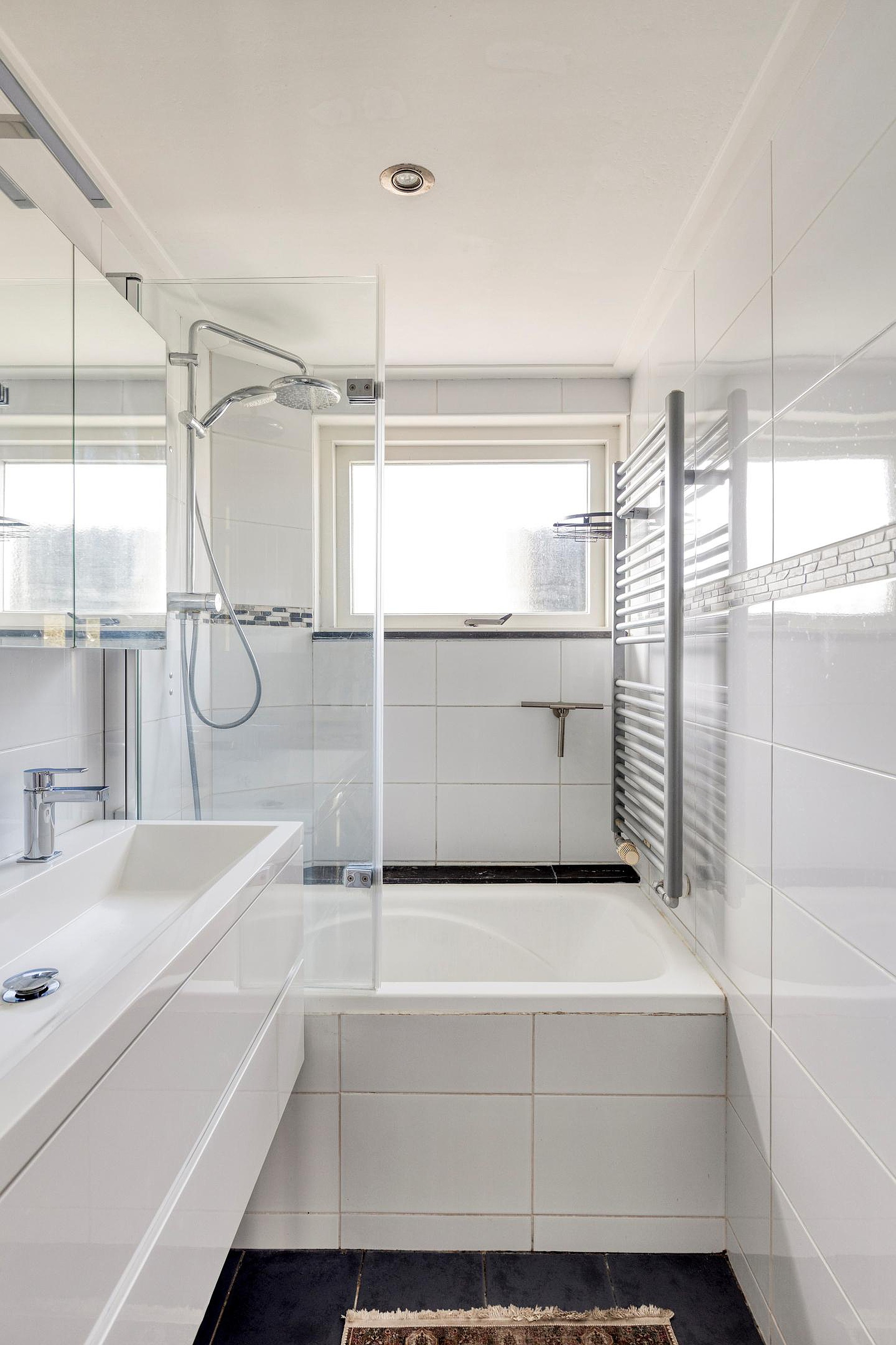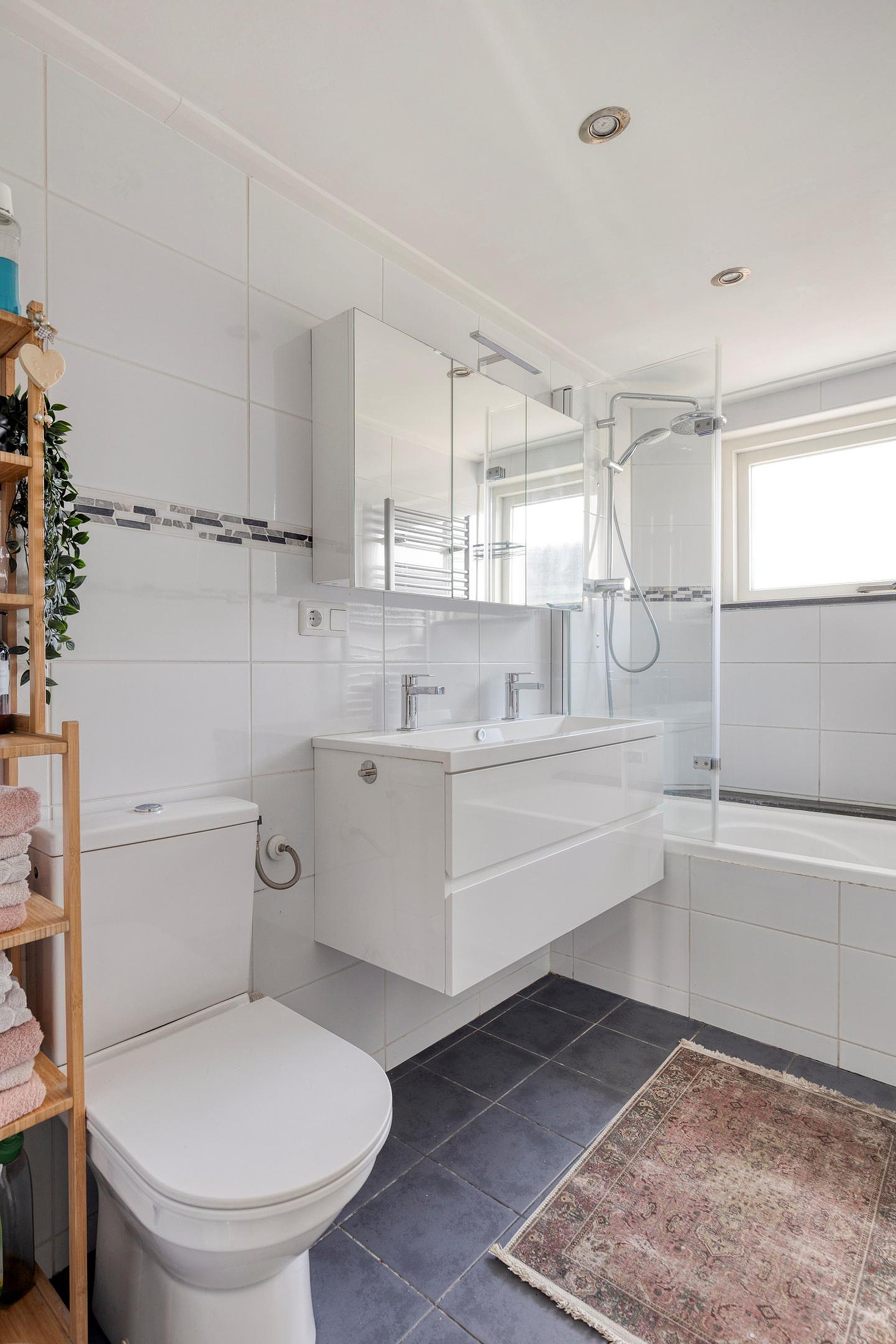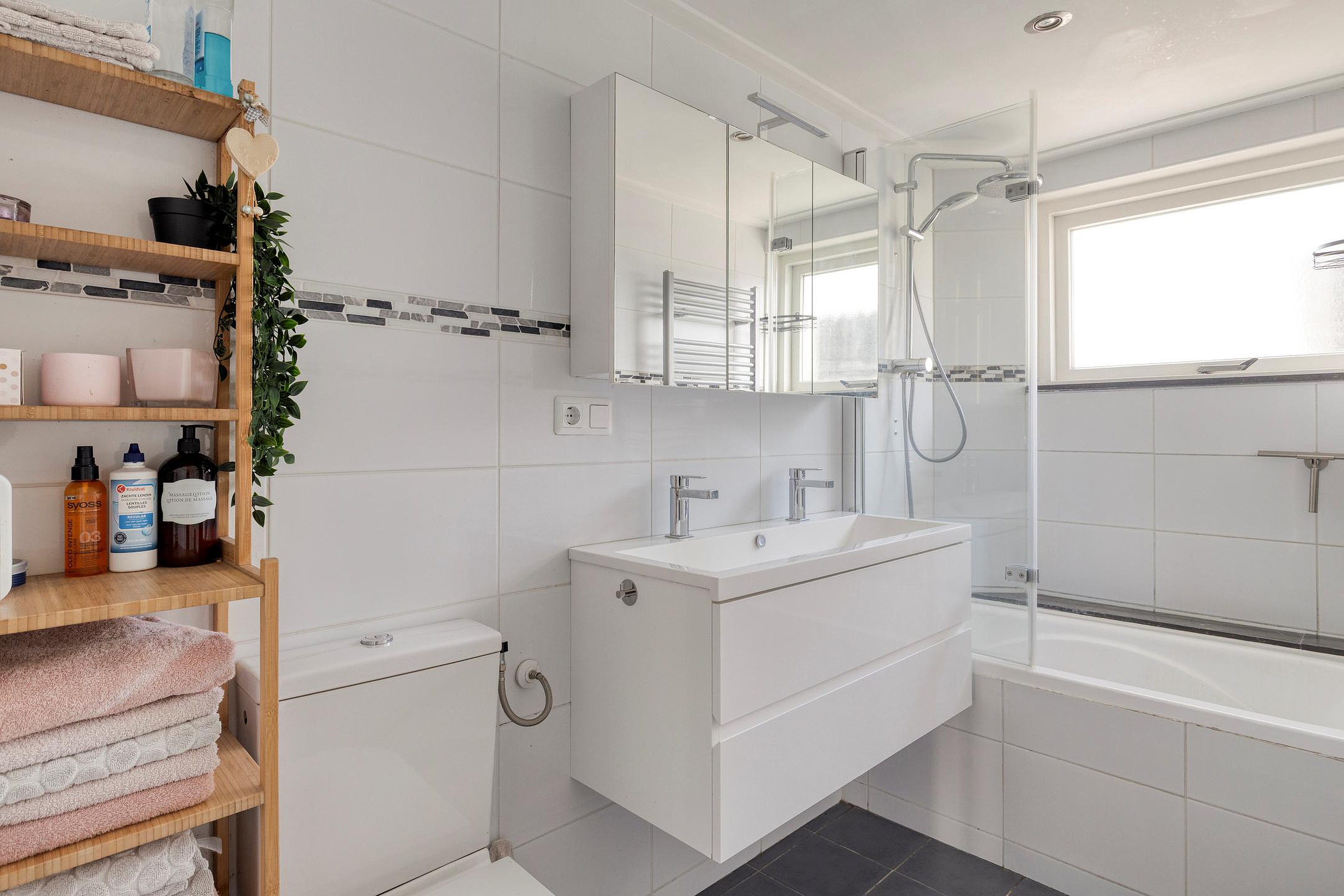 De badkamer is volledig betegeld en uitgevoerd in een verzorgde stijl. U vindt hier een bad met douchekop, een toilet, een dubbele wastafel met opbergmeubel en een handdoekradiator. De ruimte is praktisch ingericht en biedt alles wat u nodig heeft.
