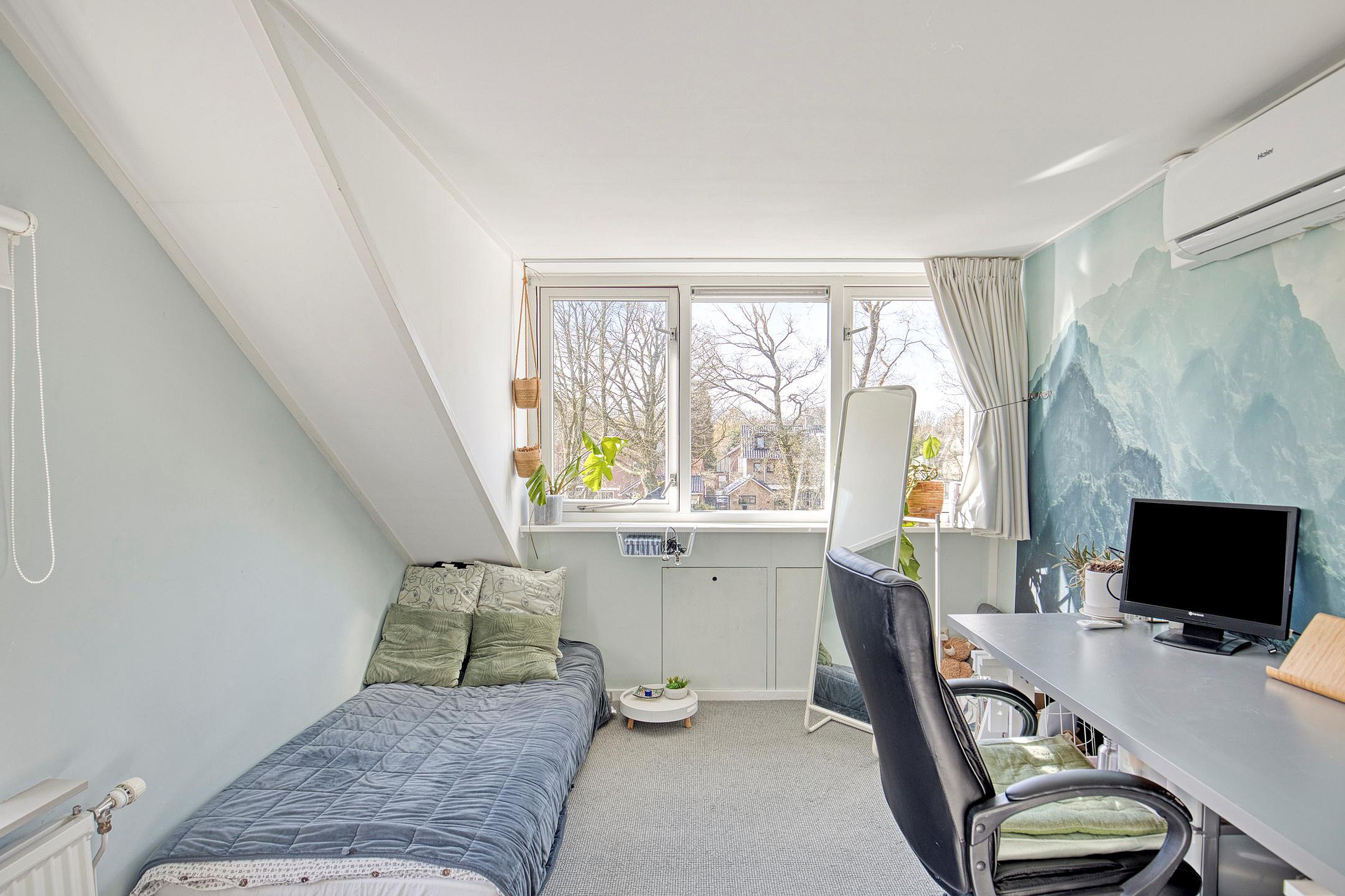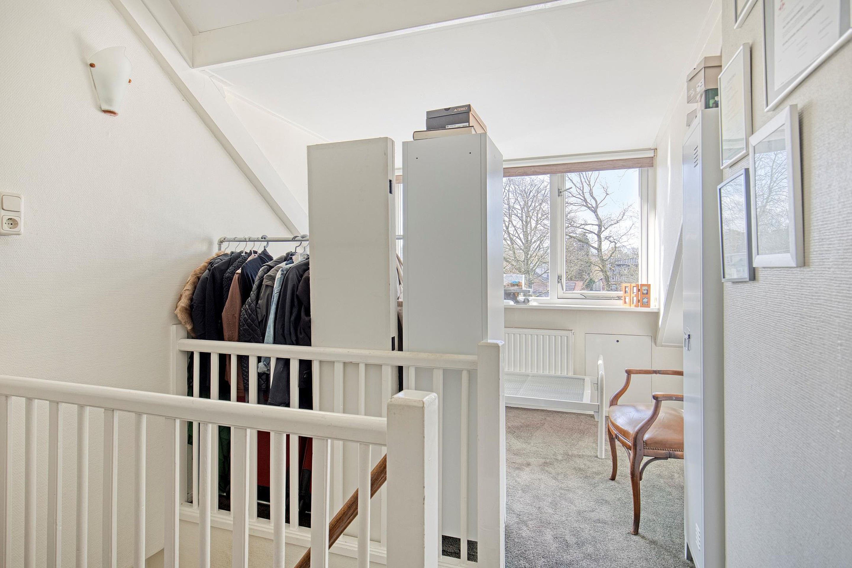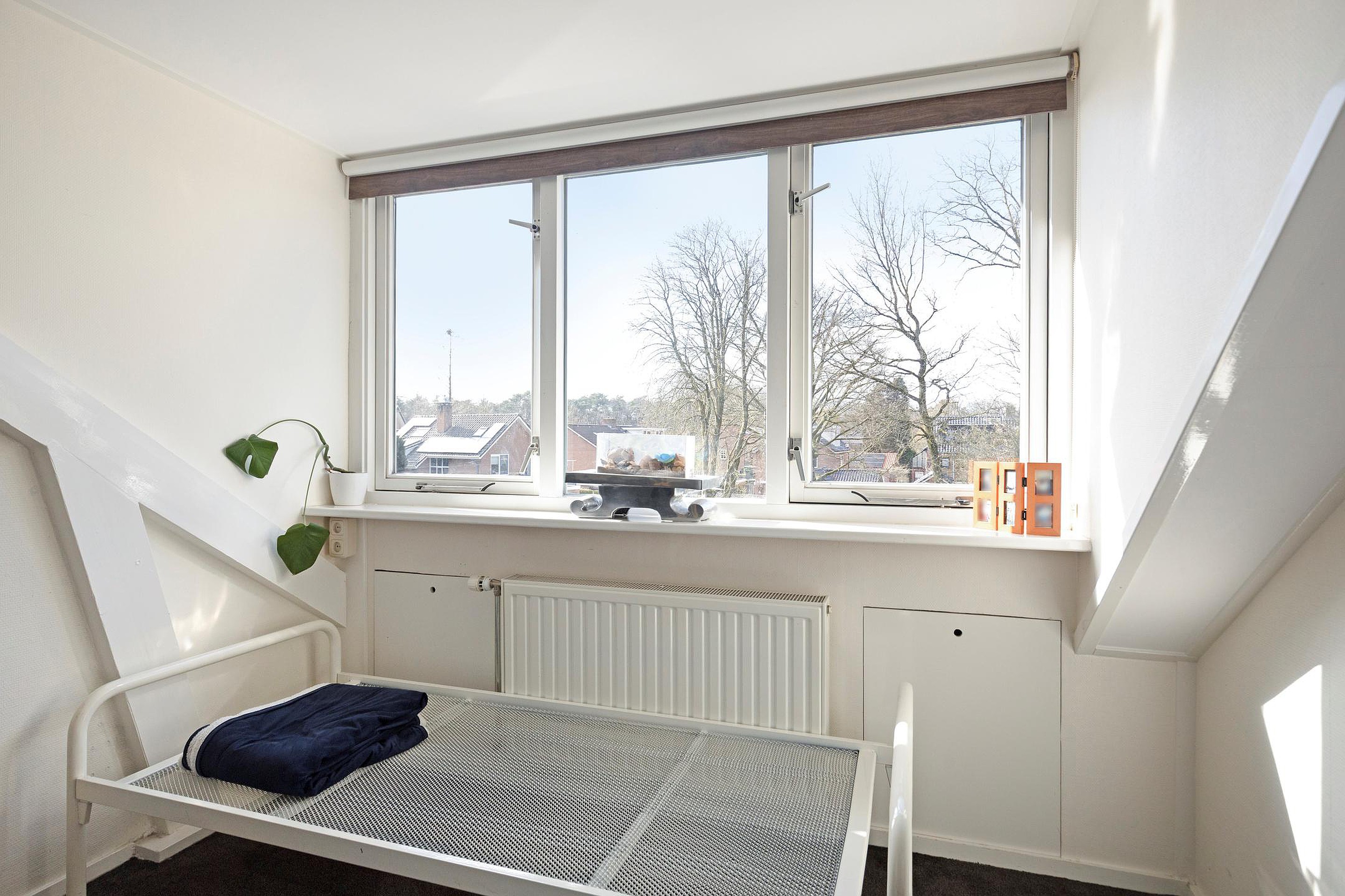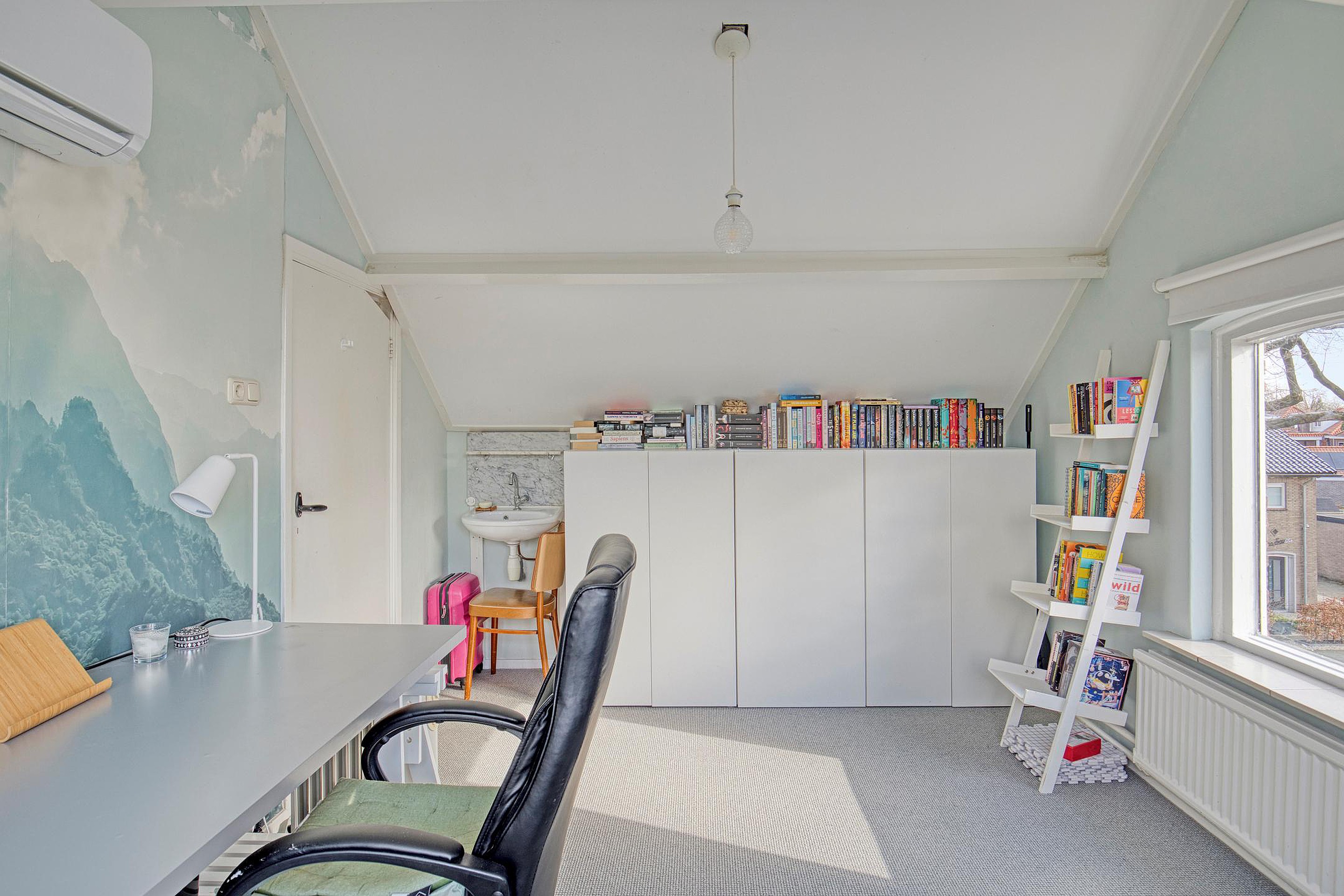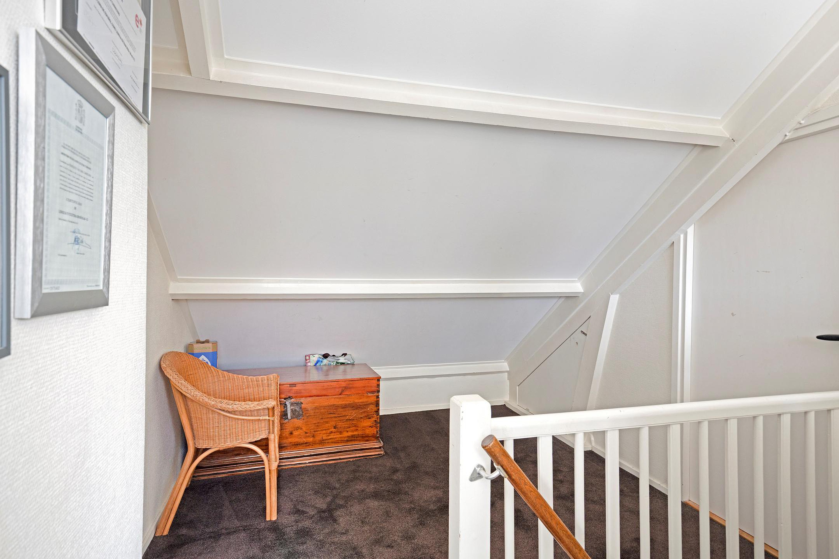 Via een vaste trap bereikt u de zolderverdieping, een verrassend ruime en multifunctionele etage. De royale overloop biedt toegang tot een extra slaapkamer, gelegen in de punt van het dak. Dankzij de dakkapel is er veel lichtinval en voldoende stahoogte, waardoor de ruimte bijzonder prettig aanvoelt. Deze verdieping leent zich uitstekend als extra slaapkamer, kantoor, logeerkamer of hobbyruimte en is bovendien voorzien van airconditioning voor extra comfort.