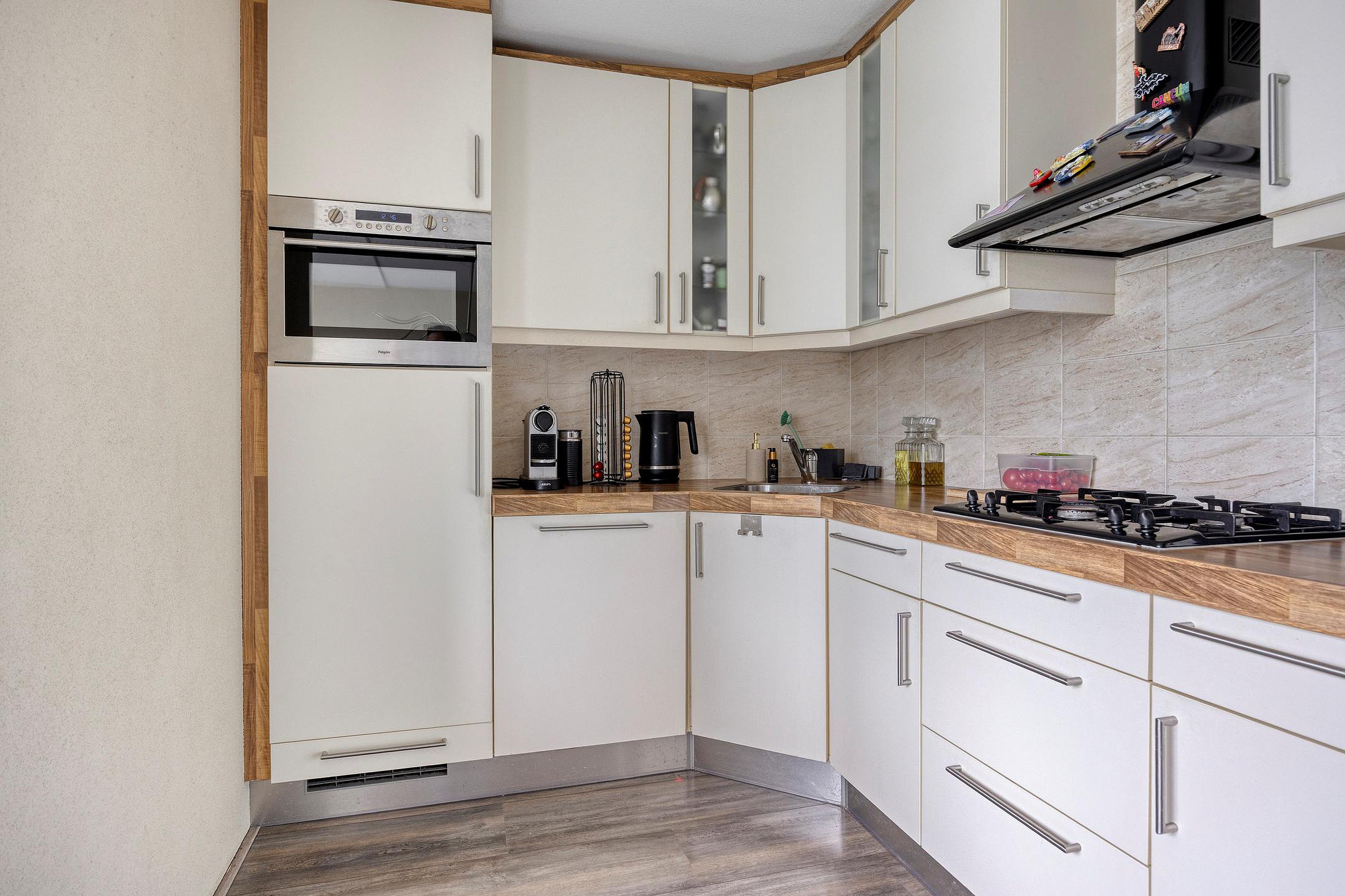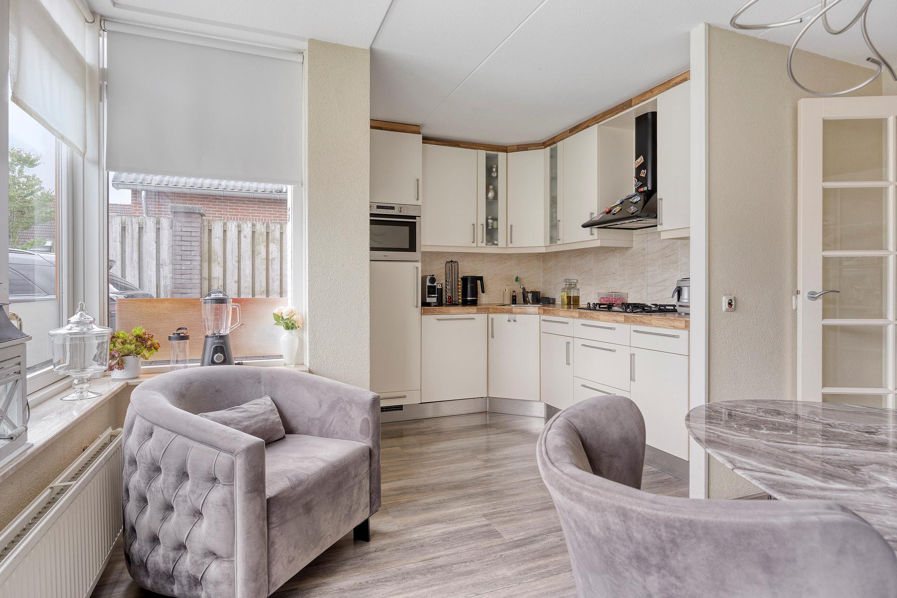U komt binnen in een verzorgde entree met bergkasten, de trapopgang en toiletruimte. Via een tussendeur bereikt u de woonkamer: een royale leefruimte met een grote raampartij, die zorgt voor een rijke lichtinval. Dankzij de openslaande deuren naar de tuin staat deze ruimte letterlijk in verbinding met buiten. Aan de voorzijde ligt de ruime woonkeuken, gescheiden van de woonkamer door eveneens openslaande deuren. De keuken is opgesteld in een hoek en uitgerust met een combimagnetron, gaskookplaat, afzuigkap, vaatwasser en koelkast. Er is voldoende ruimte voor een gezellige eethoek.