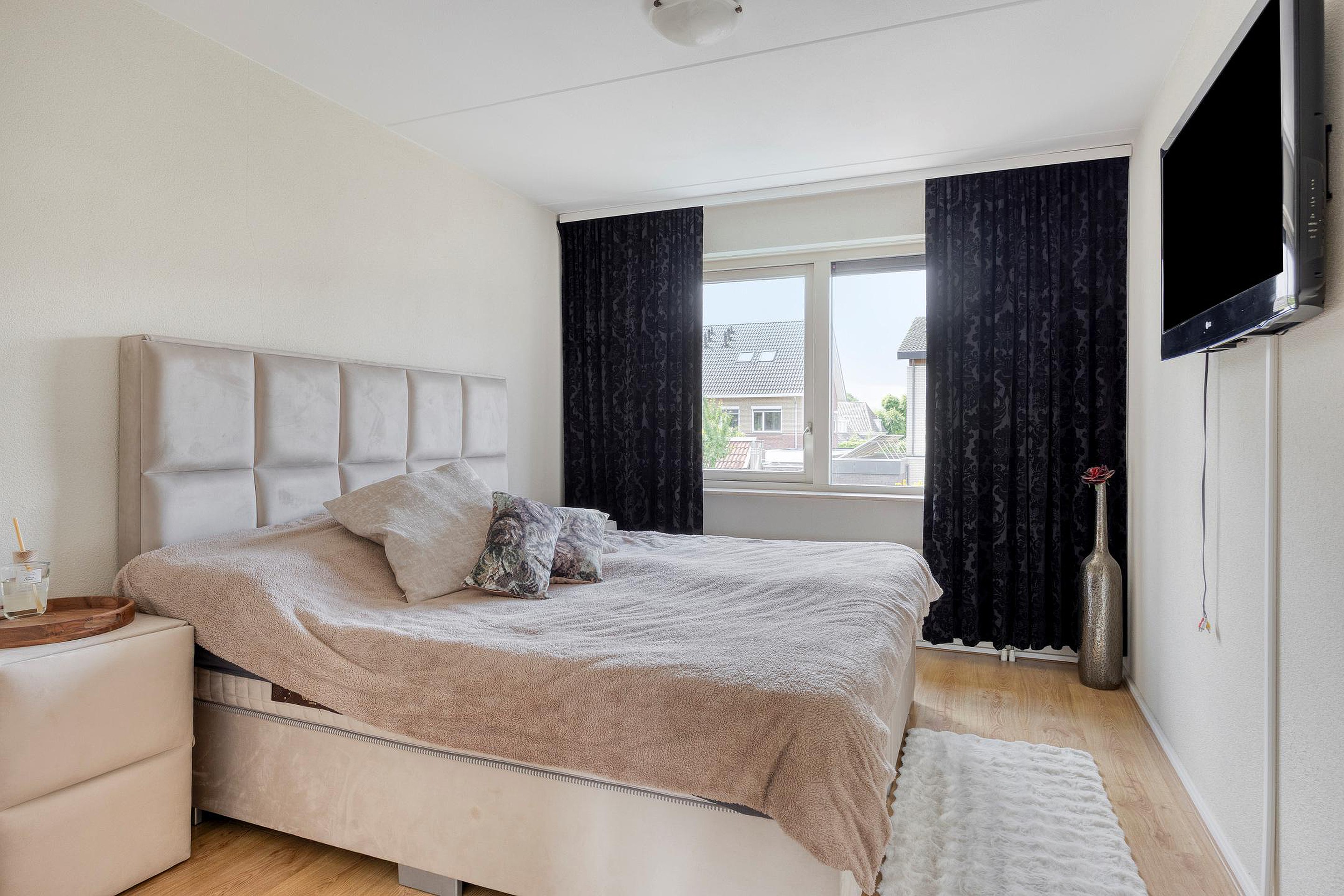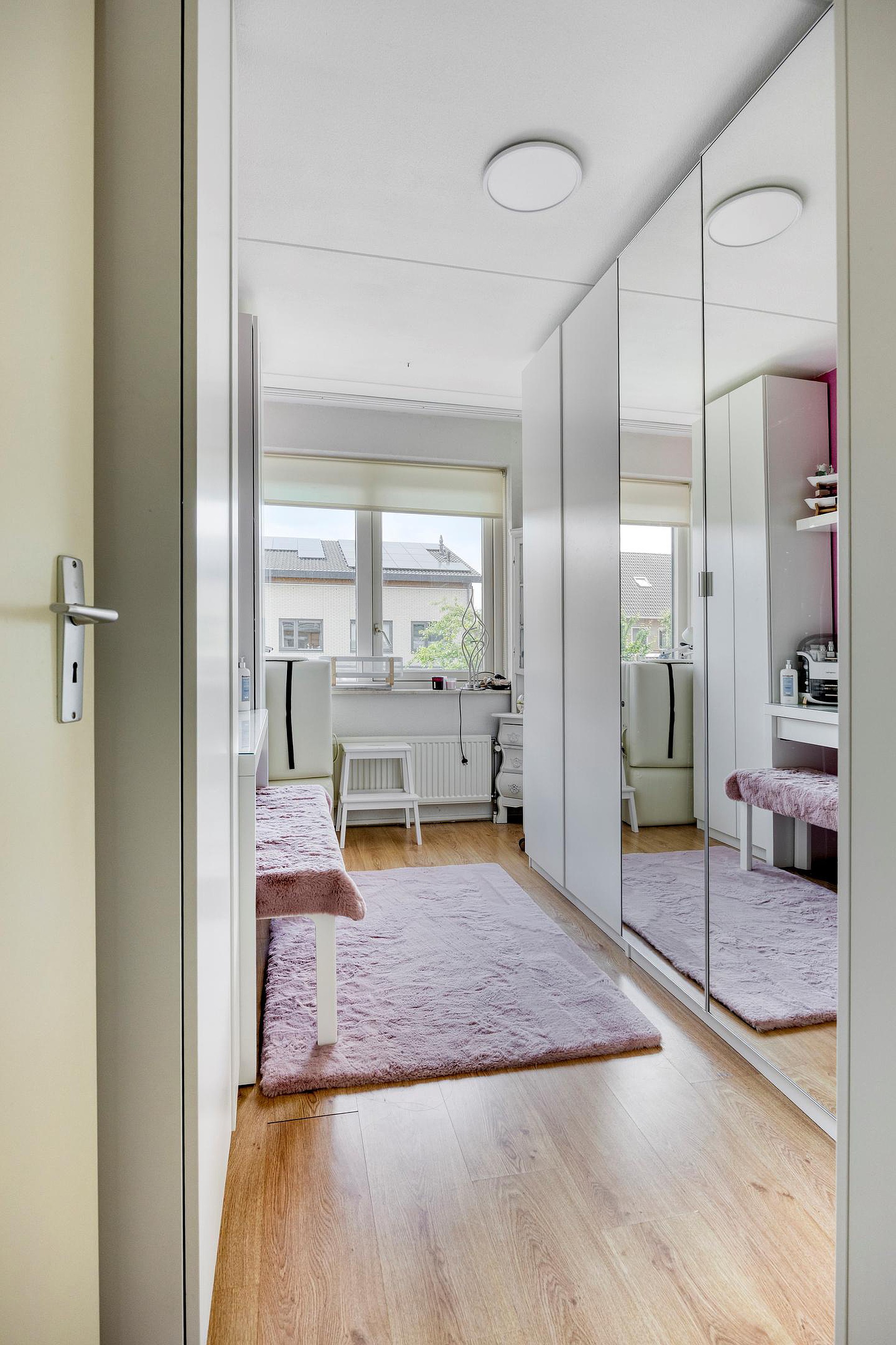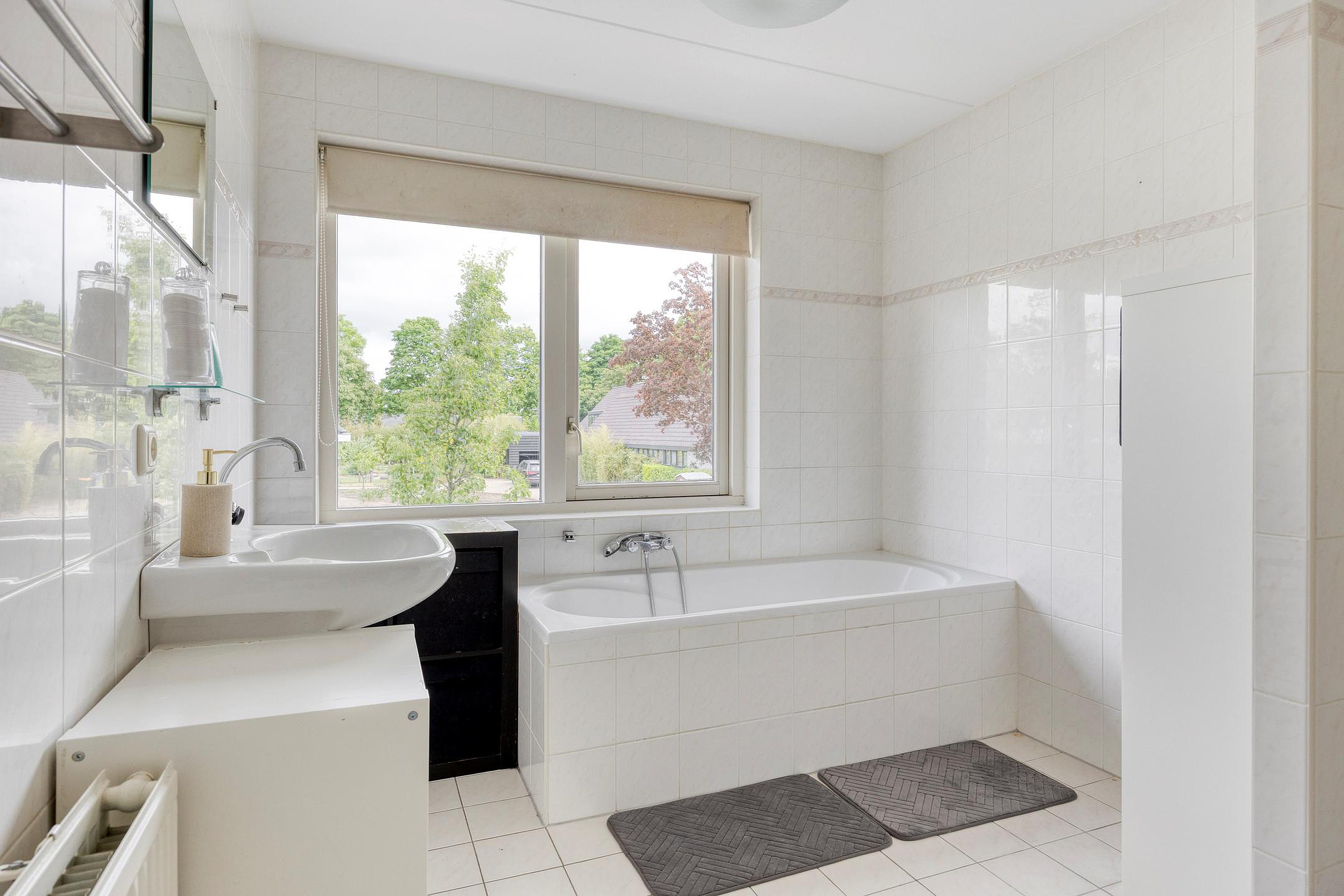 De eerste verdieping telt drie ruime slaapkamers, elk met een prettig formaat en een rustige uitstraling dankzij de laminaatvloer en lichte afwerking. De hoofdslaapkamer bevindt zich aan de achterzijde van de woning, met zicht op de tuin. De kamer aan de voorzijde is uitgerust met een inbouwkast, evenals de overloop. De badkamer is compleet ingericht met een ligbad, aparte douche, tweede toilet en een wastafel. De grote raampartij zorgt hier voor aangenaam daglicht en ventilatie.