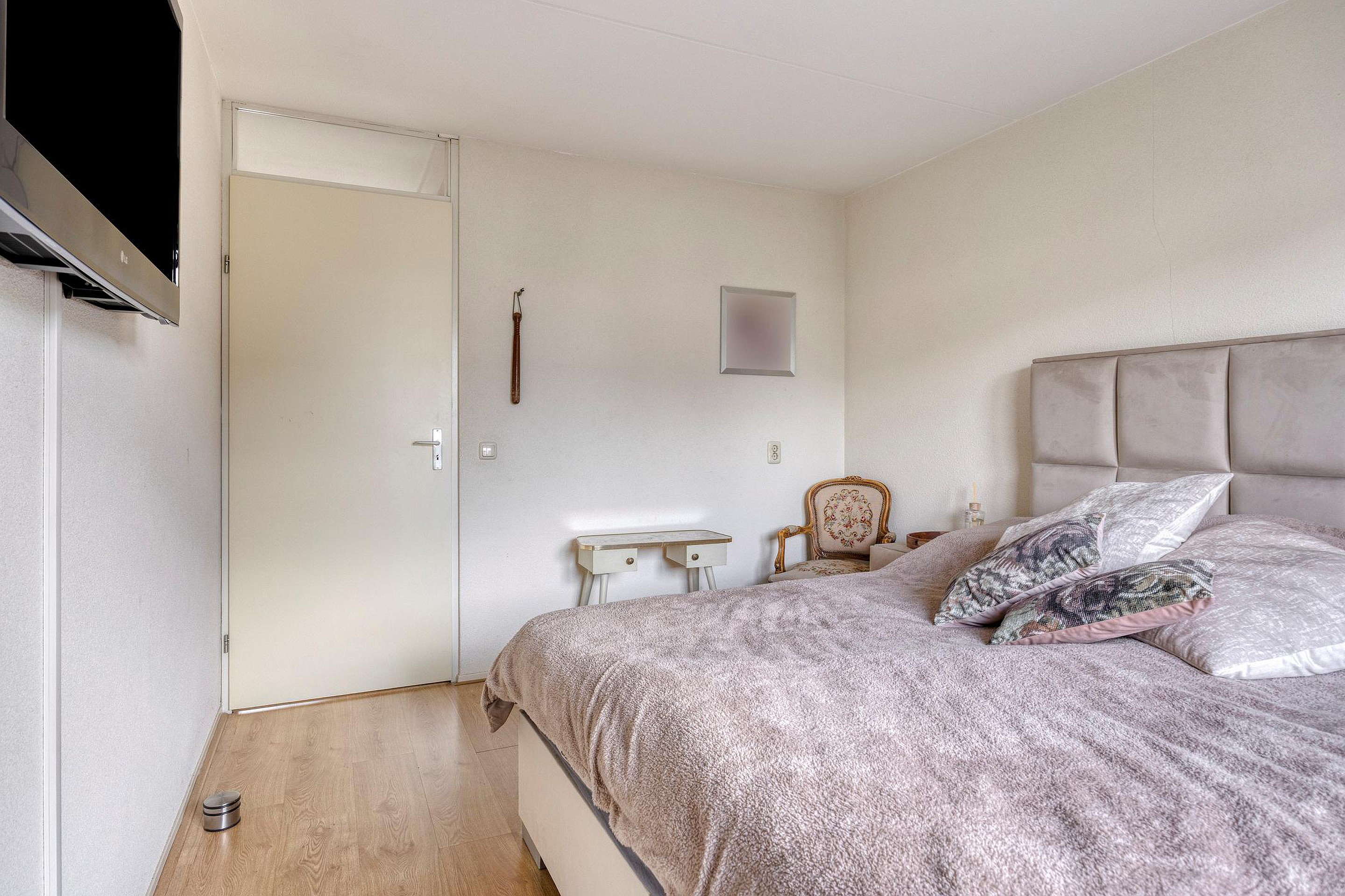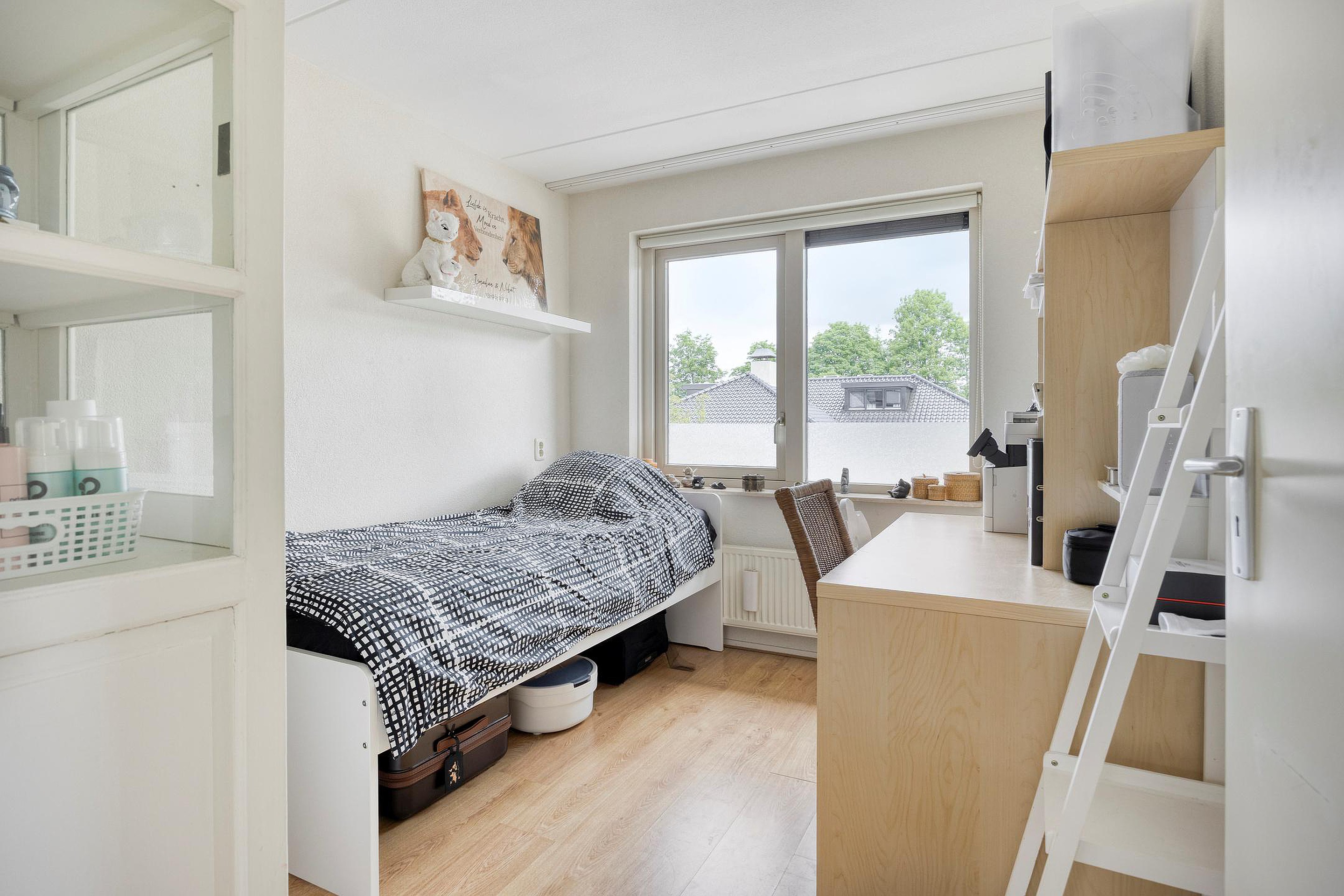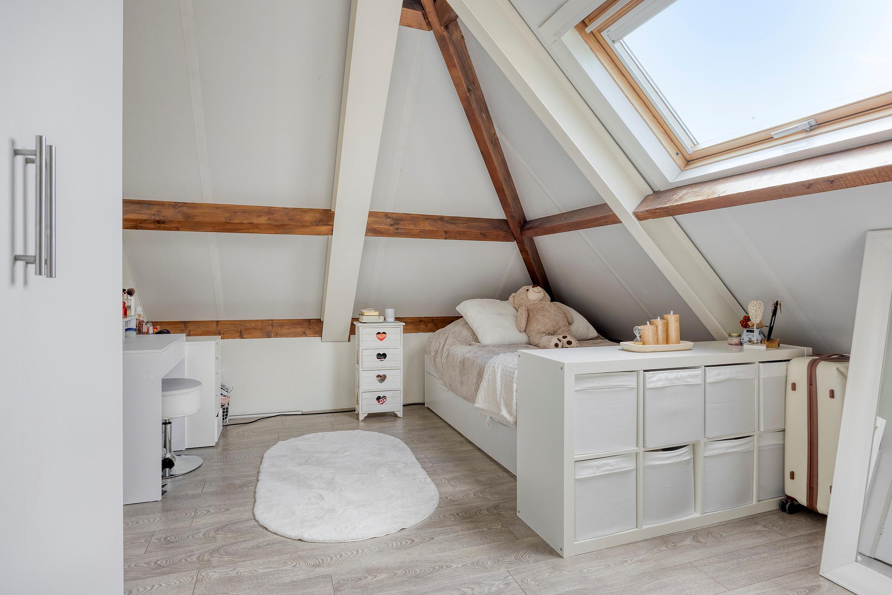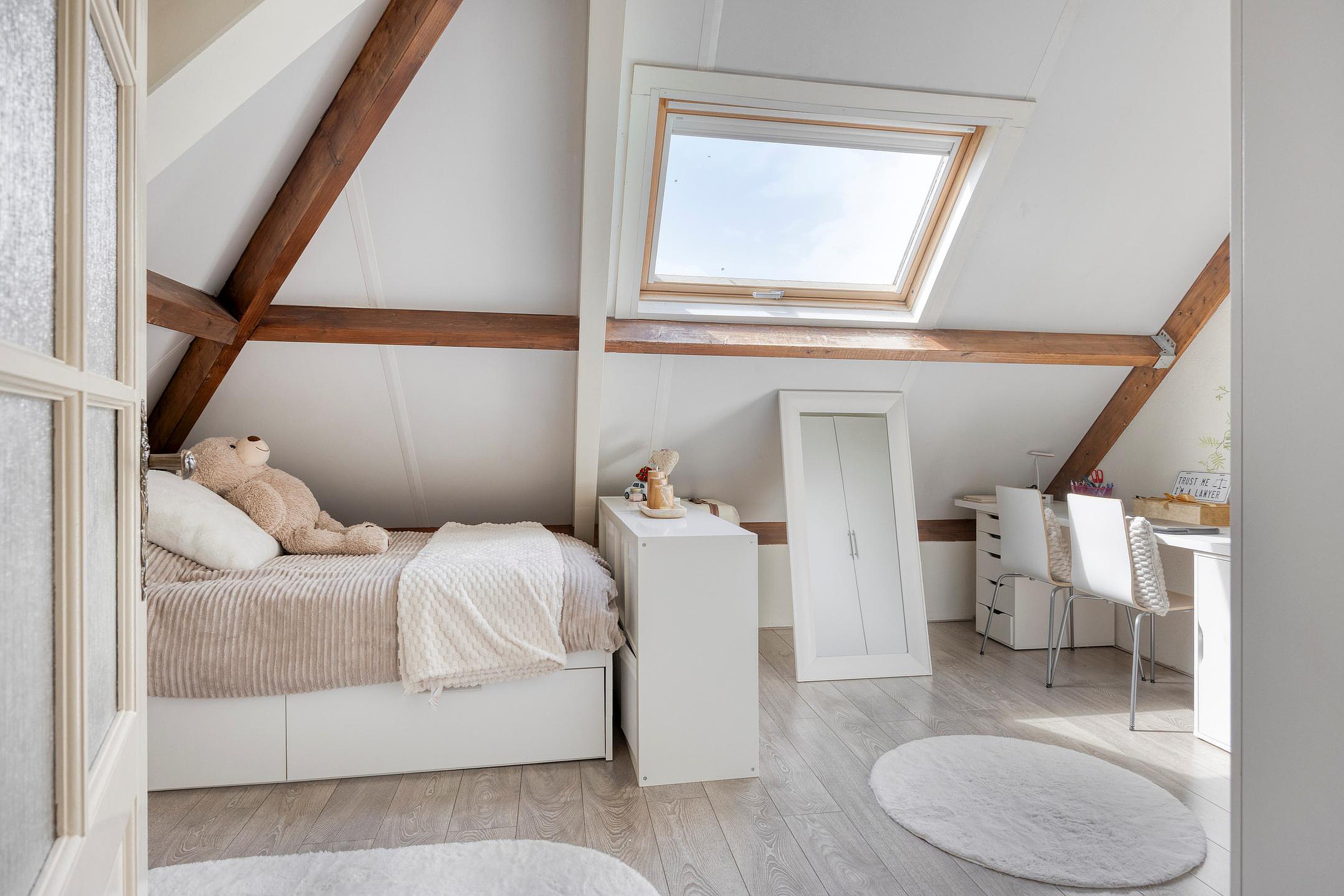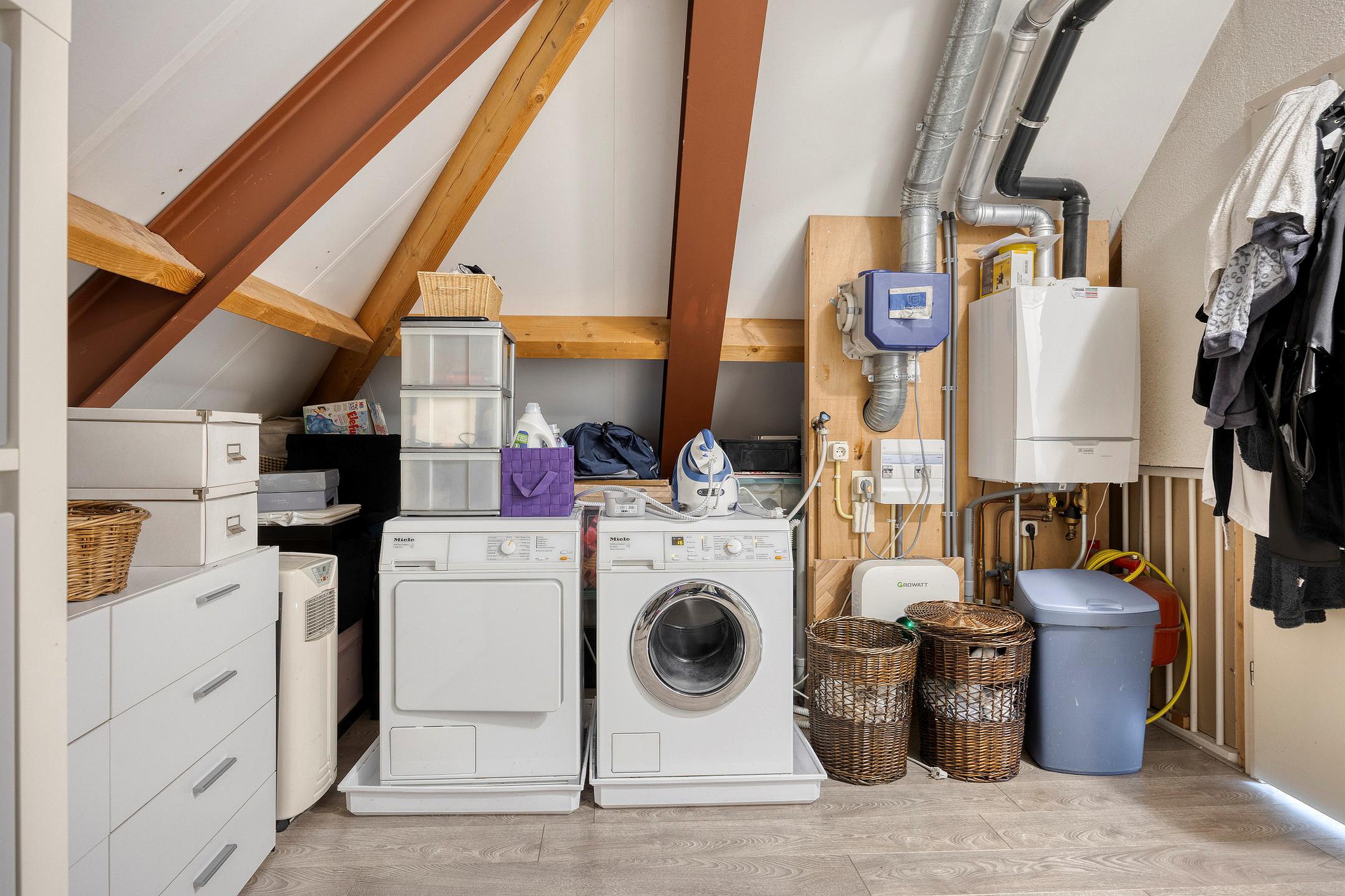 Op de bovenverdieping bevinden zich nog eens twee volwaardige kamers, elk met karakteristieke schuine daklijnen en veel ruimte. Ideaal als extra slaapkamer, werkruimte of hobbykamer. De voorzolder is ingericht met een opstelplaats voor de wasmachine en droger, de cv-ketel, omvormer ten behoeve van de zonnepanelen en mechanische ventilatiesysteem.