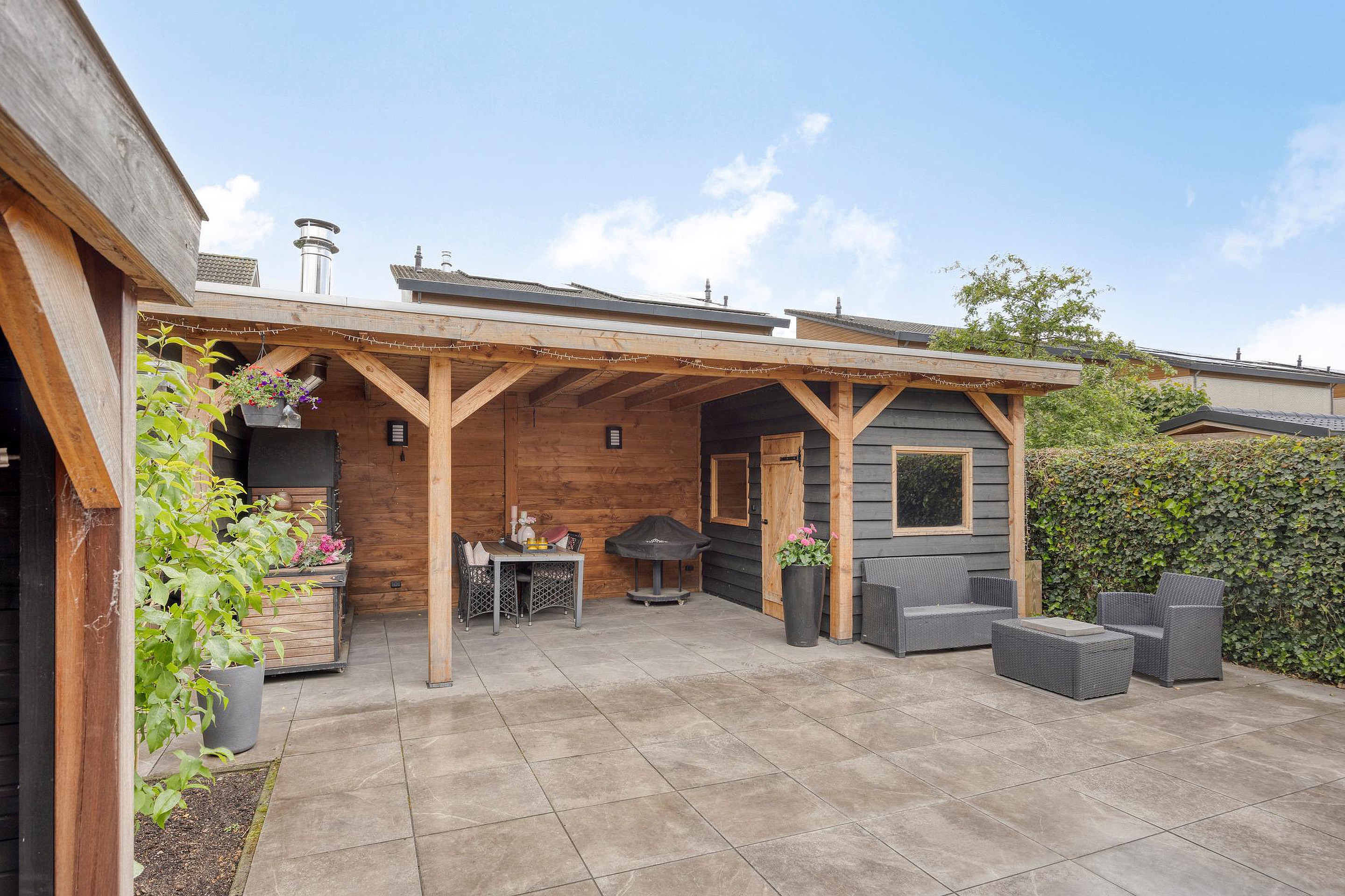 De achtertuin is volledig betegeld, onderhoudsvriendelijk en perfect op het zuid-westen gelegen. Hier geniet u volop van de middag- en avondzon. De grote houten overkapping met inbouwspots en berging maakt het plaatje compleet: hier zit u beschut, of het nu zomer is of herfst. Dankzij de ligging én de volledige erfafscheiding, biedt de tuin veel privacy. Aan de voorzijde beschikt u over een oprit met plek voor één auto, en de garage biedt nog extra bergruimte of stallingsmogelijkheden.