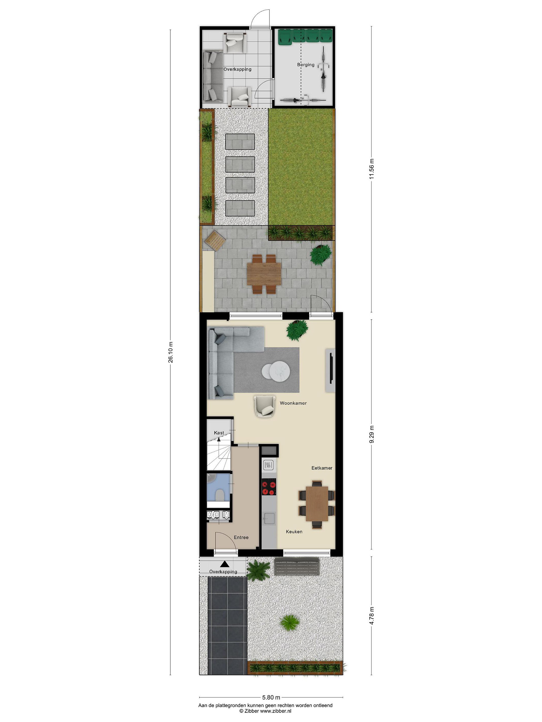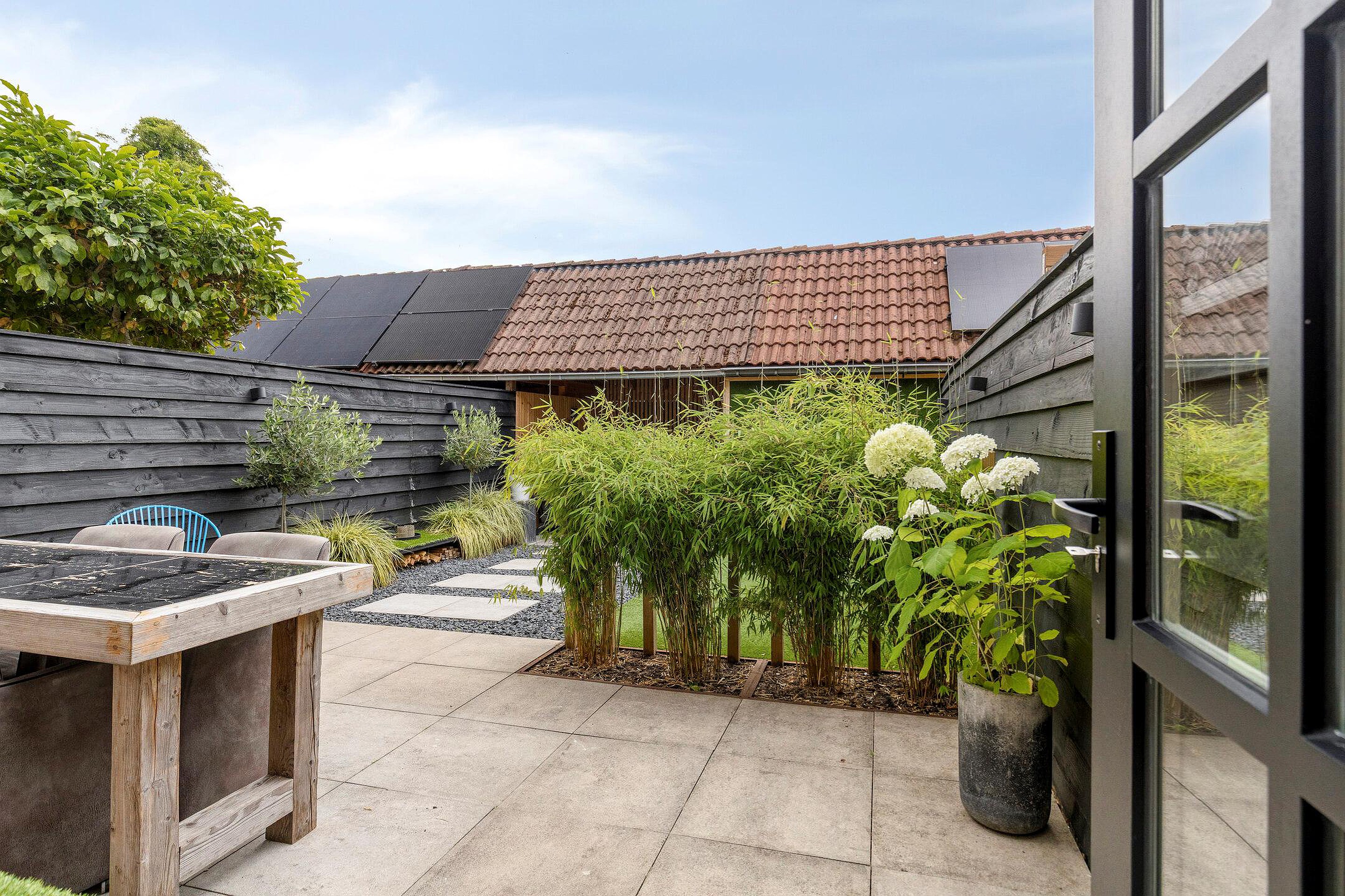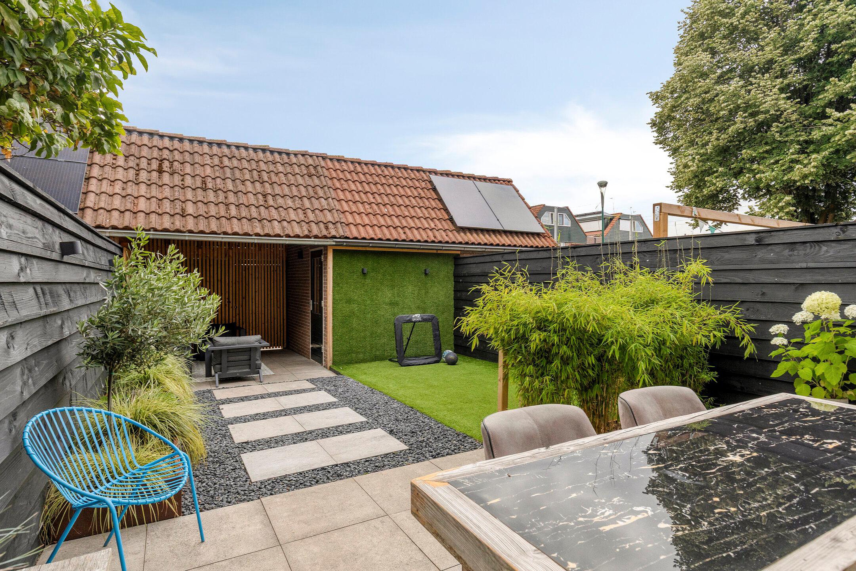 De voortuin is groot, netjes aangelegd en biedt ruimte voor een gezellig zitje. De achtertuin is keurig en modern aangelegd met grote terrastegels, siergrind, borders met vaste beplanting en een kunstgras speelgazon. Achter in de tuin staat een heerlijke houten overkapping met loungehoek, ideaal voor lange zomeravonden of een kop koffie in de ochtendzon. Aangrenzend bevindt zich de stenen berging, handig voor fietsen en tuinspullen. De tuin is onderhoudsvriendelijk en biedt volop privacy dankzij de erfafscheiding en groene beplanting. Er is tevens een achterom voor gemakkelijke toegang.