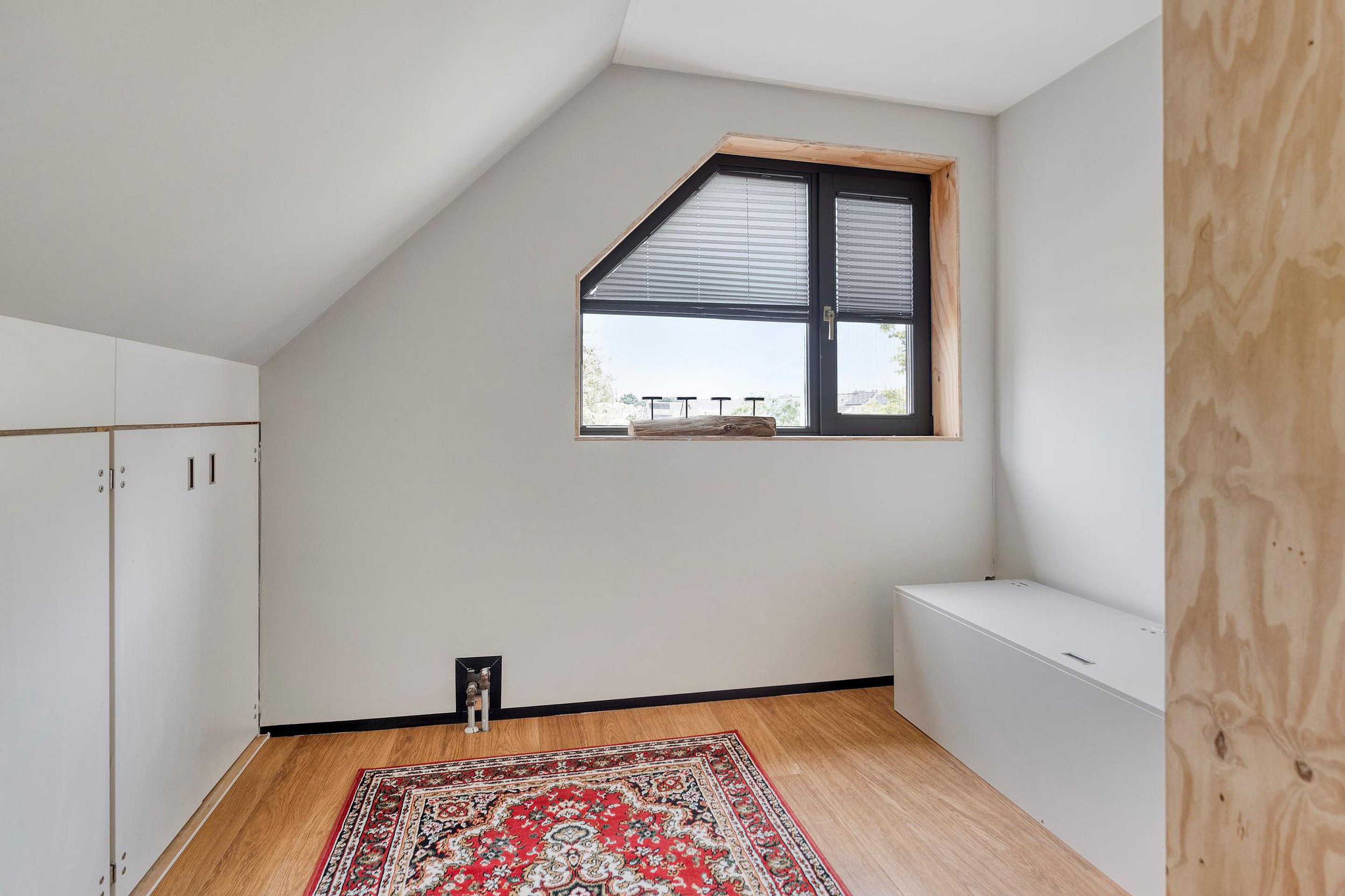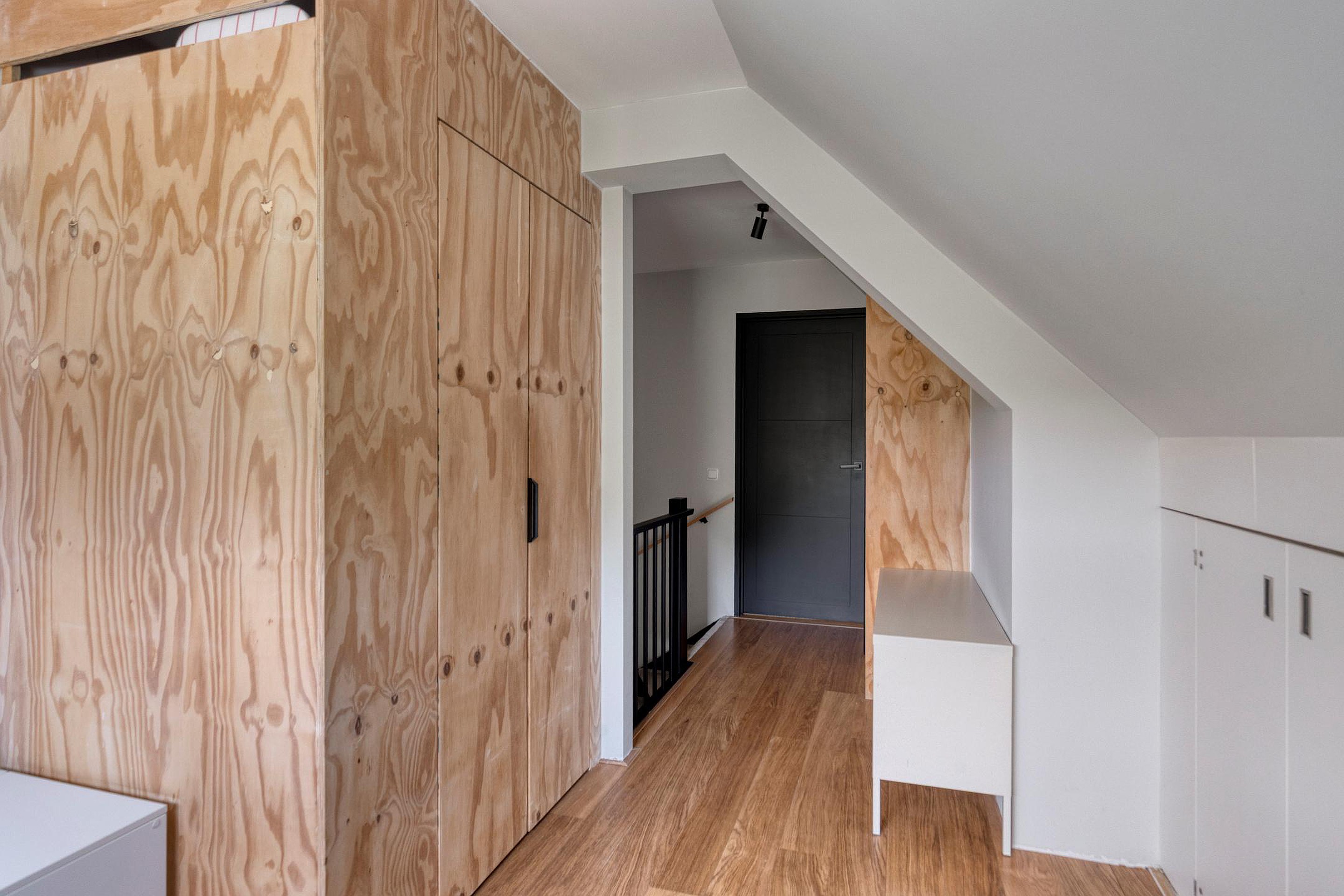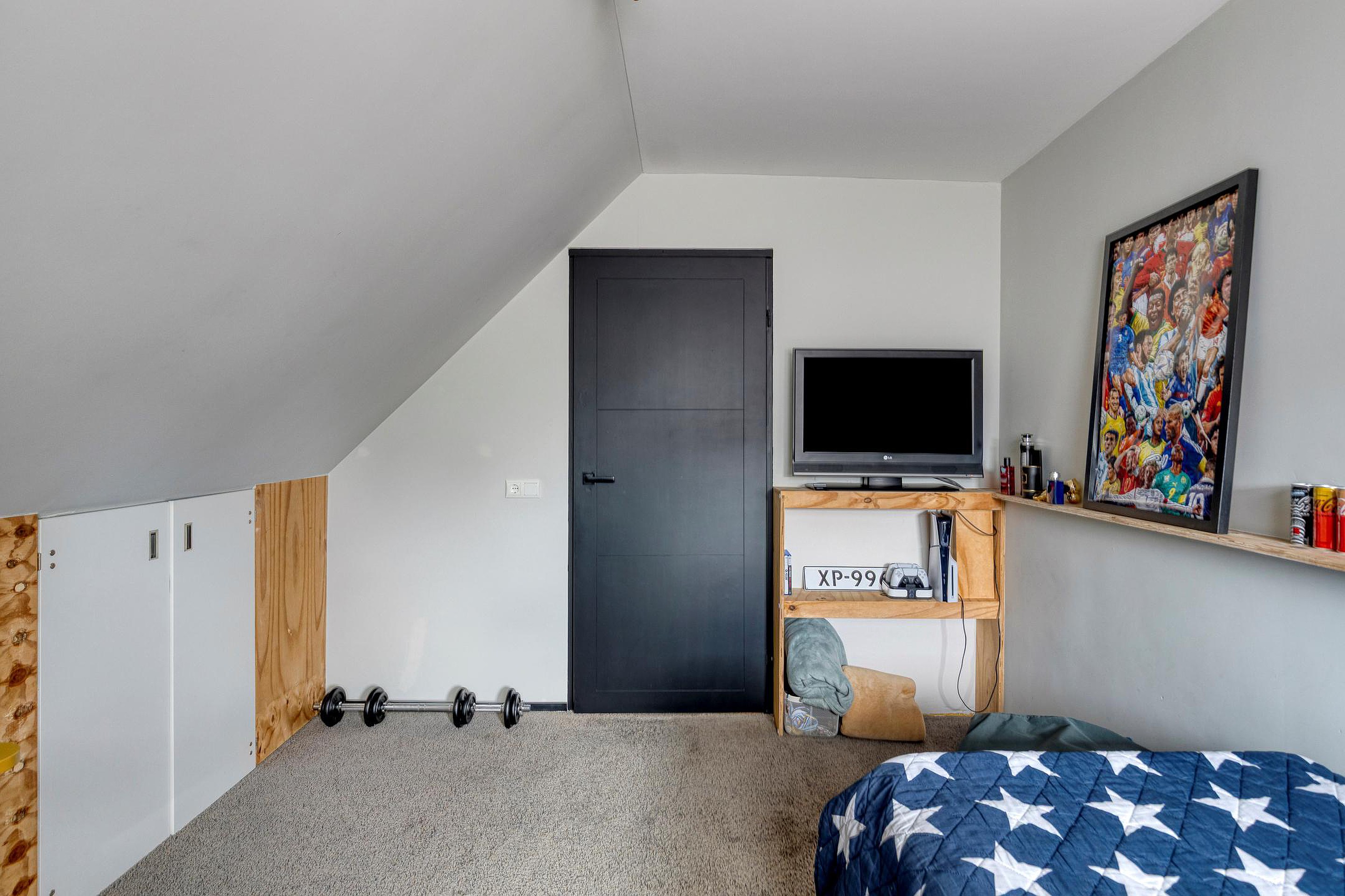 Ook de zolderverdieping is volledig benut; van de ruime overloop tot de vierde slaapkamer. De overloop is afgewerkt met opbergruimte achter het knieschot en een tweetal maatwerk bergkasten: één voorzien van de aansluitingen voor wasmachine en droger, de ander van de cv-installatie. De slaapkamer is eveneens netjes afgewerkt met een lichte tapijtvloer, extra opbergruimte en een gevelraam. Dankzij het slimme gebruik van de schuine wanden en inbouwkasten kunt u hier uitstekend werken, studeren of logeren.