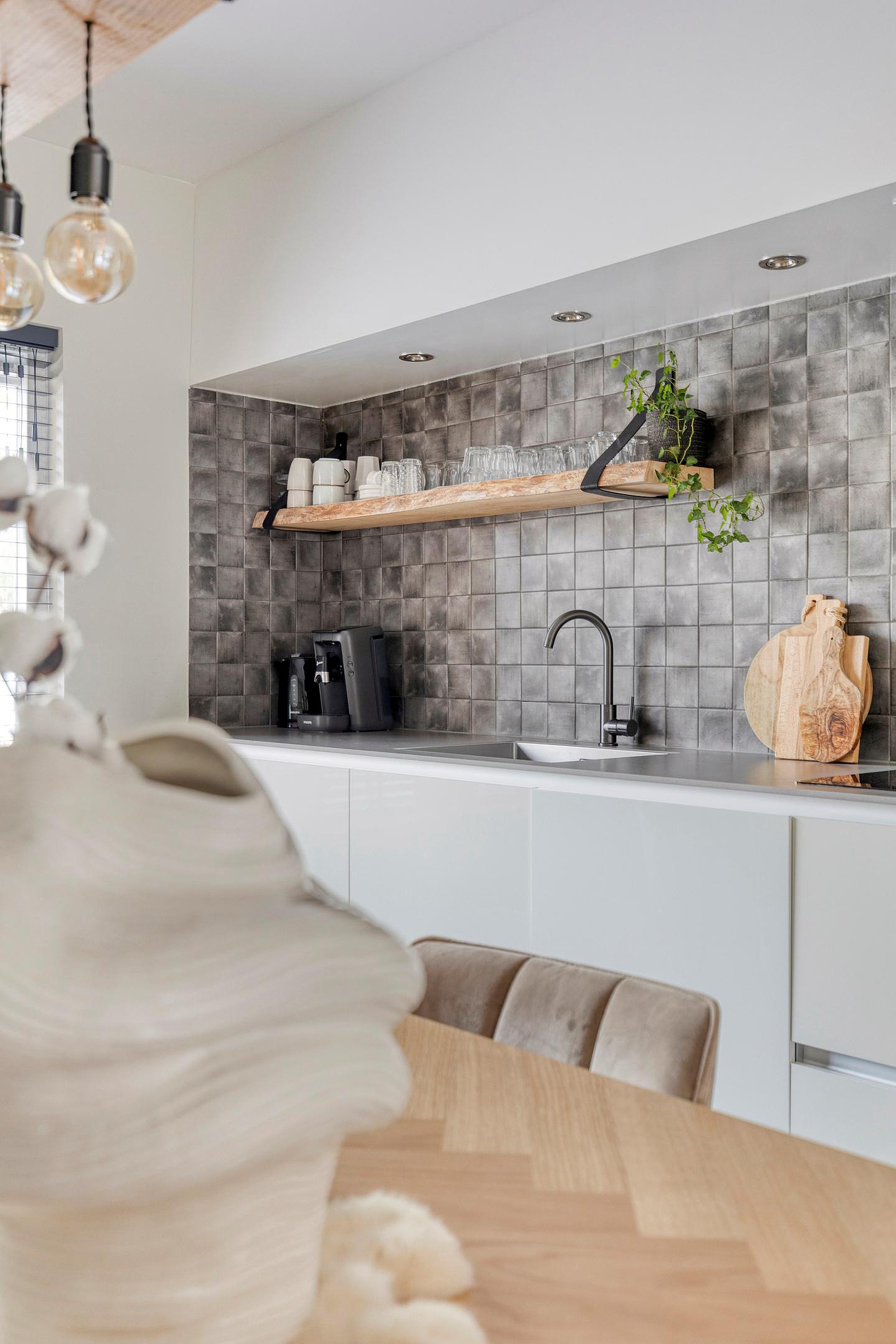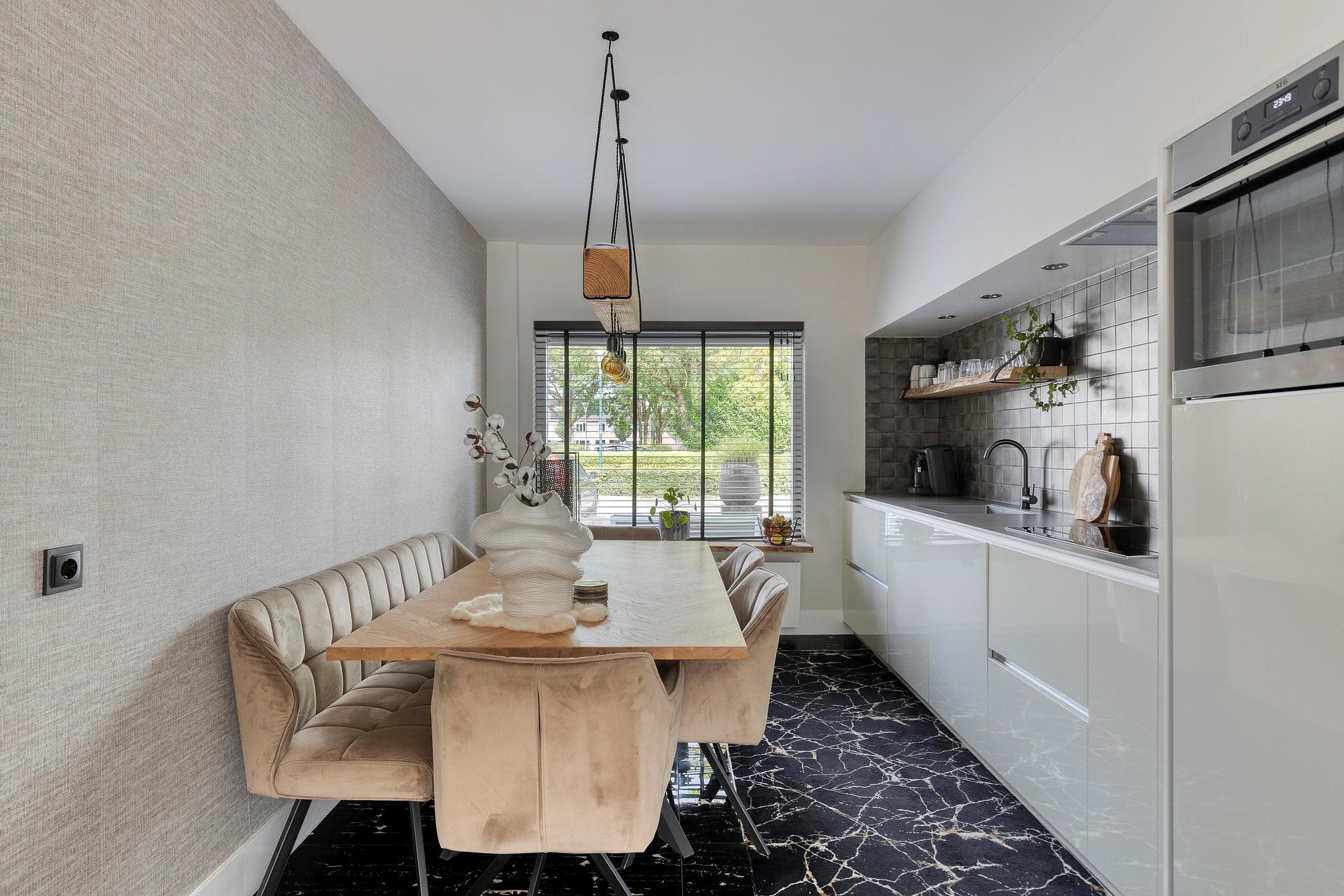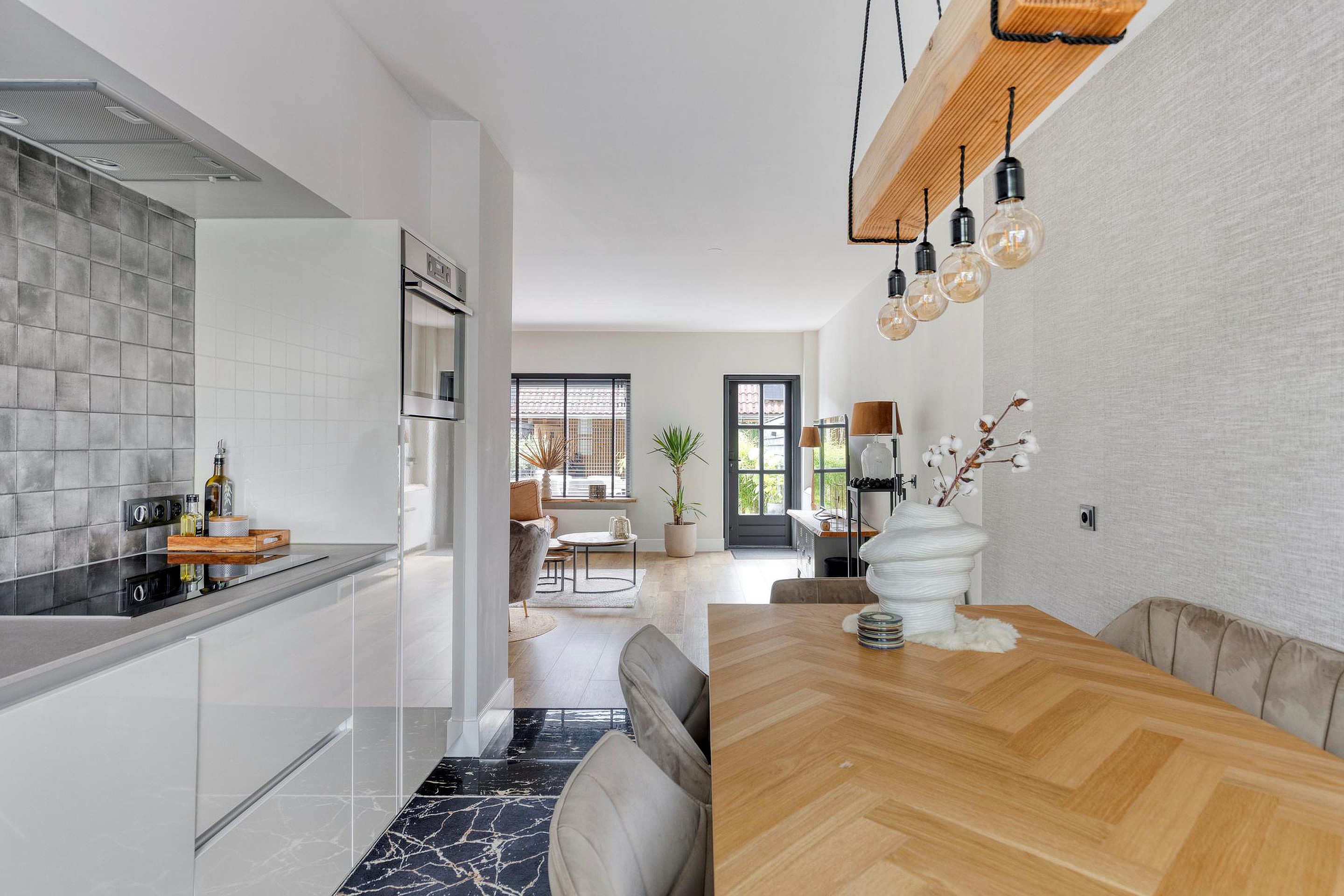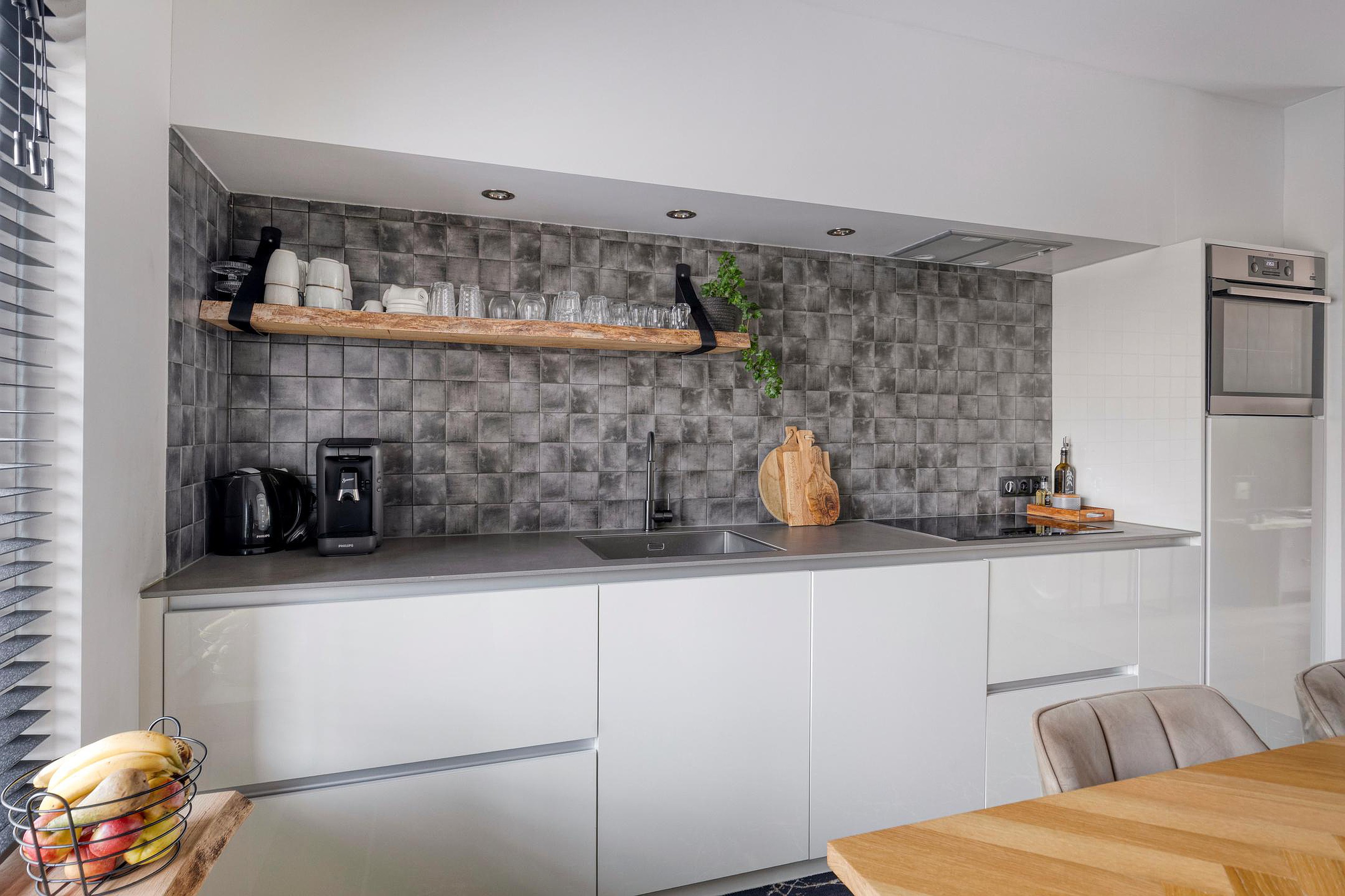 Via de strakke voortuin en overdekte entree stapt u binnen in de hal, voorzien van een moderne toiletruimte, meterkast, trapopgang en toegang tot de woonkamer via een stijlvolle taatsdeur. Wat direct opvalt, zijn de luxe afwerkingen zoals de zwarte binnendeuren, hoge plinten en warme laminaat-vloer die doorloopt in het zitgedeelte. Aan de achterzijde is er voldoende ruimte voor een sfeervol zitgedeelte, met een deur richting de tuin en volop lichtinval. De voorzijde is ingericht met een luxe open keuken en biedt ruimte voor een eethoek. Het rechte en lichte keukenmeubel is uitgerust met een inductiekookplaat, plafondafzuigkap, combi-oven, vaatwasser en koelkast. De combinatie van hoogglans fronten, een stoer werkblad en een betegelde achterwand in grijstinten zorgt voor een moderne, industriële uitstraling.