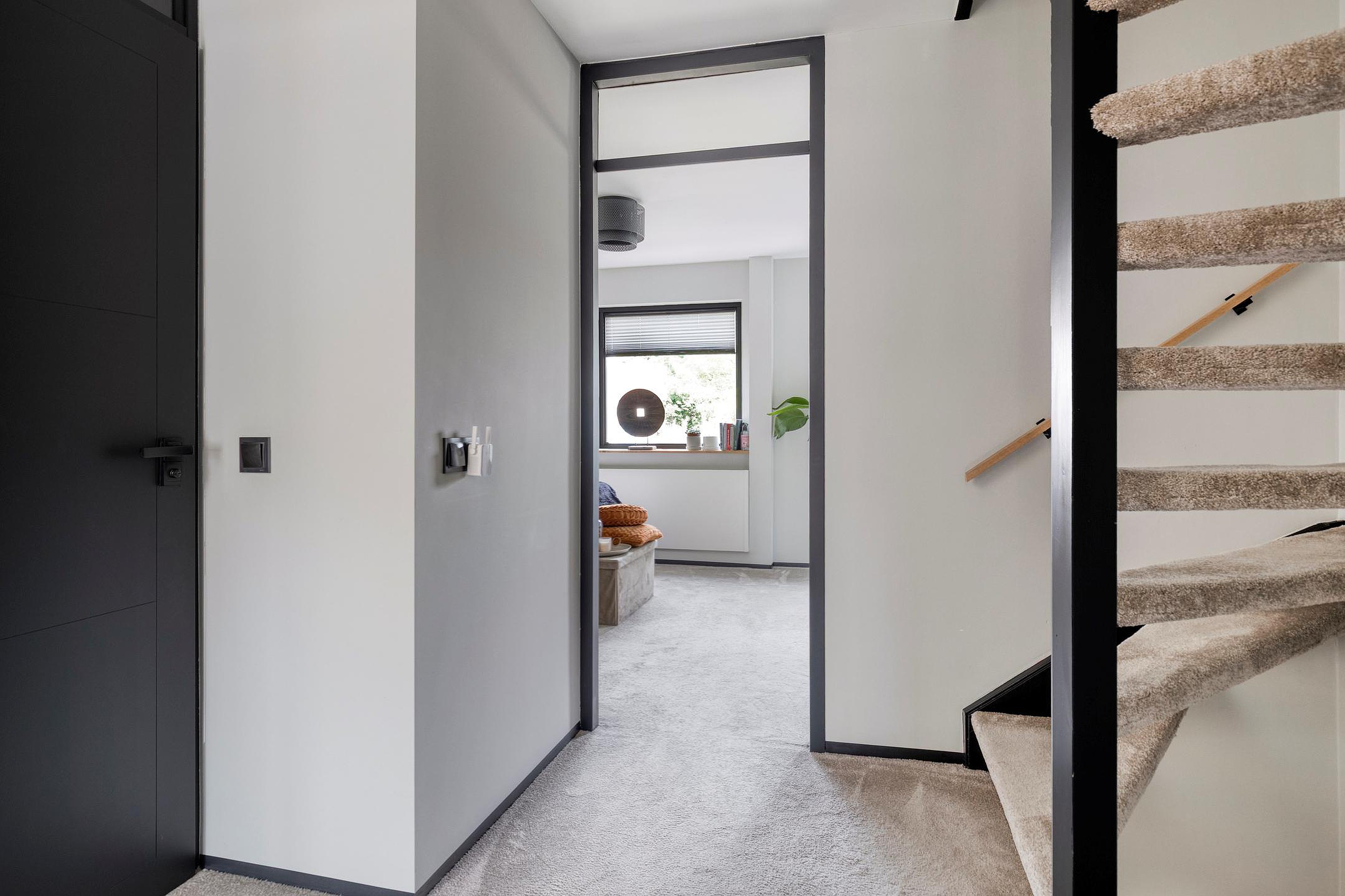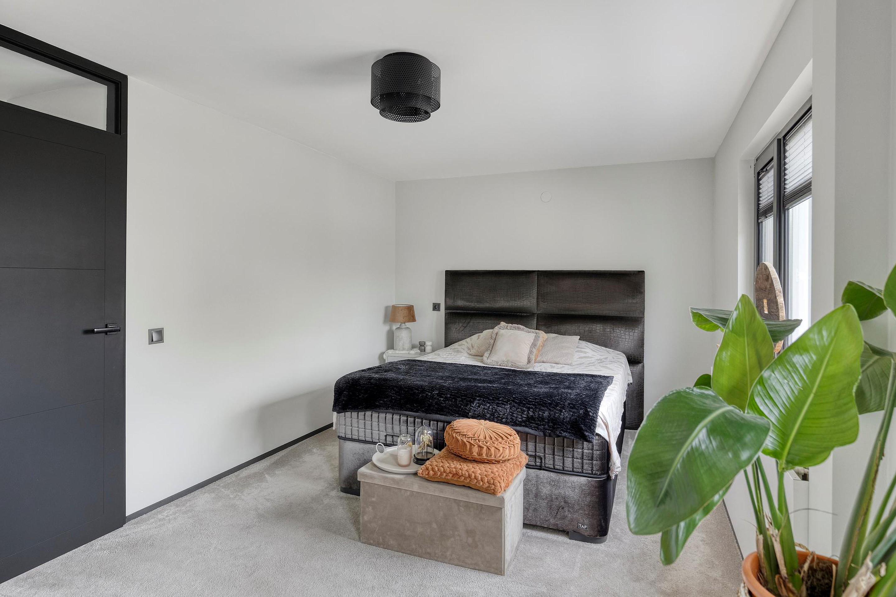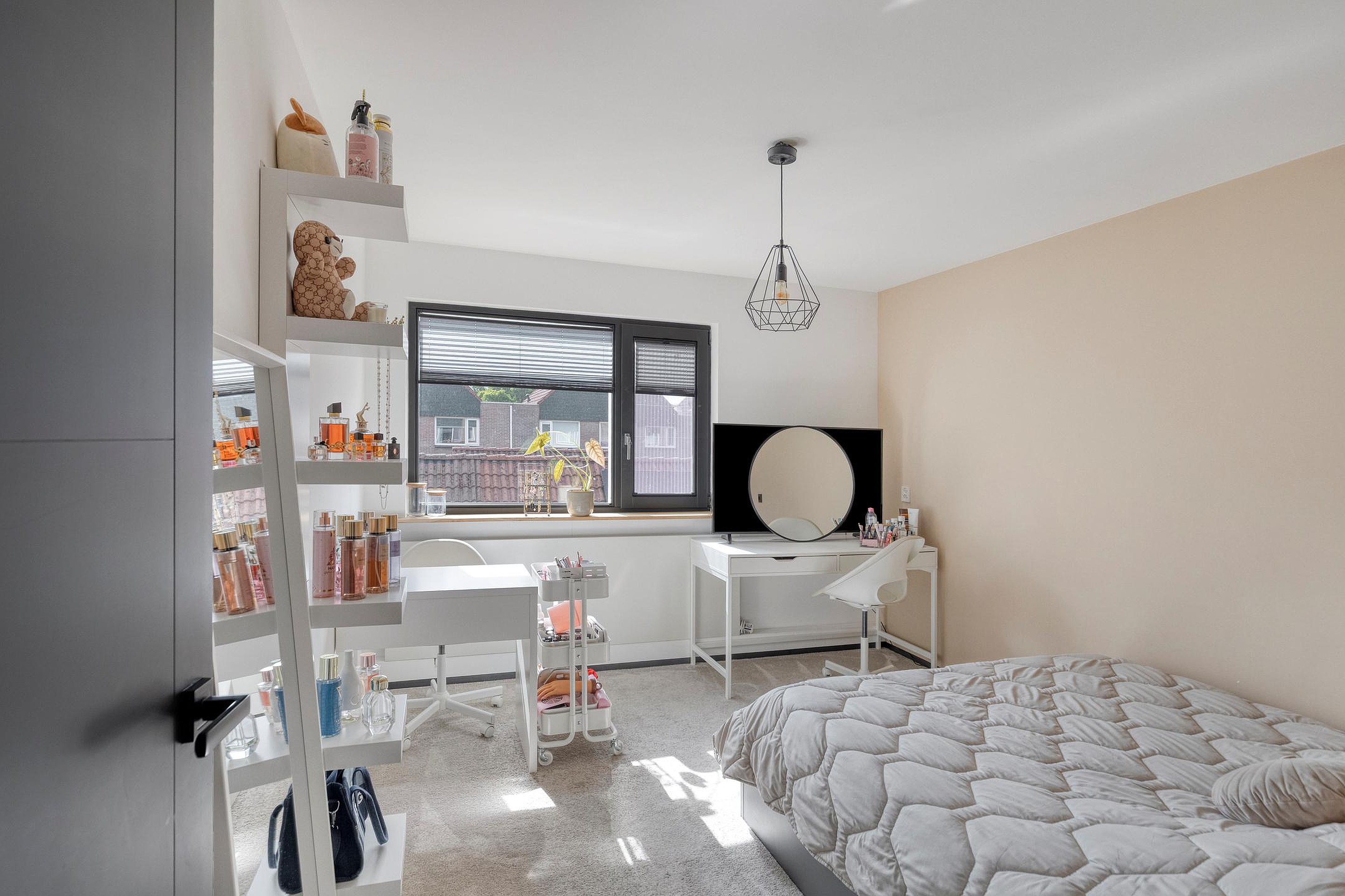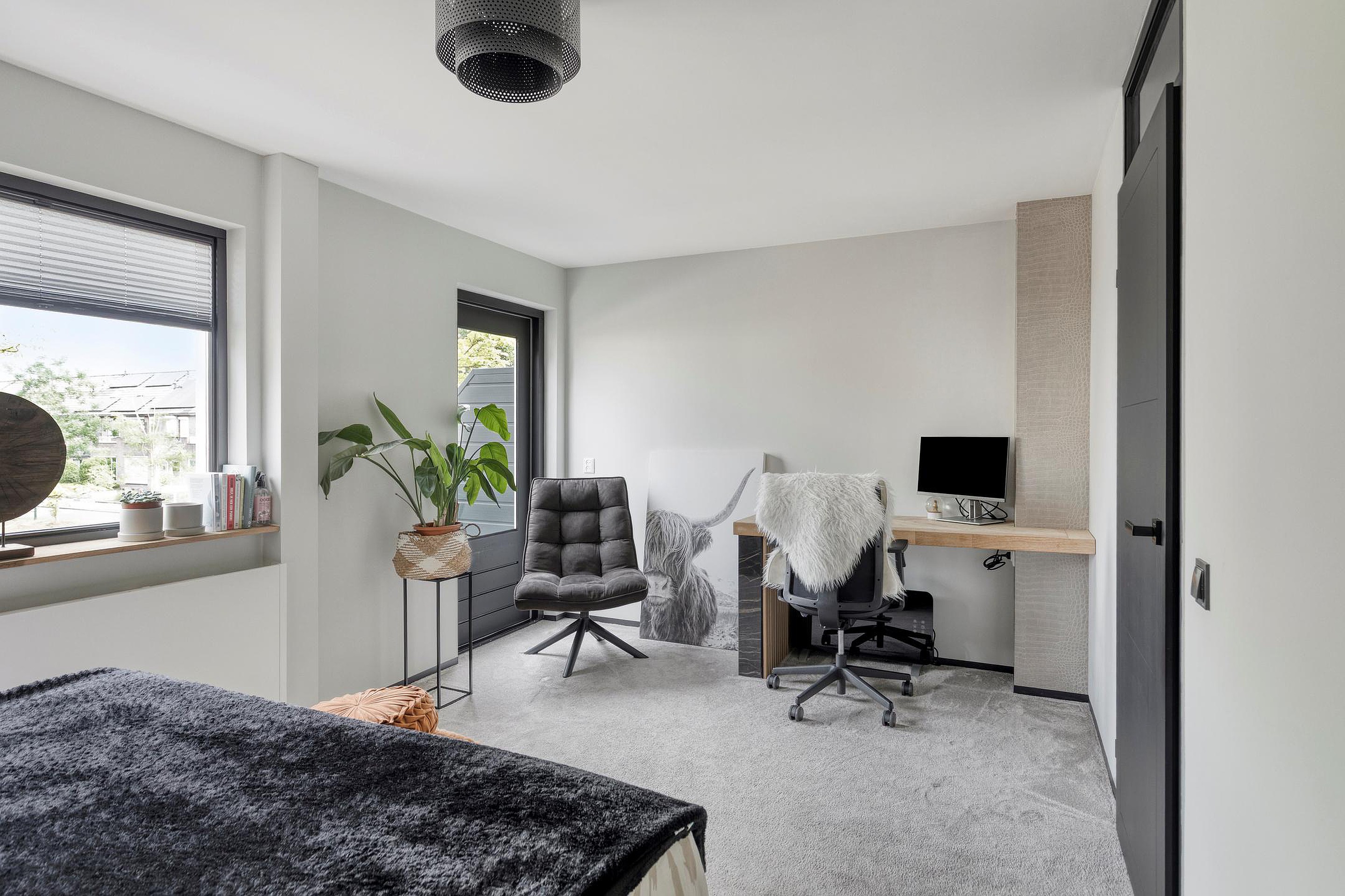 De eerste verdieping telt drie comfortabele slaapkamers, allen keurig afgewerkt en voorzien van een lichte tapijtvloer en nette wandafwerking. De master bedroom aan de voorzijde bestrijkt de gehele breedte van de woning en beschikt over een knus balkon op het westen. De luxe badkamer is werkelijk een plaatje: strak betegeld in wit marmerlook, met zwarte details, een dubbel wastafelmeubel, inloop regendouche én een wandcloset.