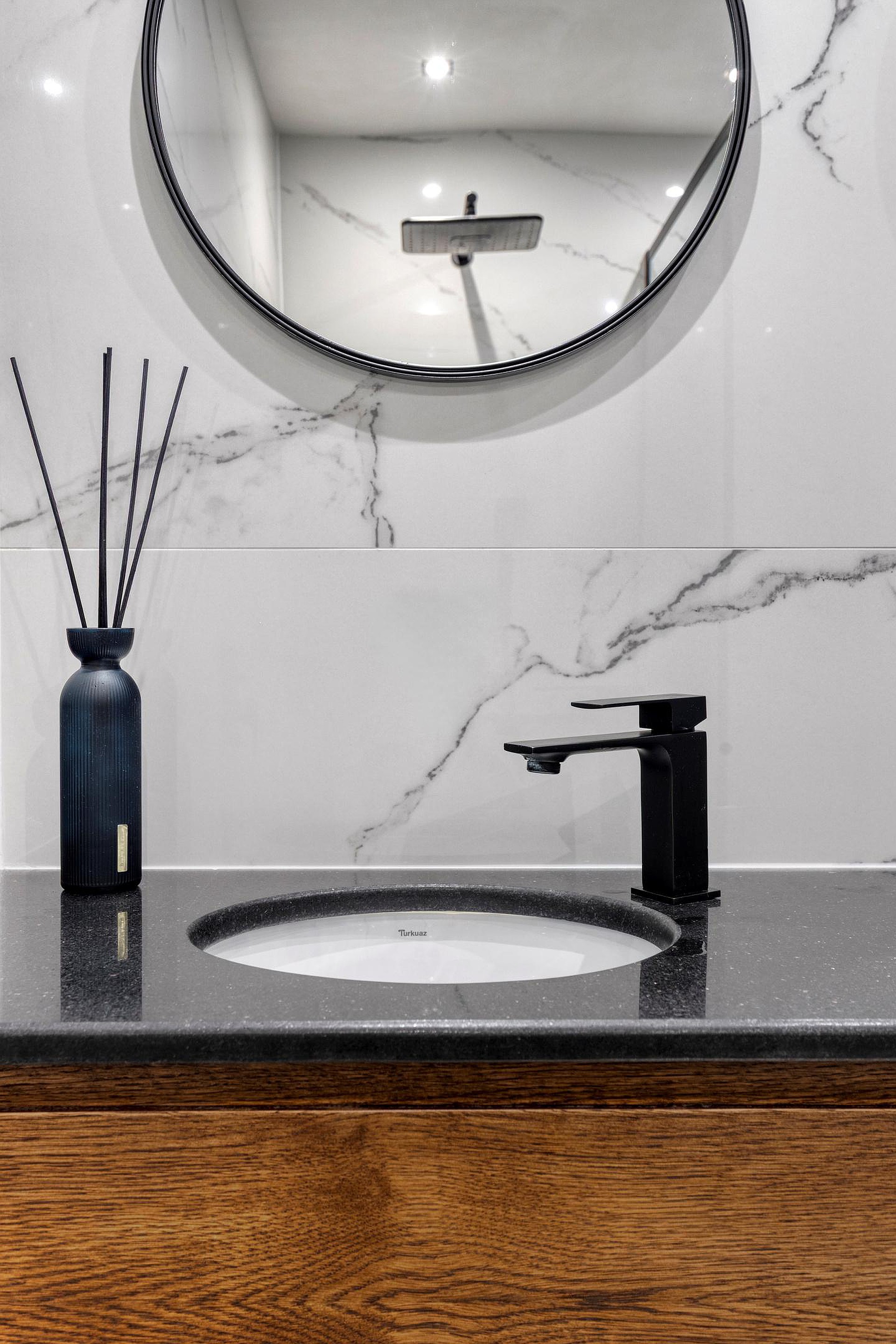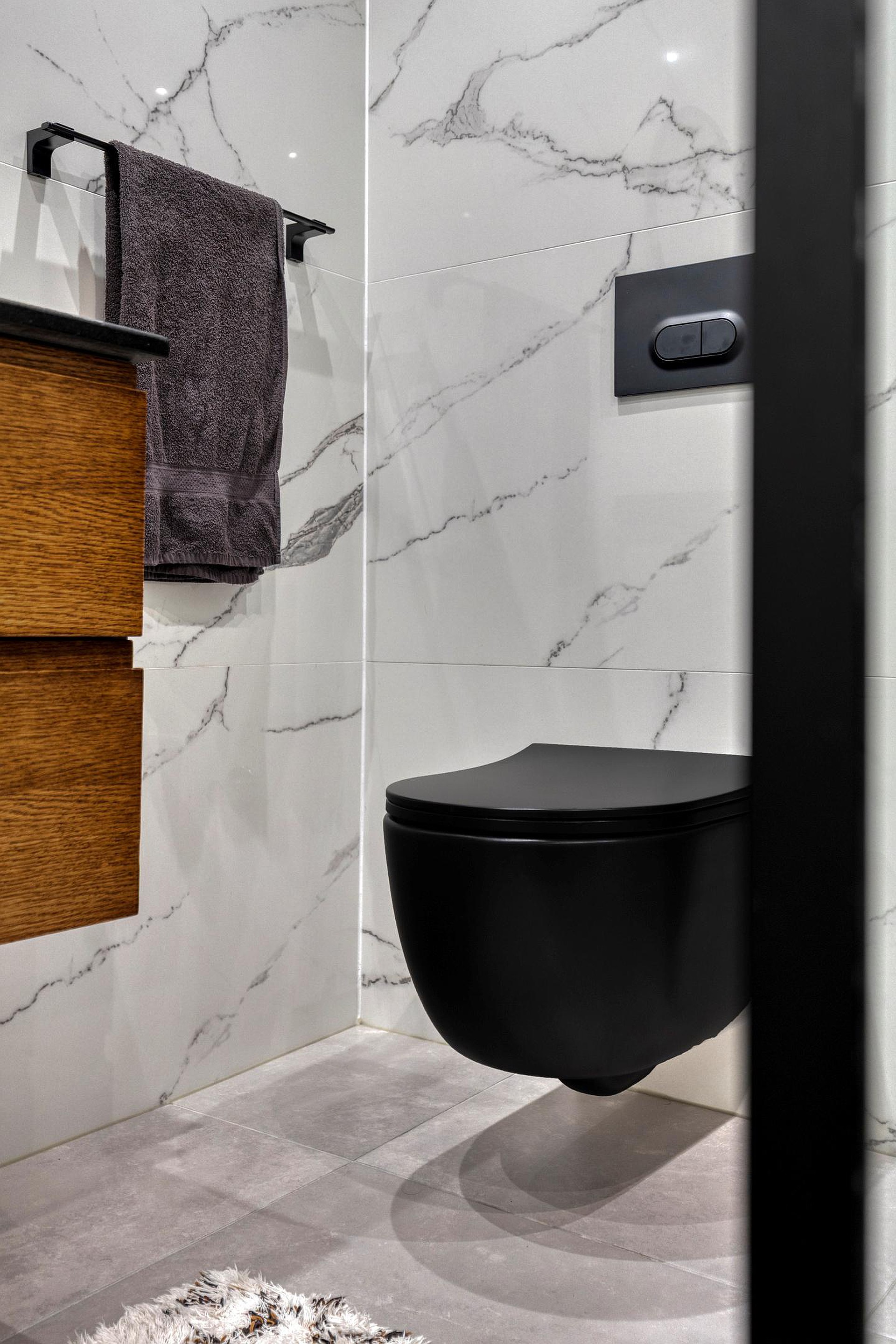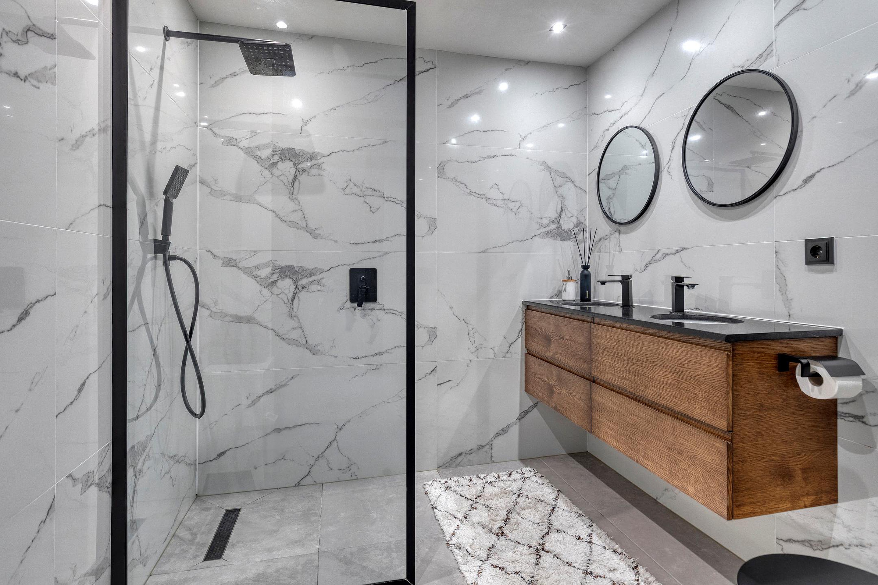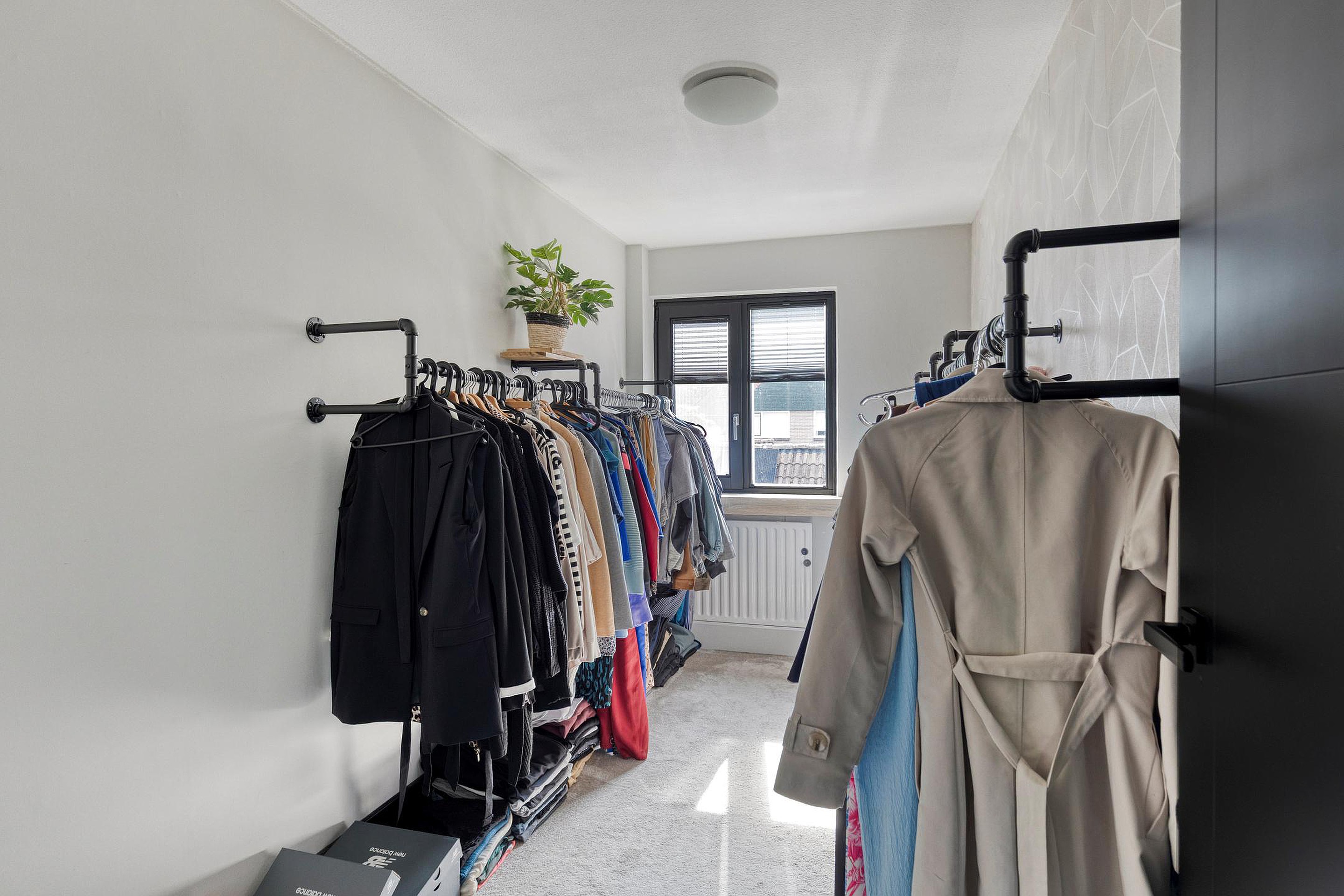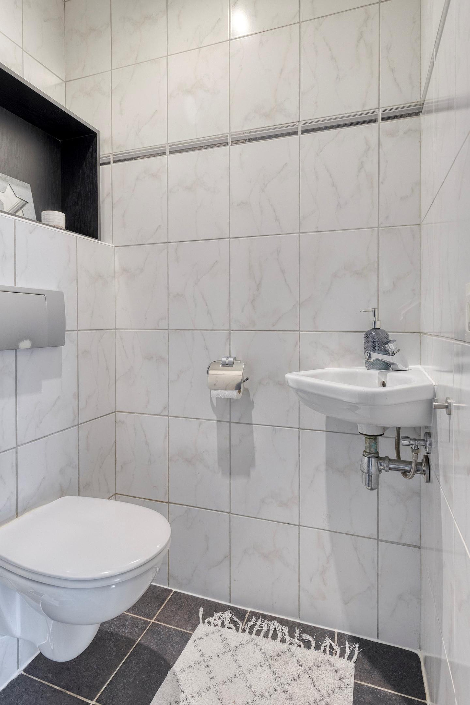 De eerste verdieping telt drie comfortabele slaapkamers, allen keurig afgewerkt en voorzien van een lichte tapijtvloer en nette wandafwerking. De master bedroom aan de voorzijde bestrijkt de gehele breedte van de woning en beschikt over een knus balkon op het westen. De luxe badkamer is werkelijk een plaatje: strak betegeld in wit marmerlook, met zwarte details, een dubbel wastafelmeubel, inloop regendouche én een wandcloset.