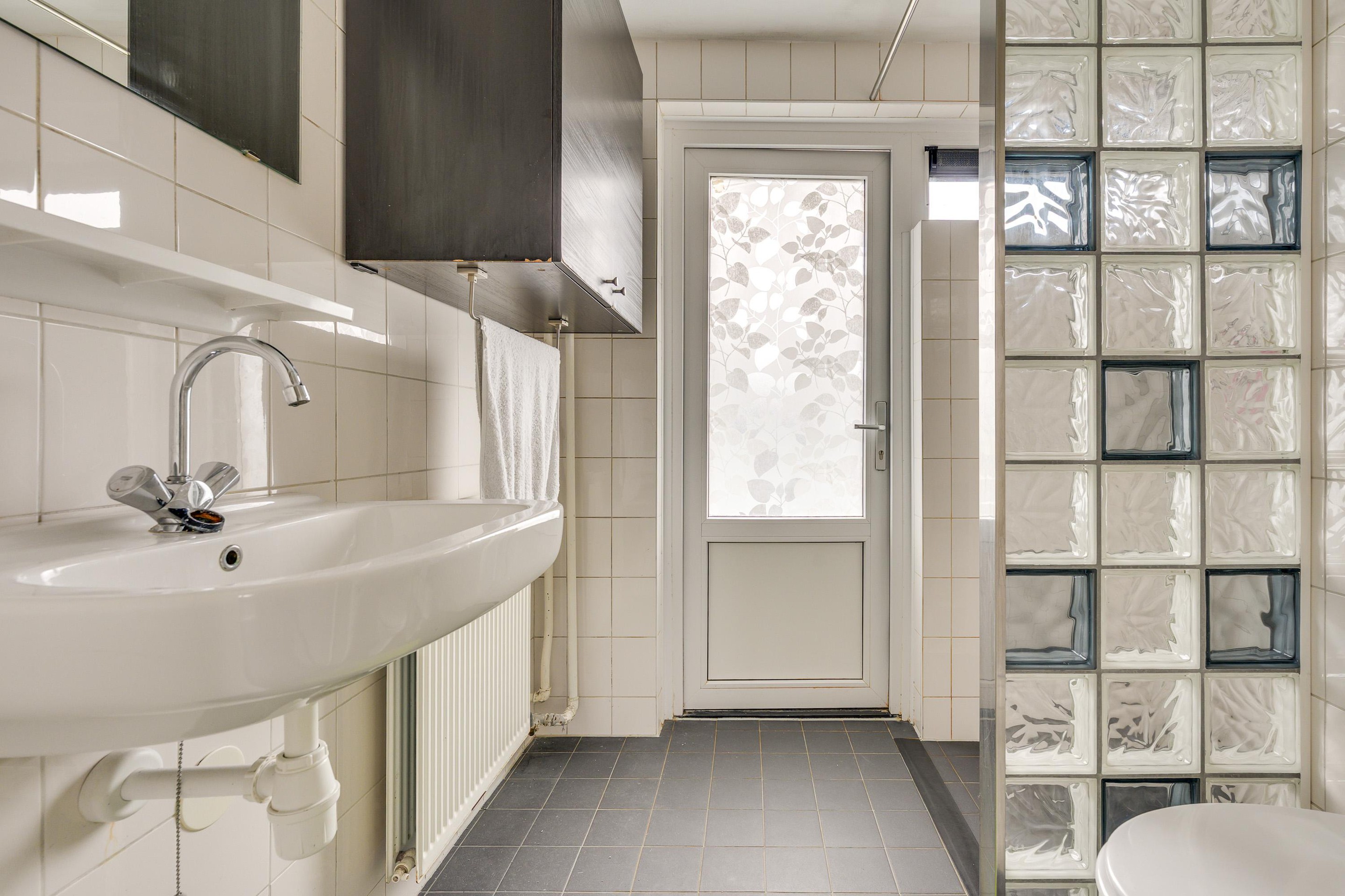 Eerste verdieping De overloop biedt toegang tot drie slaapkamers en de badkamer. Twee slaapkamers bevinden zich aan de voorzijde, de derde slaapkamer en de badkamer liggen aan de achterzijde. De volledig betegelde badkamer is compleet uitgevoerd met douche, vaste wastafel, tweede toilet, radiator en een deur naar het dakterras. De gehele verdieping is afgewerkt met een nette laminaatvloer. Op de kleinste slaapkamer aan de voorzijde bevinden zich momenteel de aansluitingen voor de was- en droogcombinatie.