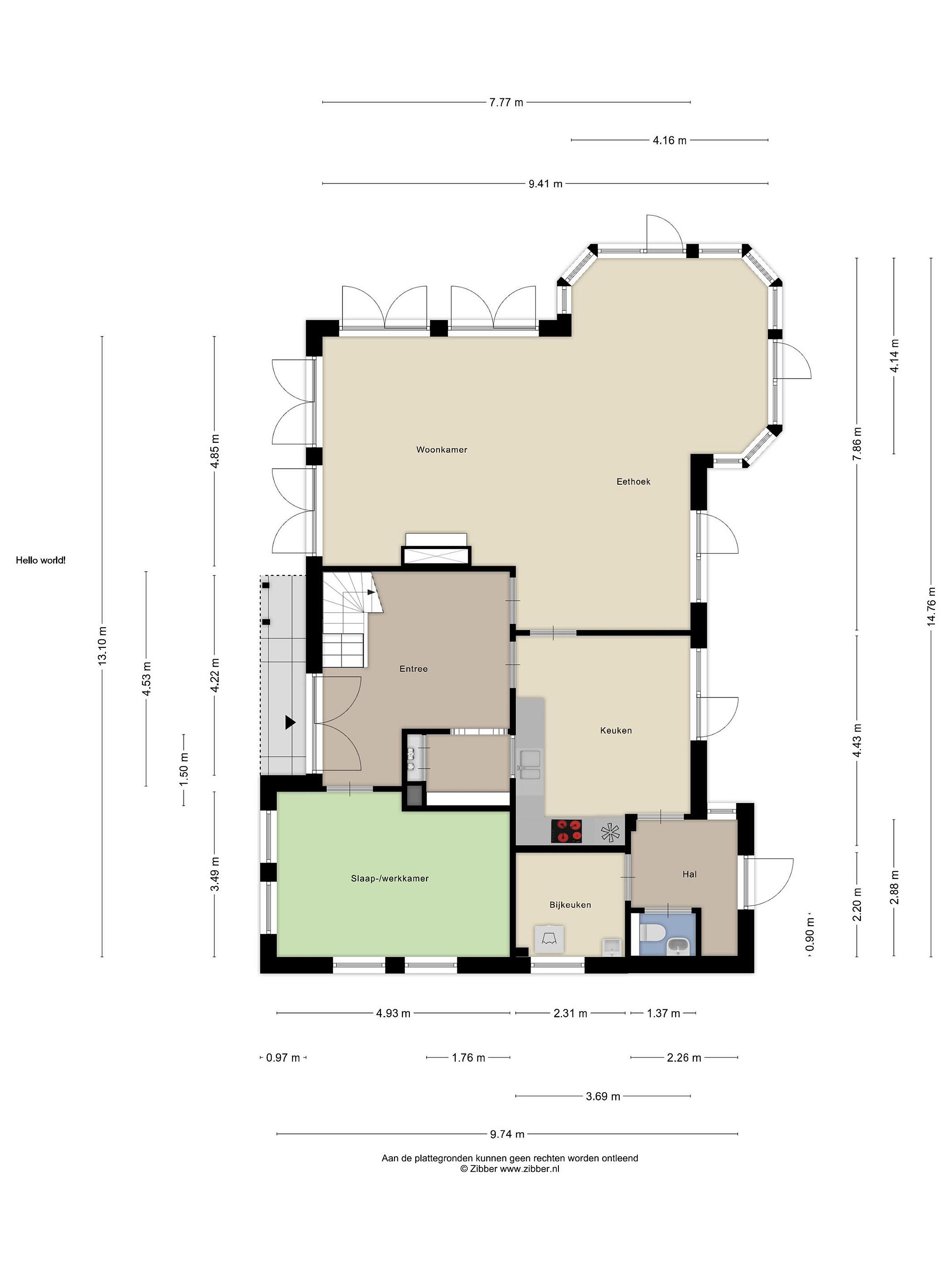 Vanuit de overdekte entree is er toegang tot de ruime hal met vide. Vanuit de hal is er toegang tot een slaap-/werkkamer, de woonkamer, de keuken, de trapopgang naar de eerste verdieping, een garderobe nis en de meterkast. In de woonkamer bevinden zich vele raampartijen waardoor er veel lichtinval is in de woning, dit zorgt tevens voor een prettig zicht op de zeer royale achtertuin. Middels openslaande tuindeuren en diverse schuifpuien is er toegang tot de achter- en zijtuin. In de woonkamer is een schouw met een sfeervolle gashaard aanwezig. Vanuit de woonkamer is de keuken bereikbaar. De keuken in L-vorm is voorzien van diverse kasten en lades, een kunststof werkblad met spoelbak en mengkraan, een inductiekookplaat, afzuigkap en een koelkast. Vanuit de keuken is de achtertuin eveneens bereikbaar middels een schuifpui. Tevens is er vanuit de keuken toegang tot een hal waar een warmtepomp/airco-unit gesitueerd is. Vanuit deze hal is er toegang tot een bijkeuken, het toilet en een deur naar de achtertuin. In de bijkeuken zijn een gootsteen en de aansluiting voor de wasmachine gesitueerd. Het toilet is geheel betegeld en v.v. een hangend toilet en fonteintje.