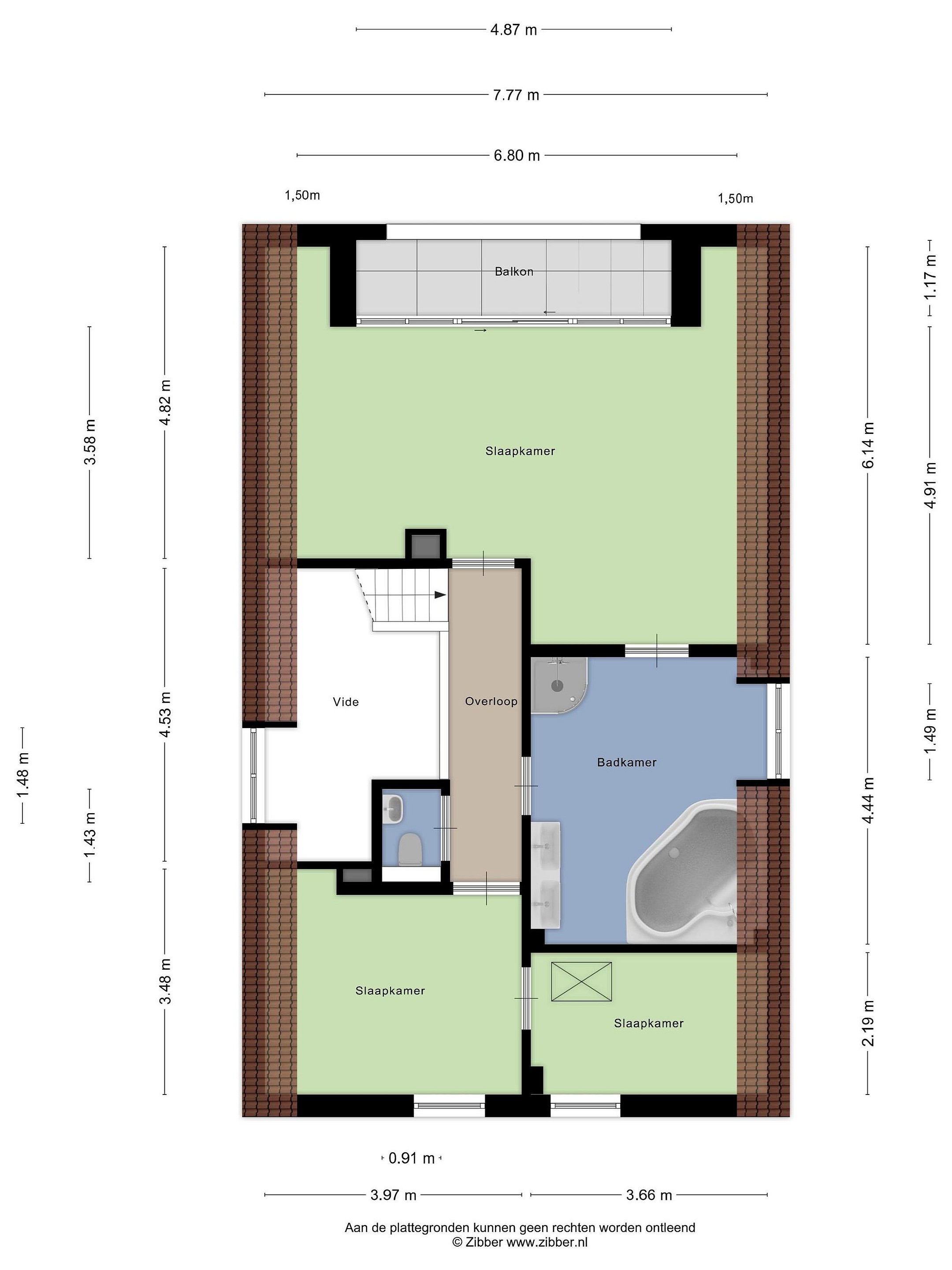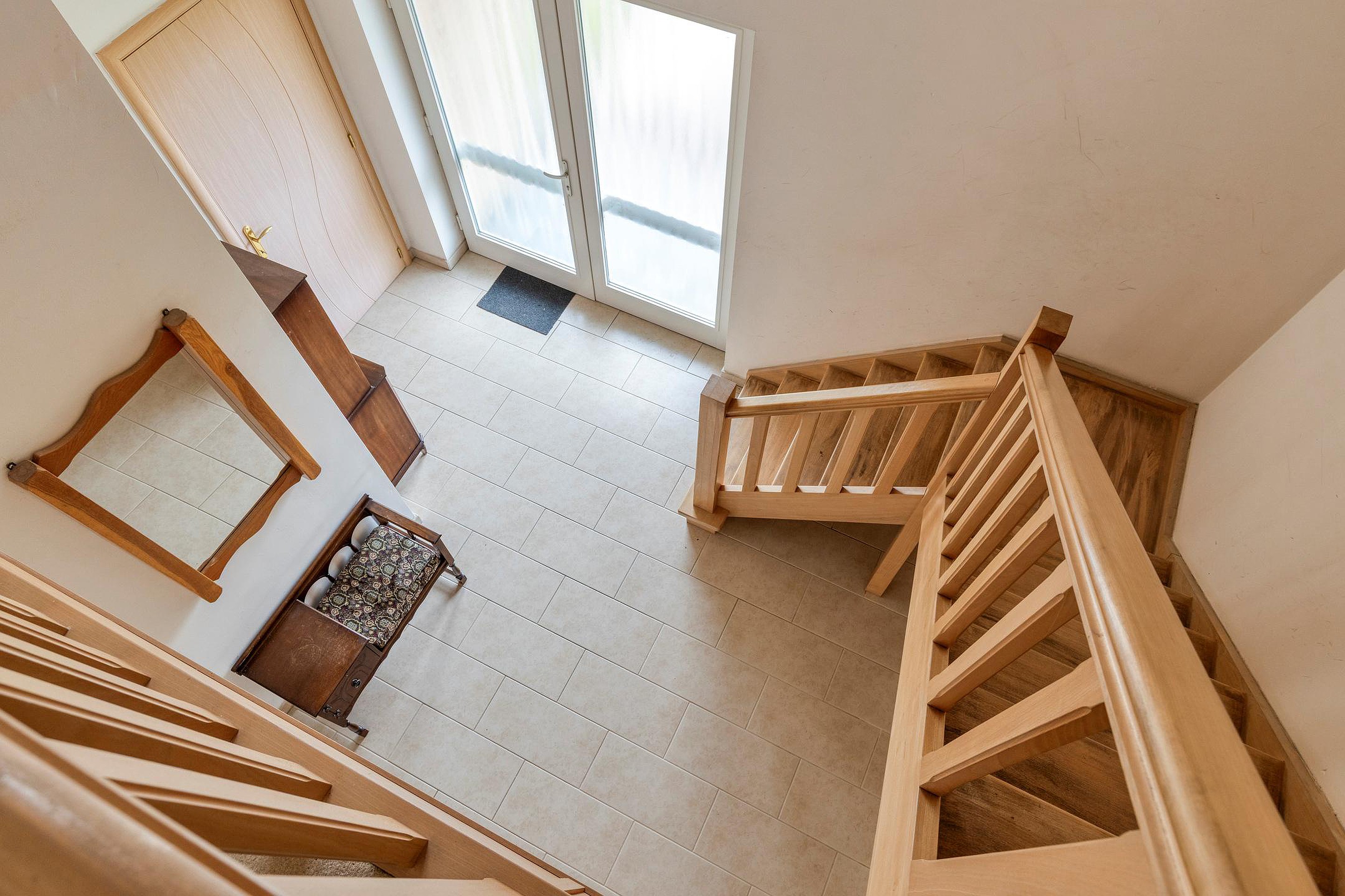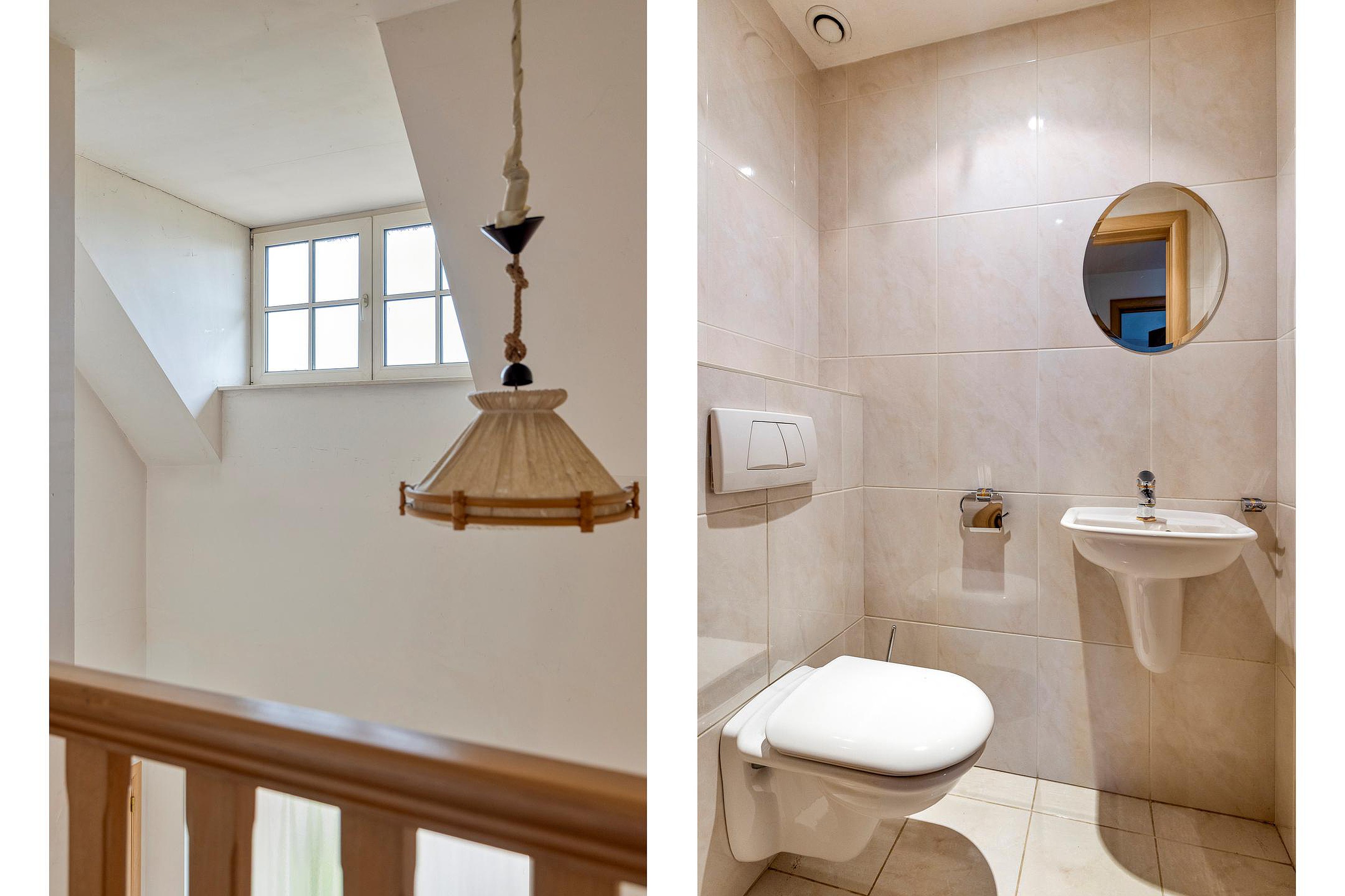 Vanuit de overloop met fraaie vide is er toegang tot 2 slaapkamers, de badkamer en het separaat toilet. De grootste slaapkamer beschikt over een balkon. Vanuit de andere slaapkamer is er toegang tot een kleinere slaapkamer. Hier is een vlizotrap aanwezig welke toegang geeft tot een bergzolder. De zeer royale badkamer is geheel betegeld en v.v. een hoekbad, een douchecabine en een dubbele wastafel met meubel. Het separaat toilet is geheel betegeld en v.v. een hangend toilet en fonteintje