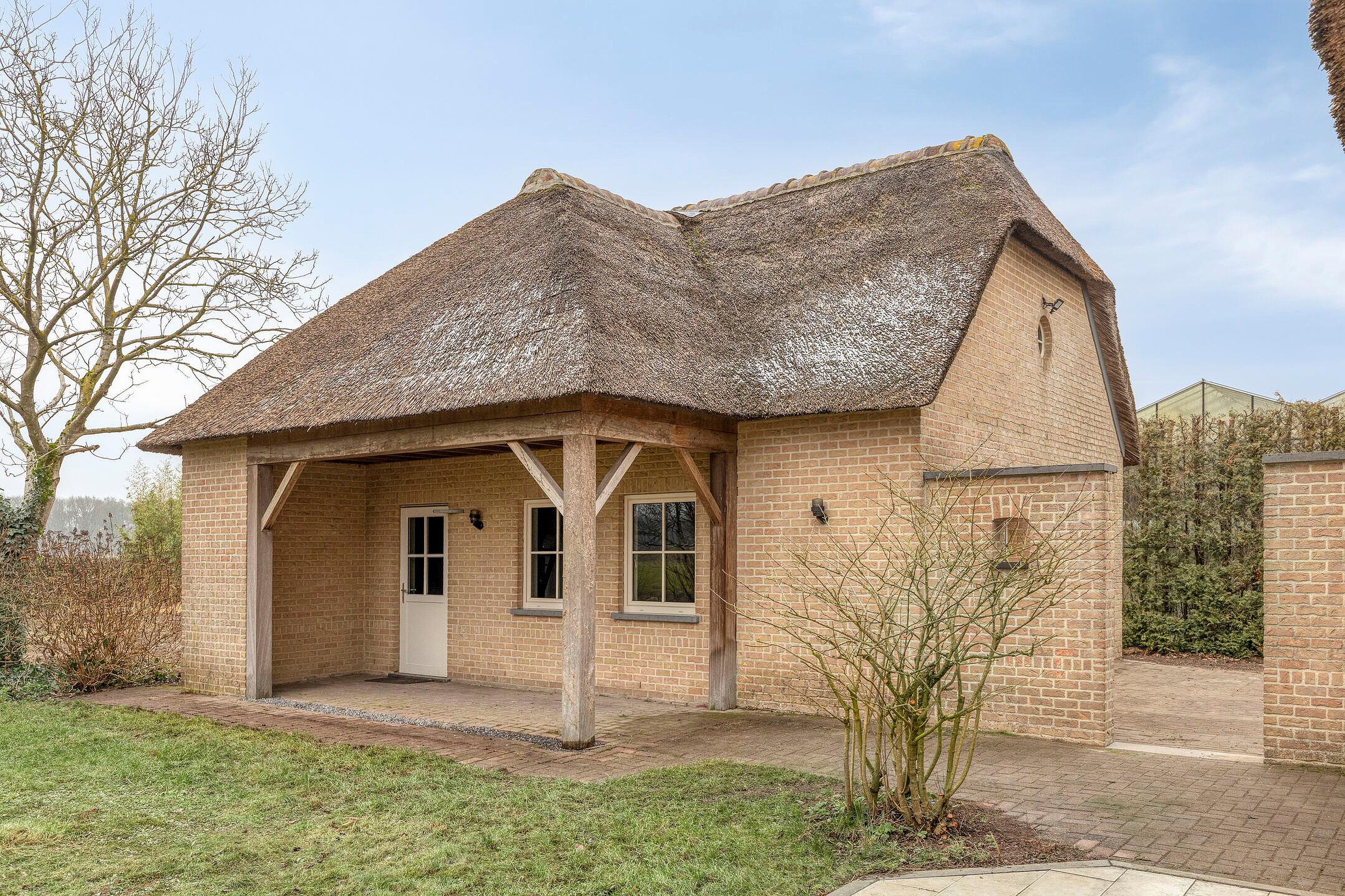 De woning is bereikbaar middels een oprijlaan met dubbele inrit. Langs de woning bevindt zich de dubbele garage met parkeerruimte voor meerdere auto’s. De tuin is gelegen rondom de gehele woning en is deels aangelegd met gazon, sierbestrating, vaste beplanting, een vijver, bomen en struiken.