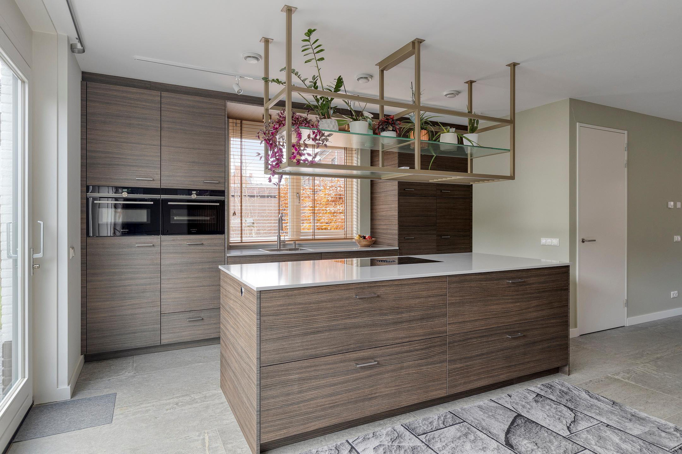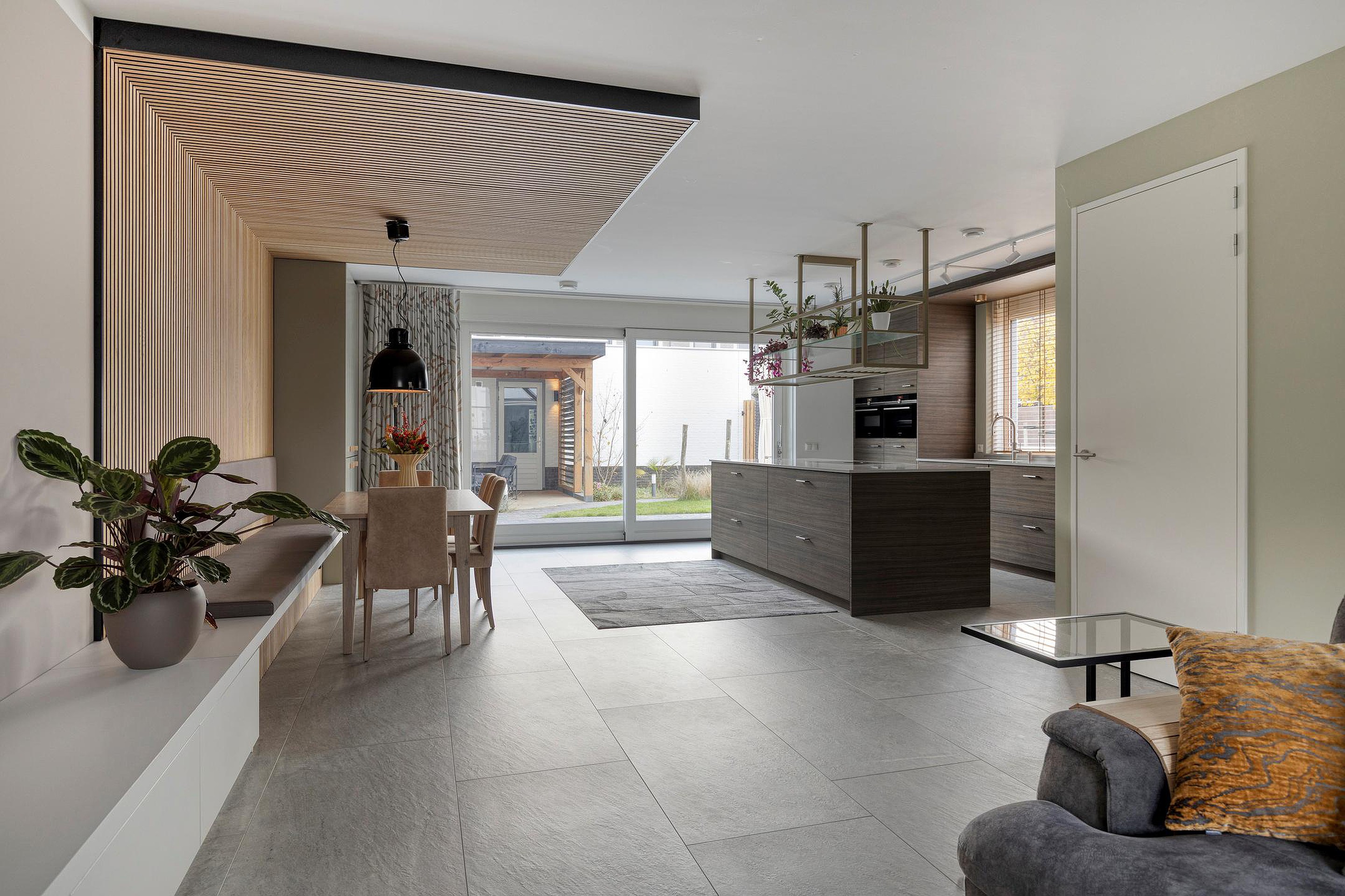 De keuken (van Diessen) in rechte opstelling met kookeiland, is v.v. diverse kasten en lades, een werkblad van composiet met spoelbak en kokend waterkraan (Quooker), inductiekookplaat (Bora), combi magnetron en combi stoomoven (beide Siemens), vaatwasser (Miele) en een koelkast met vriezer (Liebherr). Het toilet is geheel betegeld en v.v. een hangend toilet en fonteintje. De vloer van de begane grond is afgewerkt met een keramische tegel en v.v. vloerverwarming. De wanden en plafonds zijn afgewerkt met pleisterwerk en de kozijnen zijn van hout met HR++ glas.