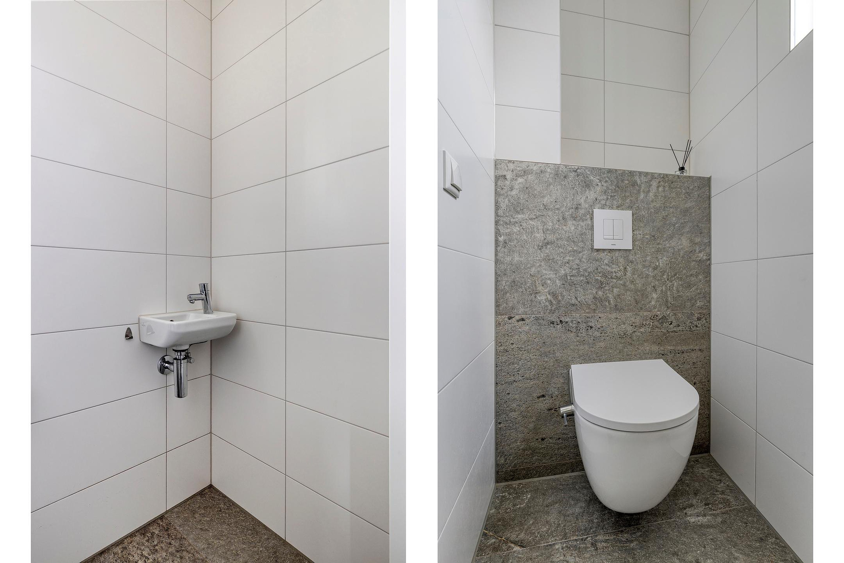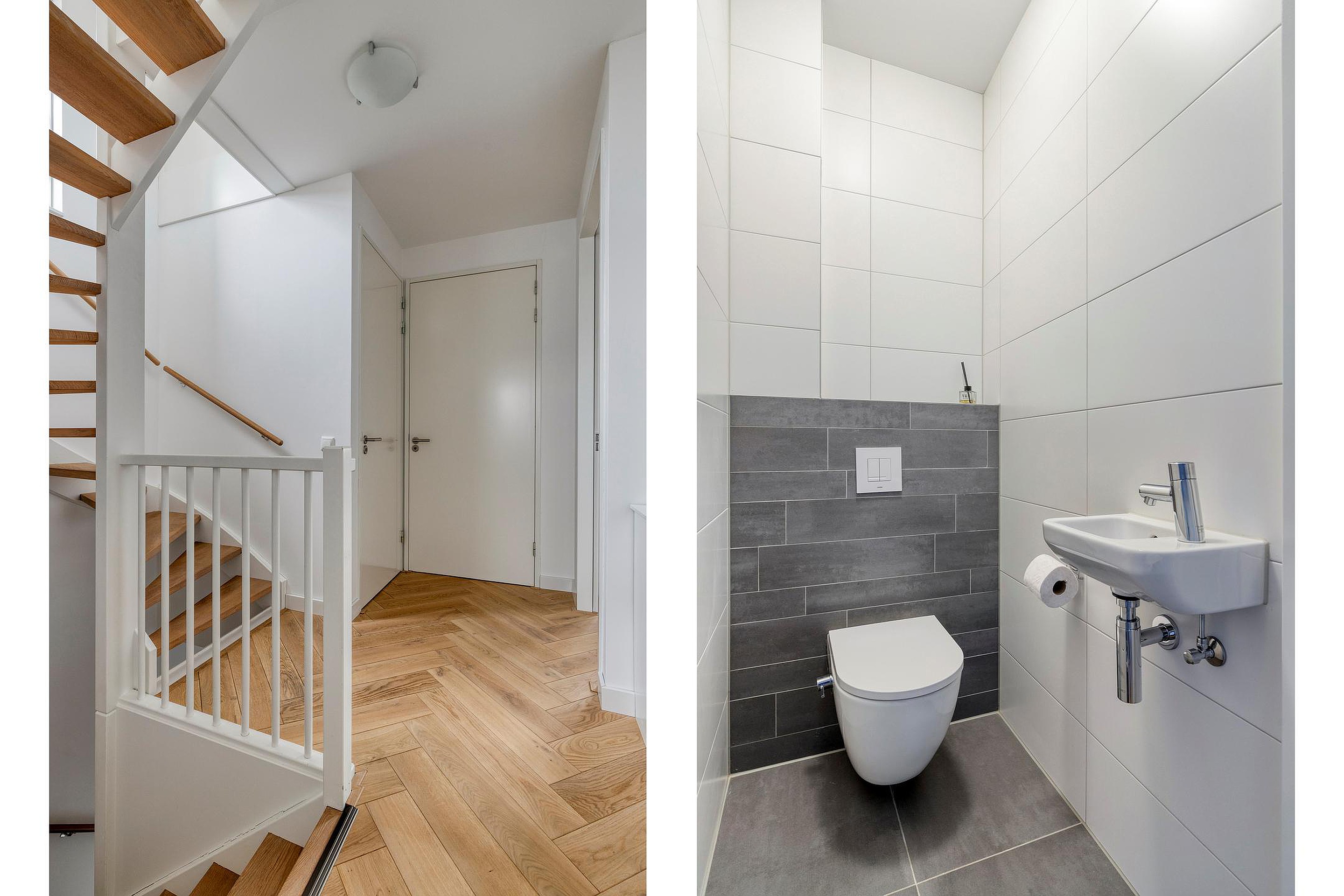 Vanuit de overloop, met trapopgang naar de tweede verdieping, zijn 3 slaapkamers een separaat toilet en de badkamer bereikbaar. De badkamer is geheel betegeld en v.v. een ligbad, een inloopdouche en een dubbele wastafel met meubel. Het separate toilet is geheel betegeld en v.v. een hangend toilet en fonteintje. De vloer op de eerste verdieping is afgewerkt met een houten (multi plank) visgraat vloer. De wanden en plafonds zijn afgewerkt met pleisterwerk en de kozijnen zijn van hout met HR++ glas.