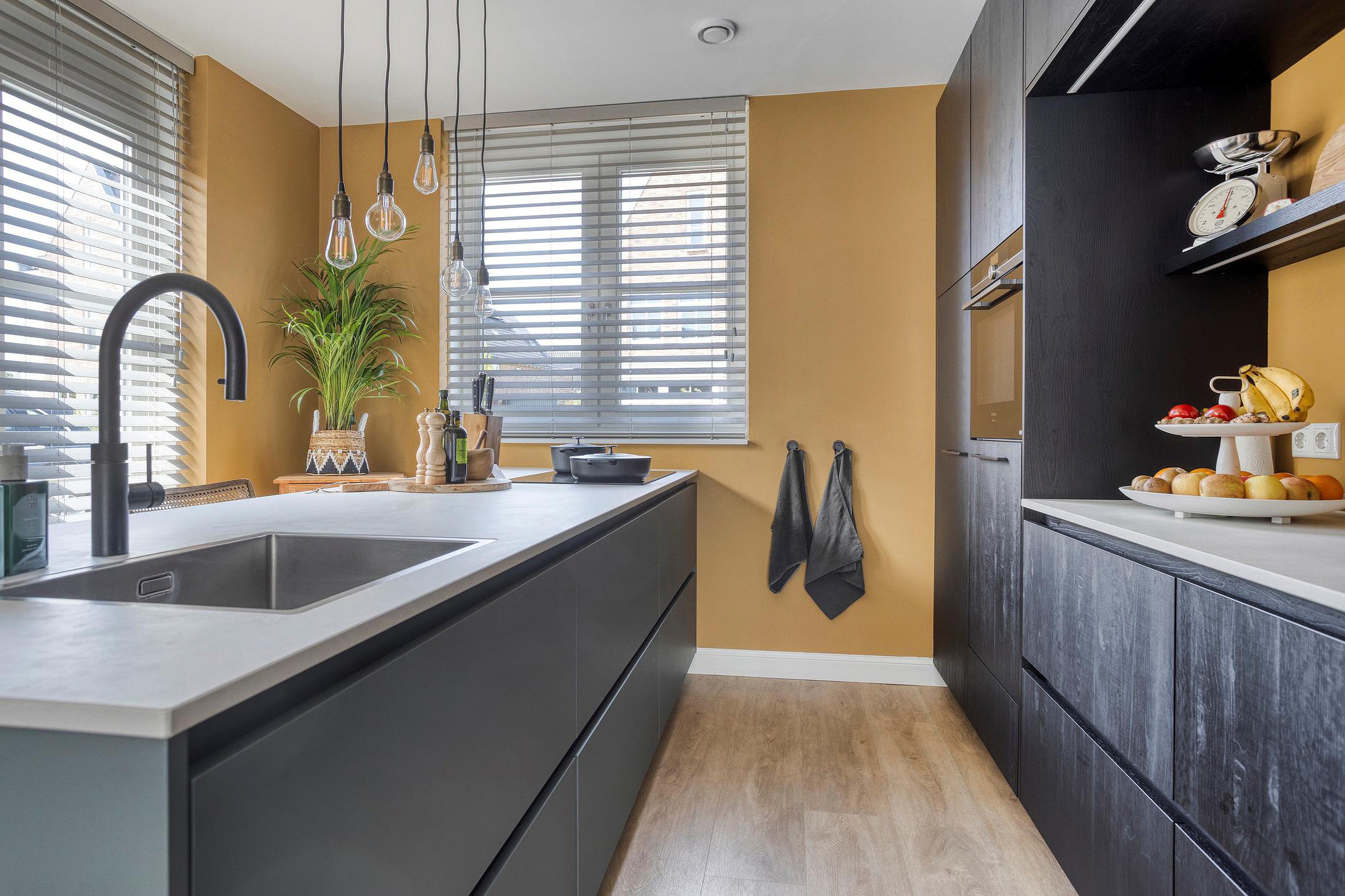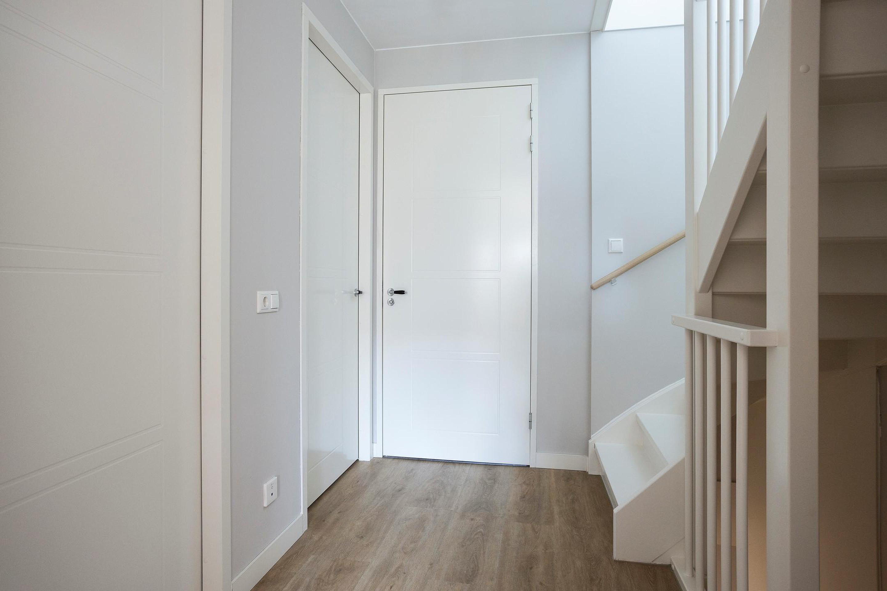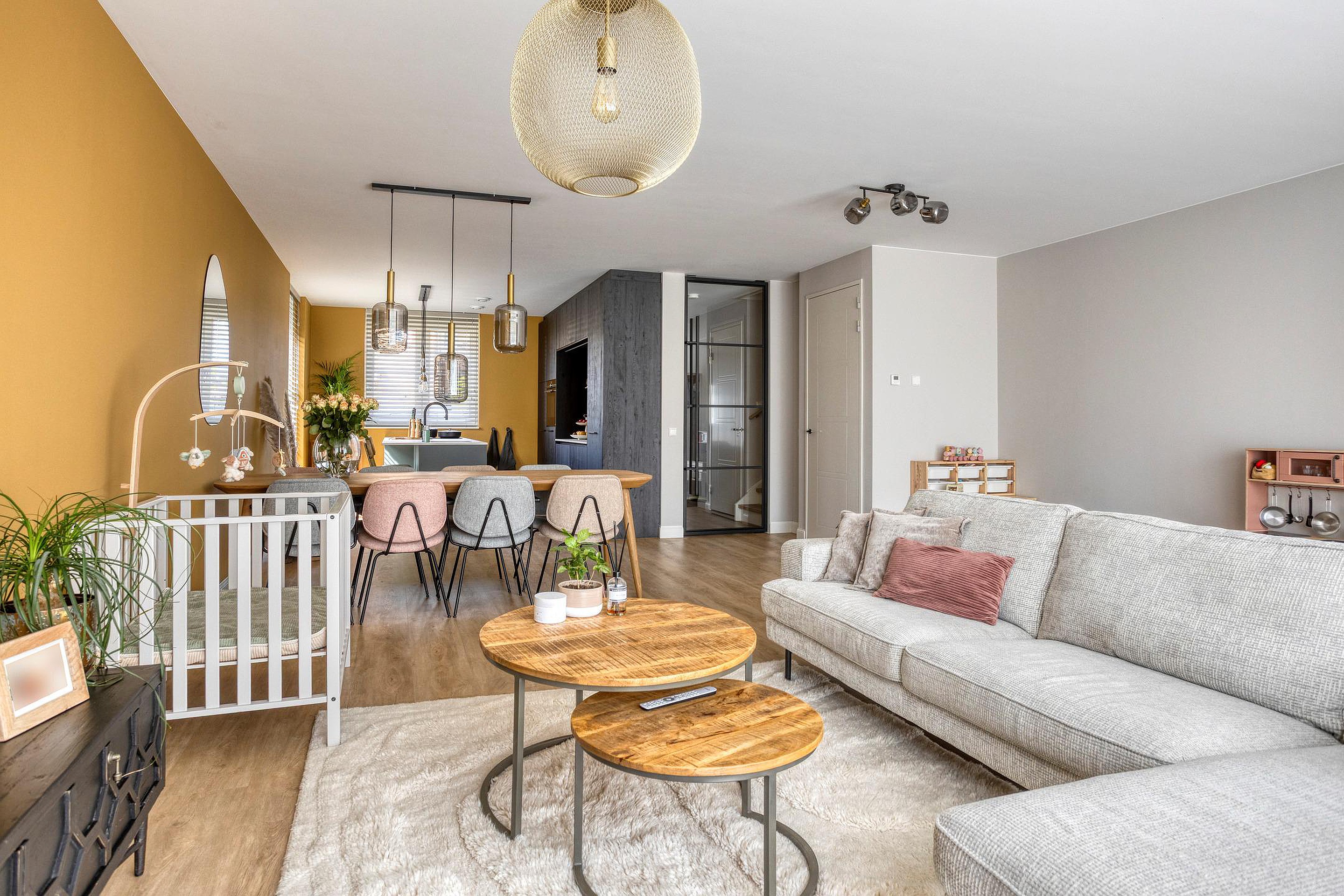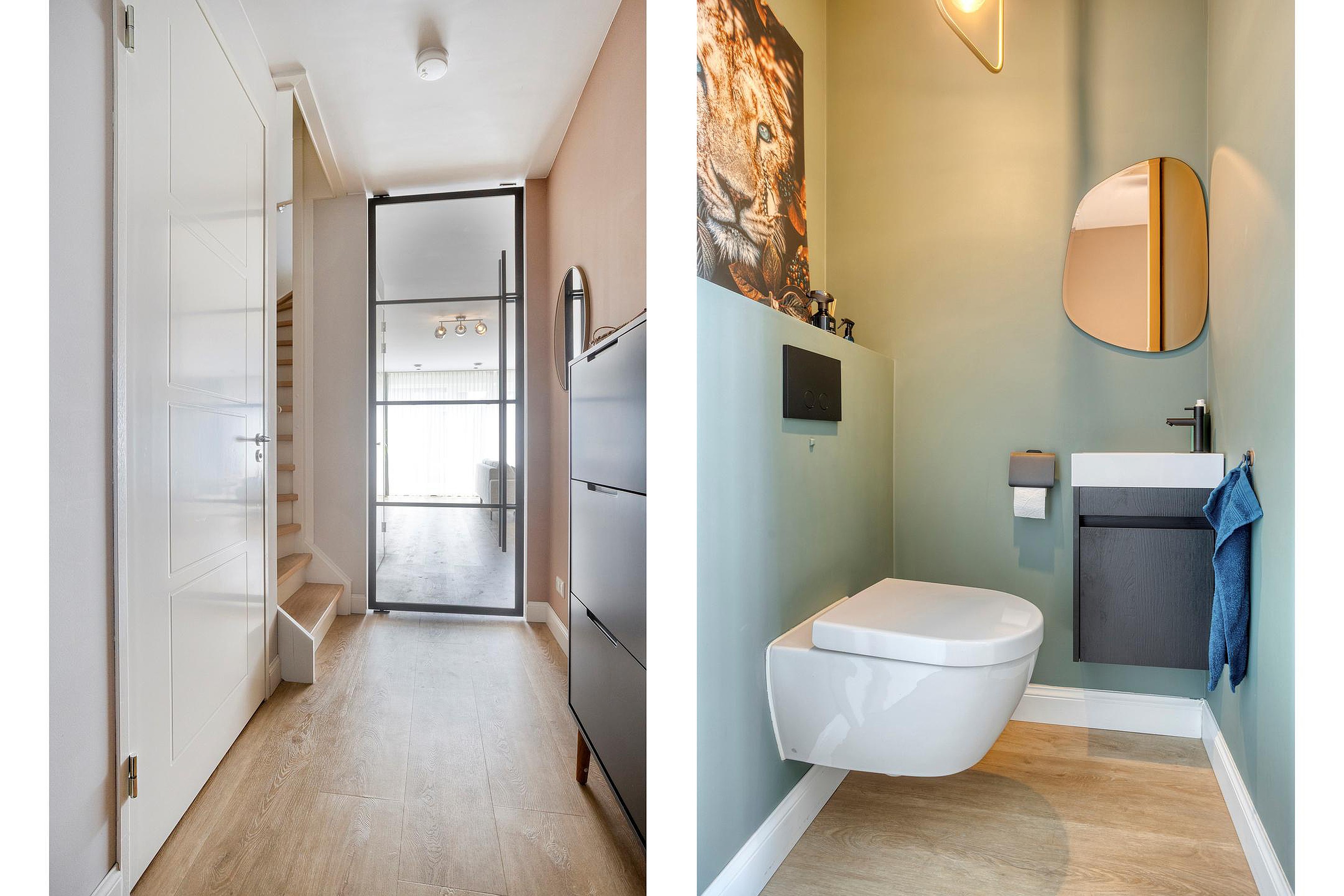 Vanuit de hal/entree met meterkast is er toegang tot het toilet, de trapopgang naar de eerste verdieping en de woonkamer met open keuken. De keuken is gelegen aan de voorzijde van de woning en is v.v. een wandopstelling en een kookeiland, diverse kasten en lades, een composiet werkblad met spoelbak en kokend waterkraan (Quooker), een inductiekookplaat met afzuiging (Bora), een koelkast (Liebherr), vriezer (Liebherr), vaatwasser (Siemens) en een combi stoomoven (Siemens). Het woongedeelte is aan de achterzijde van de woning gelegen en middels tuindeuren is de ruime achtertuin bereikbaar. De grote raampartijen zorgen voor een prettig zicht op de achtertuin. In de woonkamer is een trapkast aanwezig wat zorgt voor extra bergruimte. De vloer van de gehele begane grond is v.v. pvc met vloerverwarming en vloerkoeling. De wanden en plafonds zijn afgewerkt met stucwerk. De kozijnen zijn van hout met HR++ glas. Het toilet is v.v. een hangend toilet en fonteintje en de wanden zijn v.v. stucwerk.