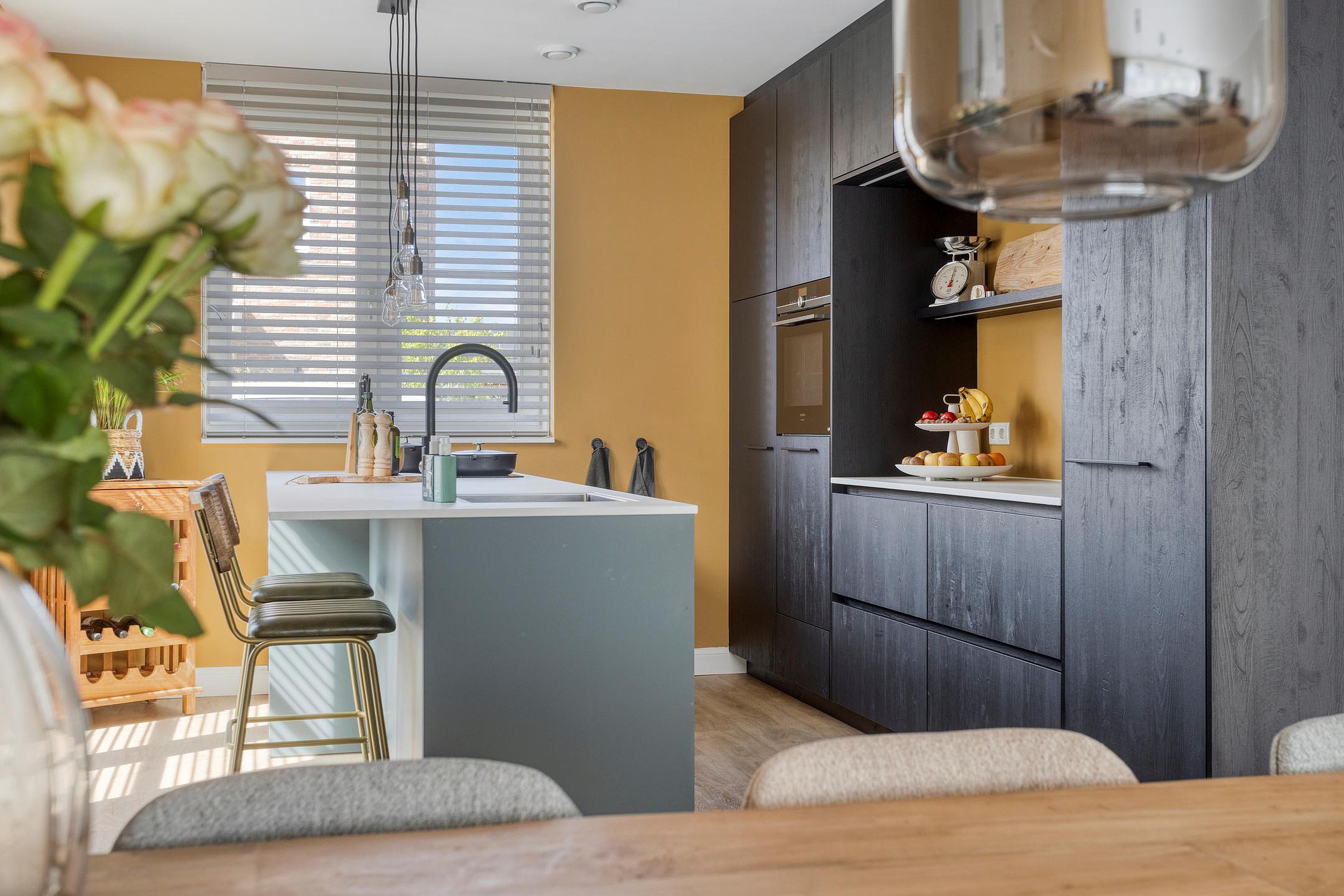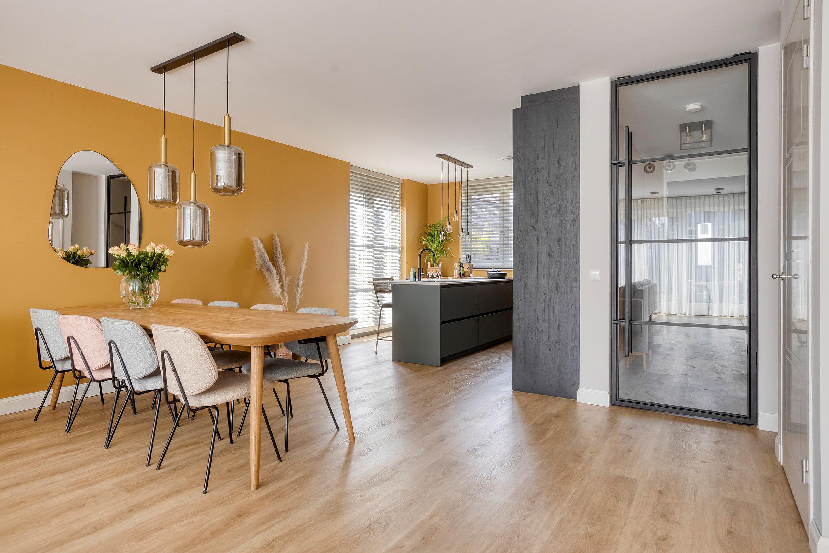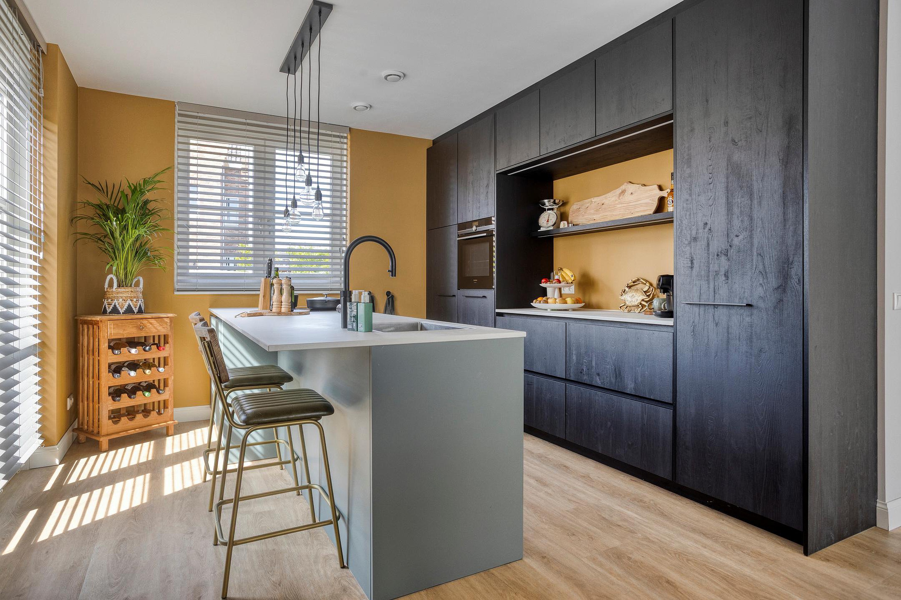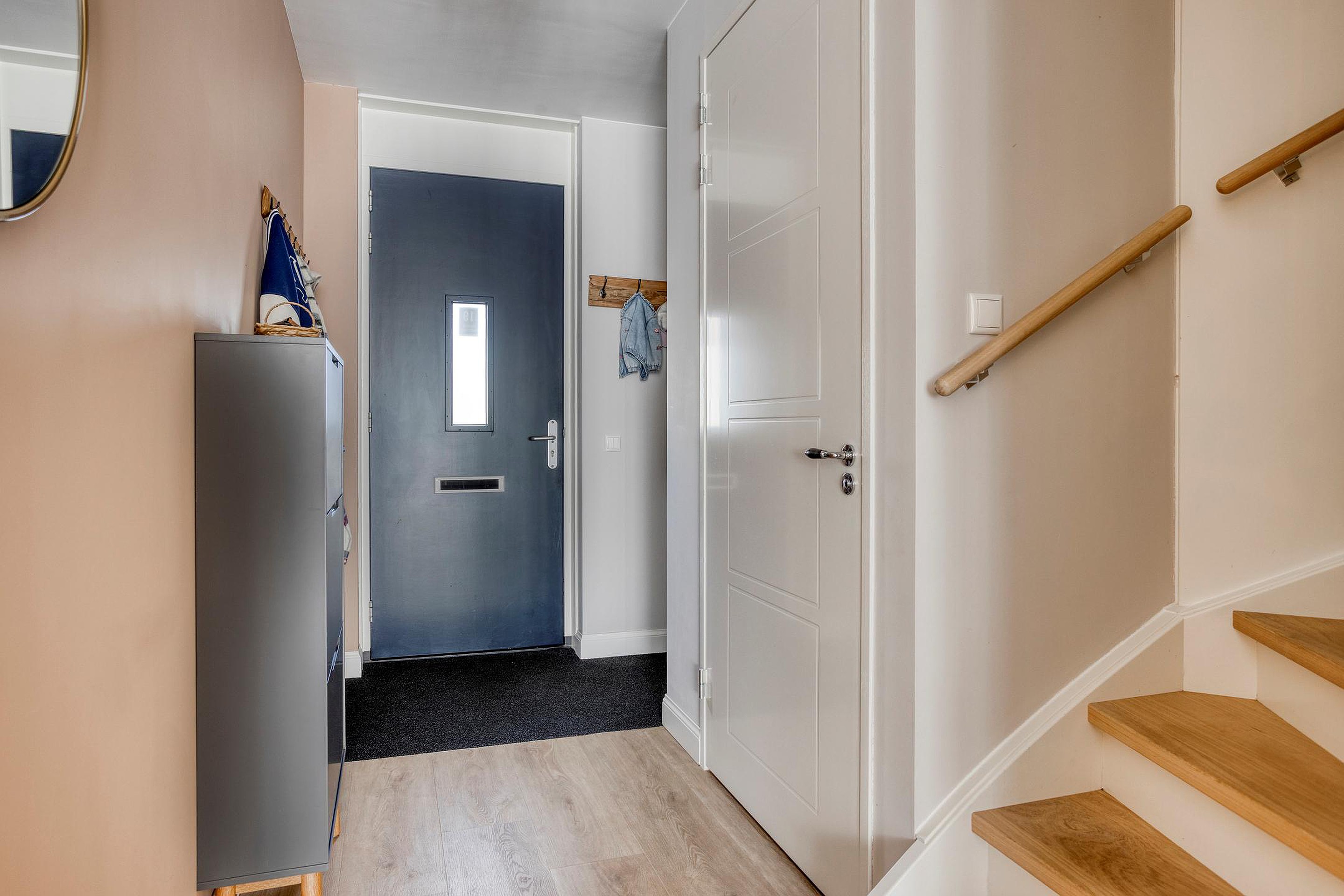 Vanuit de hal/entree met meterkast is er toegang tot het toilet, de trapopgang naar de eerste verdieping en de woonkamer met open keuken. De keuken is gelegen aan de voorzijde van de woning en is v.v. een wandopstelling en een kookeiland, diverse kasten en lades, een composiet werkblad met spoelbak en kokend waterkraan (Quooker), een inductiekookplaat met afzuiging (Bora), een koelkast (Liebherr), vriezer (Liebherr), vaatwasser (Siemens) en een combi stoomoven (Siemens). Het woongedeelte is aan de achterzijde van de woning gelegen en middels tuindeuren is de ruime achtertuin bereikbaar. De grote raampartijen zorgen voor een prettig zicht op de achtertuin. In de woonkamer is een trapkast aanwezig wat zorgt voor extra bergruimte. De vloer van de gehele begane grond is v.v. pvc met vloerverwarming en vloerkoeling. De wanden en plafonds zijn afgewerkt met stucwerk. De kozijnen zijn van hout met HR++ glas. Het toilet is v.v. een hangend toilet en fonteintje en de wanden zijn v.v. stucwerk.