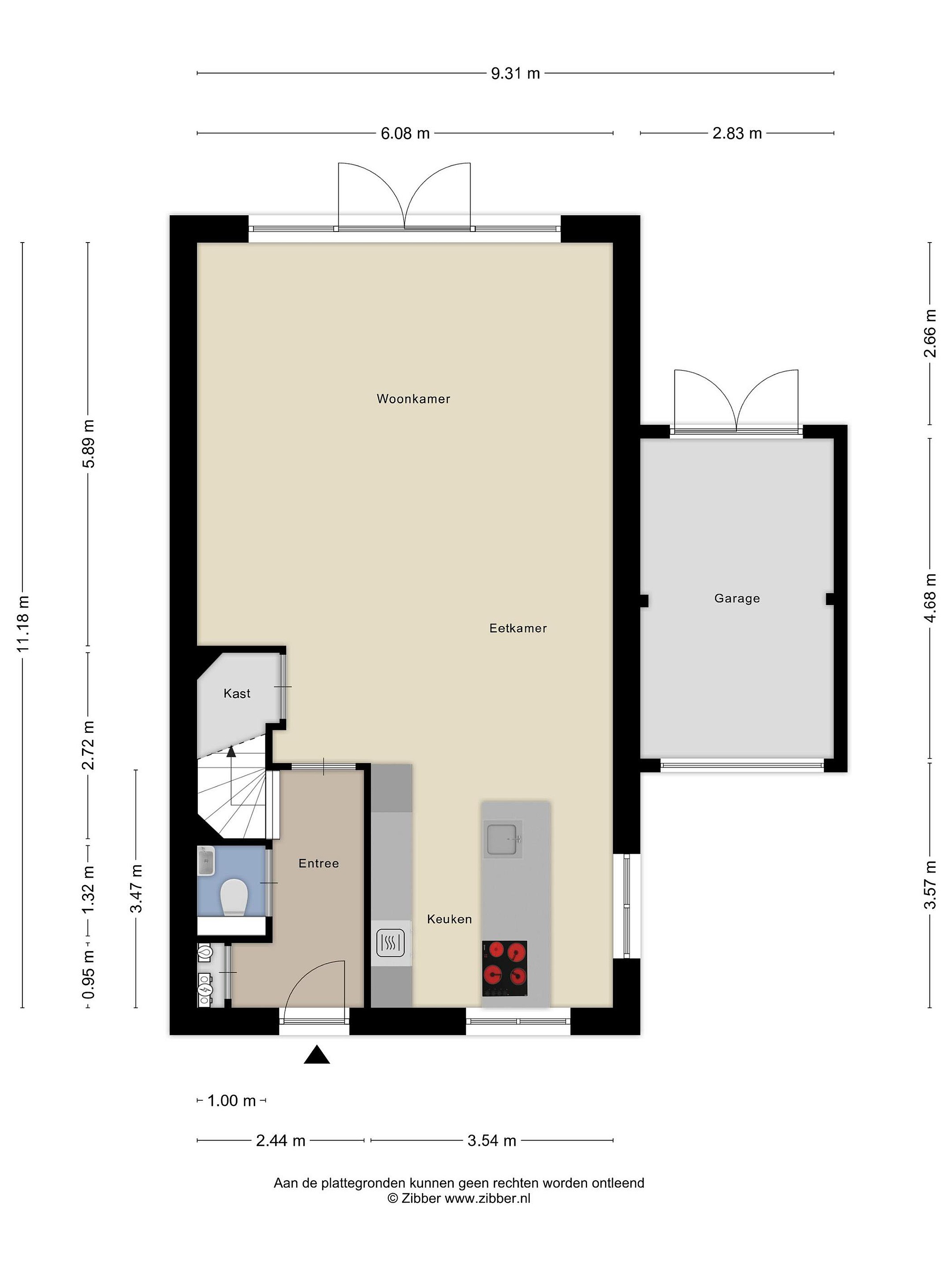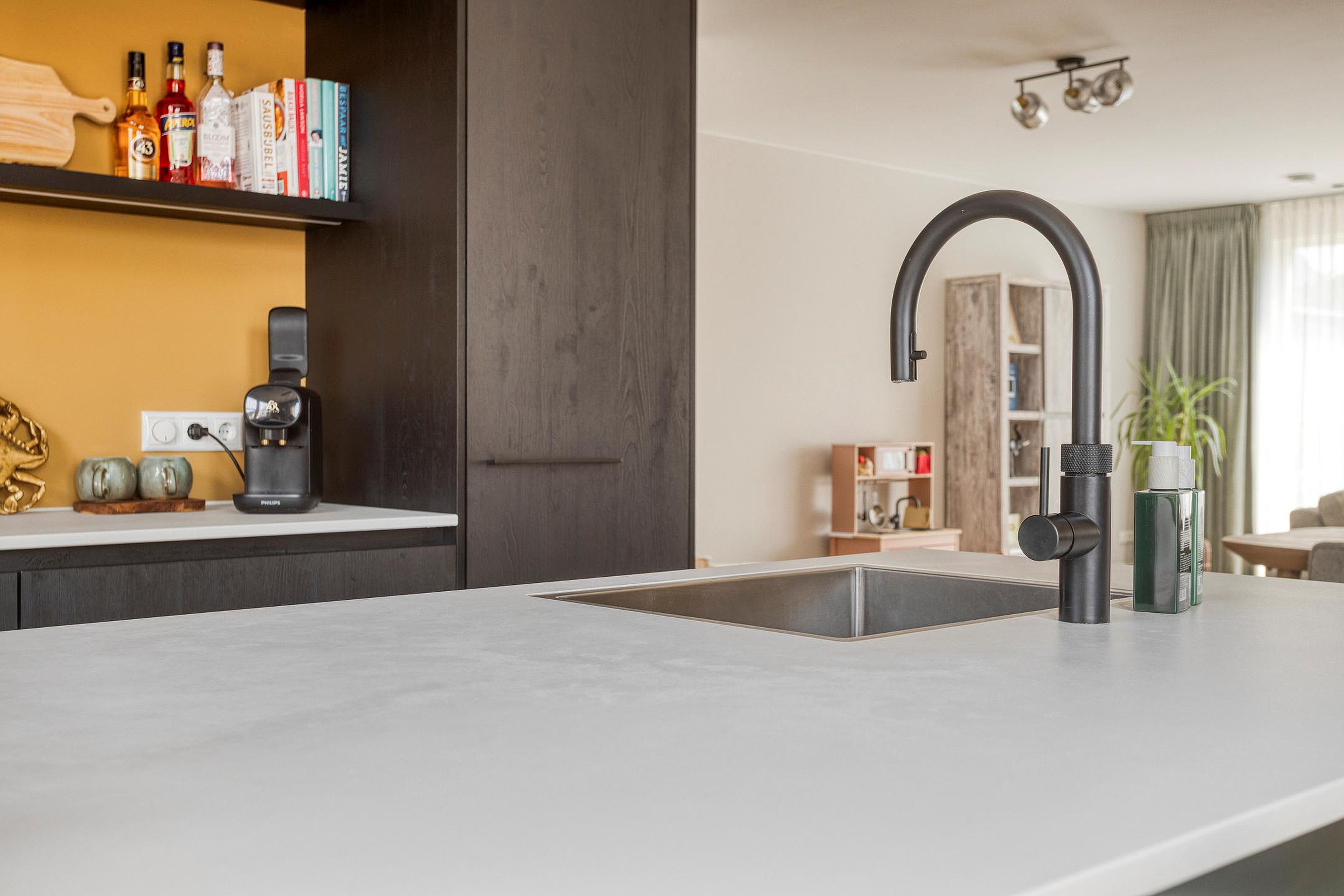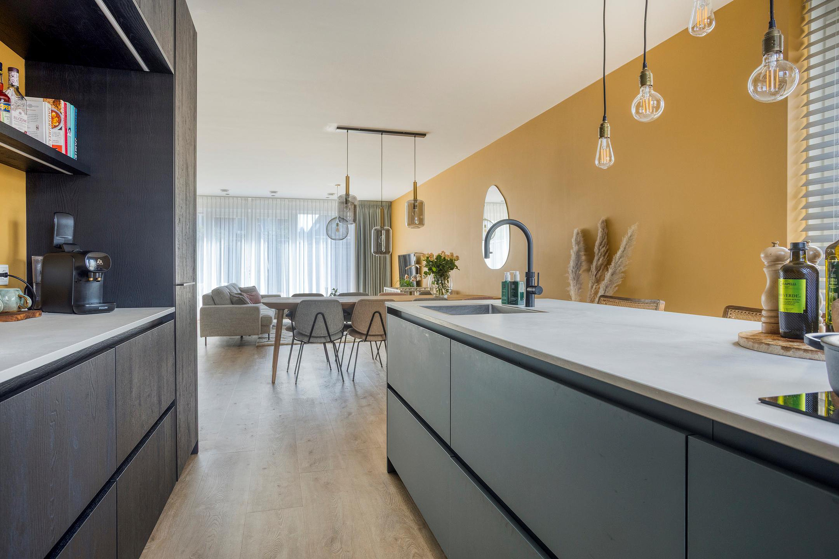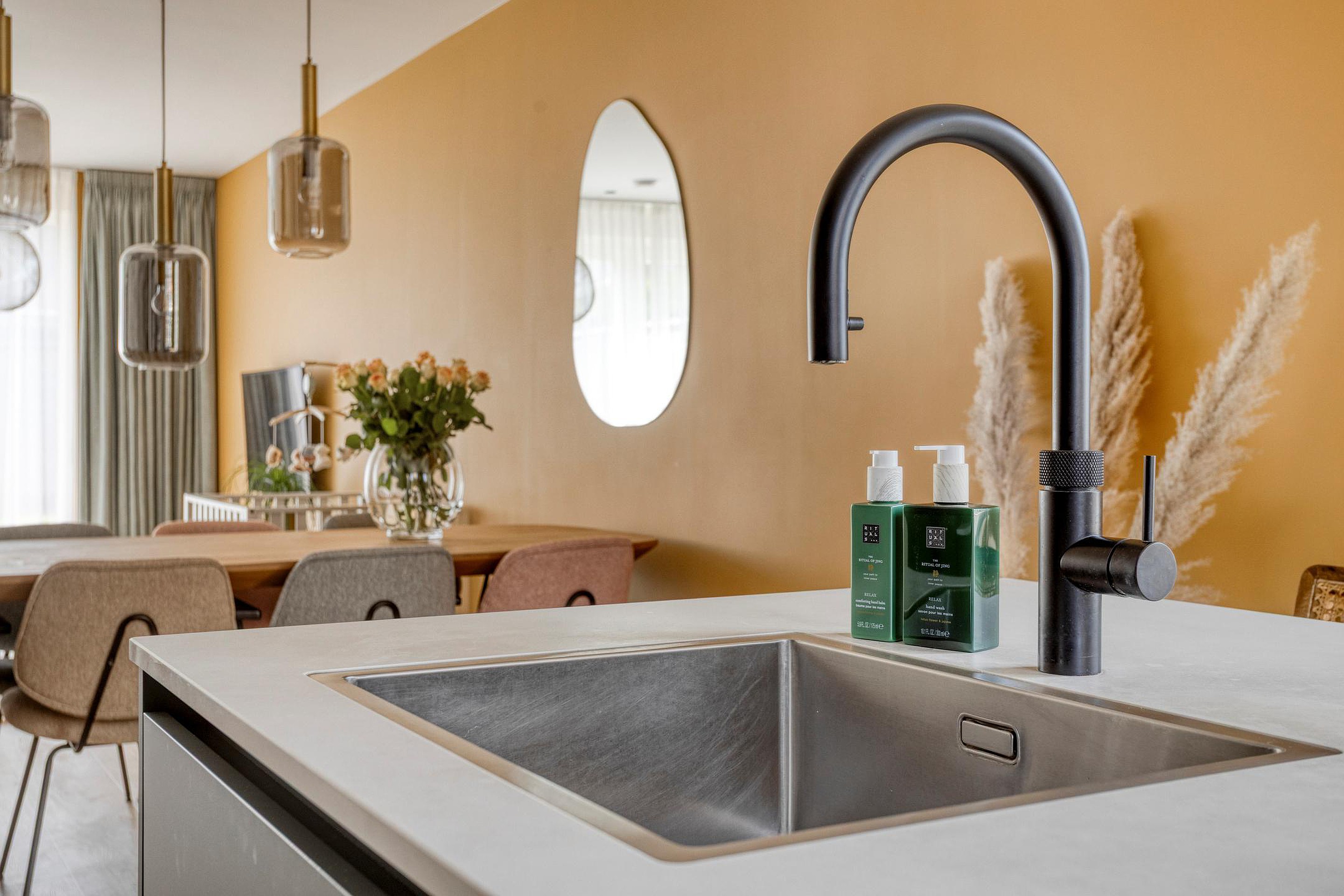 Vanuit de hal/entree met meterkast is er toegang tot het toilet, de trapopgang naar de eerste verdieping en de woonkamer met open keuken. De keuken is gelegen aan de voorzijde van de woning en is v.v. een wandopstelling en een kookeiland, diverse kasten en lades, een composiet werkblad met spoelbak en kokend waterkraan (Quooker), een inductiekookplaat met afzuiging (Bora), een koelkast (Liebherr), vriezer (Liebherr), vaatwasser (Siemens) en een combi stoomoven (Siemens). Het woongedeelte is aan de achterzijde van de woning gelegen en middels tuindeuren is de ruime achtertuin bereikbaar. De grote raampartijen zorgen voor een prettig zicht op de achtertuin. In de woonkamer is een trapkast aanwezig wat zorgt voor extra bergruimte. De vloer van de gehele begane grond is v.v. pvc met vloerverwarming en vloerkoeling. De wanden en plafonds zijn afgewerkt met stucwerk. De kozijnen zijn van hout met HR++ glas. Het toilet is v.v. een hangend toilet en fonteintje en de wanden zijn v.v. stucwerk.