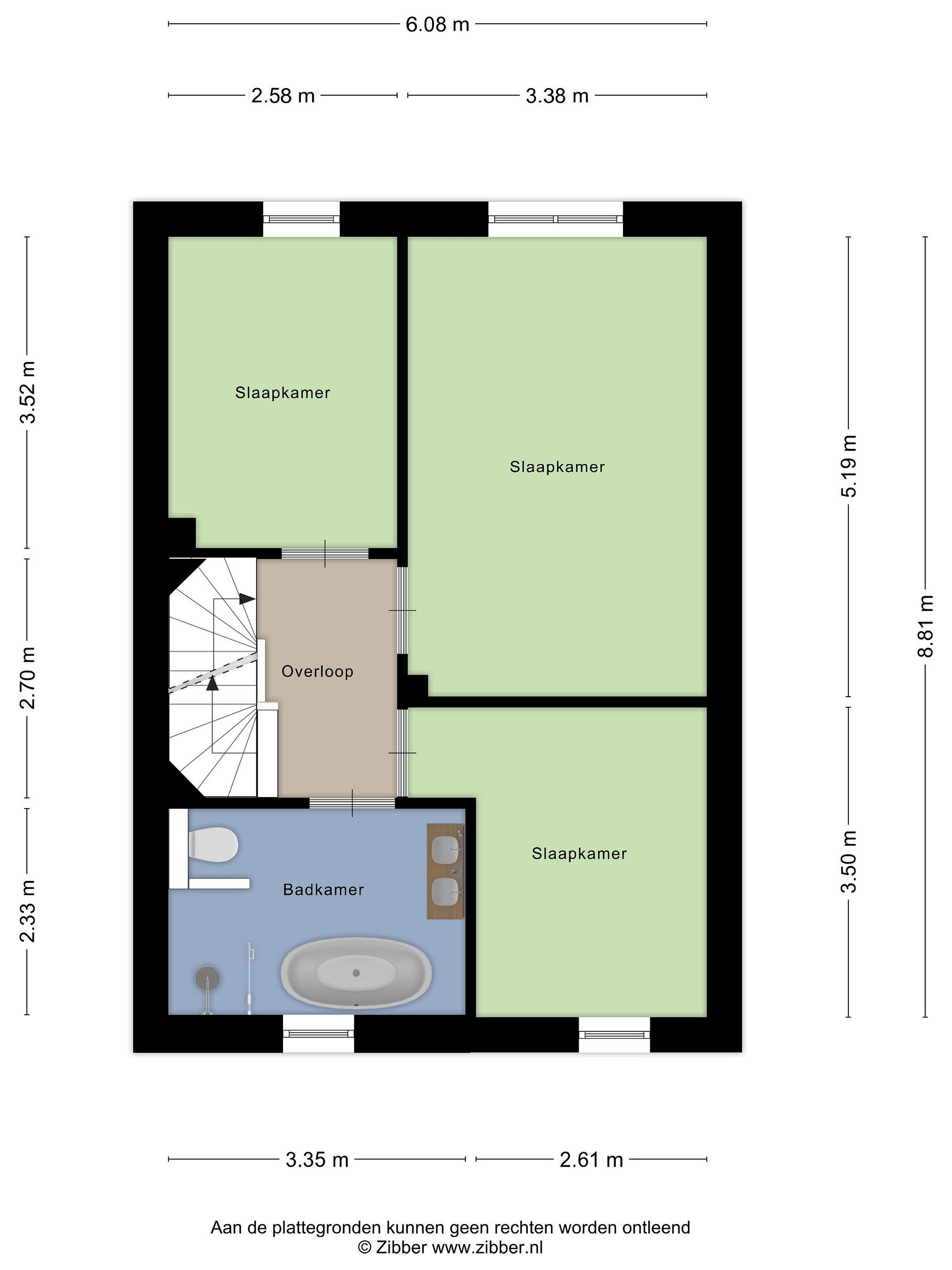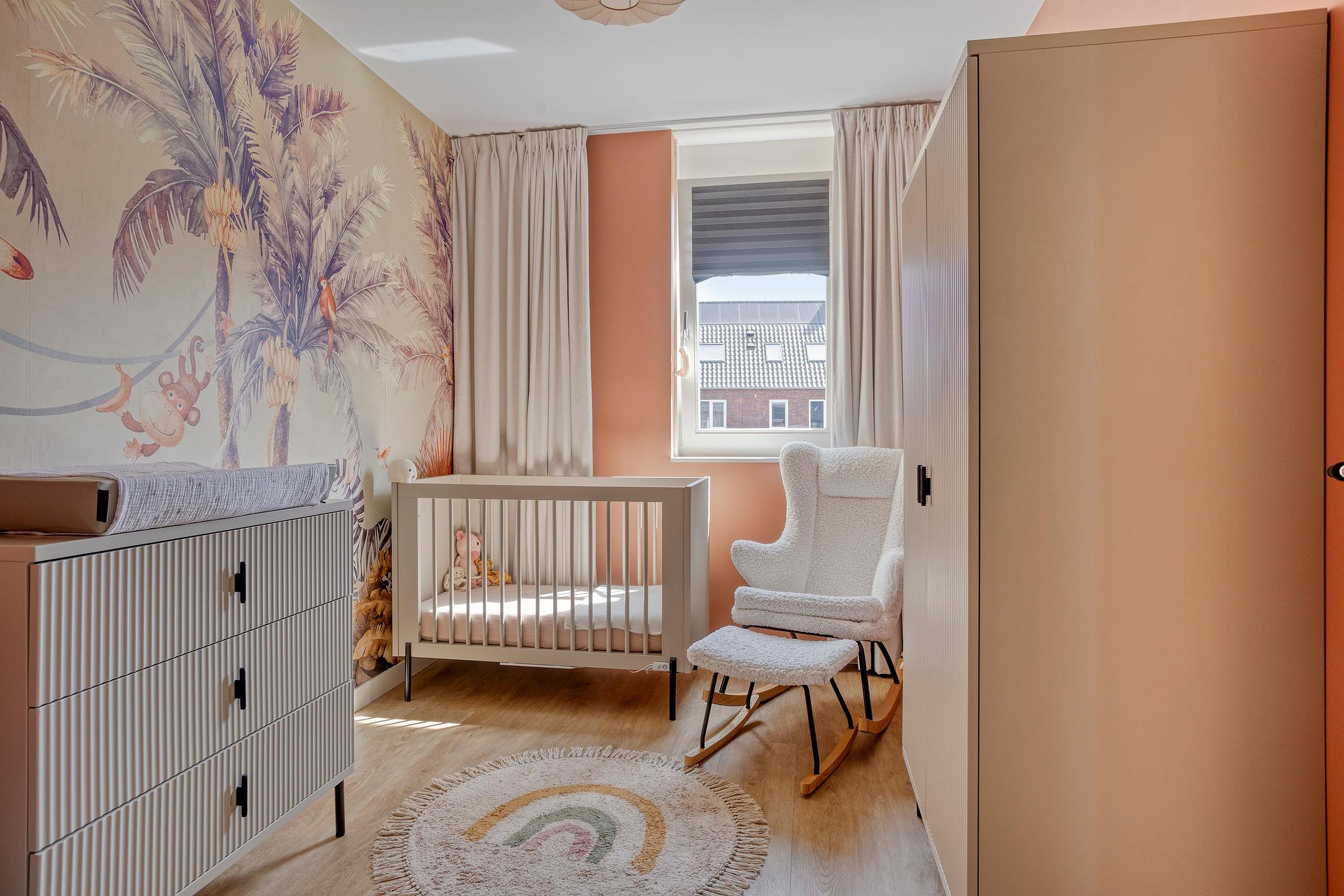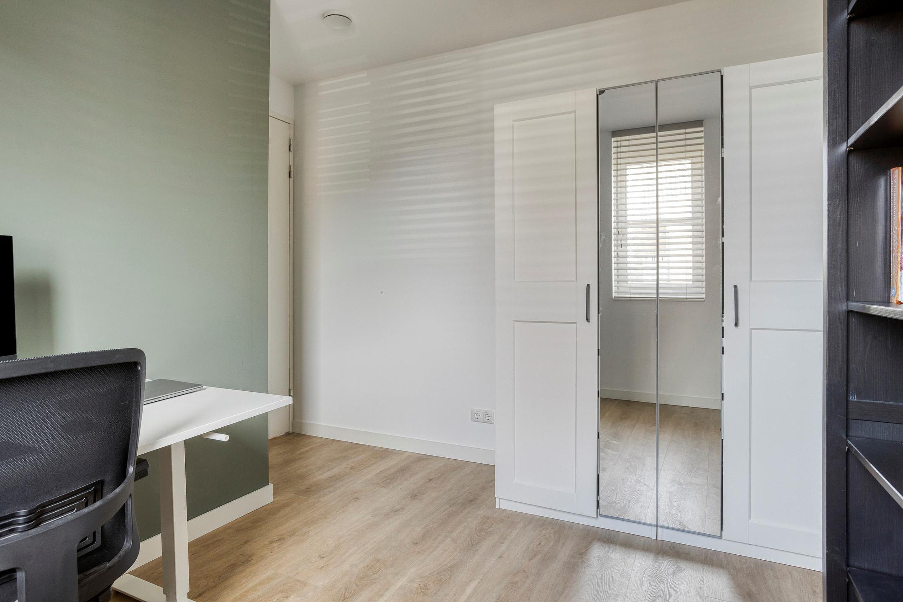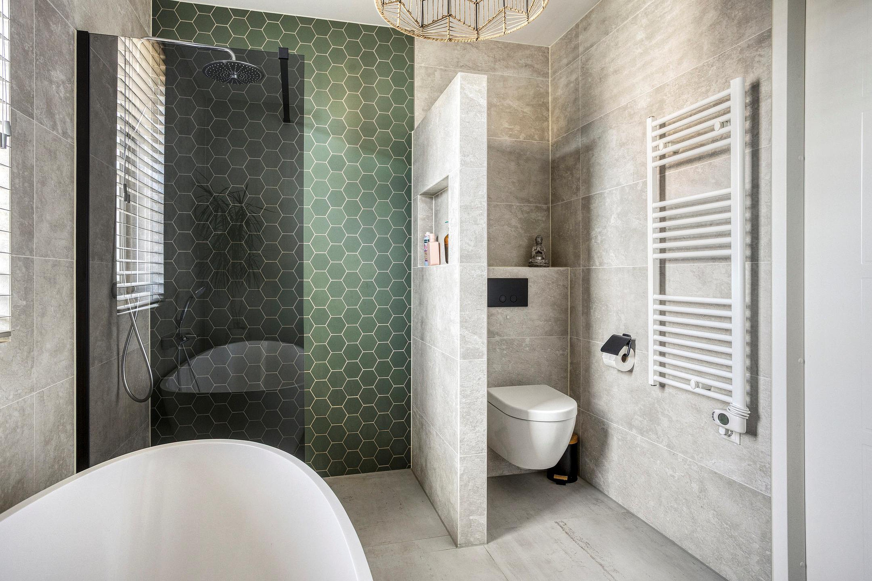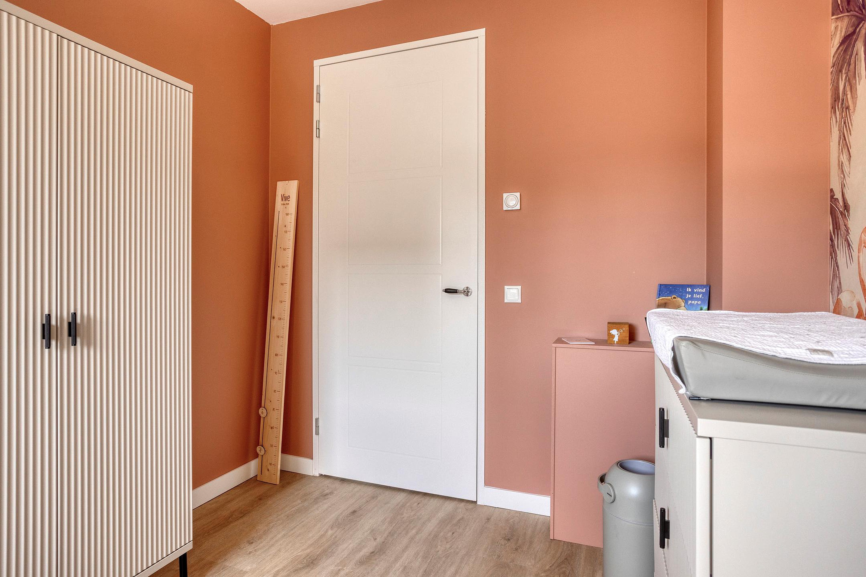 Vanuit de overloop zijn 3 slaapkamers, de badkamer en de trapopgang naar de tweede verdieping bereikbaar. De badkamer is geheel betegeld en v.v. een hangend toilet, een inloopdouche, dubbele wastafel met meubel, ligbad en een designradiator. De vloer van de overloop en de slaapkamers is v.v. pvc met vloerverwarming en vloerkoeling. De wanden zijn afgewerkt met stucwerk en behang. De plafonds zijn eveneens v.v. stucwerk.