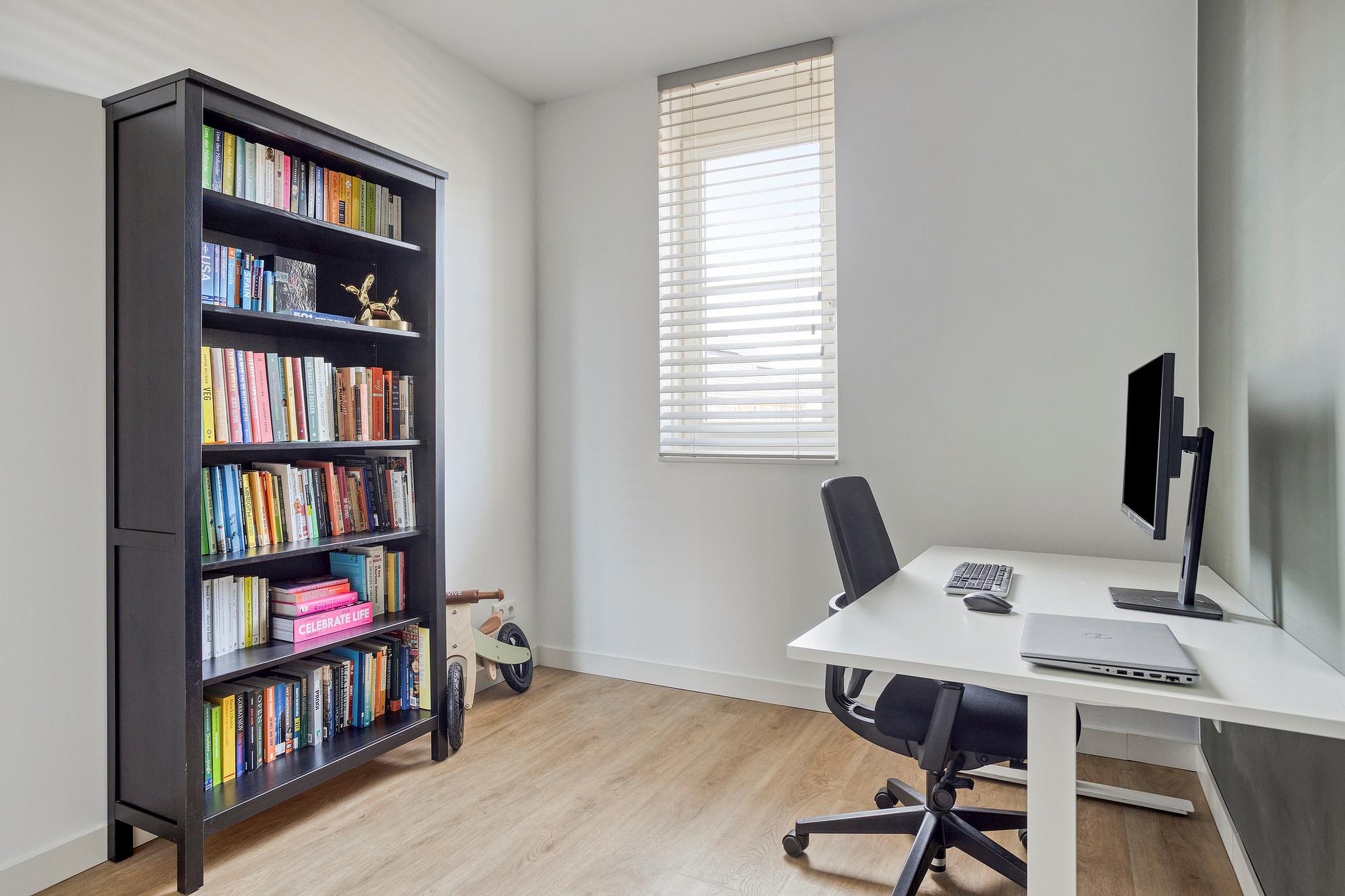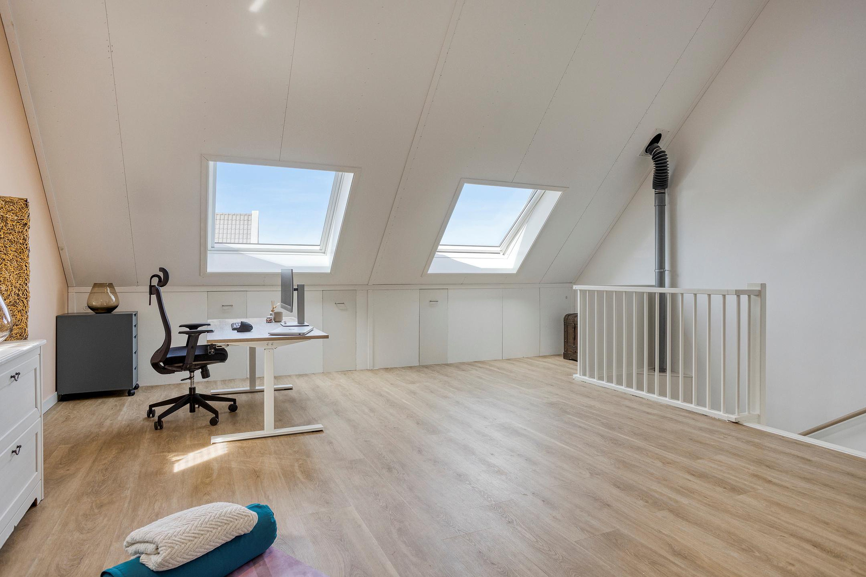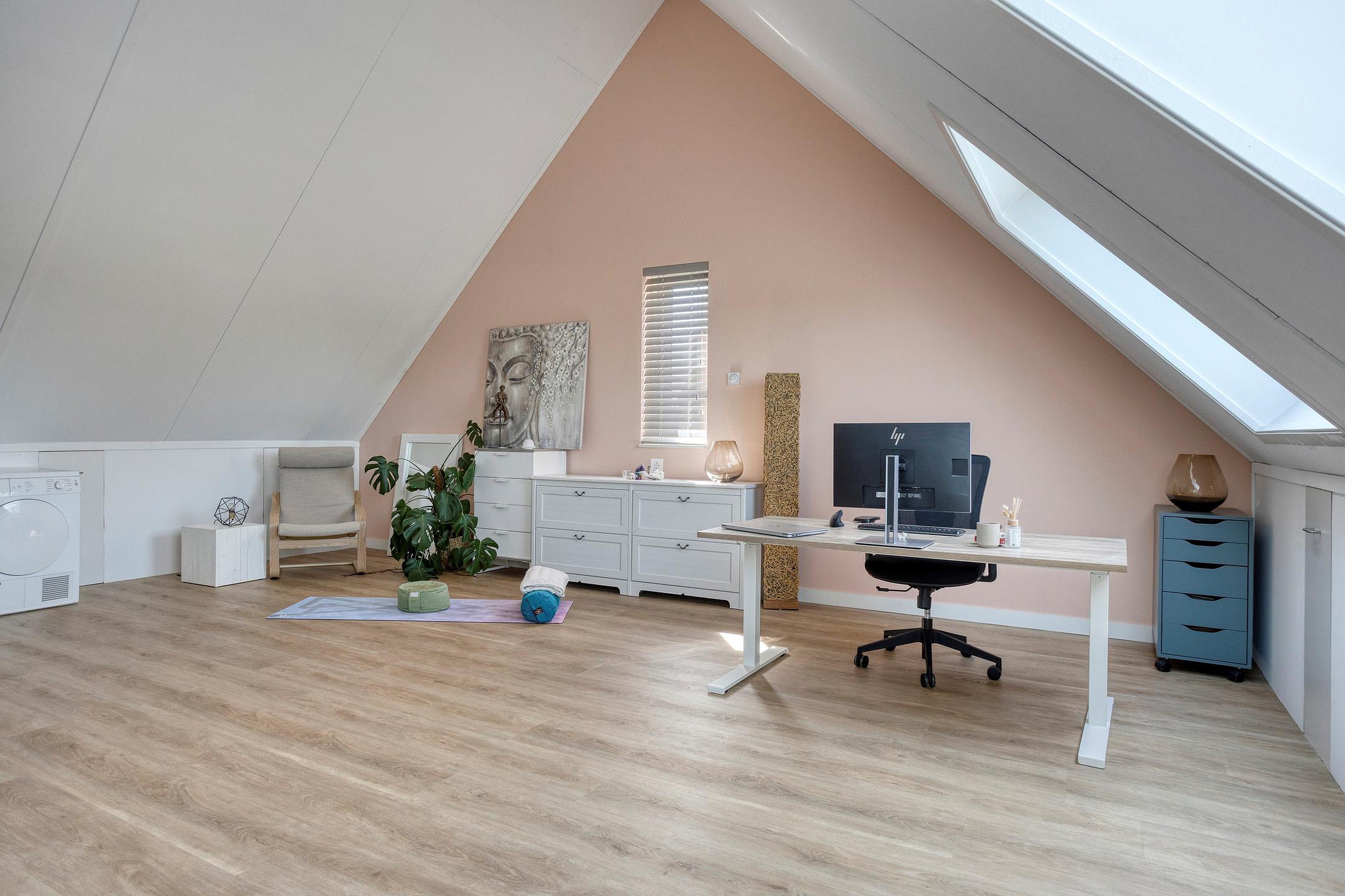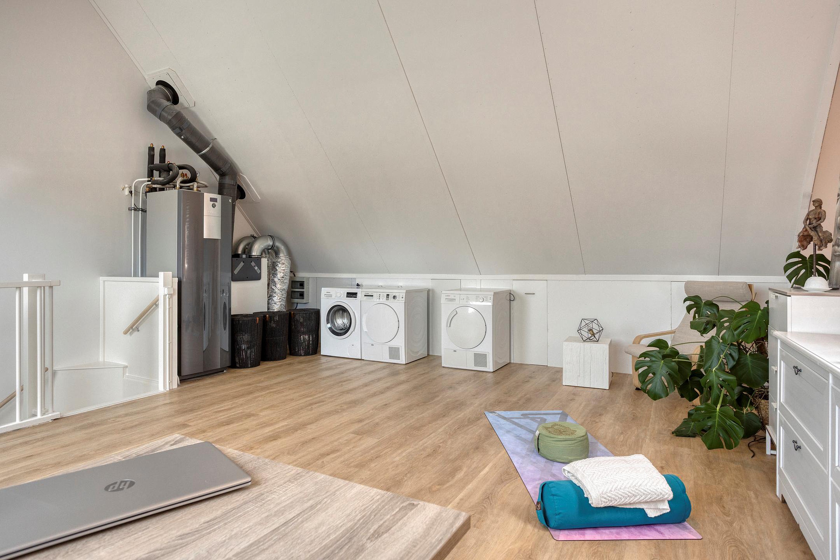 Op deze ruime open zolderruimte zijn de warmtepompinstallatie, de WTW-installatie en de aansluiting voor de wasmachine en droger gesitueerd. De vloer op deze verdieping is afgewerkt met pvc met vloerverwarming en vloerkoeling. De wanden zijn afgewerkt met stucwerk.