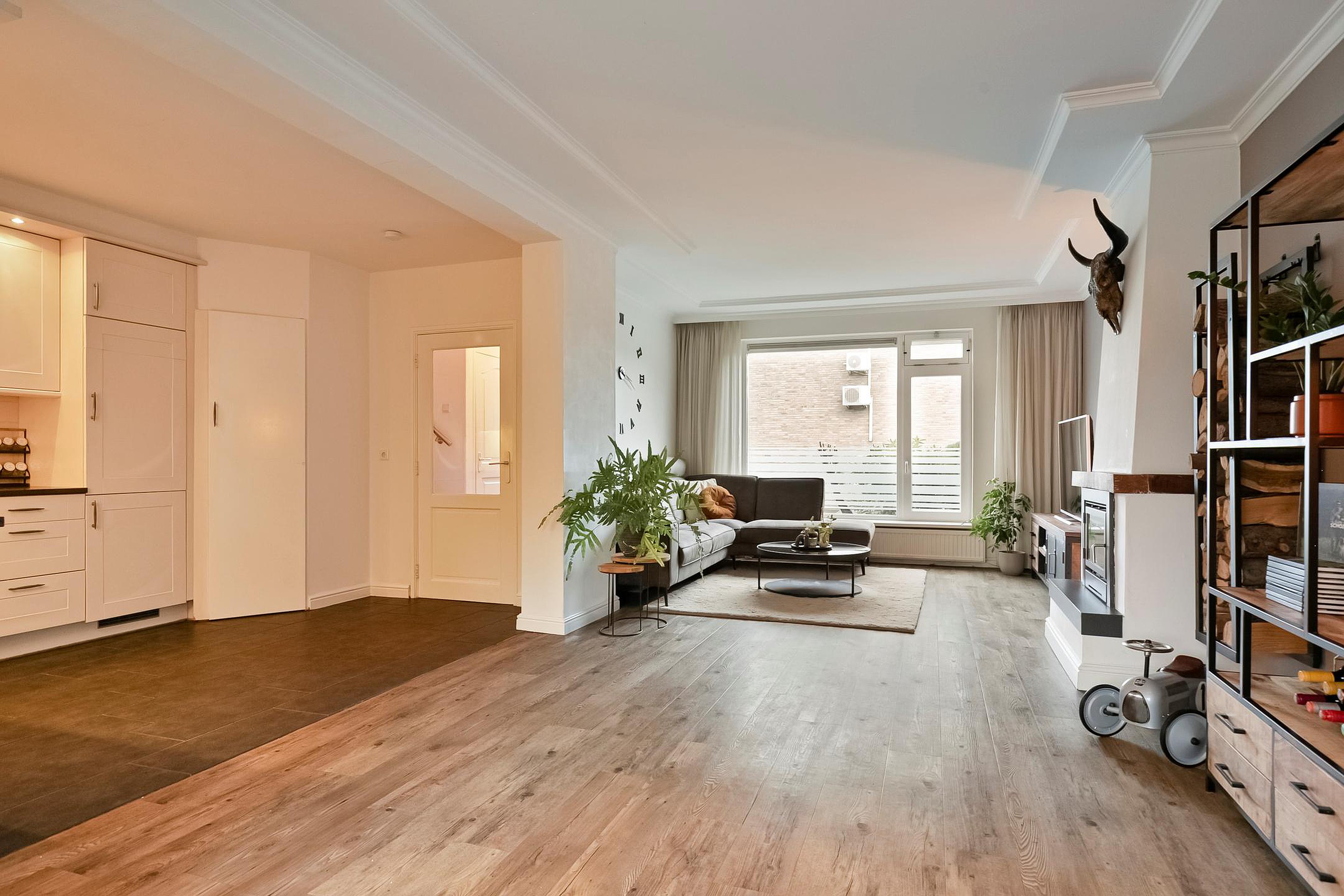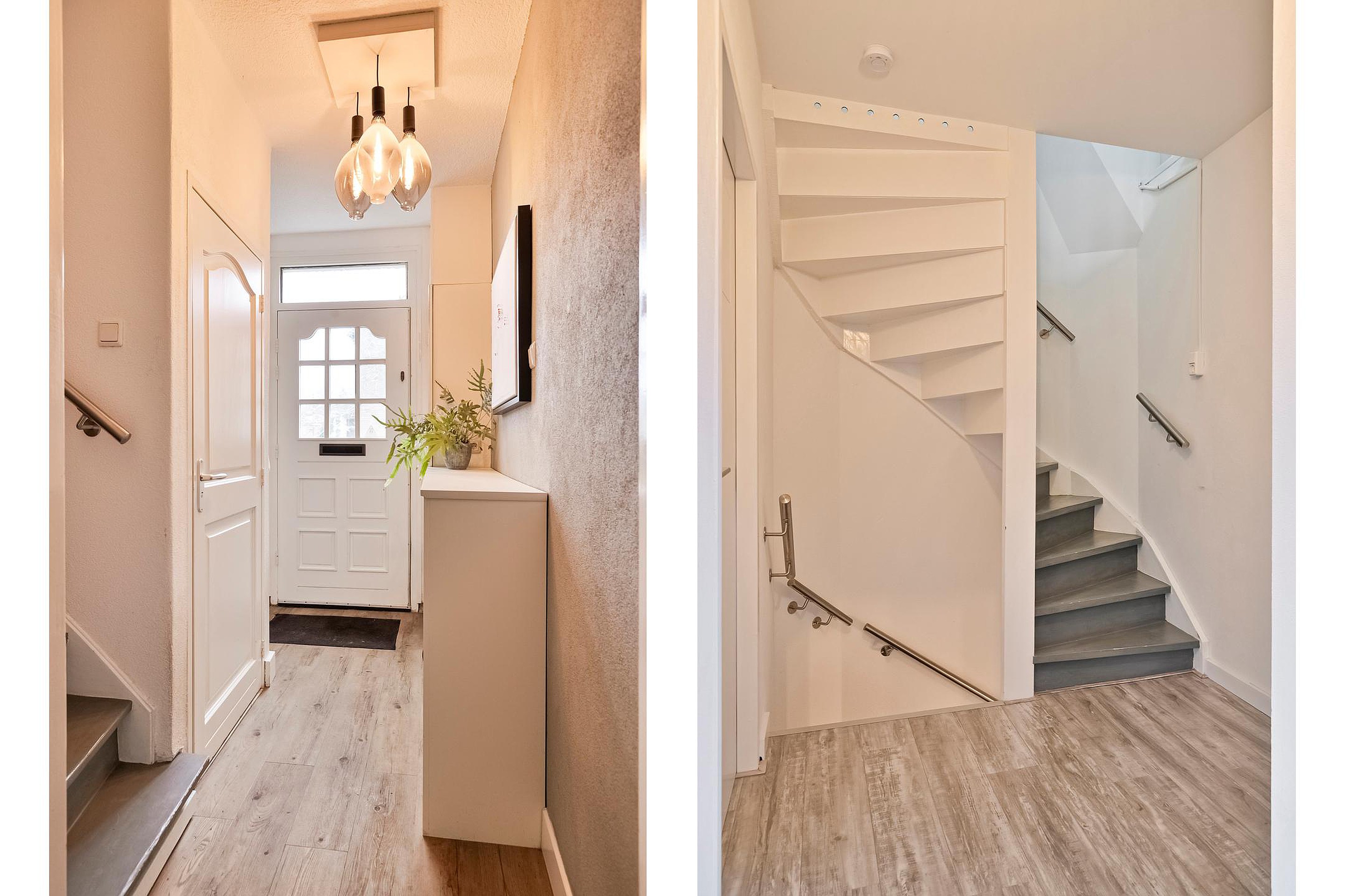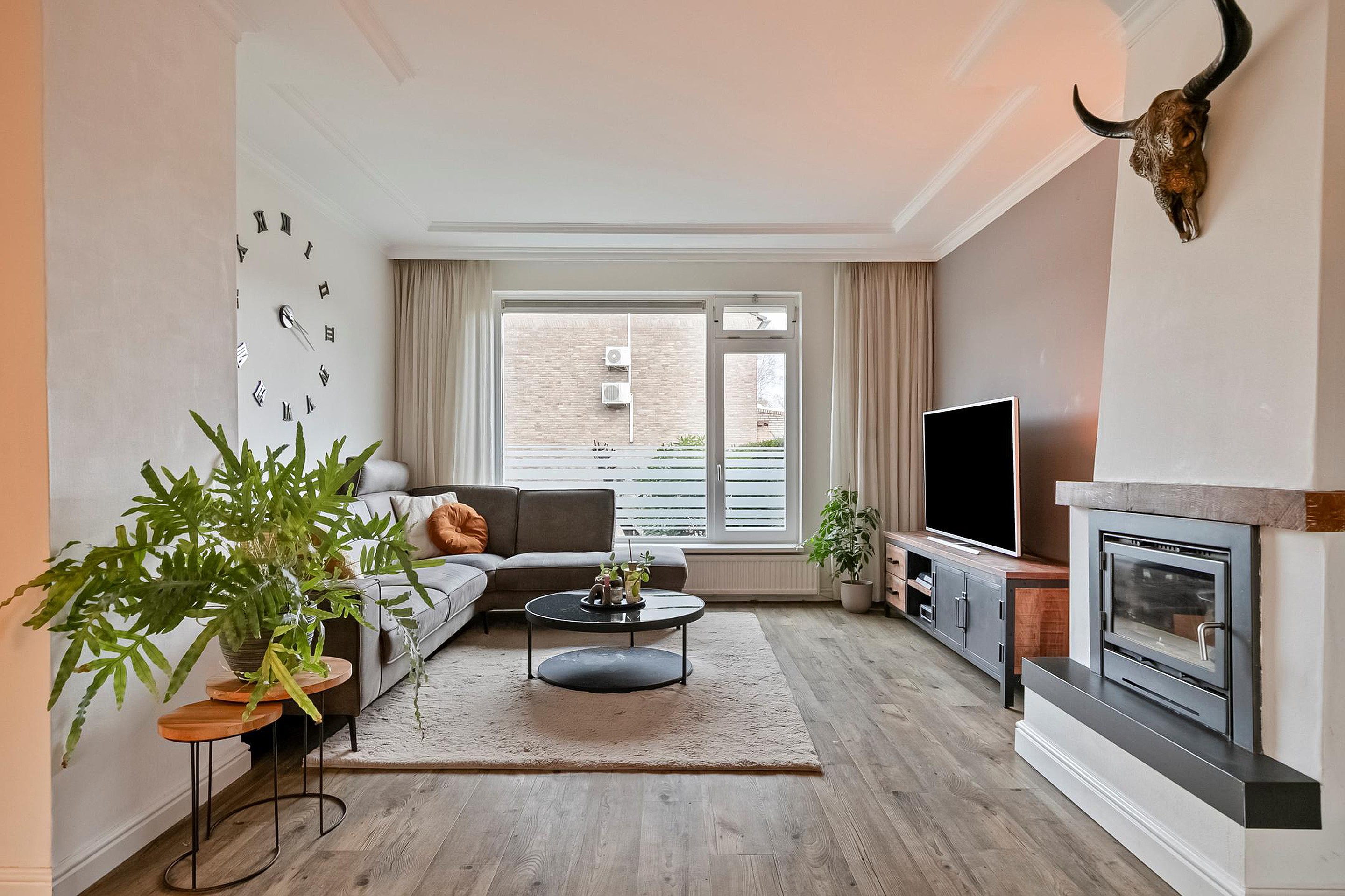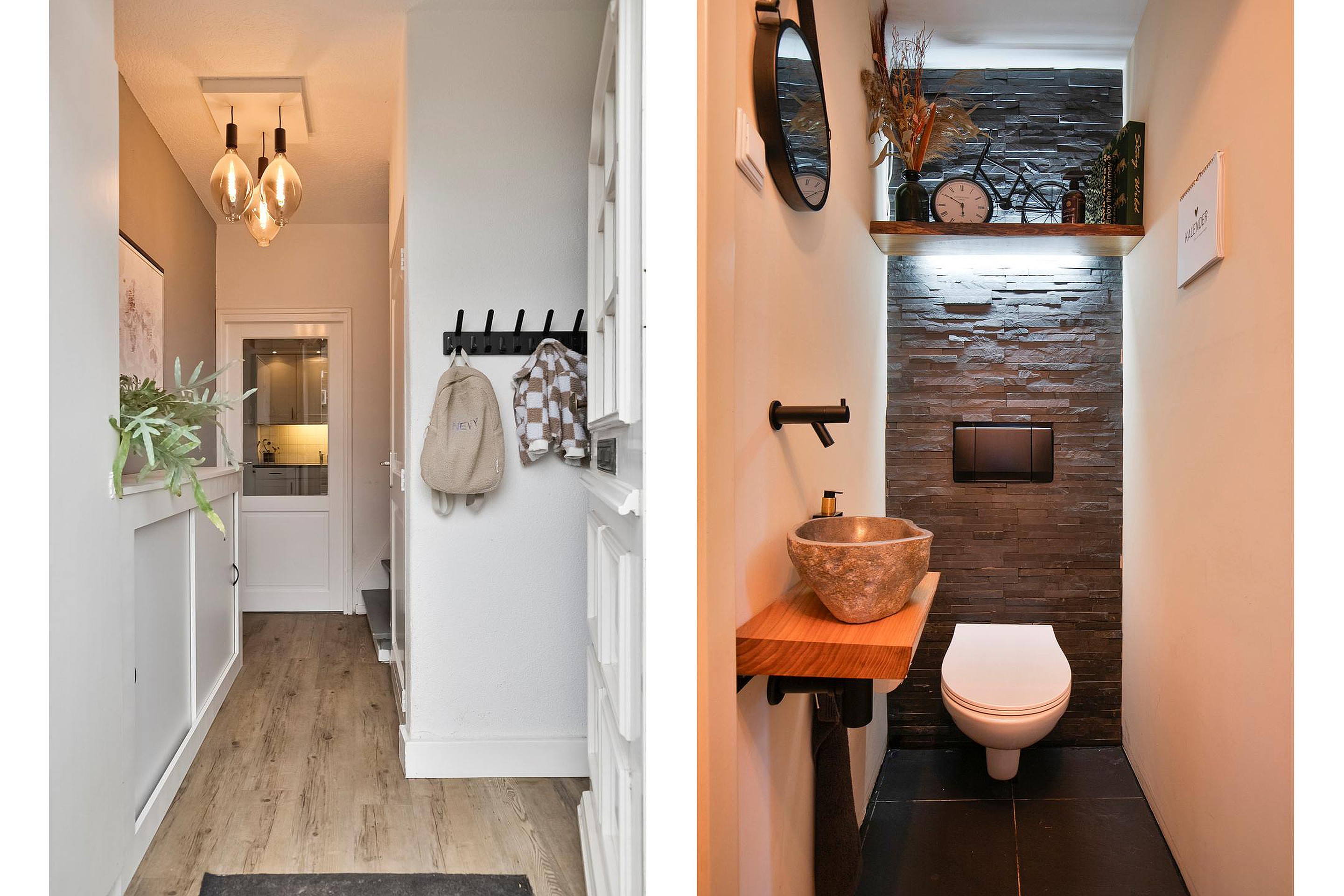 Vanuit de hal/entree met meterkast is er toegang tot het toilet, de trapopgang naar de eerste verdieping en de keuken en woonkamer. In de woonkamer is een sfeervolle houtkachel aanwezig. Vanuit de woonkamer is middels openslaande deuren een tuin/eetkamer bereikbaar. Vanuit deze ruimte is er een schuifpui zowel naar het overdekte terras als naar de achtertuin. De keuken in L-vorm is v.v. diverse kasten en lades, een granieten werkblad met spoelbak en mengkraan, een 4-pits gaskookplaat, afzuigkap, oven (bj.2020), koel-vries combinatie (bj.2020) en een vaatwasser (Miele). De vloer van de begane grond is afgewerkt met pvc (m.u.v. de vloer in de keuken welke is v.v. tegels). Het toilet is deels betegeld en v.v. een hangend toilet en fonteintje. De wanden zijn afgewerkt met stucwerk en behang. De plafonds zijn afgewerkt met stucwerk. De kozijnen zijn van hout en grotendeels v.v. HR++ glas. Het raam aan de voorkant van de woning is v.v. een elektrisch rolluik welke middels een tijdschakelaar te beheren is.