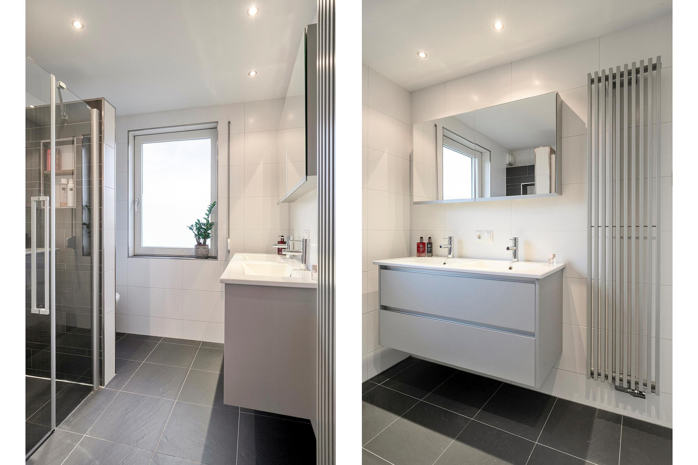 Vanuit de overloop is er toegang tot 3 slaapkamers, een badkamer en de trapopgang naar de tweede verdieping. De badkamer is geheel betegeld en v.v. een hangend toilet, een douchecabine met regendouche en een dubbele wastafel met meubel.