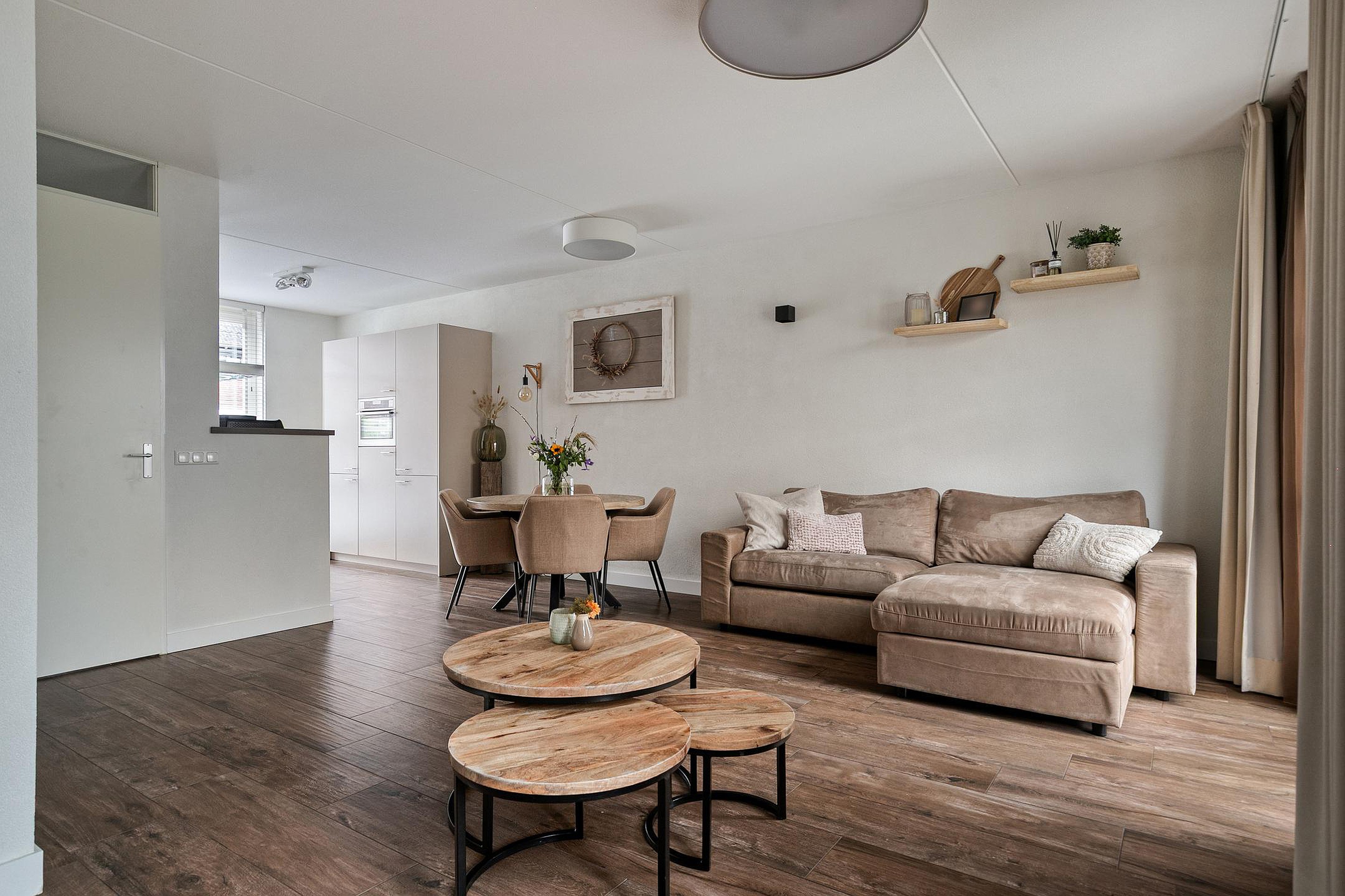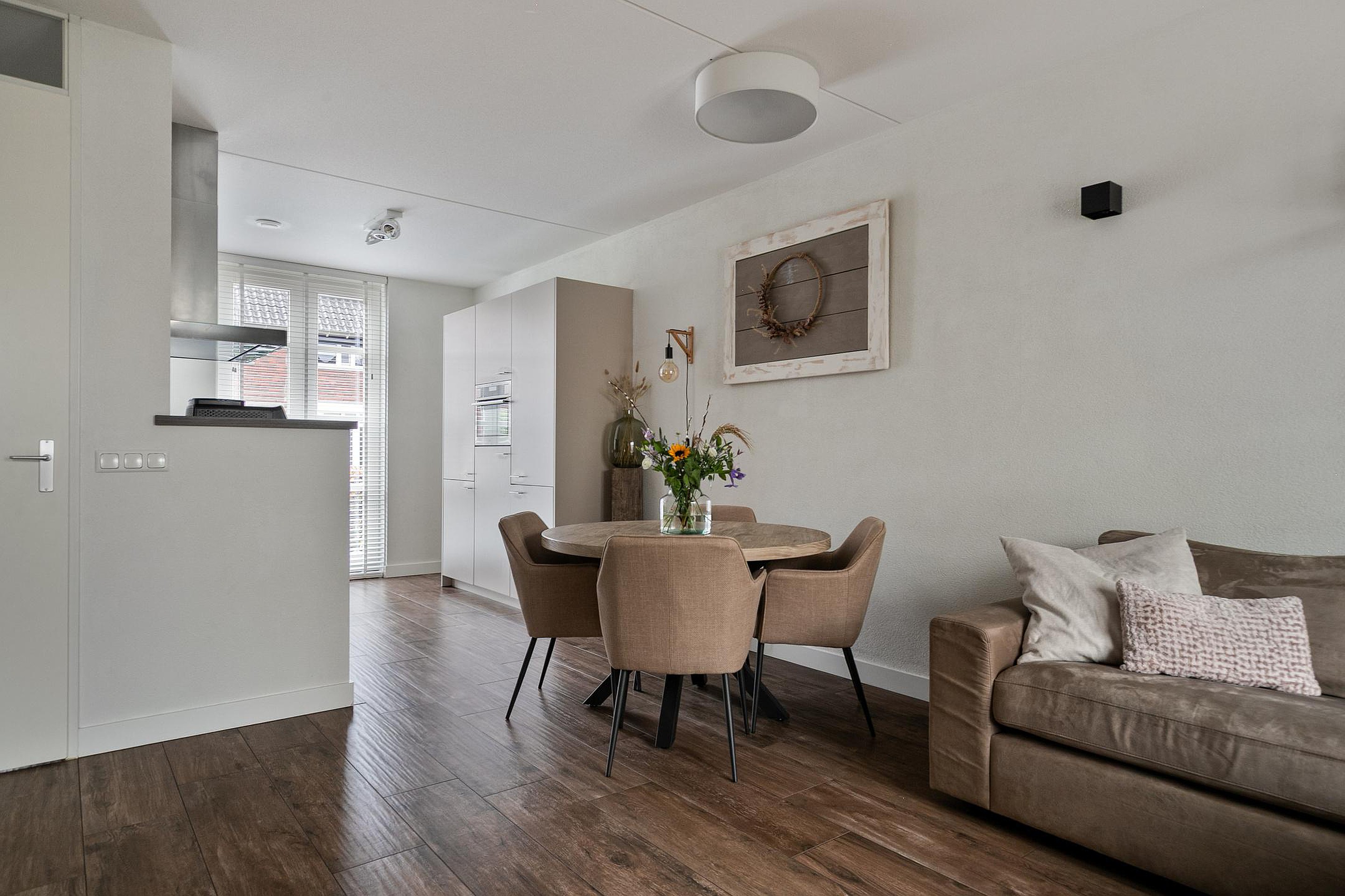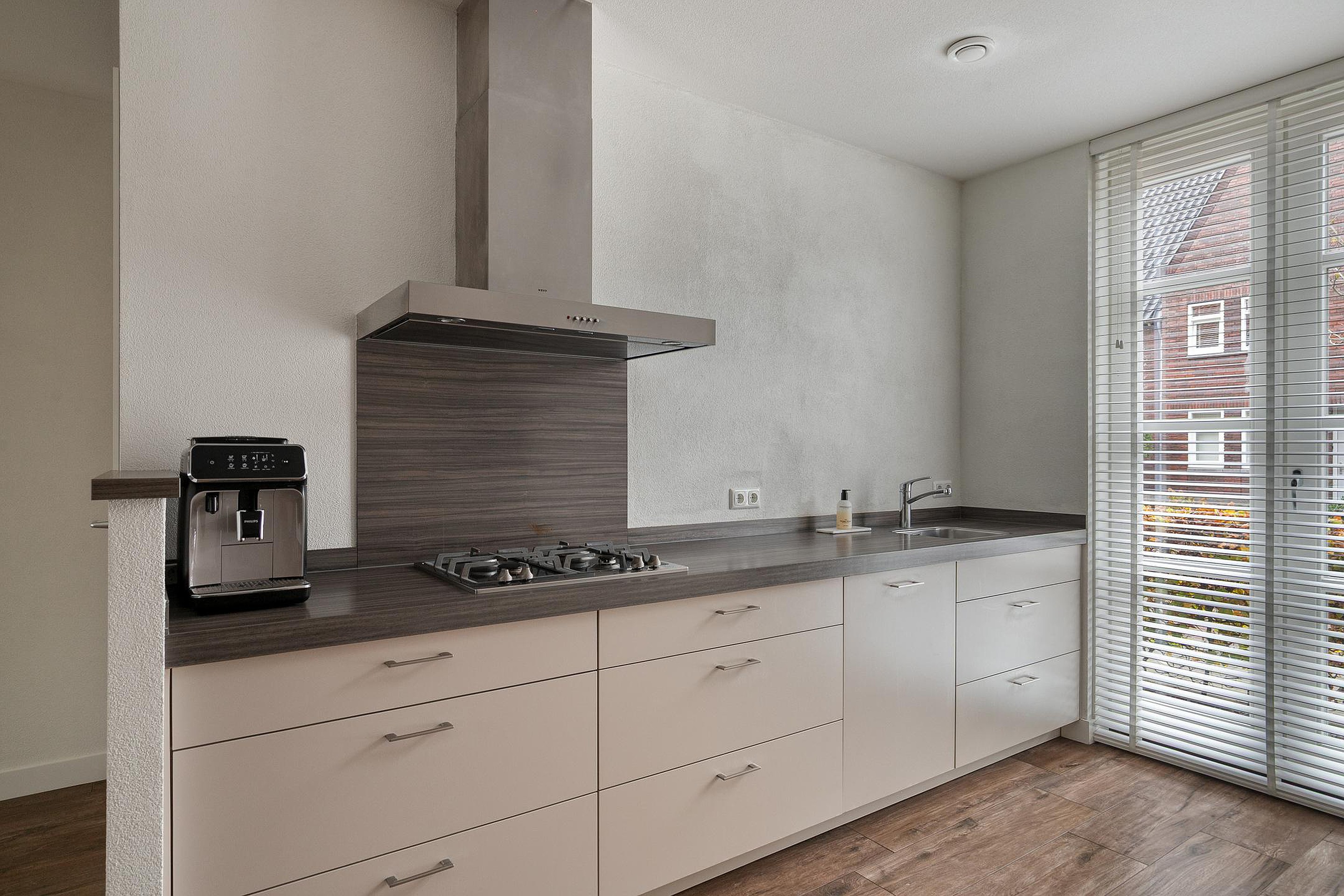 Vanuit de hal/entree met meterkast is er toegang tot het toilet, de woonkamer met open keuken en een trapopgang naar de eerste verdieping. De keuken in rechte opstelling en wandkast is v.v. diverse kasten en lades, een kunststof werkblad met spoelbak en mengkraan, 4-pits gaskookplaat (AEG), afzuigkap (Novy), combimagnetron (AEG), een koel-vriescombinatie (Liebherr) en een vaatwasser (Siemens). Het woongedeelte is aan de achterzijde van de woning gelegen en middels openslaande tuindeuren en een enkele achterdeur is er toegang tot de tuin. De achterdeur is v.v. een hor. De vloer van de begane grond is v.v. tegels en vloerverwarming. De wanden zijn afgewerkt met spachtelputz. De plafonds zijn v.v. spuitwerk. De kozijnen zijn van hout en v.v. HR++ glas. Het toilet is geheel betegeld en v.v. een hangend toilet en fonteintje.