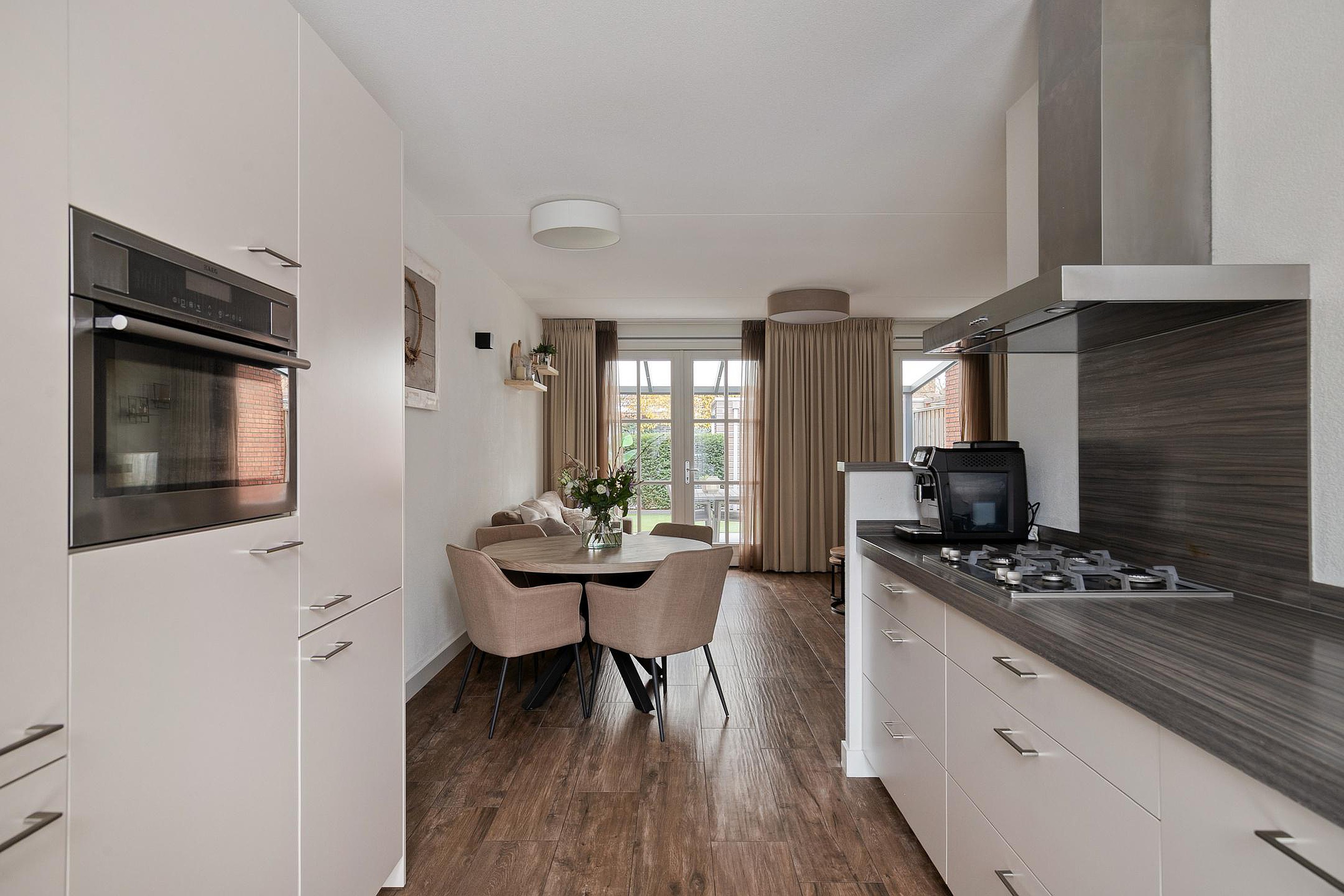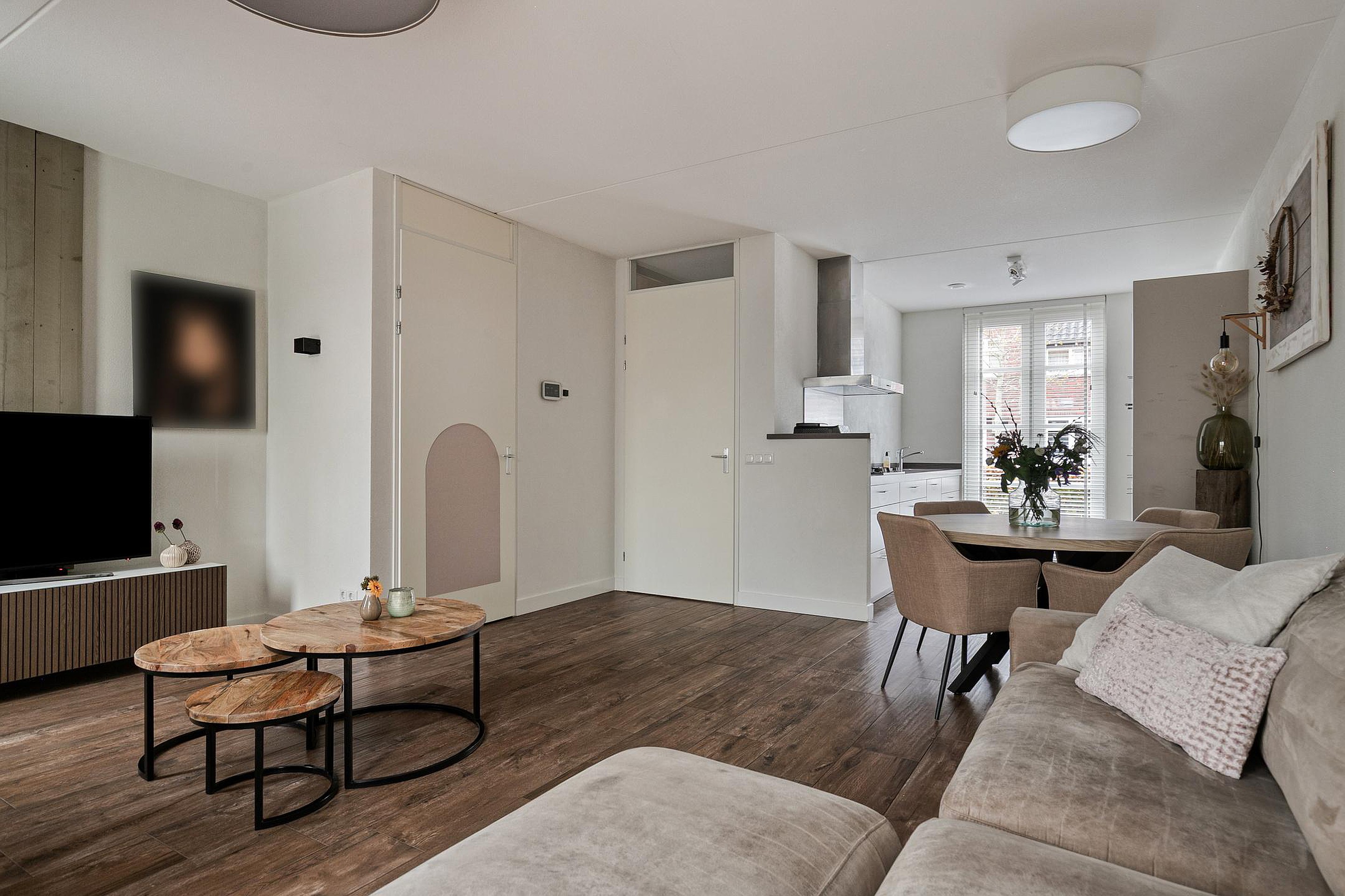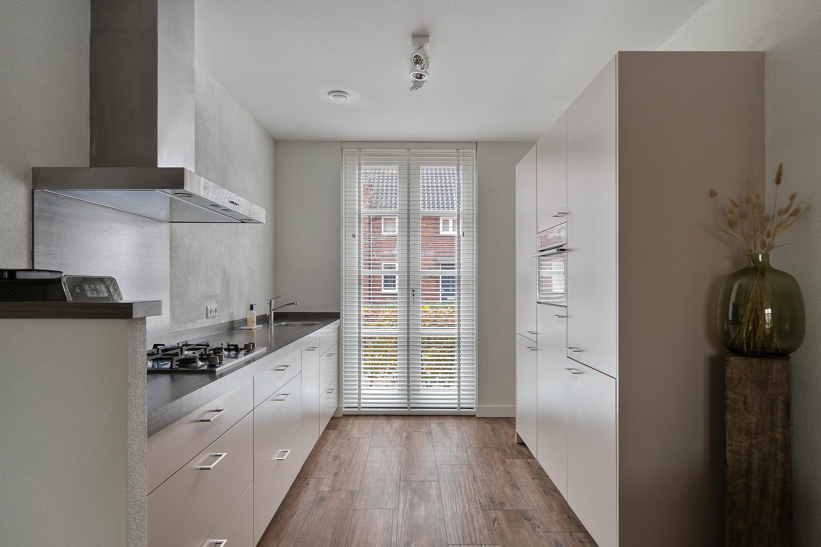 Vanuit de hal/entree met meterkast is er toegang tot het toilet, de woonkamer met open keuken en een trapopgang naar de eerste verdieping. De keuken in rechte opstelling en wandkast is v.v. diverse kasten en lades, een kunststof werkblad met spoelbak en mengkraan, 4-pits gaskookplaat (AEG), afzuigkap (Novy), combimagnetron (AEG), een koel-vriescombinatie (Liebherr) en een vaatwasser (Siemens). Het woongedeelte is aan de achterzijde van de woning gelegen en middels openslaande tuindeuren en een enkele achterdeur is er toegang tot de tuin. De achterdeur is v.v. een hor. De vloer van de begane grond is v.v. tegels en vloerverwarming. De wanden zijn afgewerkt met spachtelputz. De plafonds zijn v.v. spuitwerk. De kozijnen zijn van hout en v.v. HR++ glas. Het toilet is geheel betegeld en v.v. een hangend toilet en fonteintje.