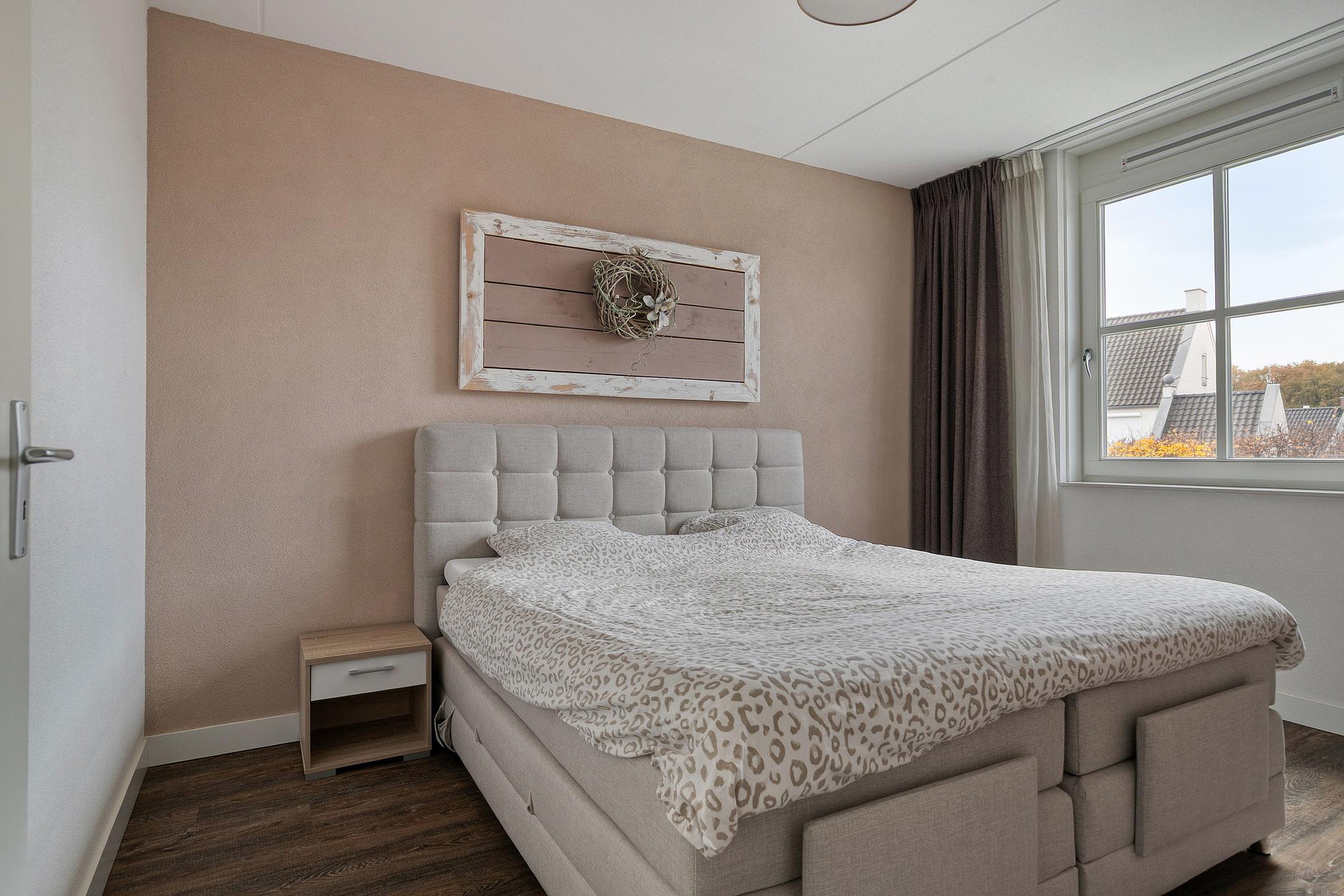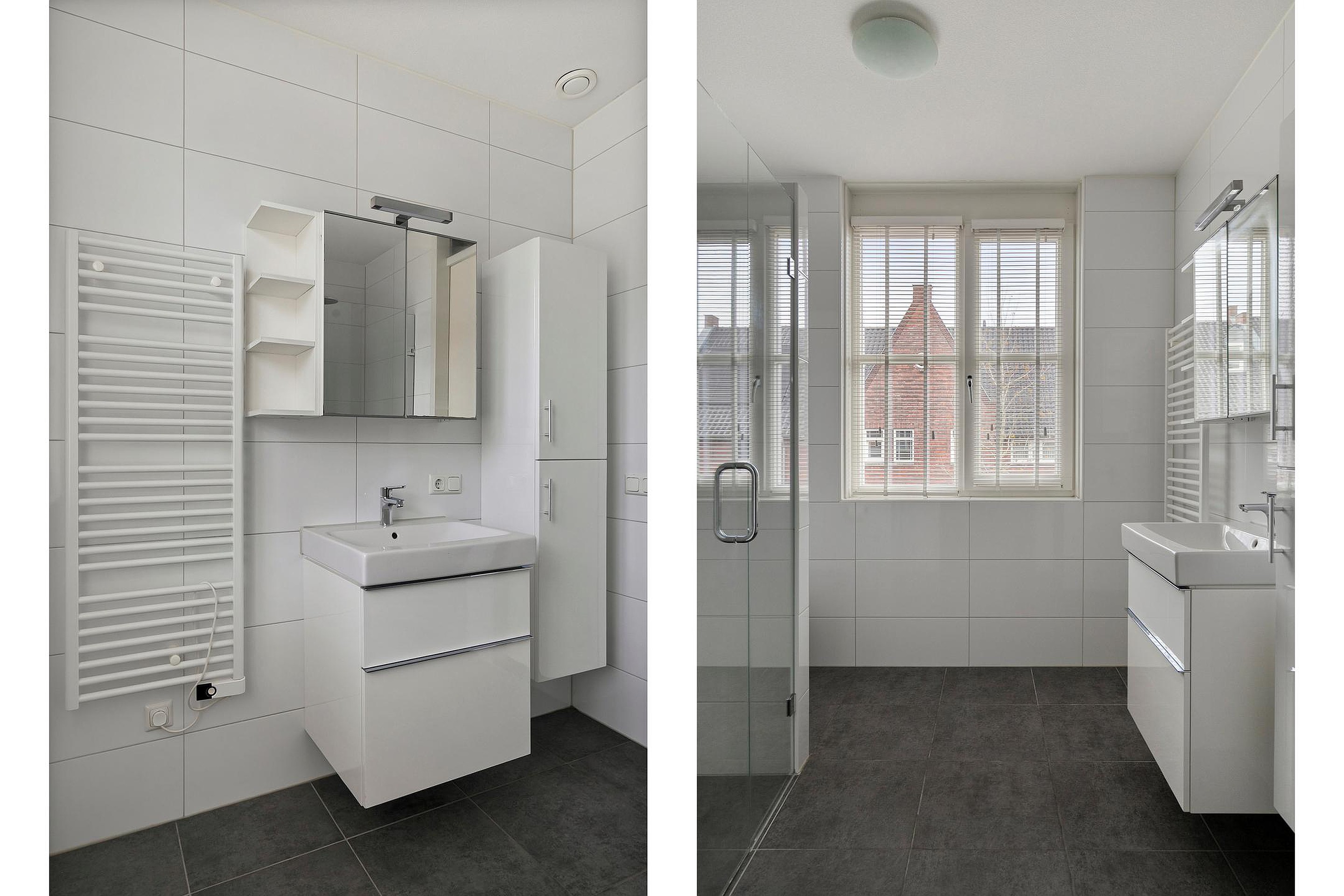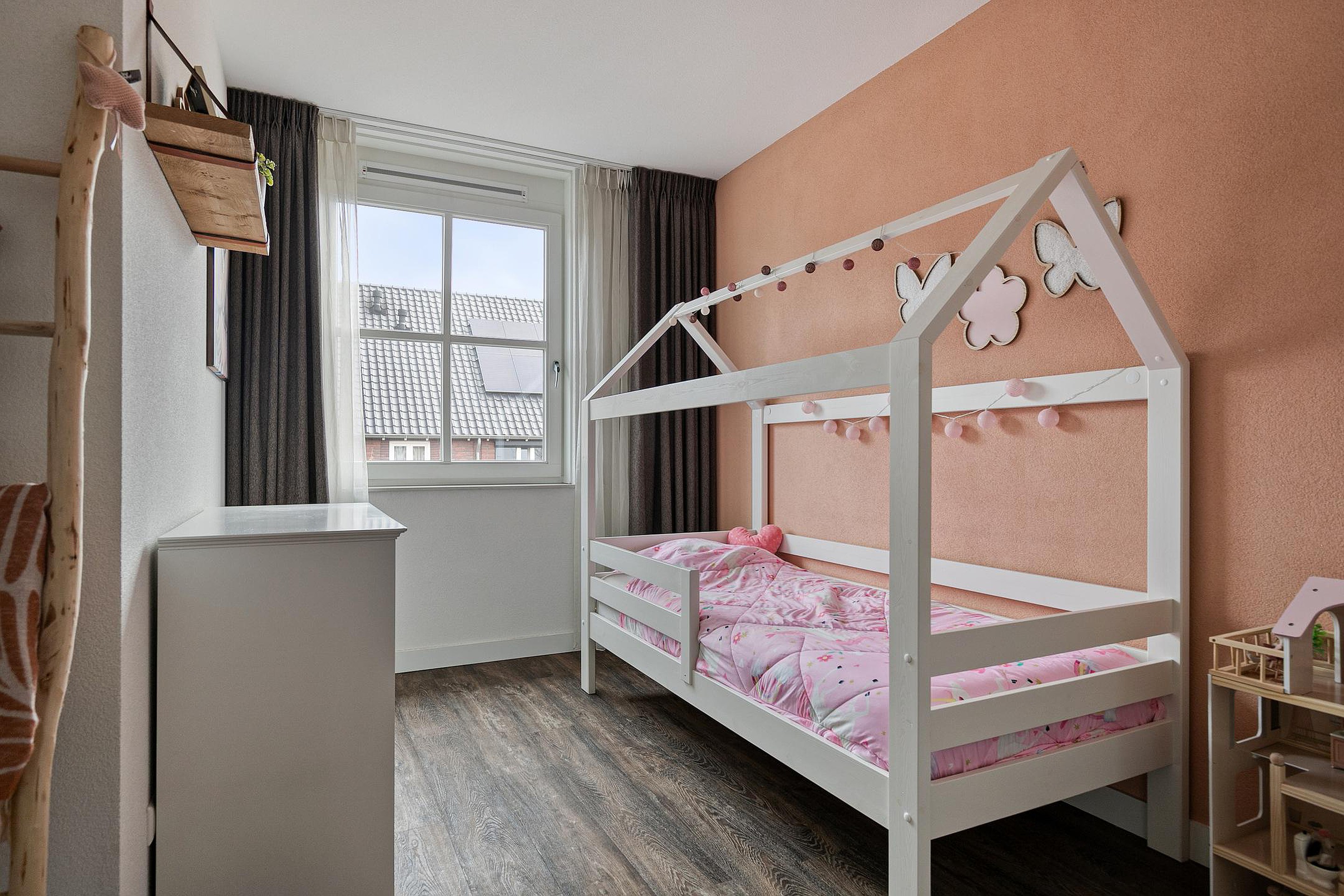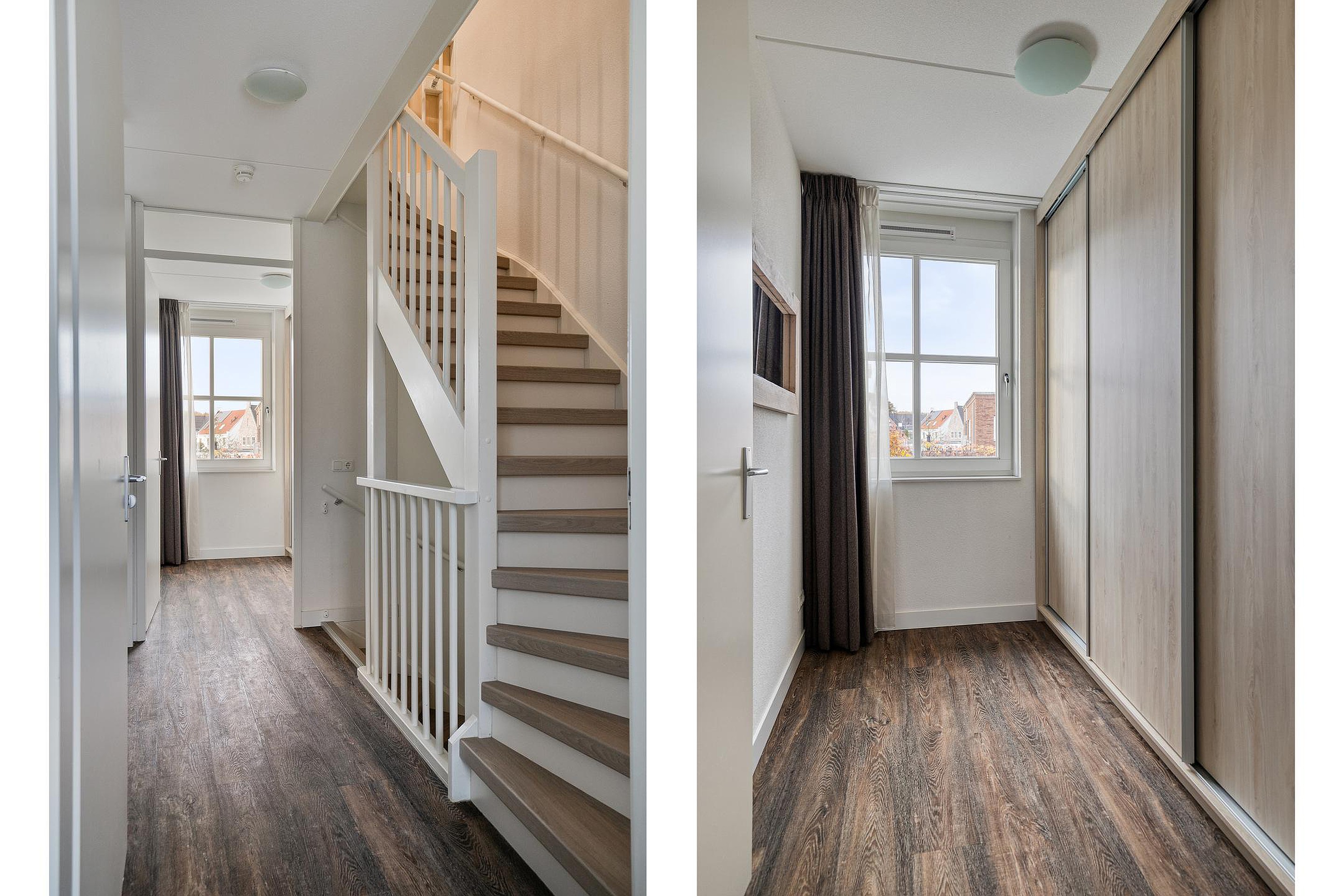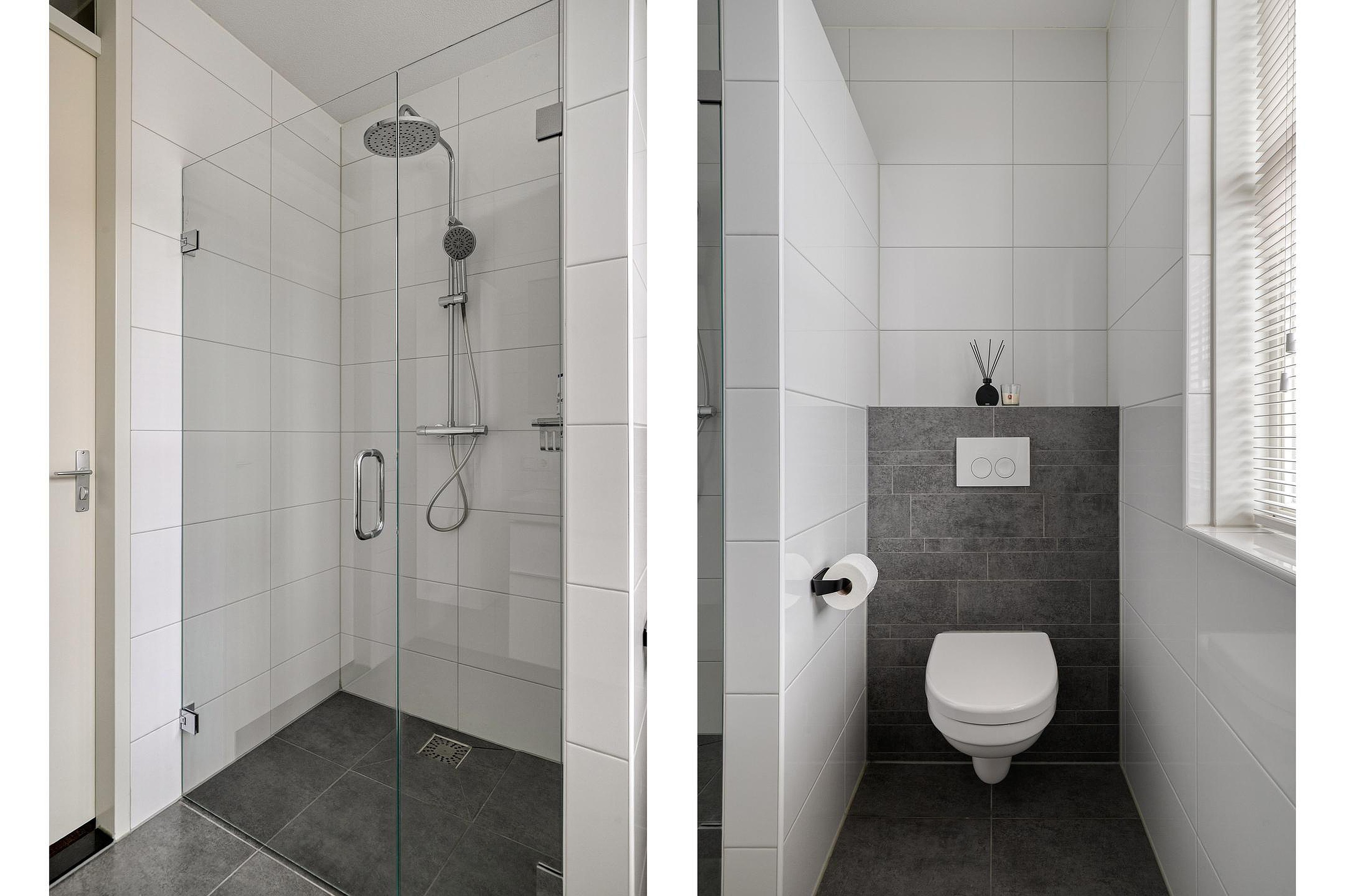 Vanuit de overloop zijn 3 slaapkamers, de badkamer en een trapopgang naar de tweede verdieping bereikbaar. De badkamer is geheel betegeld en v.v. een hangend toilet, een inloopdouche en een wastafel met meubel. De vloer van de slaapkamers en de overloop is v.v. pvc. De gehele eerste verdieping is v.v. vloerverwarming. De wanden zijn afgewerkt met spachtelputz. De plafonds zijn v.v. spuitwerk. De kozijnen zijn van hout en v.v. HR++ glas. De ramen van de slaapkamers en de badkamer zijn v.v. horren.