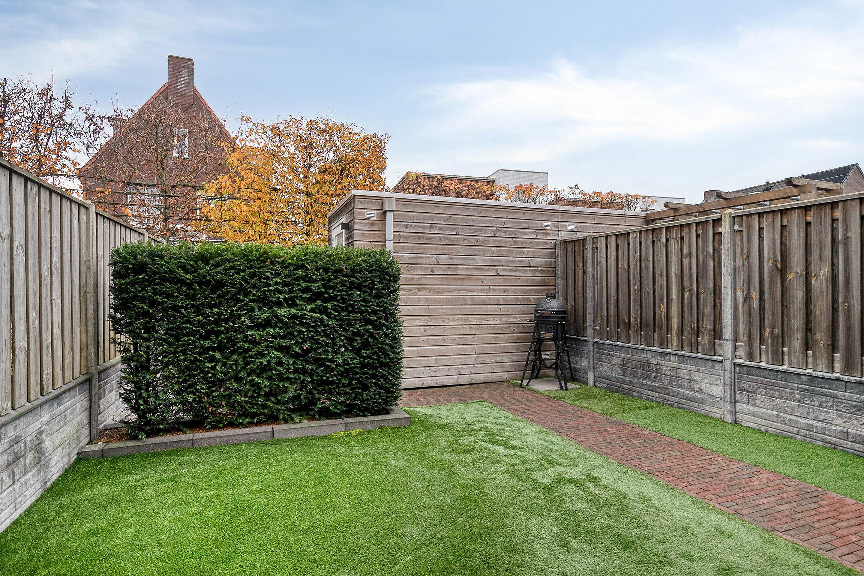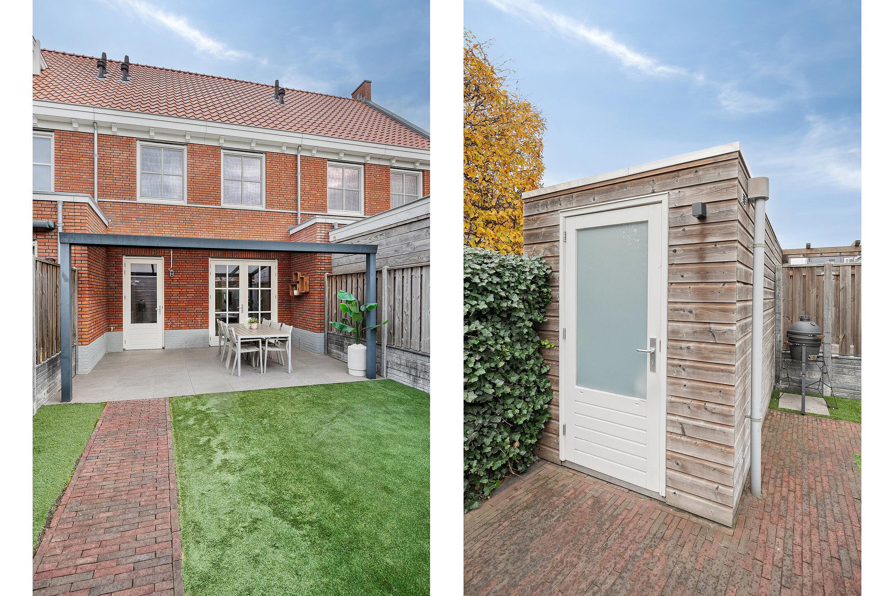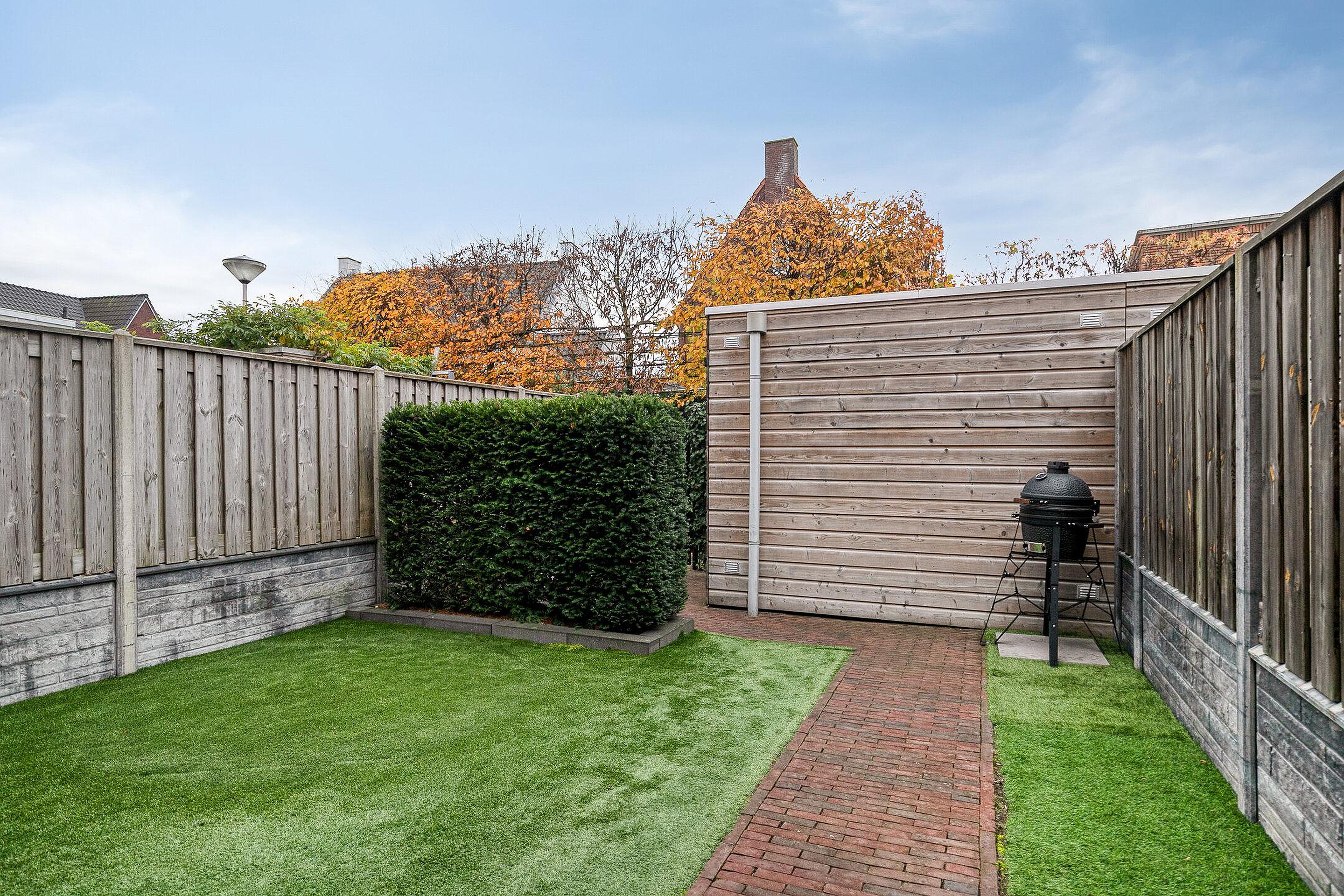 Deze woning beschikt over een voor-en achtertuin. De achtertuin met aluminium terrasoverkapping en houten berging is gelegen op het zuid-westen. Deze is aangelegd met sierbestrating, kunstgras en een haag. De achtertuin is bereikbaar middels een poort vanuit het gezamenlijk parkeerterrein. De voortuin is aangelegd met sierbestrating en een haag.