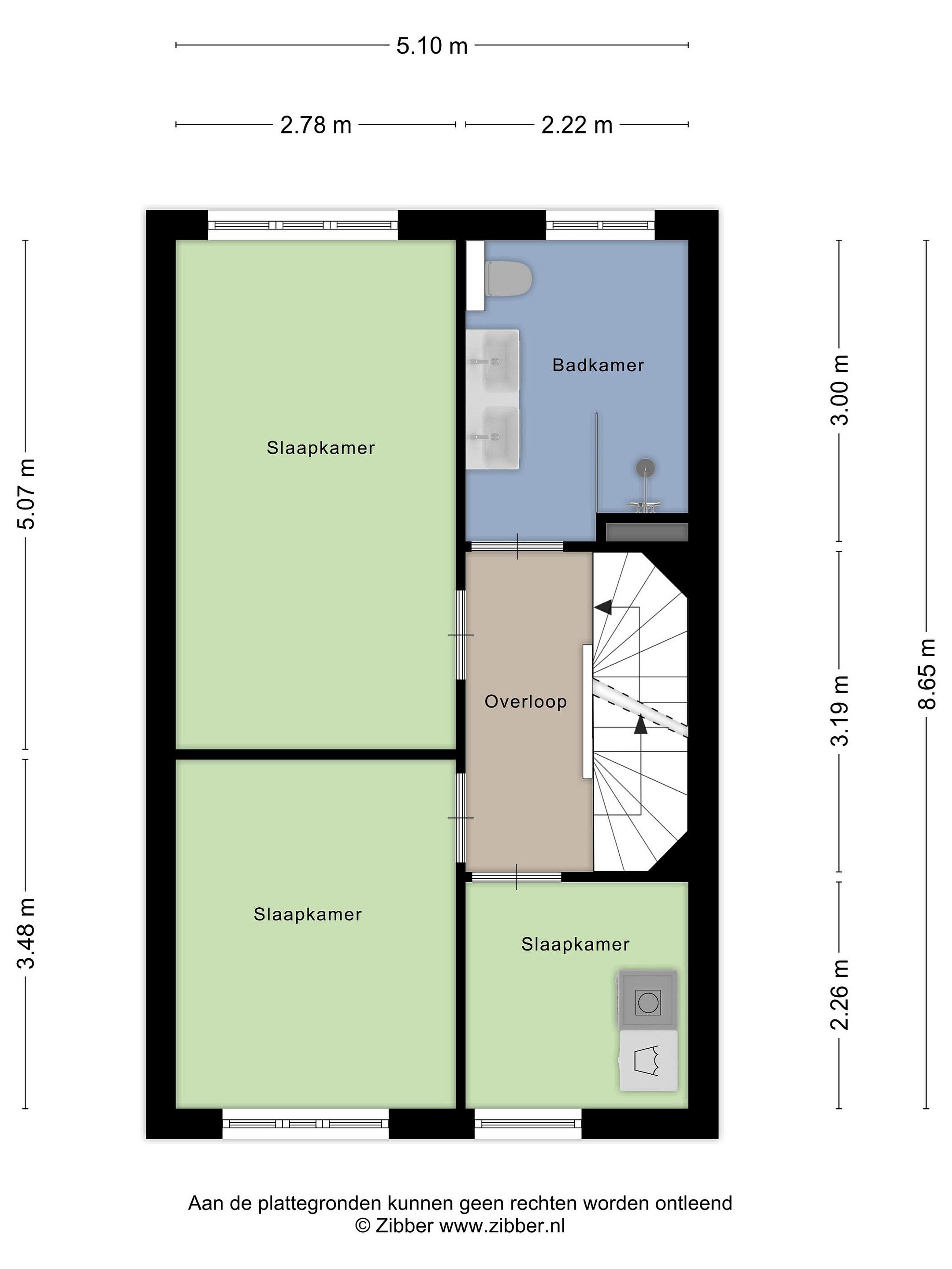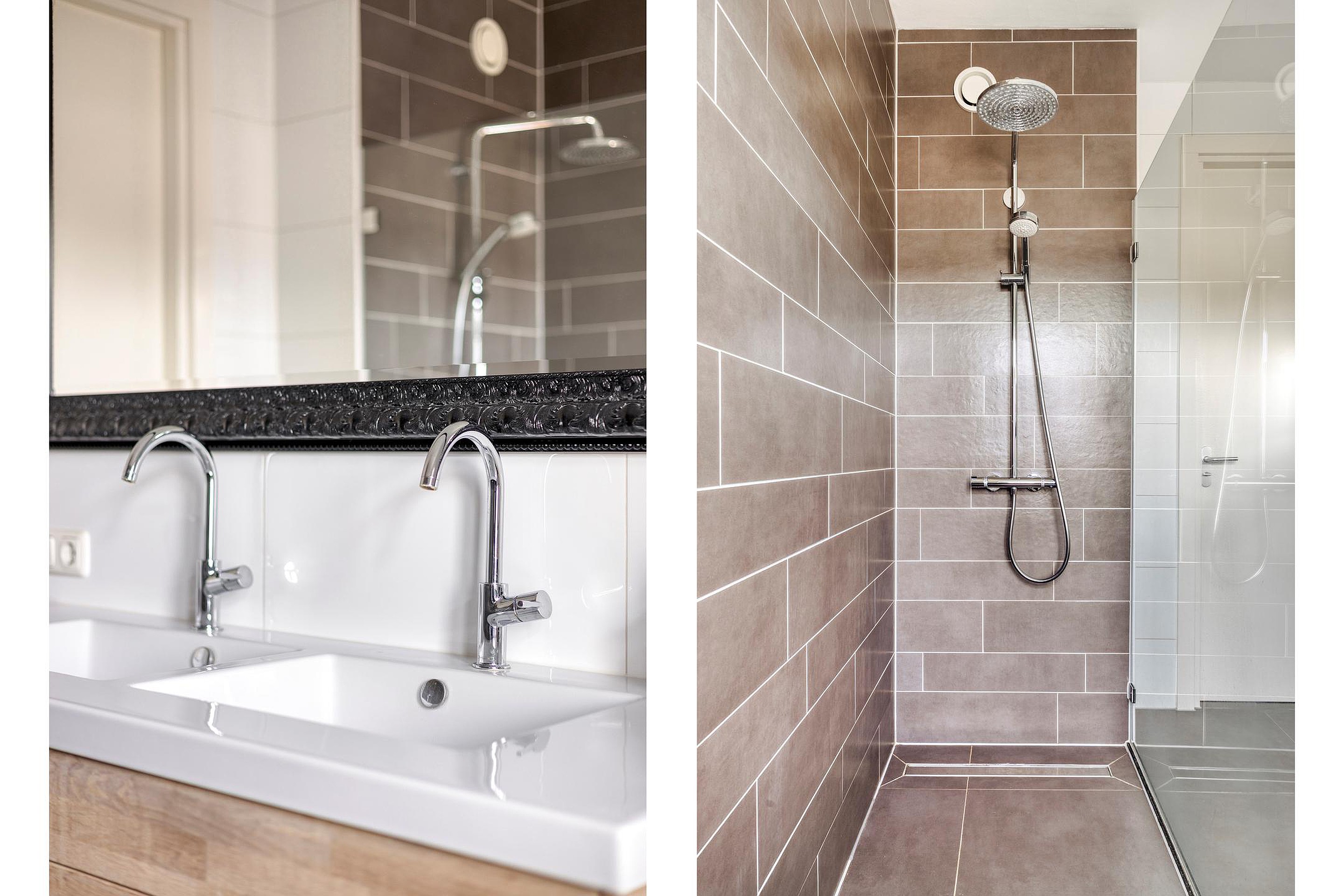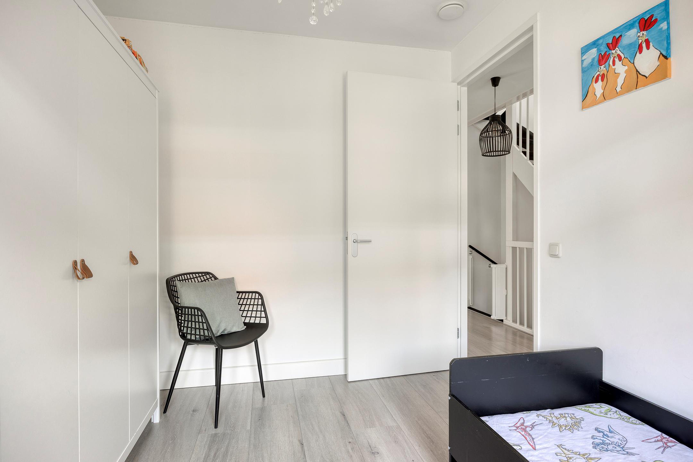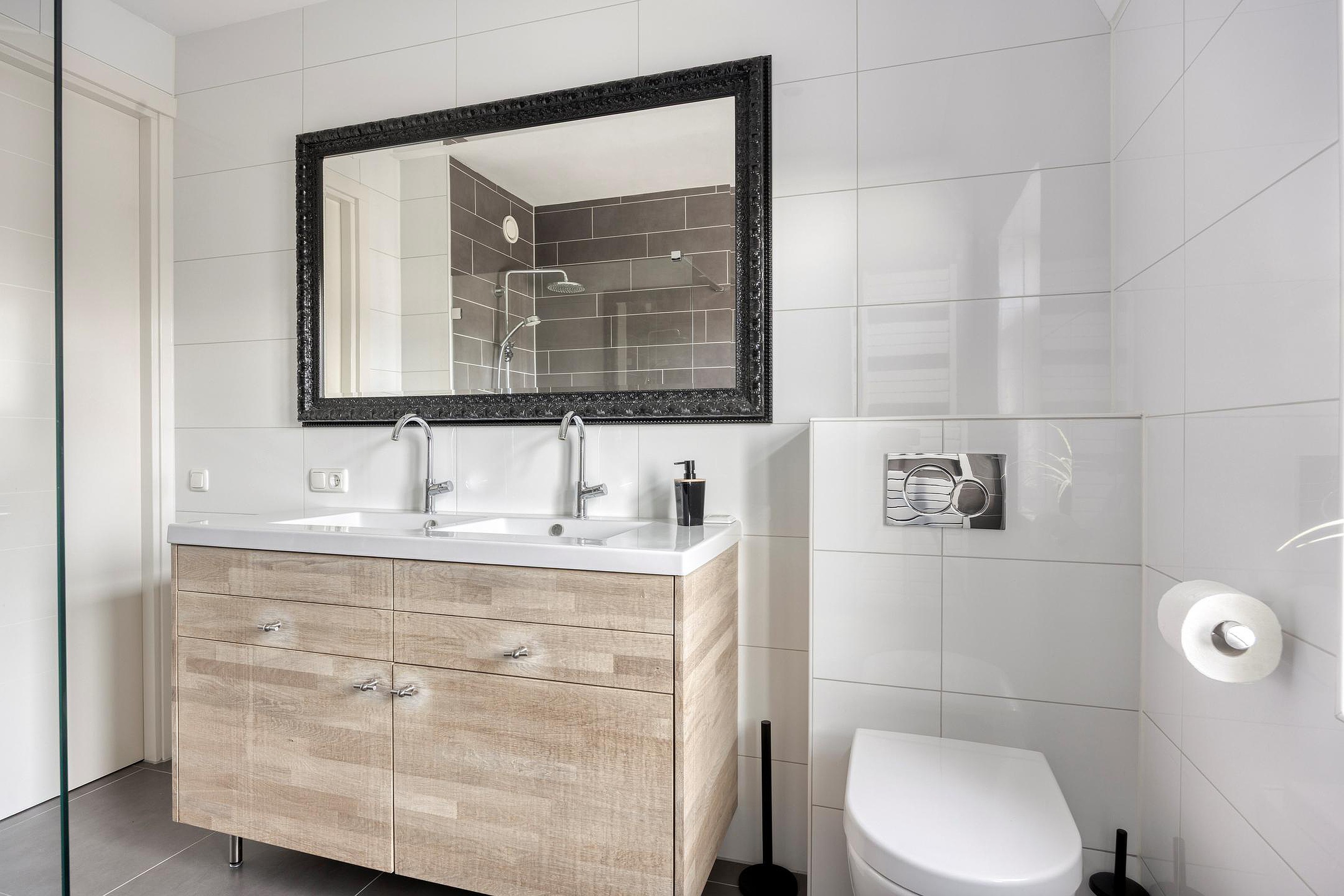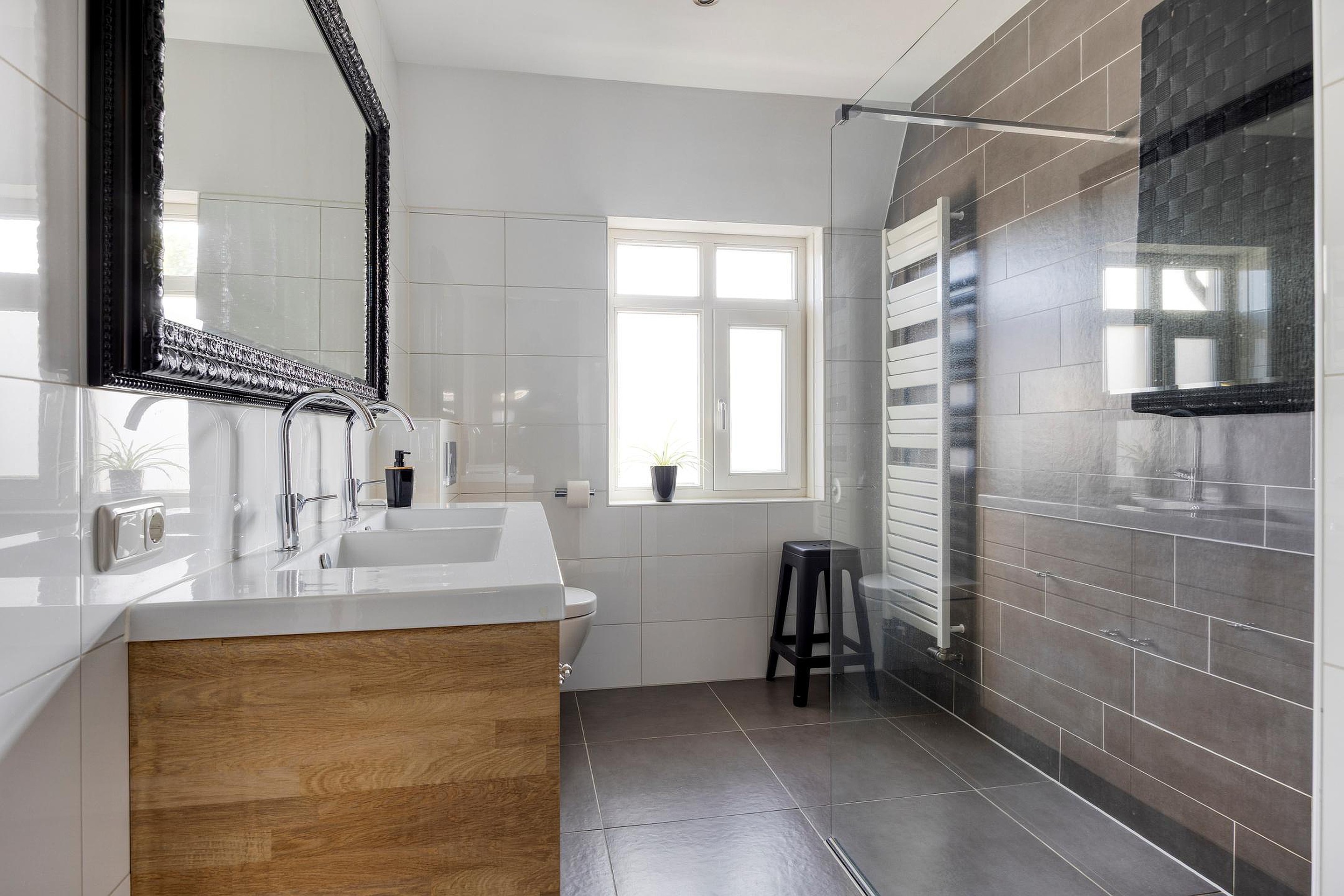 Vanuit de overloop zijn 3 slaapkamers, de badkamer en een trapopgang naar de tweede verdieping bereikbaar. De badkamer is nagenoeg geheel betegeld en v.v. een dubbele wastafel met meubel, een hangend toilet, een designradiator en een ruime inloop douche met regendouche. Op de kleinste slaapkamer is de aansluiting voor de wasmachine gesitueerd. De vloer van de slaapkamers en de overloop is afgewerkt met laminaat en is v.v. vloerverwarming. De wanden en plafonds zijn afgewerkt met stucwerk. De kozijnen zijn van hout met HR++ glas.